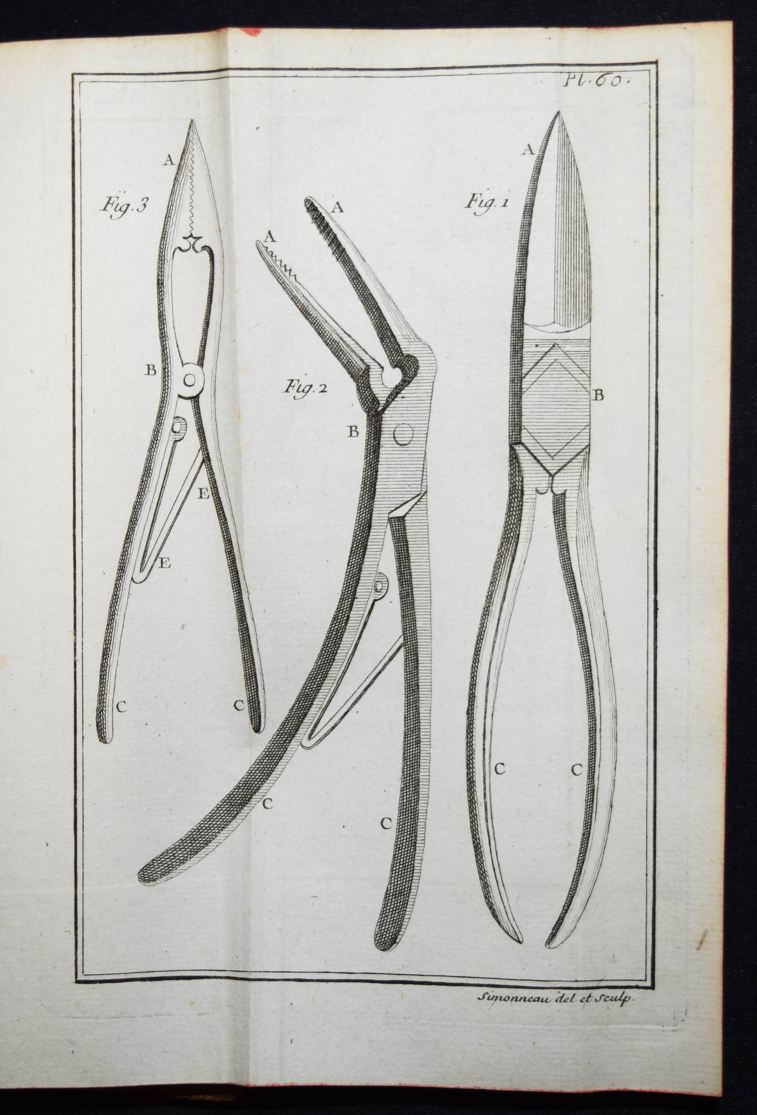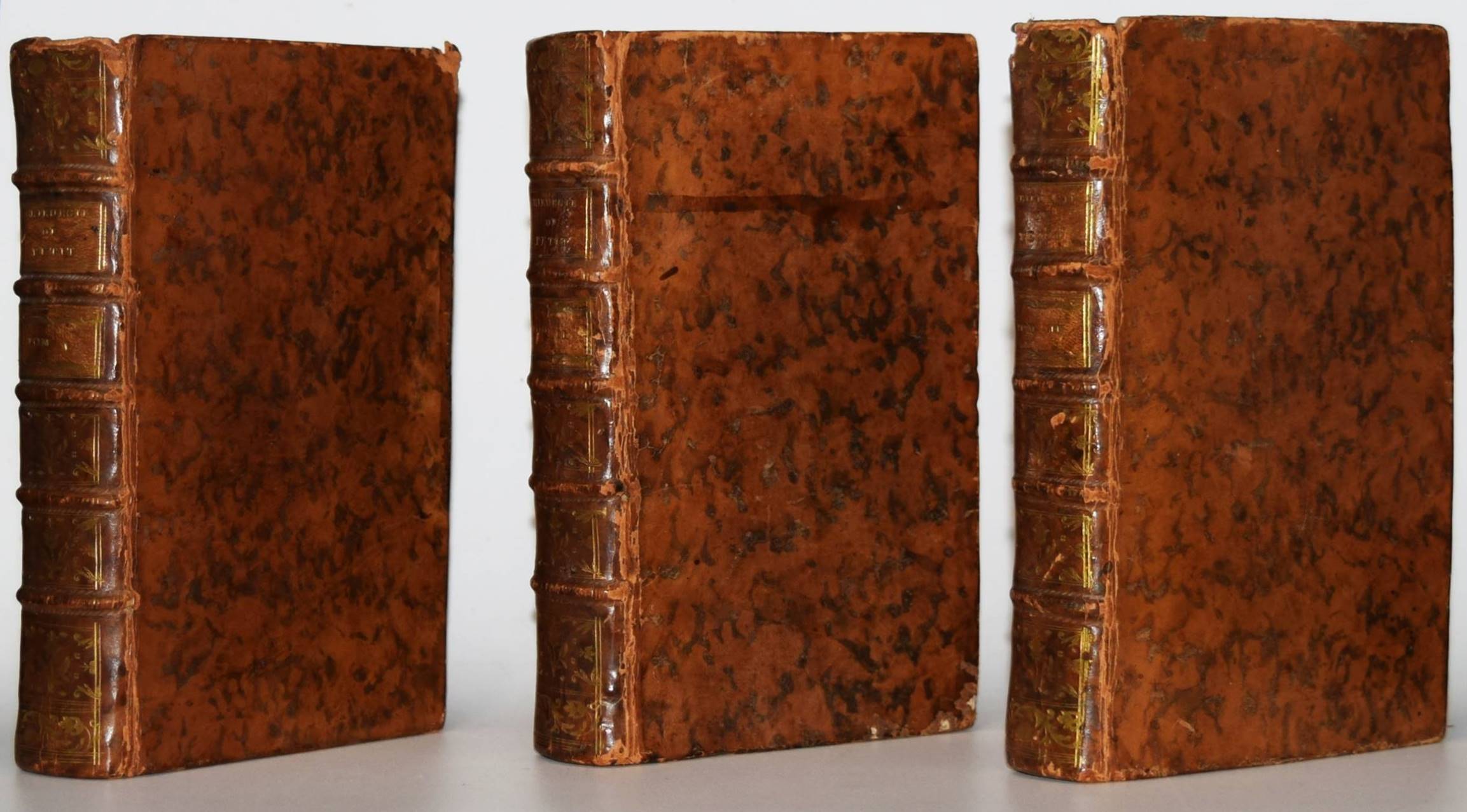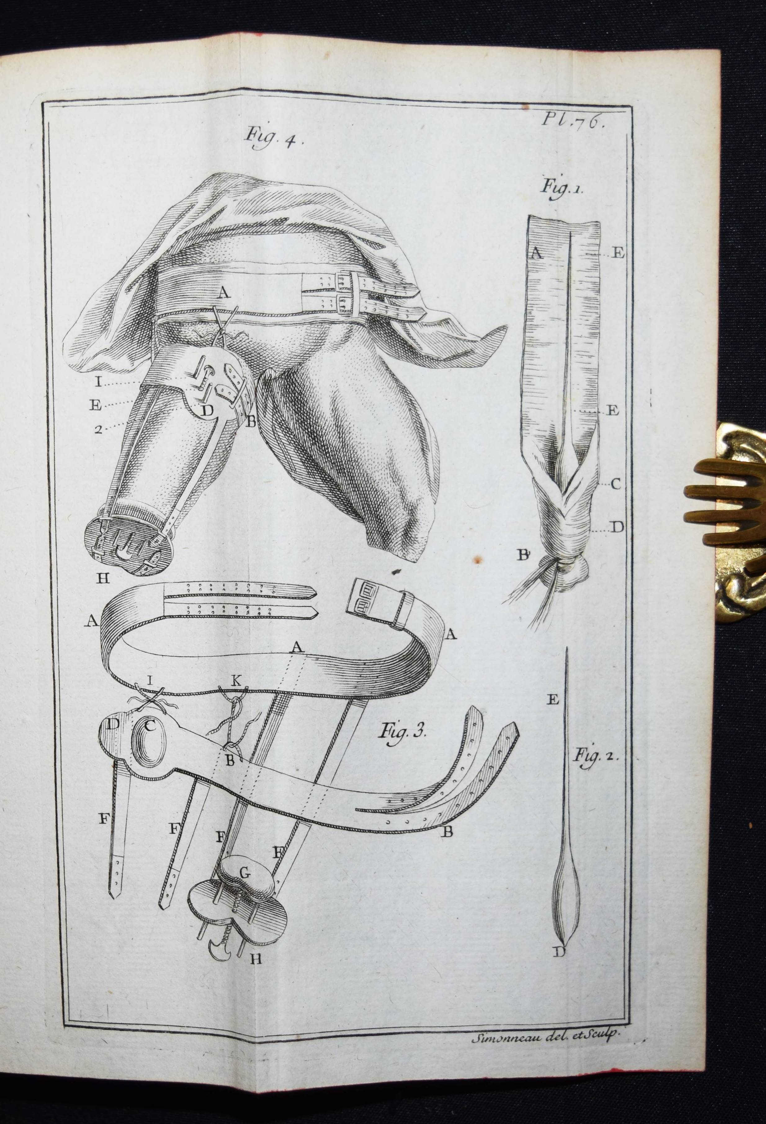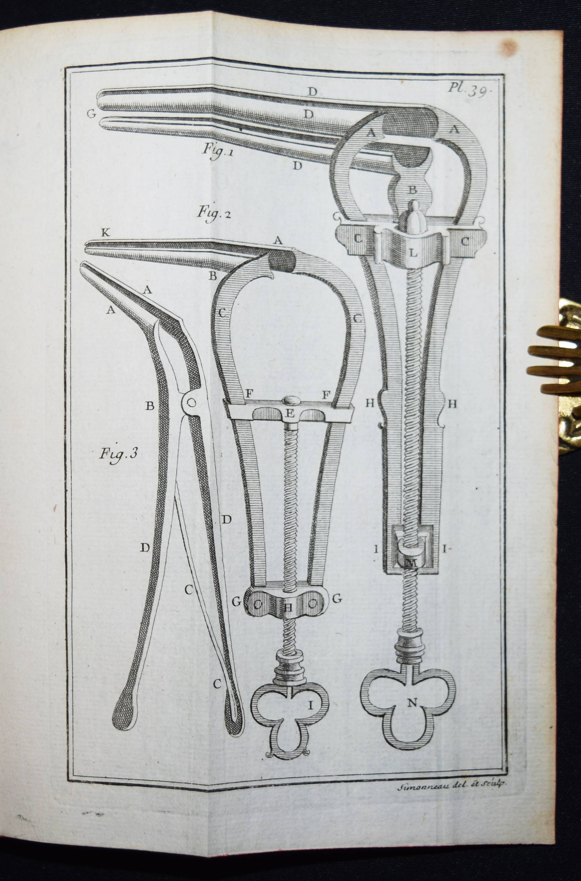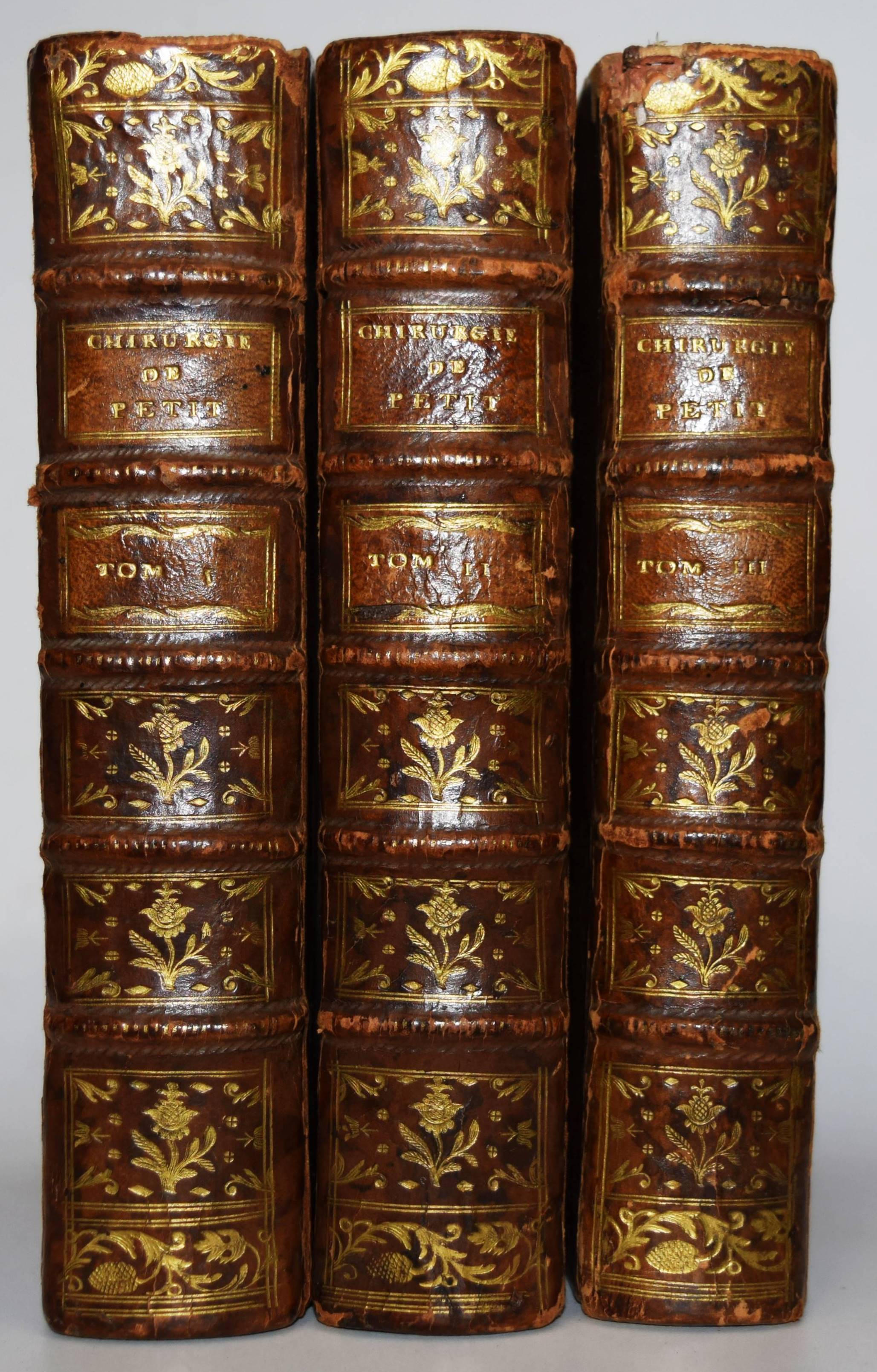 Petit, J(ean)-L(ouis). Traité des maladies chirurgicales et des opérations qui leur conviennent. 3 Bände. Paris, P. Fr. Didot le jeune 1774. 8°. [5] Bl., CIV, 407, (1) S.; [1] Bl., VIII, 560 S.; [1] Bl., VIII, 343 S. mit gestoch. Portrait-Frontispiz und 90 meist gefalt. Kupfertafeln. Kalbslederbände der Zeit mit goldgepr. Rückensch. und floraler Rückenvergoldung. Blake 345. Garrison-Morton 3357 u. 3577. Haeser 660. Hirsch-Hüb. IV, 568. – Erste Ausgabe, eines der wichtigsten medizinischen Handbücher des 18. Jahrhunderts . – „Unter den französ. Wundärzten der ersten Hälfte d. 18. Jhdts. nimmt unbestreitbar J. L. Petit aus Paris (1674-1750) die erste Stelle ein“ (Haeser). – Die Kupfer zeigen größtenteils chirurg. Instrumente. – Gelenke teils etwas spröde und leicht angeplatzt, Band III am Kapital mit geringf. Fehlstelle, vereinzelt leicht braunfleckig, gutes dekorativ gebundenes Exemplar.
