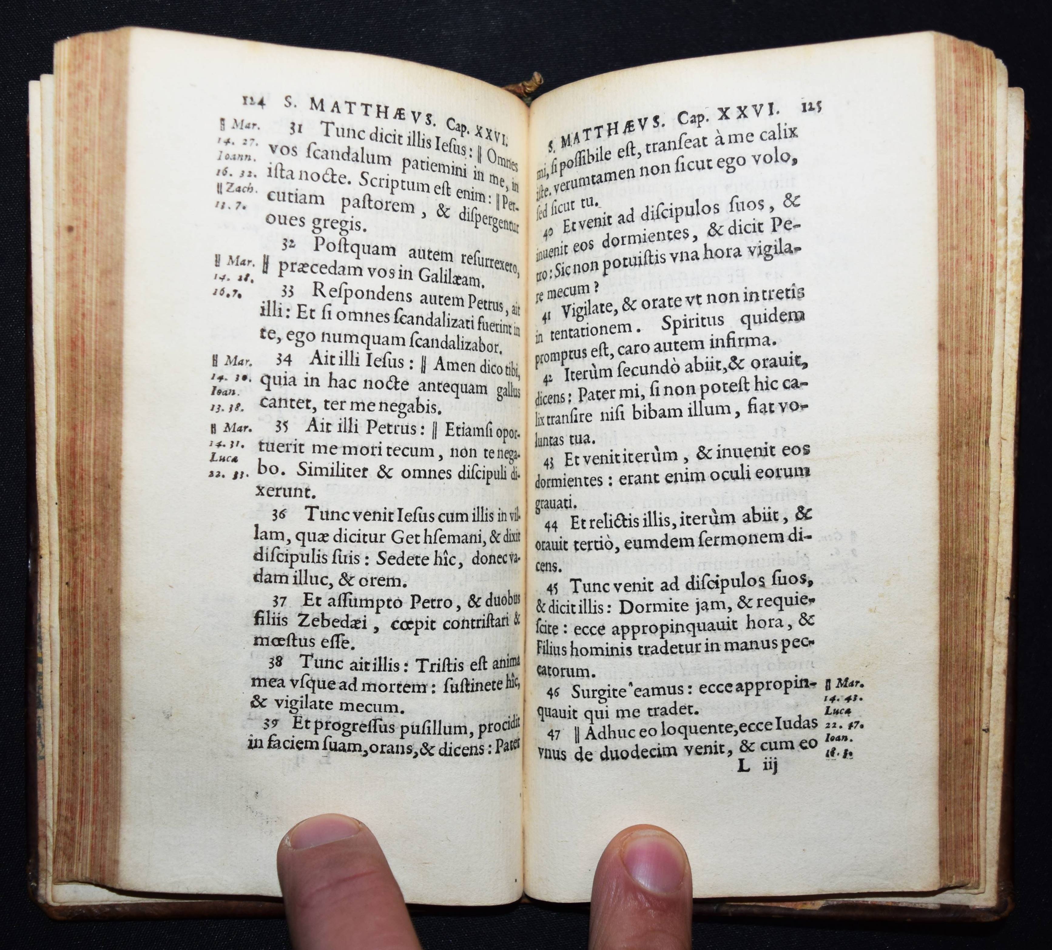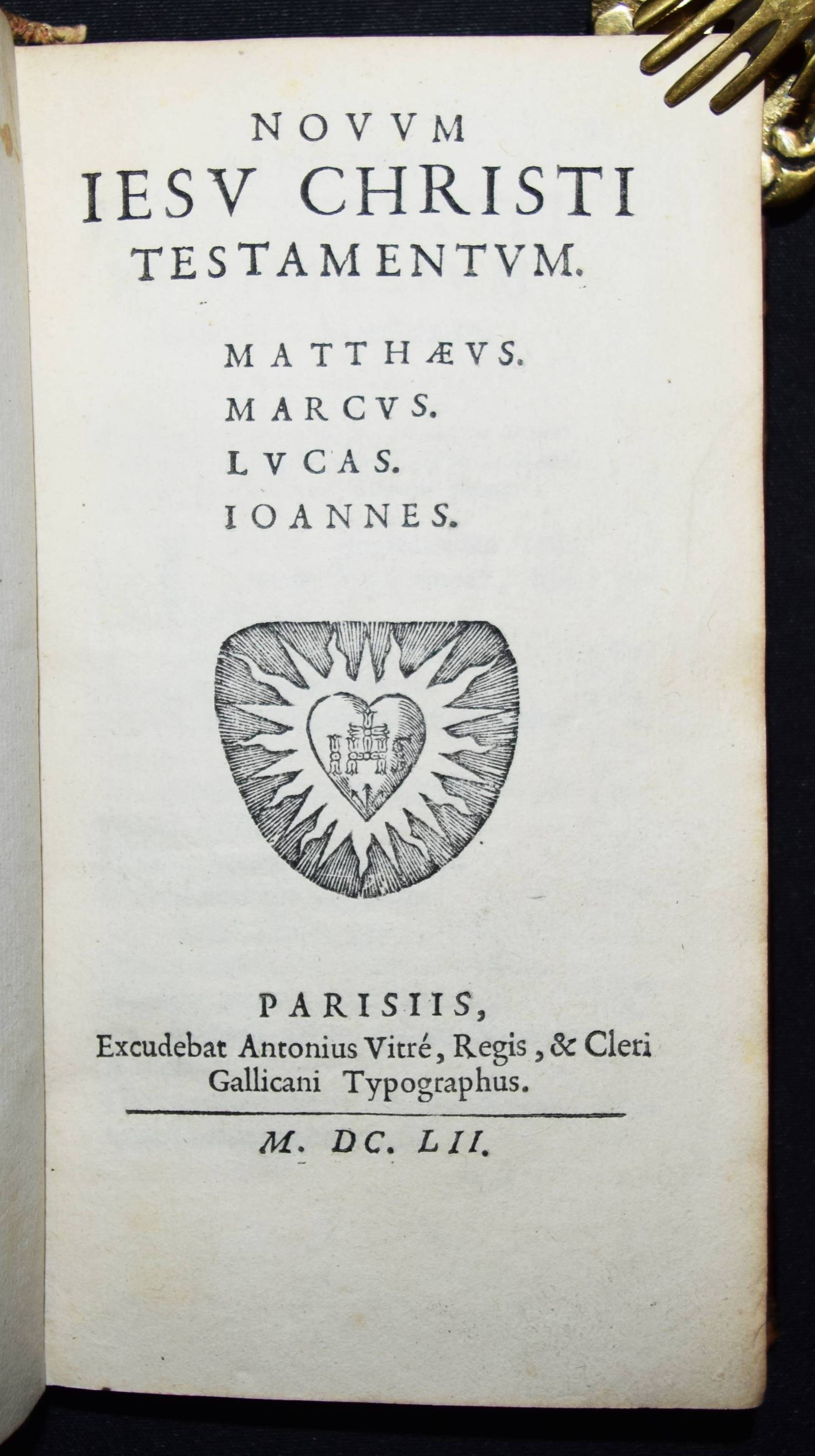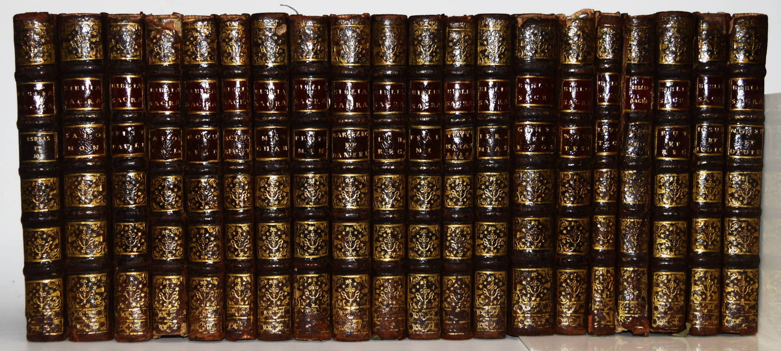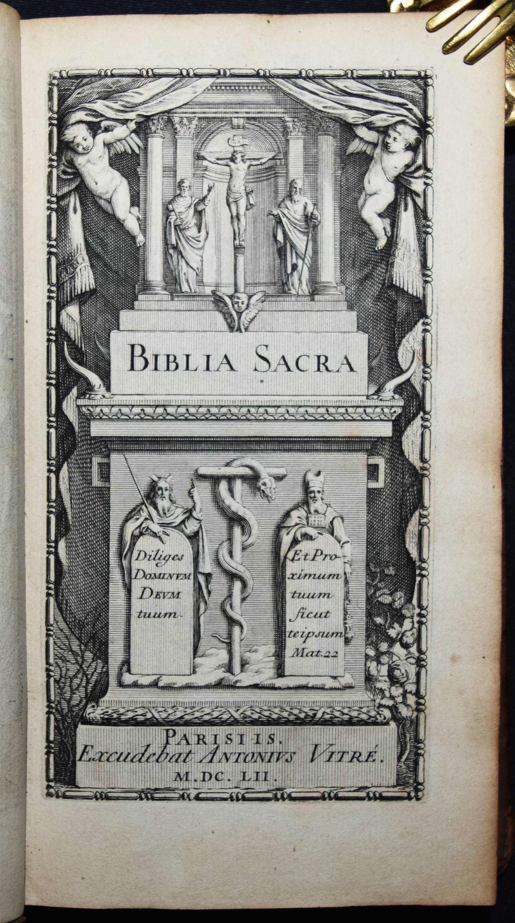 Biblia latina – Vitré, Antoine (Ed.). Biblia sacra vulgatae editionis. Sixti V. Pont. Max. authoritate recognita. Nunc verò iussu cleri Gallicani denvo edita. 8 Teile in 20 Bänden. Paris, Antonius Vitré 1651-1652. Kl.-8°. Mit gestoch. Frontispiz in Band I. Kalbslederbände der Zeit mit goldgepr. Rückensch., reicher Rückenvergoldung und Wappen-Supralibros. Brunet I, 879. Darlowe/Moule II/2, 974. Tenschert, Biblia sacra 66. – Erste Ausgabe der berühmten Taschen-Vulgata der wichtigen Pariser Offizin, . – ’’In 1652, 51 A. Vitre, who printed the Paris Polyglot, issued a duodecimo edition of the Vulgate Bible, in eight volumes, ‚jussu cleri Gallicani‘“ (Darlowe/Moule). – Hier in 20 Bänden gebunden: I. Liber Genesis, liber Leviticus, liber Numeri. – II. Liber Josue, liber Ruth, liber regum tertius. – III. Libri Paralipomenon, libri Esdra, Tobiae, Iudith, Esther, Job. – IV. Liber Psalmorum, Proverbia, Ecclesiastes, Cantic Canticor, Sapientia, Ecclesiasticus. – V. Prophetia Isaiae, Prophetia Jeremiae, Prophetia Baruch. – VI. Prophetae minores, libri Machabaeorum II., Esdrae III. & IV. – VII. Novum Jesu Christi Testamentum, Matthaeus, Marcus, Lucas, Ioannes. – VIII. Actus Apostolorum, Epistolae B. Pauli, Apocalypsis B. Ioannis. – Der bedeutende franz. Buchdrucker A. Vitré (1595-1674), königlicher Drucker für orientalische Sprachen (Linguarum Orientalium Regis Typographus ), verwendete seit 1625 die von François Savary de Brèves entwickelten arabischen Typen und druckte damit 1645 die von Guy Michel Lejay herausgegebene Pariser Polyglotte-Bibel (Bible polyglotte). – Einbände berieben und etwas bestoßen, zeitgenöss. Besitzvermerk auf dem Titel, nur vereinzelt leicht braunfleckig, gutes dekorativ gebundenes Exemplar aus einer franz. Schloss-Bibliothek.