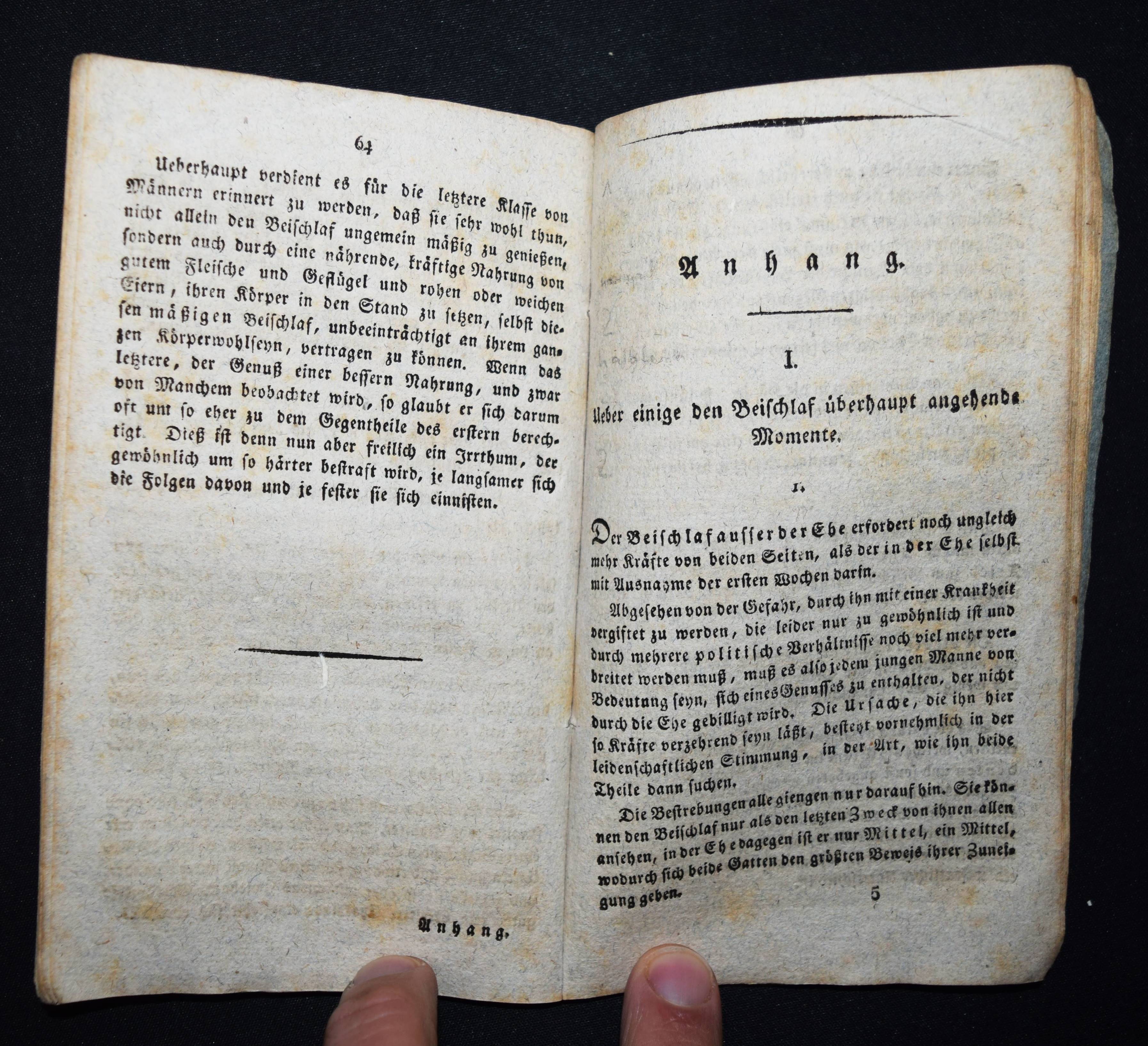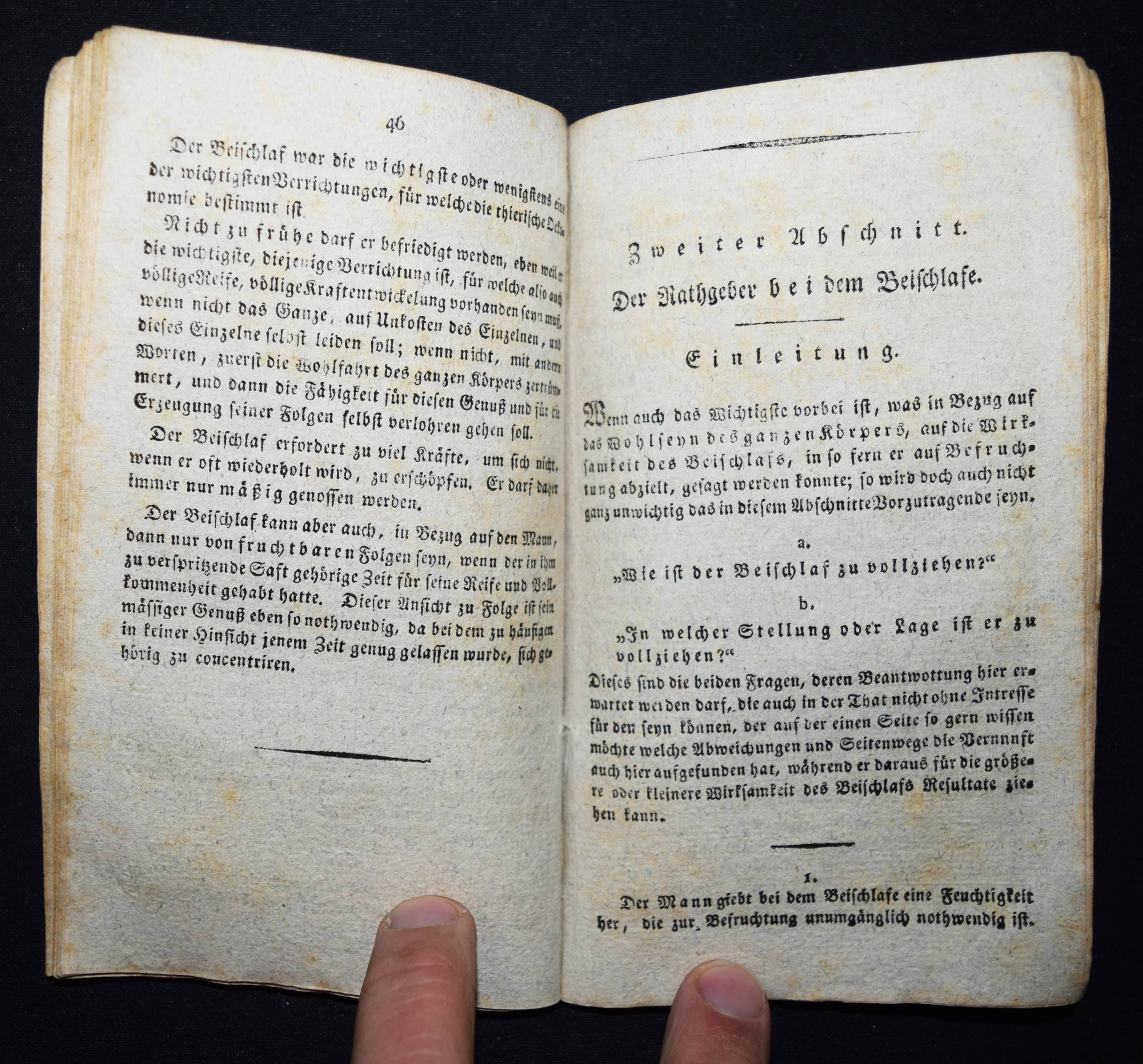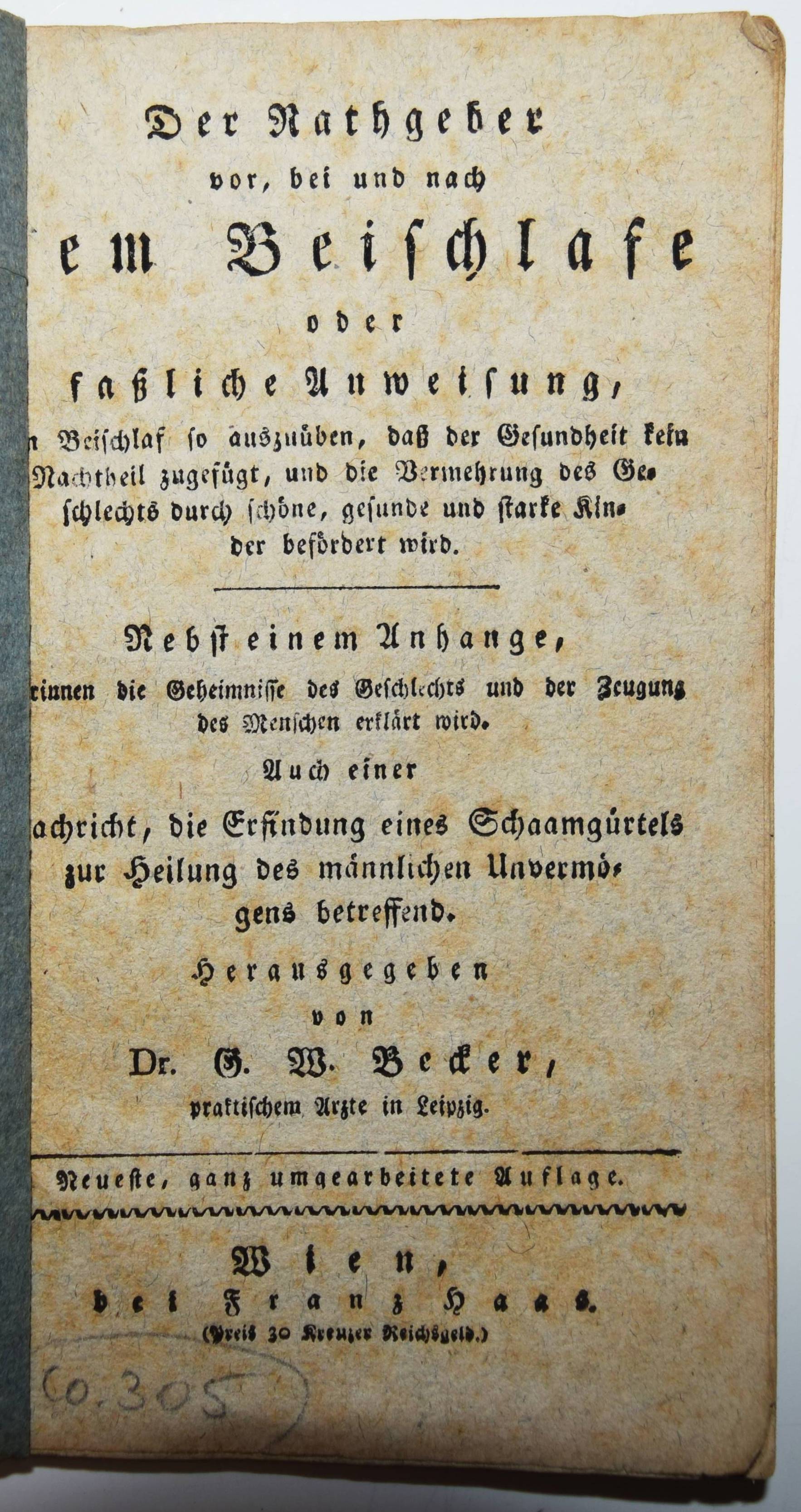 Becker, G(ottfried) W(ilhelm). Der Rathgeber vor, bei und nach dem Beischlafe, oder faßliche Anweisung, den Beischlaf so auszuüben, daß der Gesundheit kein Nachtheil zugefügt, und die Vermehrung des Geschlechts durch schöne, gesunde und starke Kinder befördert wird. Nebst einem Anhange, worinnen die Geheimnisse des Geschlechts und der Zeugung des Menschen erklärt sind. Auch einer Nachricht, die Erfindung eines Schaamgürtels zur Heilung des männlichen Unvermögens betreffend. Neueste, ganz umgearbeitete Auflage. Wien, Franz Haas o. J. (1816). Kl.-8°. 96 S. Einfacher Papierumschlag der Zeit. Vgl. Hayn-Gotendorf IX, 47. – Wiener Nachdruck der 7. Auflage des sexualpädagogischen Klassikers der Biedermeier-Zeit. Trotz mehrerer Ausgaben und Auflagen seltener Titel. Vorwort (vor S. 13 verbunden, zur 6. Aufl. in Leipzig) datiert 1816. – Der Leipziger Arzt und populärwissenschaftlicher Schriftsteller G. W. Becker (1778-1854) „gehörte zur Gruppe der medizinischen Volksaufklärer des 18. und 19. Jahrhunderts. Sie folgten der in der Aufklärung verwurzelten allgemeinen Tendenz zur Popularisierung in den Wissenschaften und in der Medizin, mit der die Aufklärer die gesellschaftliche Exklusivität des Wissens beenden wollten. Wegen der Fülle der von ihm veröffentlichten Werke kann man ihn als Polygraphen bezeichnen. … Anhand der von Becker verfassten Bücher nicht-medizinischen Inhalts lässt sich erkennen, dass er am Kriegsgeschehen in bzw. bei Leipzig (Völkerschlacht bei Leipzig 1813) direkten Anteil hatte und vermutlich als Feldarzt eingesetzt wurde“ (Wikipedia). – Rücken fehlt, Umschlag mit geringen Randläsuren, etwas angestaubt und leicht fleckig, sonst gut erhalten.