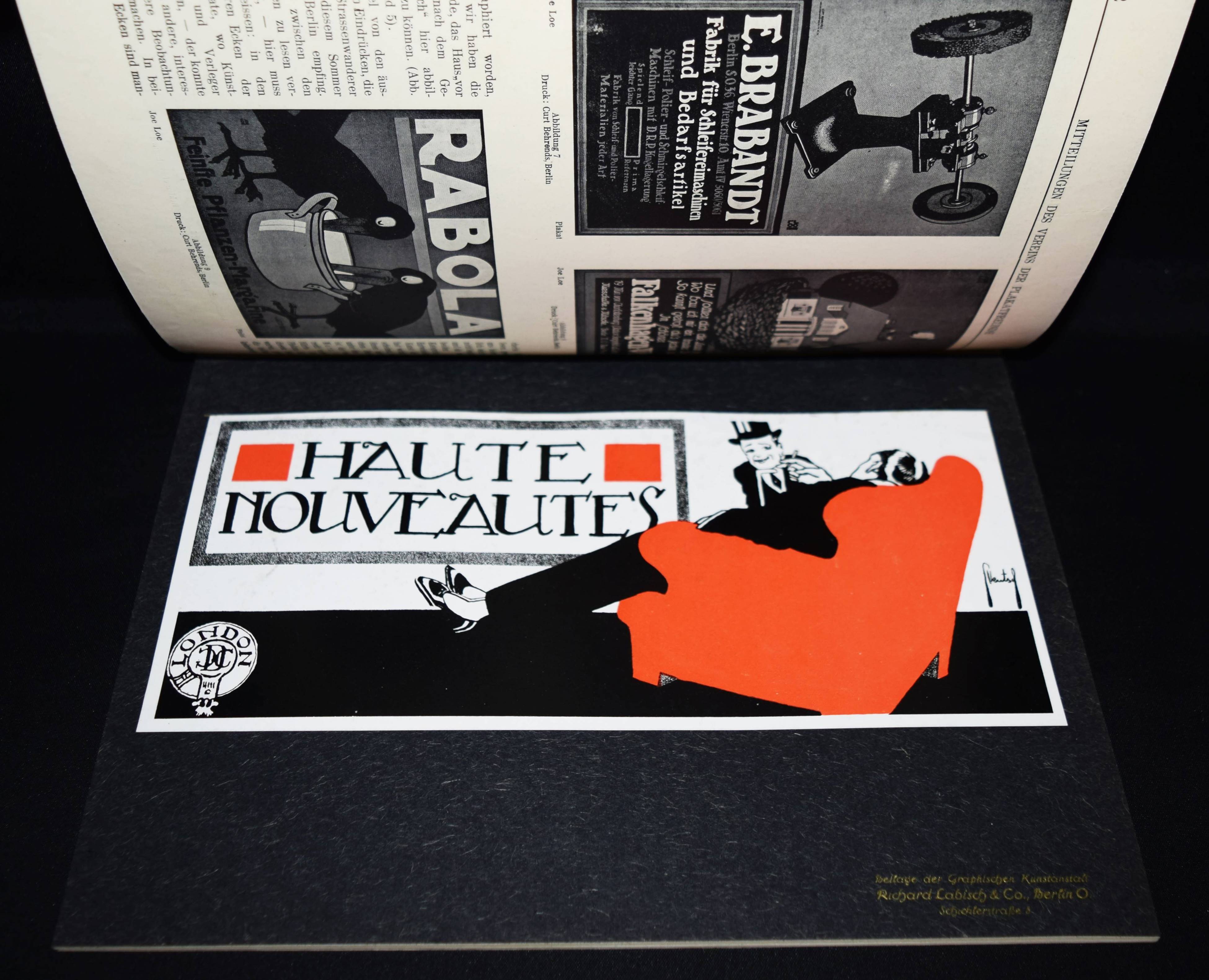 Sachs, Hans (Hrsg.). Das Plakat. Mitteilung des Vereins der Plakatfreunde e. V. für Kunst in der Reklame. Jahrgang II, Oktober 1911. Berlin, Verein der Plakatfreunde 1911. 4°. 150 S. mit zahlr., teils ganzseitigen und meist farbigen Abbildungen sowie montierten Kunstbeilagen, Papier- und Buntpapierproben. Farbig illustr. Orig.-Kartonumschlag. Mit ihrer exzellenten Ausstattung und den zahllosen farbigen und montierten Beispielen herausragender Werbegraphik die bis heute unerreichte Publikation zum Thema Plakatkunst. Eine der wohl aufwendigsten und hervorragendsten Zeitschriften des 20. Jahrhunderts. – „Die ersten Nummern erschienen im März und April 1906, als rein internes Mitteilungsblatt und nach einer handschriftlichen Vorlage vervielfältigt in nur 200 Exemplaren, bei einer Mitgliederzahl von nur 80. In dieser Form war das Blatt nicht im Handel erhältlich. Trotzdem zeigt sich schon daran die Zielrichtung: für den Verein zu Werben und neue Mitglieder zu gewinnen. In wie starkem Maße dies gelang, hätte sich keiner der Beteiligten träumen lassen. 1919 etwa hatte der Verein knapp 5000 Mitglieder und alleine im letzten Jahr seines Bestehens gewann er 2200 dazu, so daß die Mitgliederzahl auf deutlich über 7000 stieg … Es gab farbige und montierte Beilagen als Beispiele herausragender Werbegrafik, wie sie sich sonst in keiner Konkurrenzzeitschrift fanden. Verkleinerte Ausführungen von Plakaten, teils auf starken Karton gedruckt, wurden ebenso beigelegt wie Werbemarken, Postkarten u. ä. Alleine ein kurzes Durchblättern konnte den Leser oder Sammler vom Wert jedes einzelnen Heftes überzeugen. Wer einzelne Exemplare oder gar ganze Jahrgänge von Das Plakat besaß, der gab sie nicht wieder her“ (J. Müller-Daehn). – Rücken mit Papierstreifen überklebt, Umschlag etwas angestaubt und mit kl. restauriertem Randeinriss, gutes Exemplar.