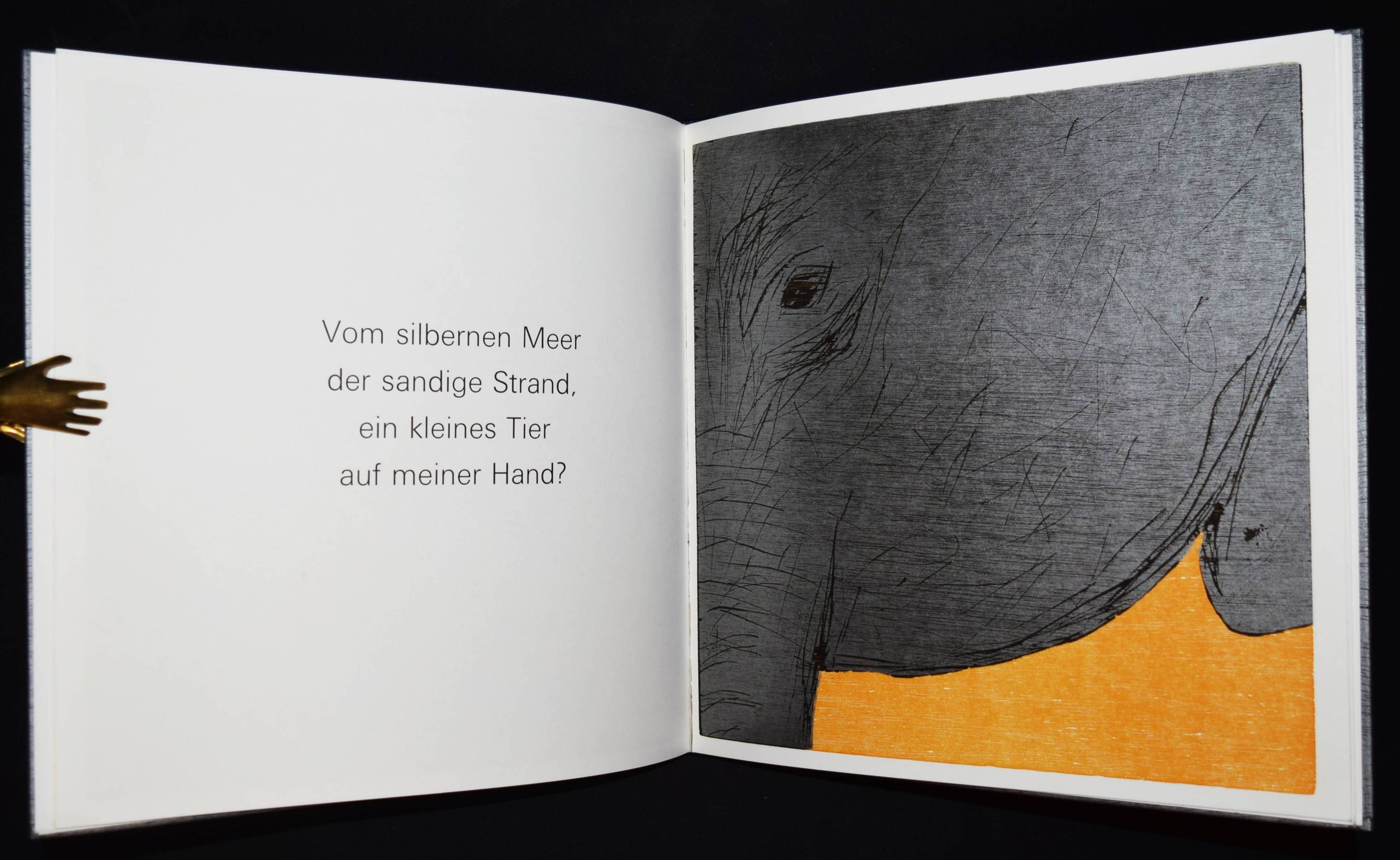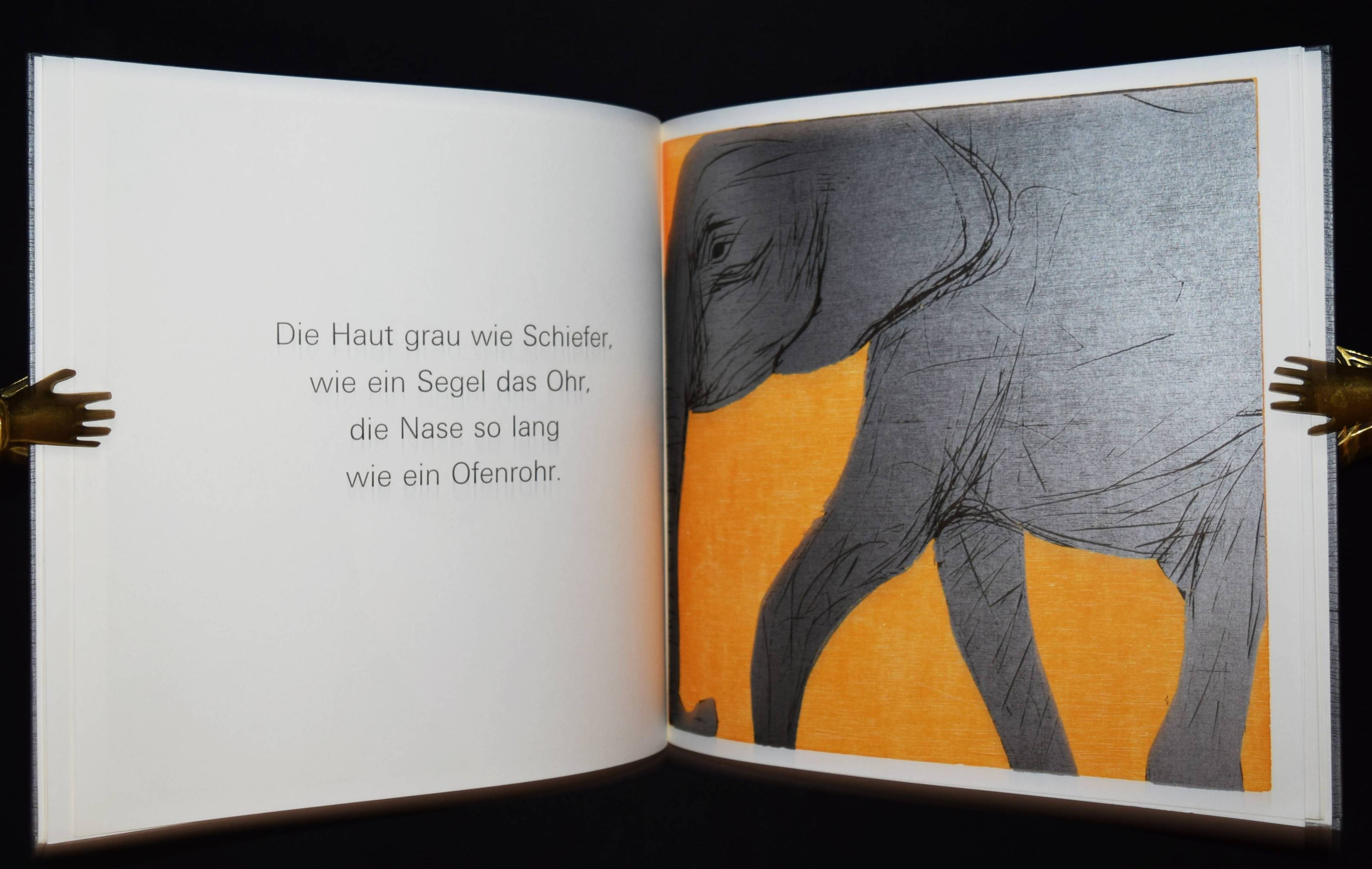 Laurion, Stefanie und Claude. Elefanten. Holzschnitte Antje Wichtrey. Basel, Basler Papiermühle (2005). Gr.-4° (32 x 32 cm.). [24] S. mit 12 Orig.-Holzschnitten (davon 2 auf den Deckeln). Illustr. Orig.-Halbleinenband. (Künstlerbücher für Kinder, Band 1). In limitierter Auflage von 1000 Exemplaren hergestelltes Künstler-Bilderbuch. – In der Basler Papiermühle von Original-Holzstöcken gedruckt. Buchbindearbeiten durch die Buchbinderei Burkhardt AG in Mönchaltdorf. – Die Münchner Malerin und Holzschneiderin A. Wichtrey (geb. 1966) lebt und arbeitet in Granada und München. „Seit 1989 widmet sie sich überwiegend dem Holzschnitt und erzielt eine ganz eigene Wirkung durch virtuos belebte Flächen. Von dieser Technik ausgehend entwickelte sie ihr Elefantenbuch: Ein wunderschönes Buch mit den Original-Holzschnitten der Künstlerin“ (Verlagswerbung). – Sehr gutes Exemplar.