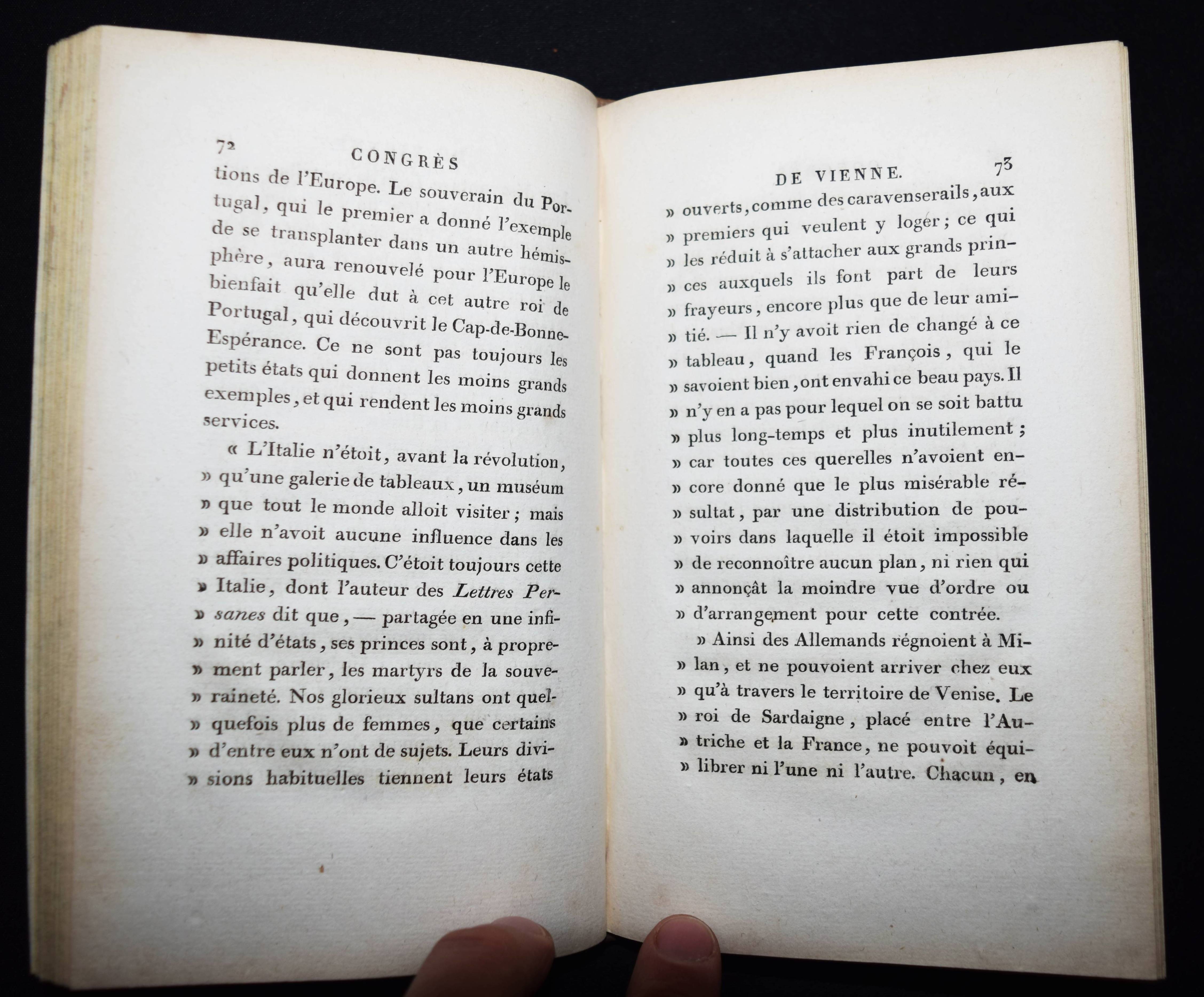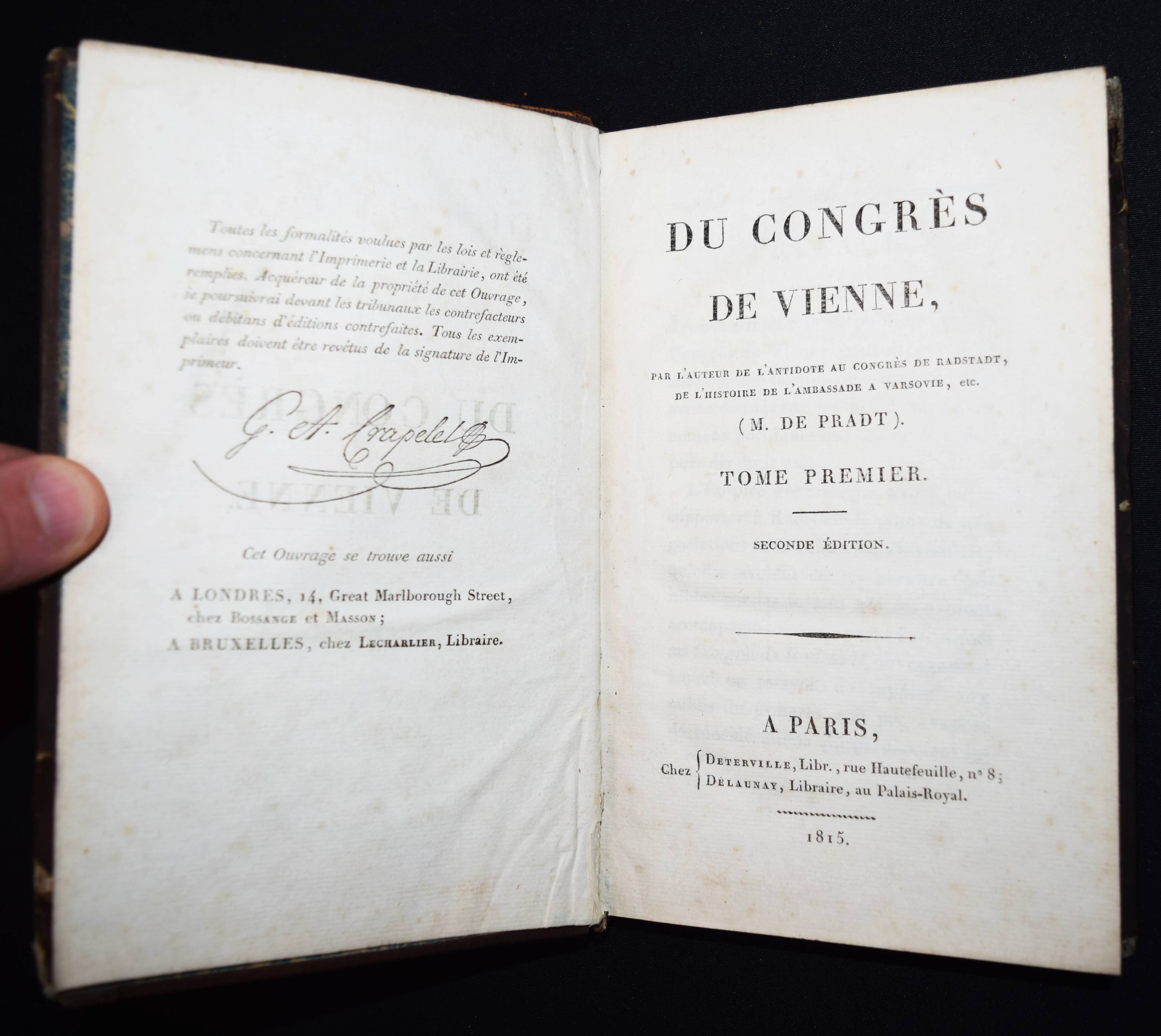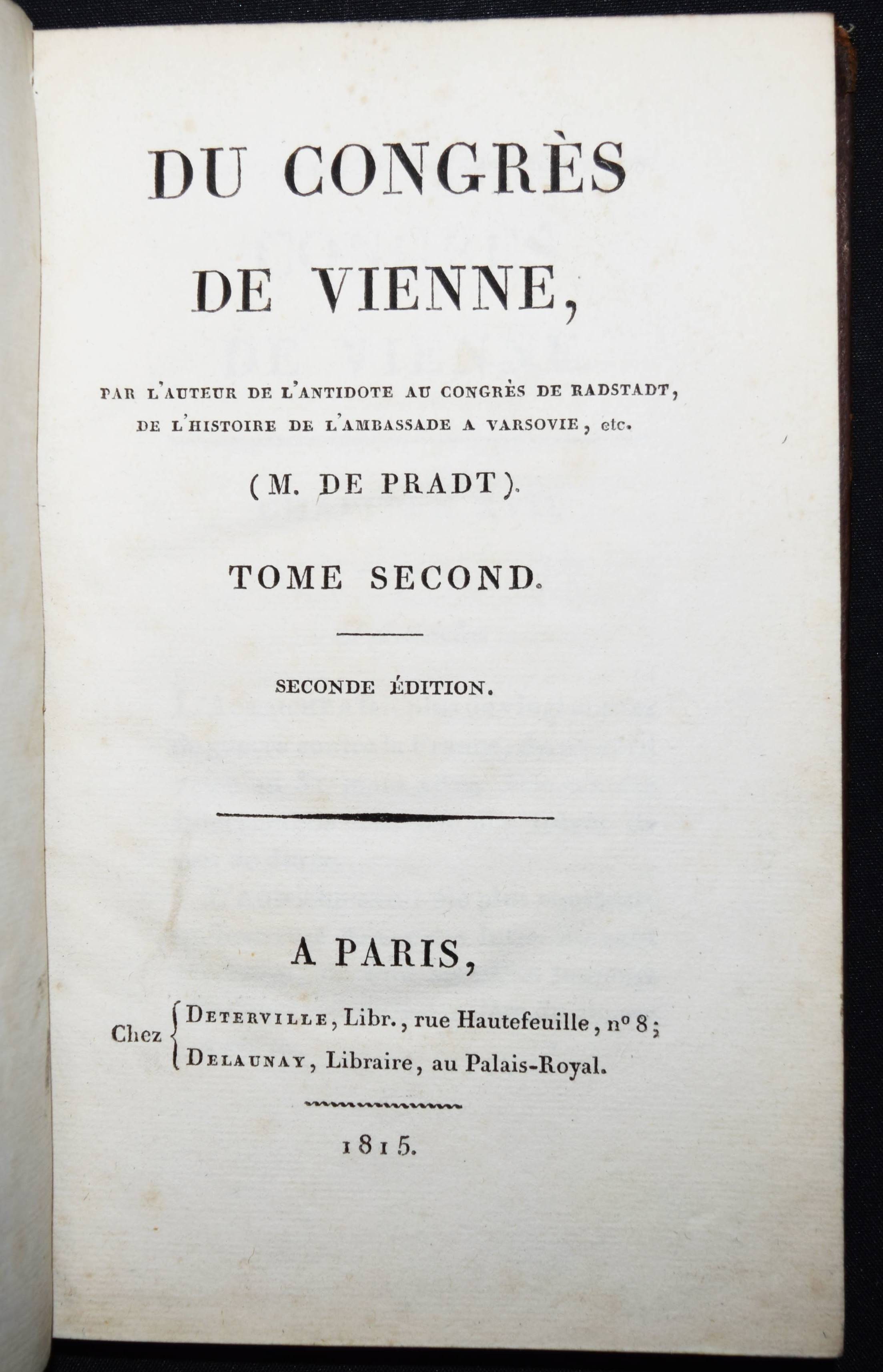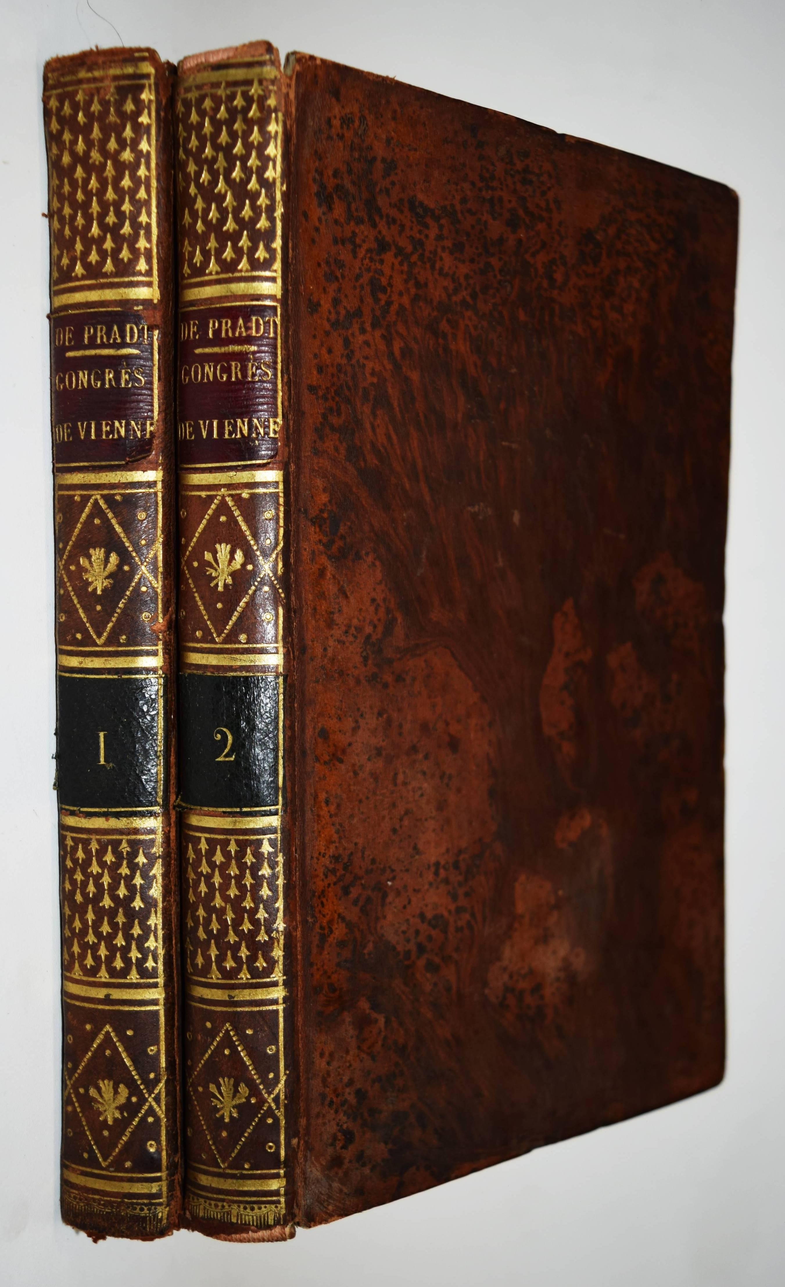 Napoleon I. – Pradt, (Dominique Georges Frédéric de Riom de Prolhiac de Fourt) de. Du Congrès de Vienne. Par l`auteur de l`antidote au Congres de Radstadt, de l`histoire de l`ambassade a Varsovie, etc. Seconde édition. 2 Bände. Paris, Deterville et Delaunay (impression par G. A. Crapelet) 1815. 8°. [2] Bl., XIX, 274 S.; [2] Bl., 267 S. Kalbslederbände der Zeit mit goldgepr. Rückensch. und dekorativer Rückenvergoldung. Vgl. Kircheisen, Zeitalter 3785. – Zweite Auflage, im Jahr der ersten Ausgabe. Eine erste deutsche Übersetzung erschien 1816 in Freiburg (Fromm 20636). Vom Drucker G. A. Crapelet im Druckvermerk signiert. – Weniger eine Geschichte der Verhandlungen als eine „Prüfung ihres Geistes und der muthmaßlichen Folgen der durch sie begründeten Ordnung“ (C. W. v. Rotteck im Vorwort zu seiner Übersetzung). – Der franz. Diplomat D. de Pradt (1759-1837), ein enger Berater Napoleons und seit 1812 Botschafter in Warschau, „erregte aber hier durch sein zweideutiges Benehmen die Unzufriedenheit der Polen und wurde von Napoleon in seine Diözese verwiesen. Seitdem war er der heftigste Feind des Kaisers“ (Wikipedia). – Einbände berieben und etwas bestoßen, gutes dekorativ gebundenes und sauberes Exemplar.