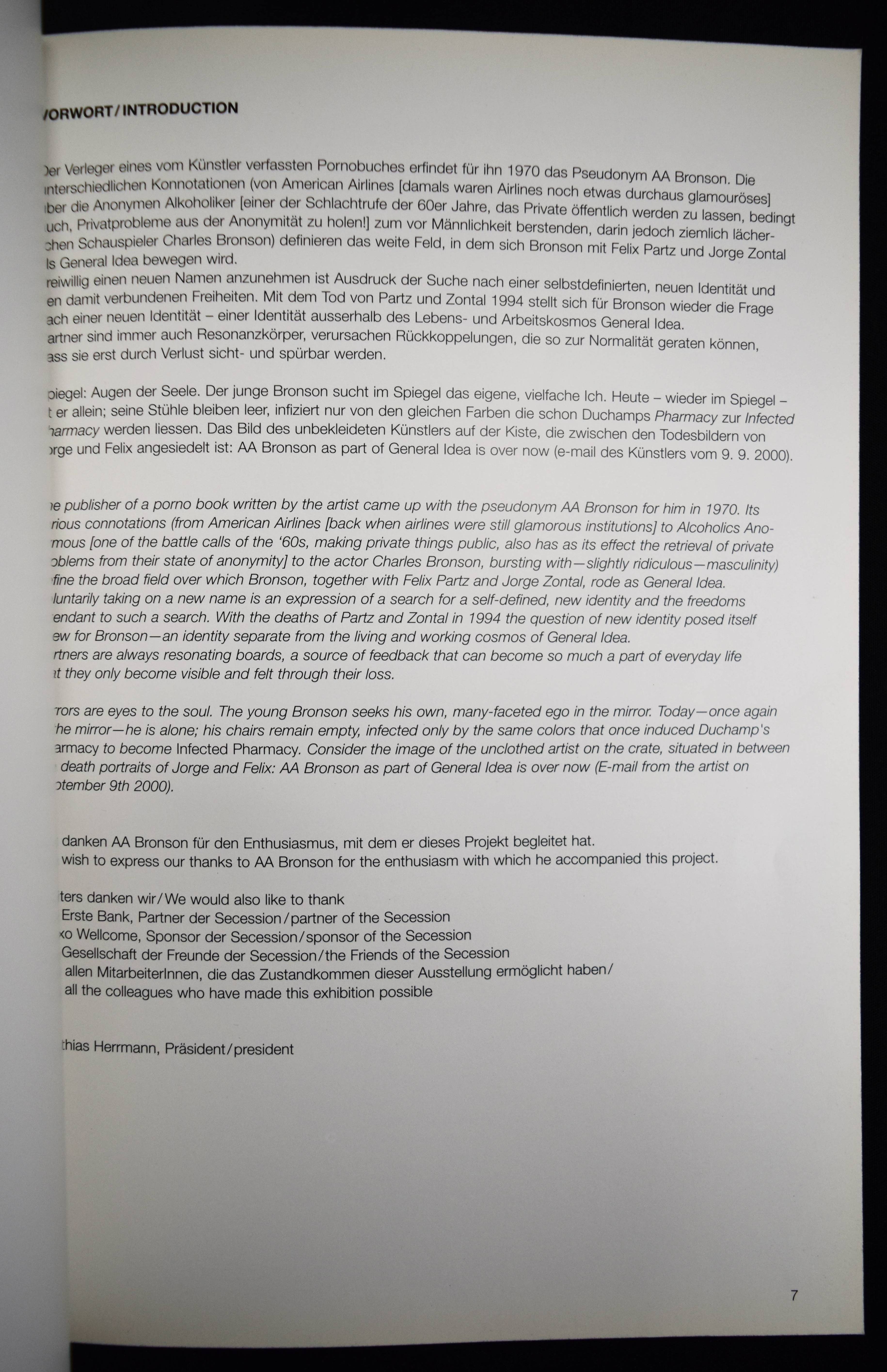 Bronson – Tietjen, Friedrich (Hrsg.). AA Bronson (d. i. Michael Tims). 1969 – 2000. (Katalog zur Ausstellung 5.10. – 26.11.2000 in der Künstlervereinigung der Secession). Wien, Künstlervereinigung der Secession 2000. 4°. [2] Bl., 36 S., [2] Bl. mit 30 teils farb. Abb. Orig.-Kartonumschlag. Katalog der ersten Einzelausstellung in Europa der kanadischen Konzeptkünstlers. – „AA Bronson OC RCA (born Michael Tims in Vancouver in 1946) is an artist. He was a founding member of the artists’ group General Idea, was president and director of Printed Matter, Inc., and started the NY Art Book Fair and the LA Art Book Fair. … In 1969, Bronson’s involvement in communes and radical education theories and practices took him to Toronto, to investigate the Rochdale College experiment.[6] It was through some of the members of Rochdale College that Bronson deepened his friendships with Felix Partz and Jorge Zontal (each having arrived in Toronto for different reasons). They, along with several others, became involved in the countercultural performance and „happenings“ scene that centered around Toronto’s Theatre Passe Muraille. Through Theatre Passe Muraille, Bronson apprenticed with Coach House Press (he also did graphic design for Passe Muraille). The General Idea artists group, initially a loose collective of five to seven people, was founded in 1969 by Bronson, Jorge Zontal and Felix Partz, Partz’s then-girlfriend Mimi Paige, and Granada Gazelle (a.k.a. Granada Venne or Sharon Venne). … The three worked and lived together for 25 years, until their collaboration was terminated with the death of both Zontal and Partz in 1994“ (Wikipedia). – Gutes Exemplar.