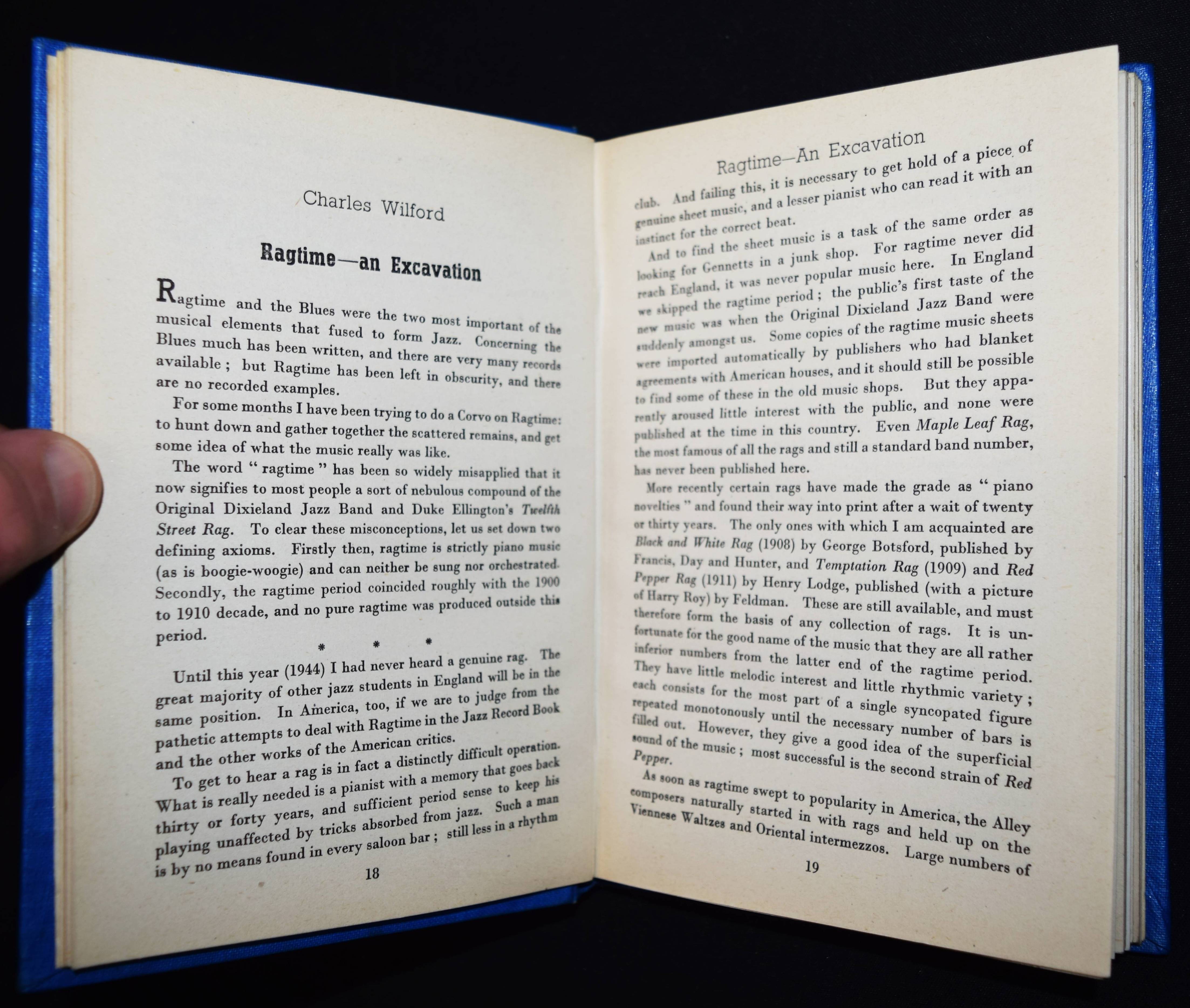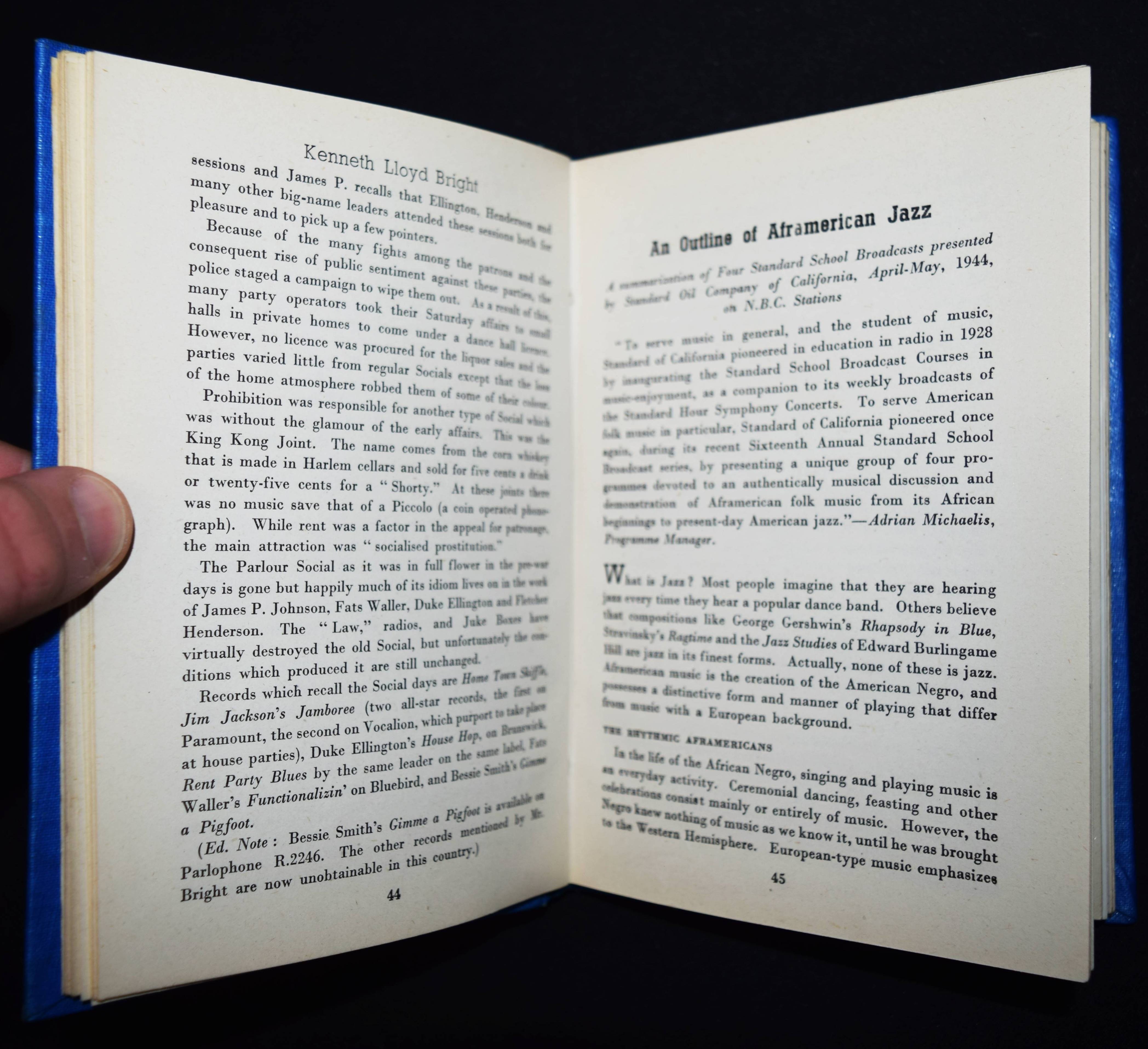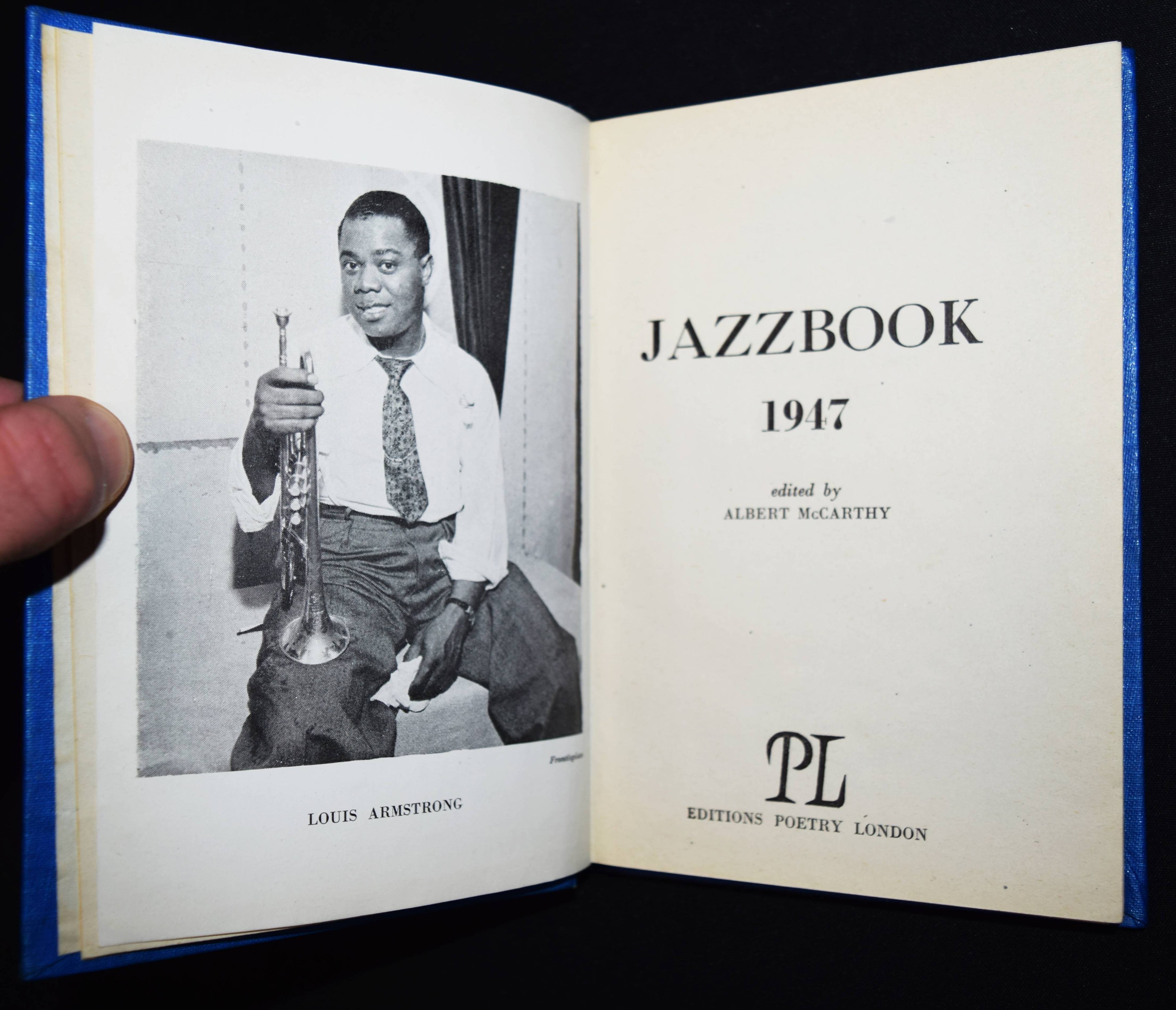 McCarthy, Albert (Ed.). Jazzbook 1947. London, Editions Poetry (1947). Kl.-8°. [4] Bl., 171 S. mit 10 Tafeln. Orig.-Leinenband mit goldgepr. Rückentitel. (The PL Yearbook of Jazz, volume II). Zweiter Jahrgang des seltenen Jazz-Jahrbuchs. Die Tafeln zeigen Louis Armstrong, Mary Lou Williams, „Cootie“ Williams, Rex Stewart, Gene Sedric, Garland Wilson, Django Rheinhardt, Francis „Muggsy“ Spanier und vier Jazz-Bands. – Gutes Exemplar.