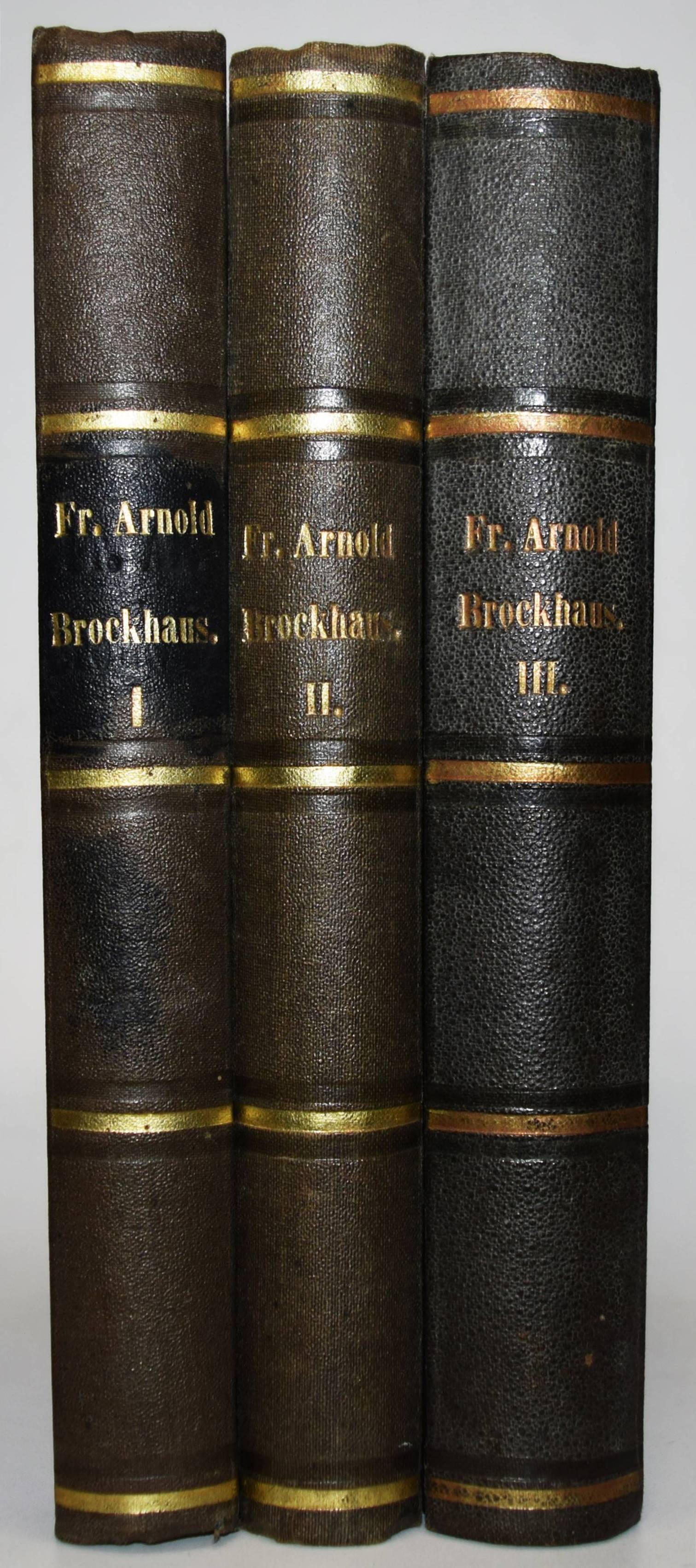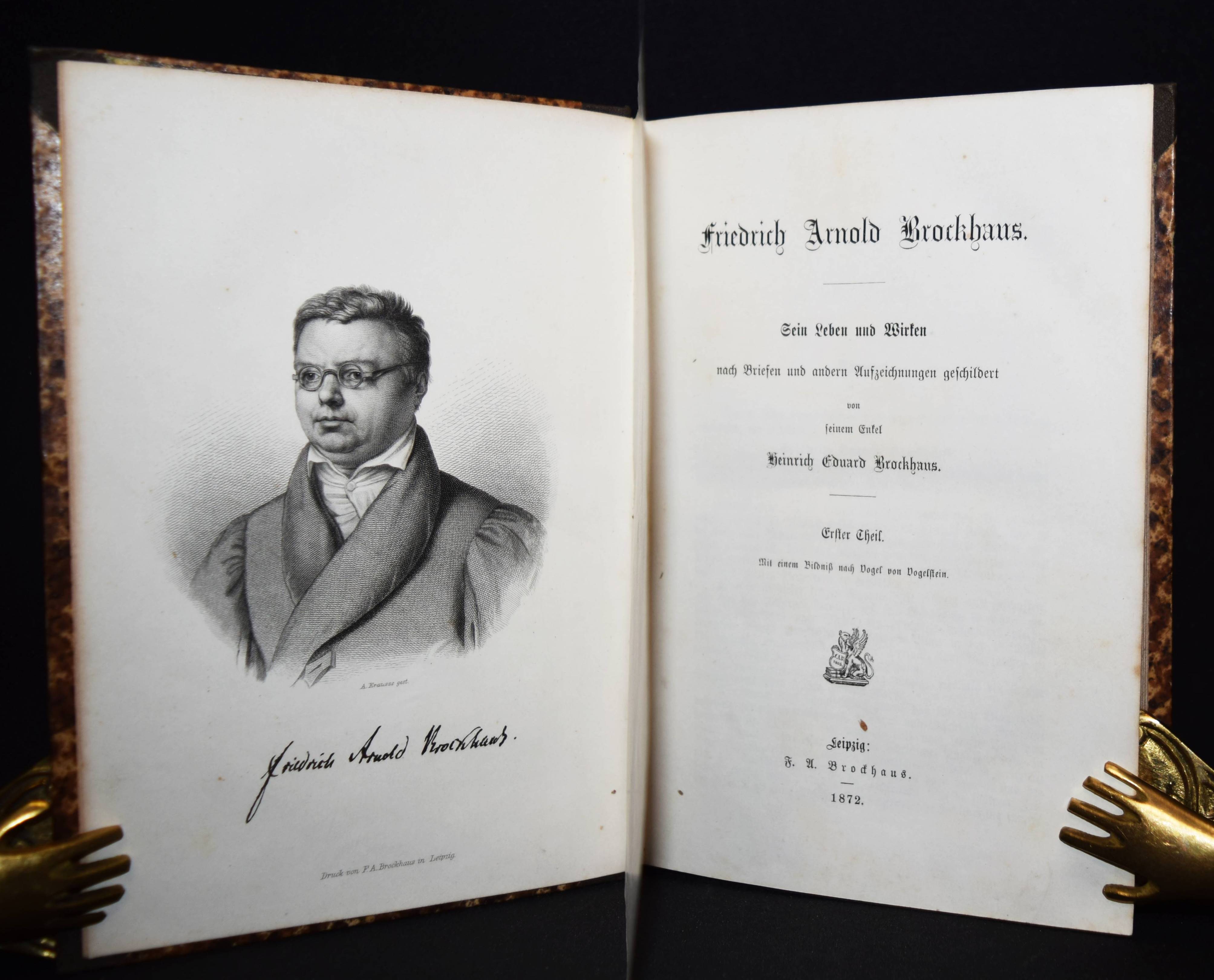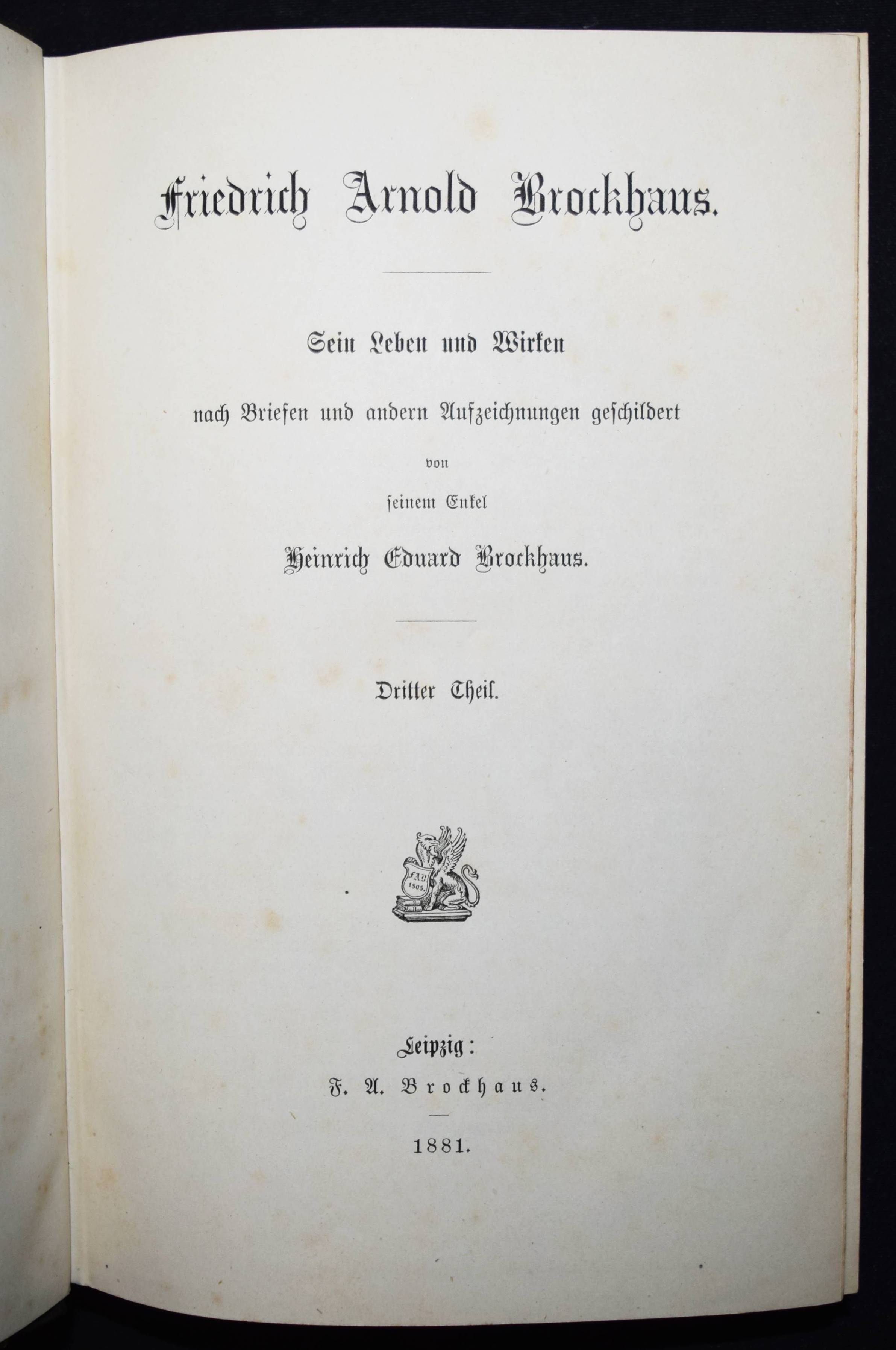 Brockhaus, Heinrich Eduard. Friedrich Arnold Brockhaus. Sein Leben und Wirken nach Briefen und andern Aufzeichnungen geschildert. 3 Bände. Leipzig, F. A. Brockhaus 1872-1881. 8°. X, [1] Bl., 384 S.; VIII, [1] Bl., 394 S., VI, [1] Bl., 533 S. mit gestoch. Portrait in Band I. Orig.-Halbleinenbände mit goldgepr. Rückentiteln und Linienvergoldung. ADB III, 337 ff. – Einzige Ausgabe der bis heute maßgeblichen Biographie des berühmten Verlegers und Enzyklopädisten F. A. Brockhaus (1772-1823). – Heinrich Eduard Brockhaus wertete hunderte Geschäfts- und Privatbriefe aus. „Seine Arbeit stellt allein deshalb bis heute die Grundlage für jede weitere Untersuchung zu Brockhaus dar, weil viele der in seiner zwischen 1872 und 1881 erschienenen Biografie im Wortlaut abgedruckten Dokumente infolge von Kriegsverlusten nicht mehr im Original zur Verfügung stehen.“ – „Brockhaus’ sanguinisch-cholerisches Temperament, der lebhafte Widerwille, den er gegen jede Ungerechtigkeit oder Unbilligkeit empfand … endlich auch das Selbstbewusstsein, das sich immer stärker bei ihm ausbildete, seit er in harten Kämpfen und wesentlich durch eigene Kraft Geltung, Namen und Erfolge errungen hatte: diese verschiedenartigen Momente wirkten zusammen, um ihn, wie mit Collegen und Behörden, auch mit Schriftstellern leicht in Streitigkeiten geraten zu lassen“ (H. E. Brockhaus III, S. 104). – Stellenweise etwas braunfleckig, gutes Exemplar.