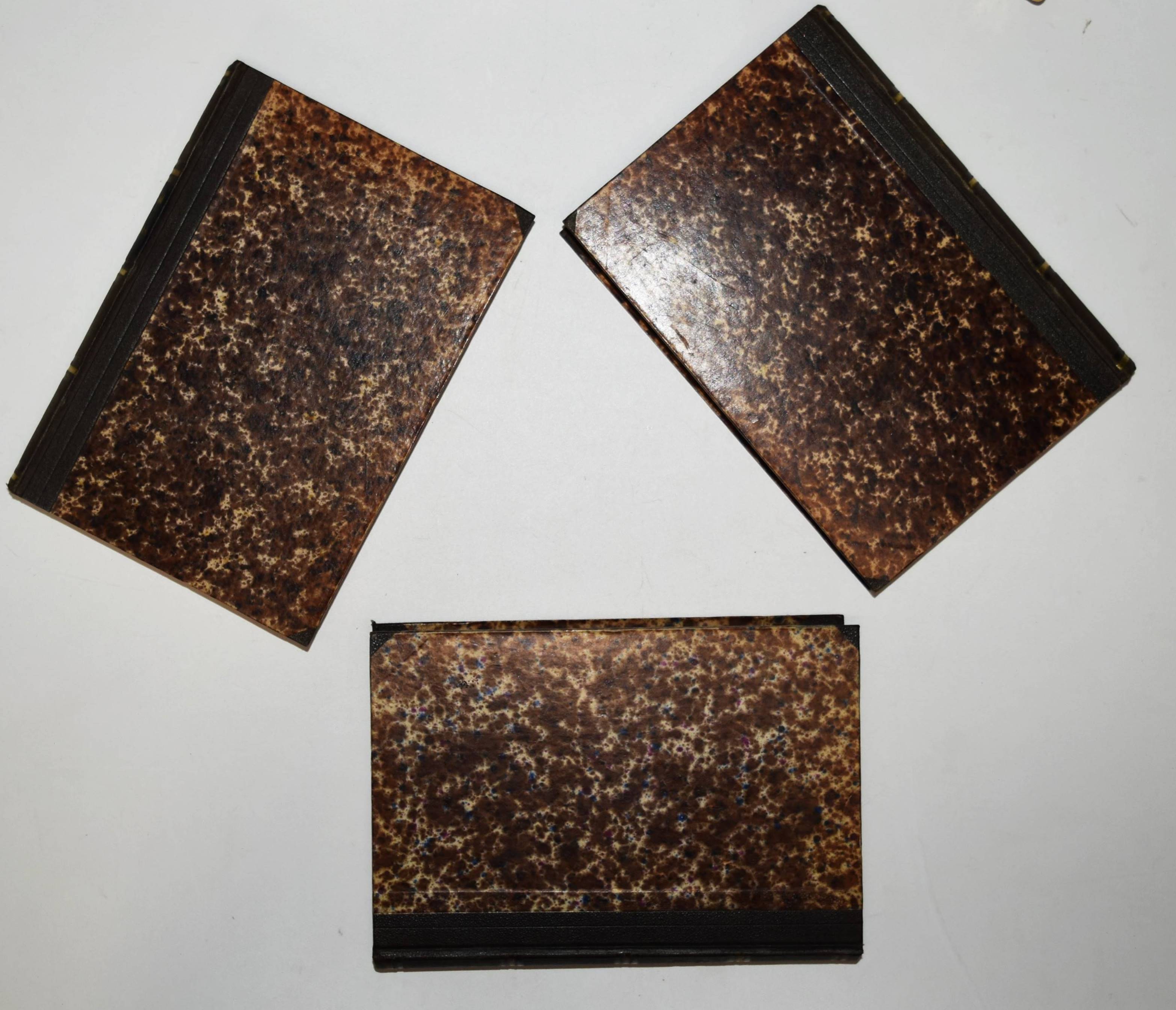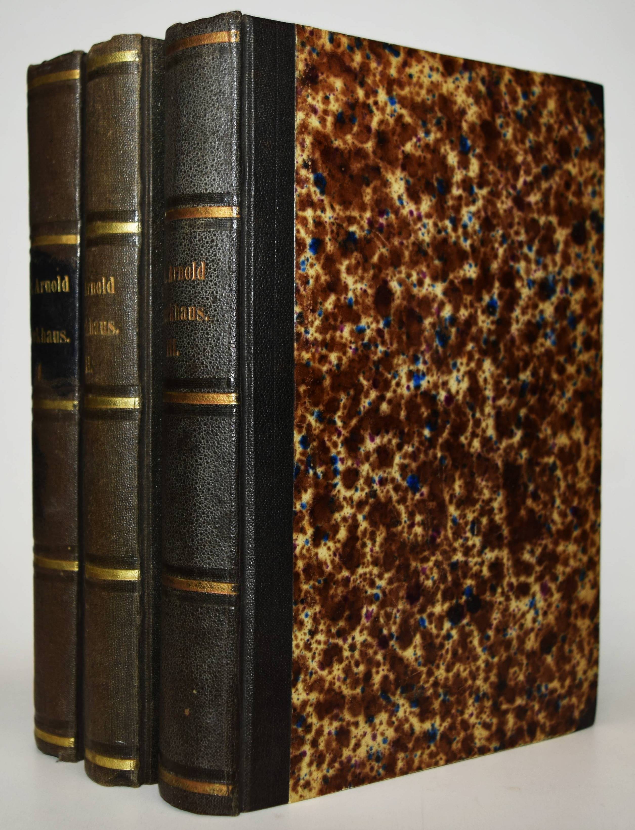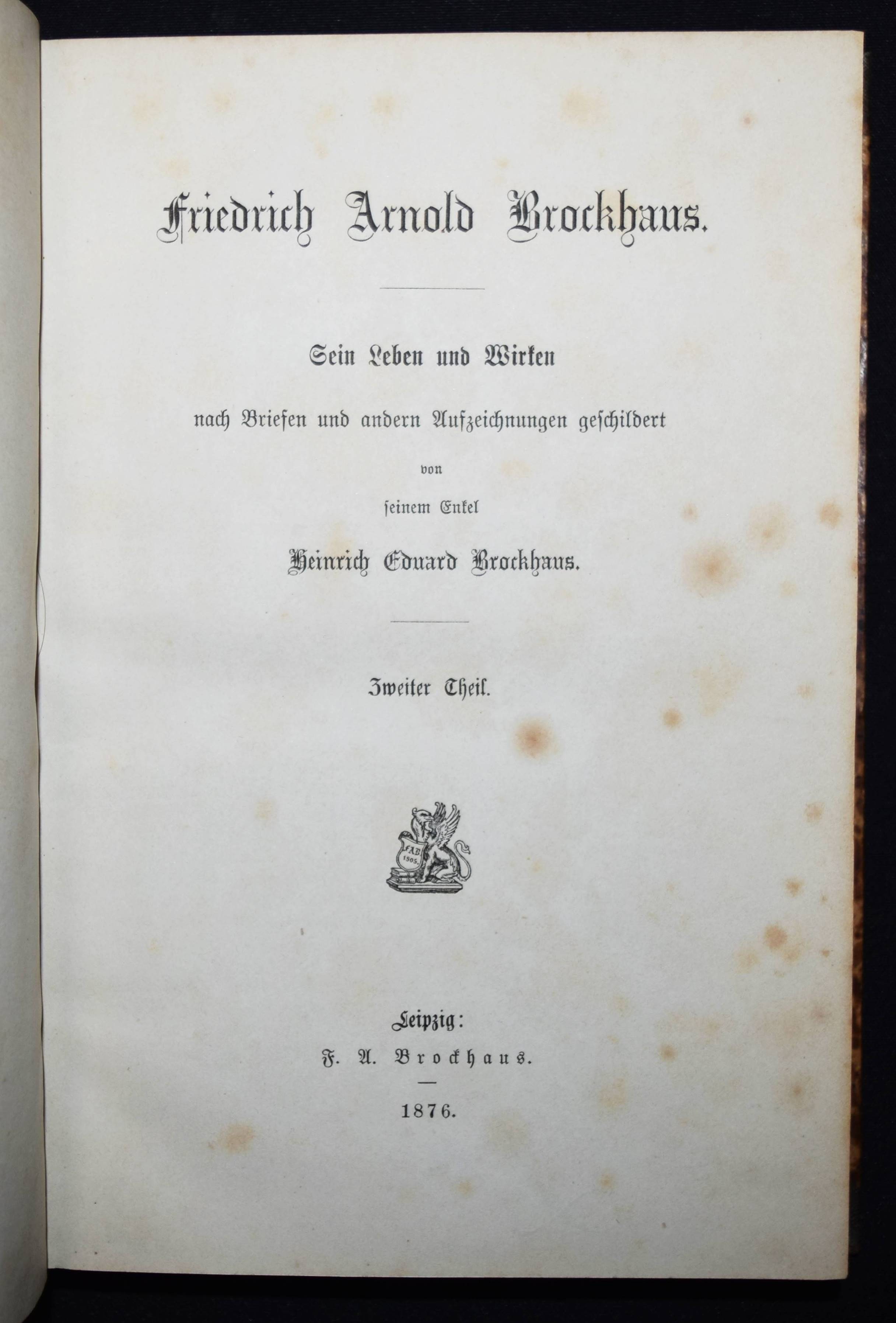 Brockhaus, Heinrich Eduard. Friedrich Arnold Brockhaus. Sein Leben und Wirken nach Briefen und andern Aufzeichnungen geschildert. 3 Bände. Leipzig, F. A. Brockhaus 1872-1881. 8°. X, [1] Bl., 384 S.; VIII, [1] Bl., 394 S., VI, [1] Bl., 533 S. mit gestoch. Portrait in Band I. Orig.-Halbleinenbände mit goldgepr. Rückentiteln und Linienvergoldung. ADB III, 337 ff. – Einzige Ausgabe der bis heute maßgeblichen Biographie des berühmten Verlegers und Enzyklopädisten F. A. Brockhaus (1772-1823). – Heinrich Eduard Brockhaus wertete hunderte Geschäfts- und Privatbriefe aus. „Seine Arbeit stellt allein deshalb bis heute die Grundlage für jede weitere Untersuchung zu Brockhaus dar, weil viele der in seiner zwischen 1872 und 1881 erschienenen Biografie im Wortlaut abgedruckten Dokumente infolge von Kriegsverlusten nicht mehr im Original zur Verfügung stehen.“ – „Brockhaus’ sanguinisch-cholerisches Temperament, der lebhafte Widerwille, den er gegen jede Ungerechtigkeit oder Unbilligkeit empfand … endlich auch das Selbstbewusstsein, das sich immer stärker bei ihm ausbildete, seit er in harten Kämpfen und wesentlich durch eigene Kraft Geltung, Namen und Erfolge errungen hatte: diese verschiedenartigen Momente wirkten zusammen, um ihn, wie mit Collegen und Behörden, auch mit Schriftstellern leicht in Streitigkeiten geraten zu lassen“ (H. E. Brockhaus III, S. 104). – Stellenweise etwas braunfleckig, gutes Exemplar.