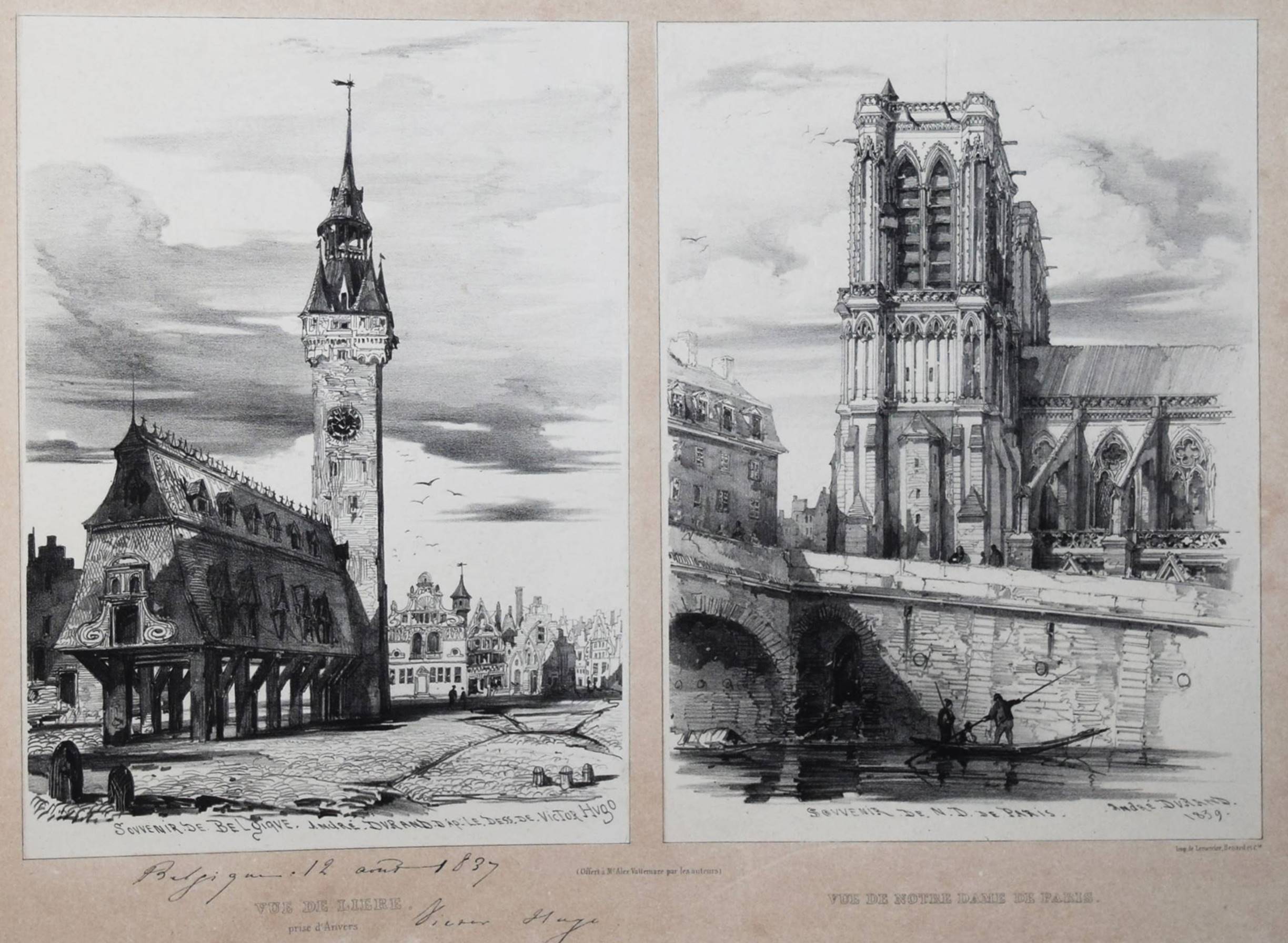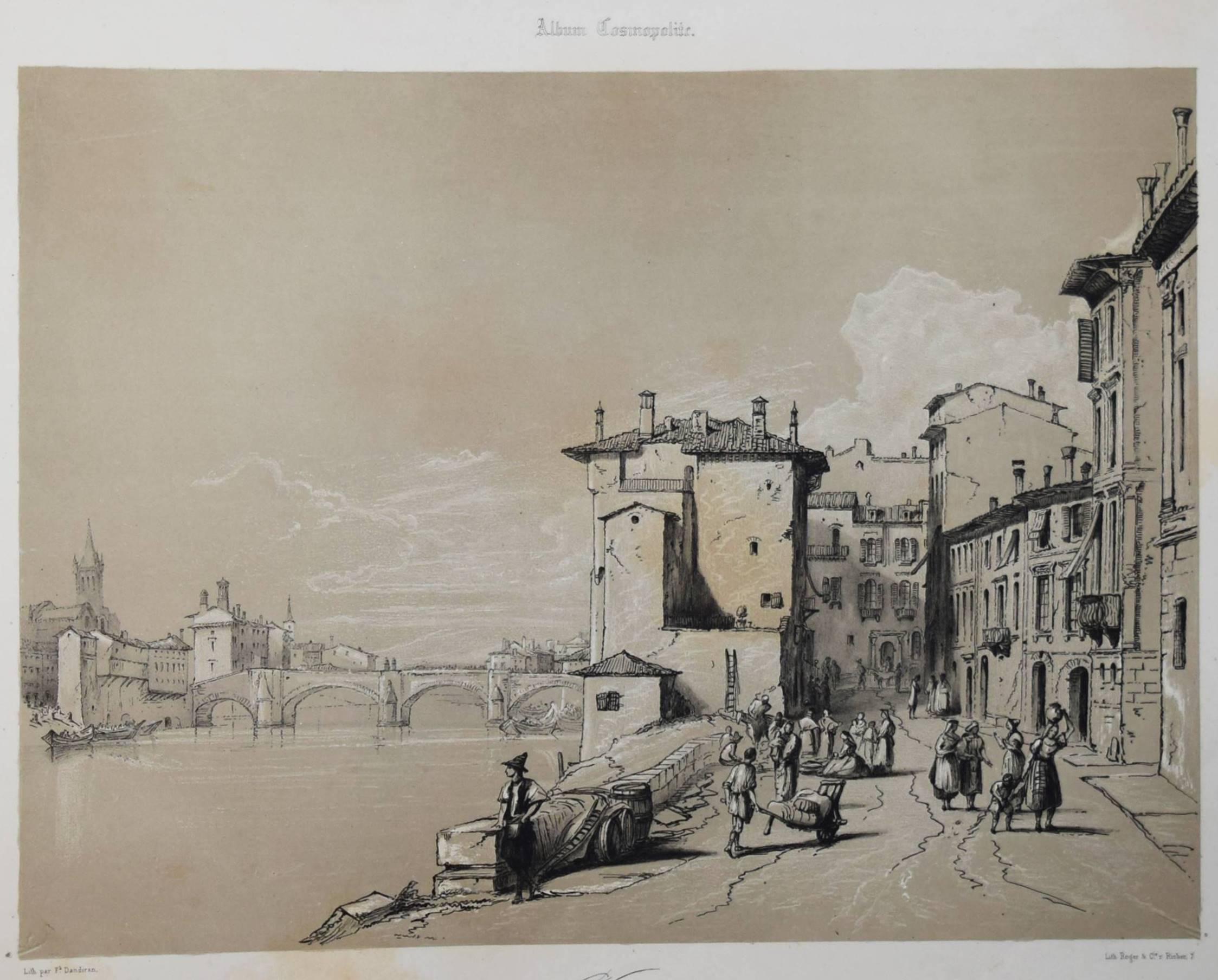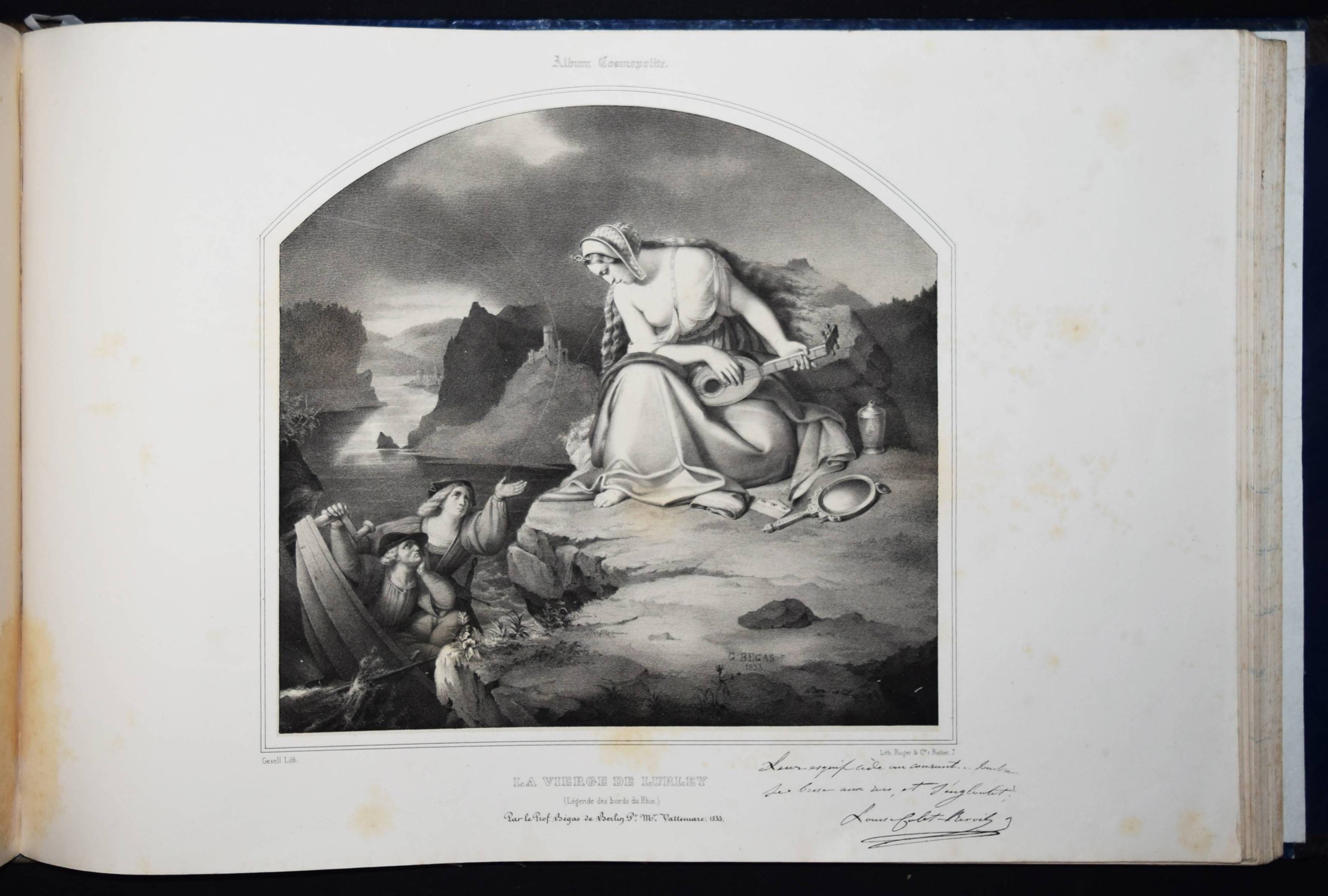 Henrichs, P. (Ed.). Album cosmopolite, ou choix des collections de M. Alexandre Vattemare. Composé de sujets historiques et religieux, paysages, marines, intirieurs, costumes et scines de moeurs, fleurs, medailles … tous originaux, dessinés par les principaux artistes de l’Europe. … Accompagné de textes et fac-simile d’autographes … Gravé et lithographé par les plus habiles artistes. Paris, Béthune et Plon 1837-(1839). Quer-Folio (36,5 x 56,5 cm.). [246] S. mit 75 (2 handkol.) lithogr. Tafeln und 22 lithogr. Autographen-Tafeln. Halblederband der Zeit mit goldgepr. Rückentitel und Romantikervergoldung. Einzige Ausgabe des seltenen Pracht-Albums. Der franz. Philantrop und Kunstmäzen Alexandre Vattemare (1796-1864), der als Bauchredner weltweit berühmt war, präsentiert hier eine der bedeutendsten Privatsammlungen des 19. Jahrhunderts mit Autographen, Medaillien und Zeichnungen. – Mit Lithographien von Champin, Cuvelier, André Durand, Freeman, Granet, Grevedon, Gsell, Jaime, Julien, Lassalle, Lebnert, Maggiolo, Maurin ainé, Raffert, Saint-Aulaire, Schinck, Tirpenne nach Zeichnungen von Eduard v. Bendemann, Auguste Callcott, Amaury Duval, Jacob Genssler, Grandville (″Walter Scott Scherif, liesant le Riot-Act à Alexandre Rassemblement“), Victor Hugo (erste Veröffentlichung von 2 Zeichnungen), Li-Lian-Tun (″Vue intérieure d’un théatre au Japon“), Ernst Meyer, Pinelli, Simon Quaglio, Moritz Retzsch, Julius Schnorr, Thédore de Tostoy, David Wilkie u.a. Außerdem Autographen von Alexander I., Zar von Russland, Beethoven, Lucien Bonaparte, Katharina der Großen, Oliver Chromwell, Erasmus von Rotterdam, Friedrich II., Goethe, Alexander v. Humboldt, Melanchthon, Moliere, Napoleon I., Puschkin, Rabelais, Rubens, Schiller, Washington u.v.m. Subskribiert wurde das Album von zahlr. wichtigen Staats-Oberhäuptern der ganzen Welt, darunter Präsident van Buren (USA), Leopold I. (Belgien), das franz. Königshaus, Königin Victoria (GB) und Sultan Mahmoud II. (Türkei), außerdem von allen deutschen Herrscherhäusern und den Hansestädten Bremen und Hamburg. – A. Vattemare hat während seiner Reisen auch Museen und Bibliotheken in der ganzen Welt besucht und einen hohen Grad an Duplizierung in Sammlungen festgestellt. „Er entwickelte ein neues System des kulturellen Austauschs von Gegenständen zwischen Bibliotheken und Museen, das er jahrzehntelang energisch förderte. Er nutzte seinen Ruhm als Bauchredner, um sein vorgeschlagenes kulturelles Austauschsystem zu fördern. Seine Vorschläge wurden in den Vereinigten Staaten und Kanada besser aufgenommen als in Frankreich. Er reiste in 13 Staaten und nach Kanada. Bis 1843 hatte er „1.800 Bände, 500 Münzen, 250 Gravuren und zahlreiche mineralogische und naturhistorische Exemplare“ nach Frankreich gebracht. Vattemare gilt als Initiator des Ausbaus des Bibliothekssystems in den Vereinigten Staaten, und sein Tauschsystem gilt als Vorläufer späterer kultureller Tauschsysteme, darunter der UNESCO . Bücher und andere Dokumente, die über Vattemares System ausgetauscht wurden, sind noch heute in Bibliotheken auf der ganzen Welt zu finden, insbesondere in Boston und Paris. Diese Sammlungen umfassen viele seltene und wertvolle Veröffentlichungen, die für moderne Historiker von großem Interesse sind.“ (Wikipedia). – Einband etwas berieben, durchgehend etwas braunfleckig, gutes Exemplar.
