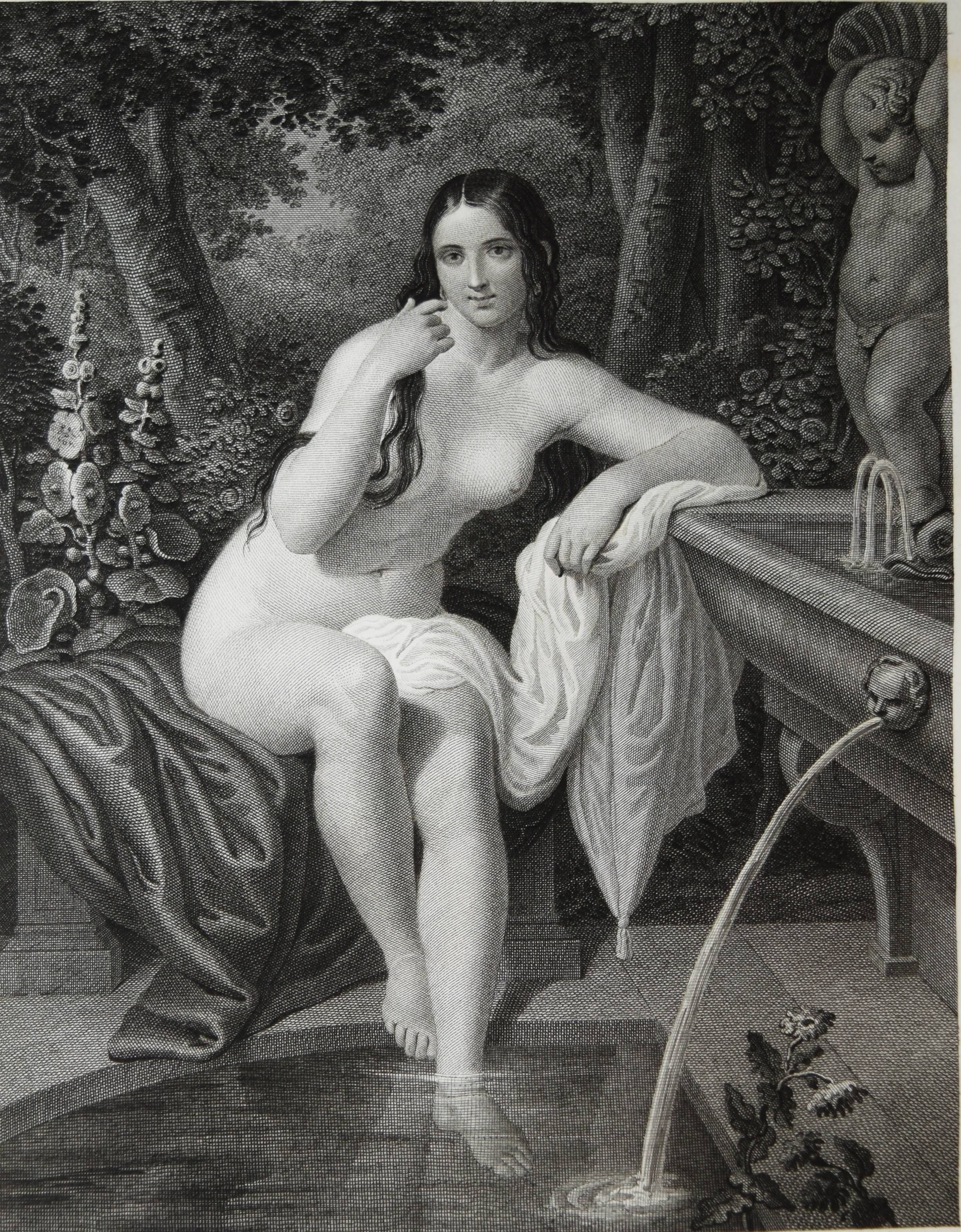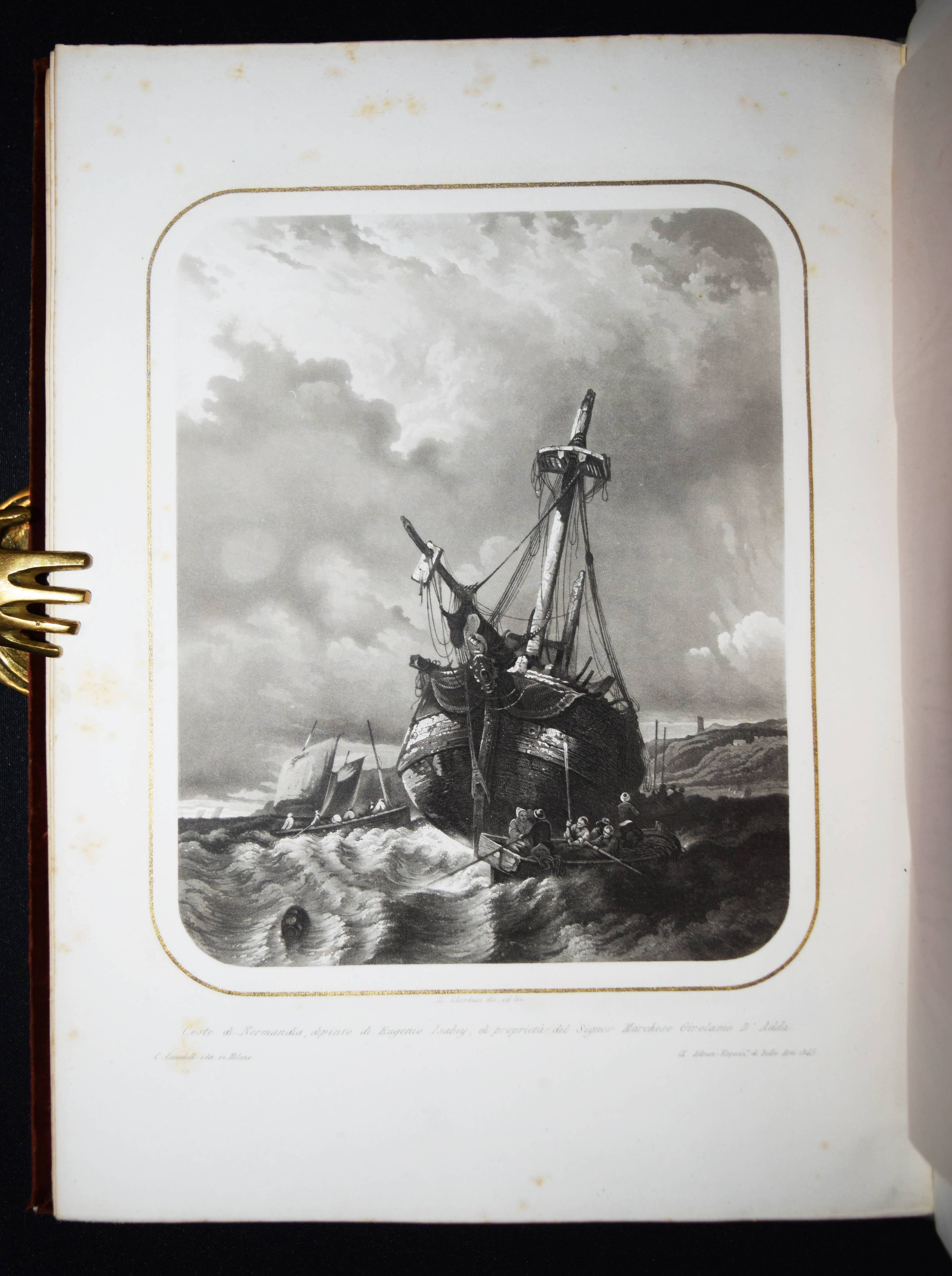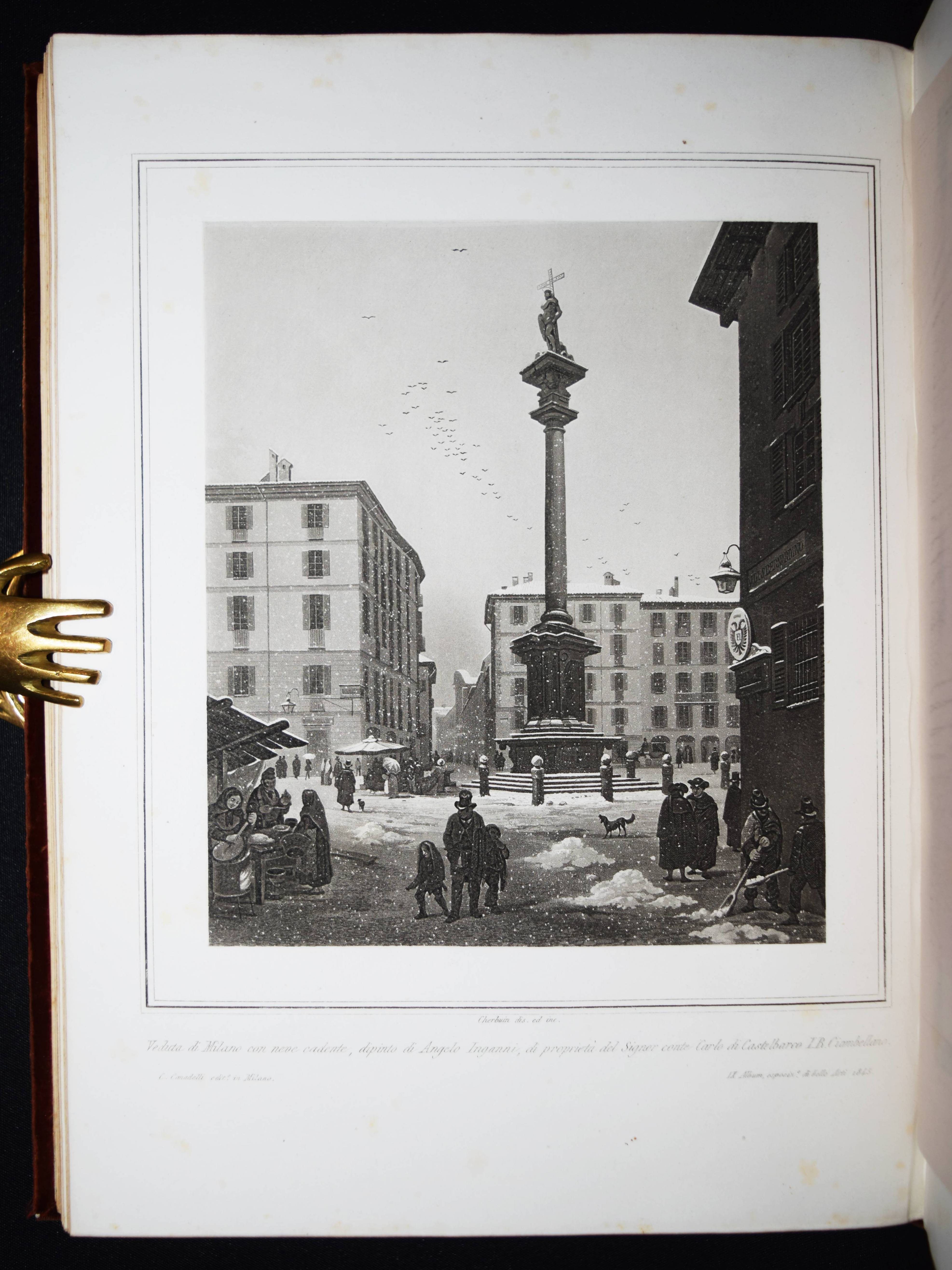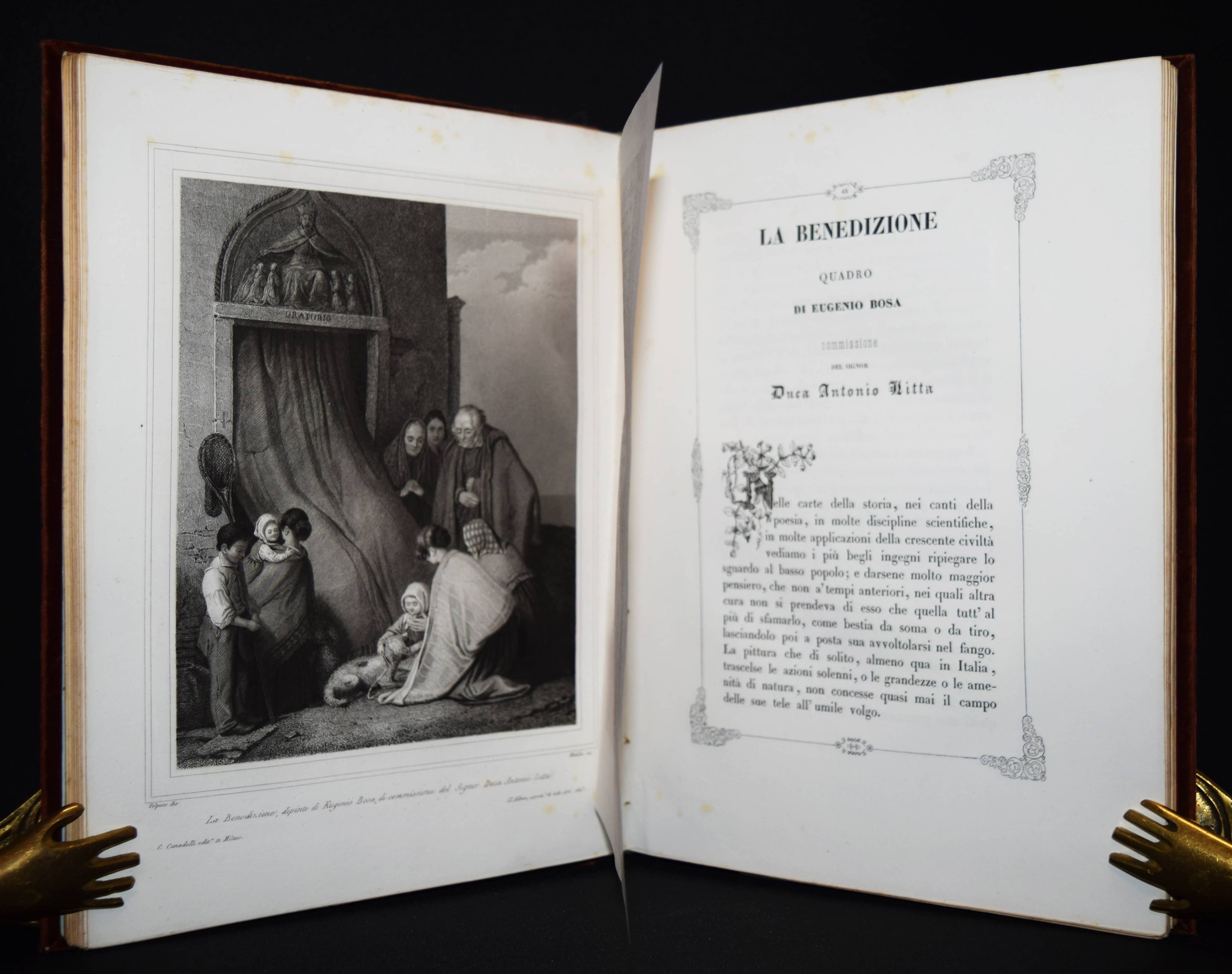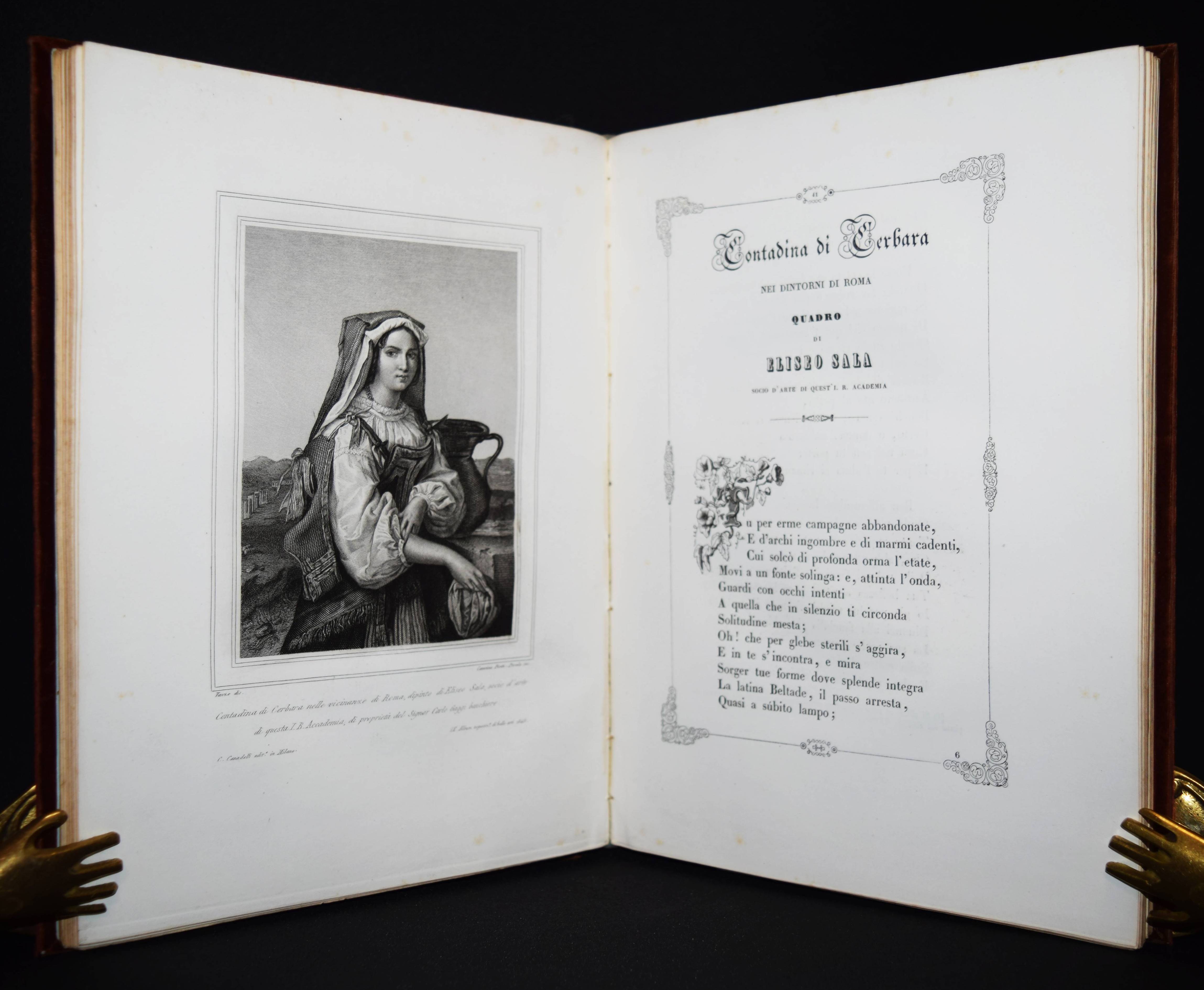 Villani, Filippo (Compilatore). Album esposizioni di belle arti in Milano ed altre citta d’Italia (Frontispiz). Esposizione di belle arti in Milano ed altre citta d’Italia 1845. Anno IX. Milano, Carlo Canadelli (1845). 4° (26,5 x 19,5 cm.). [2] Bl., 125 S., [3] Bl. mit farblithogr. typogr. Frontispiz und 18 Radierungen. Dunkelroter Samteinband mit goldgepr. Wappen auf dem Vorderdeckel, goldgepr. Deckelfiletten und Goldschnitt. Prachtvoll ausgestatteter Katalog zur 9. Mailänder Kunstausstellung. – Mit Radierungen nach Gemälden von Francesco Hayez (2), Carlo Gaggi, Francesco Podesti, Eliseo Sala, Eugenio Bosa, Rinaldo Belgiojoso, Camillo Brozzoni, Luigi Bisi, Luigi Sabatelli, Eugenio Isabey, Natale Schiavoni, Guiseppe Canella, Giuseppe Molteni, Remigio Van-Haanen, Angelo Inganni und Francesco Gonin. – Rücken ausgebleicht und berieben, sonst sehr gut erhalten.