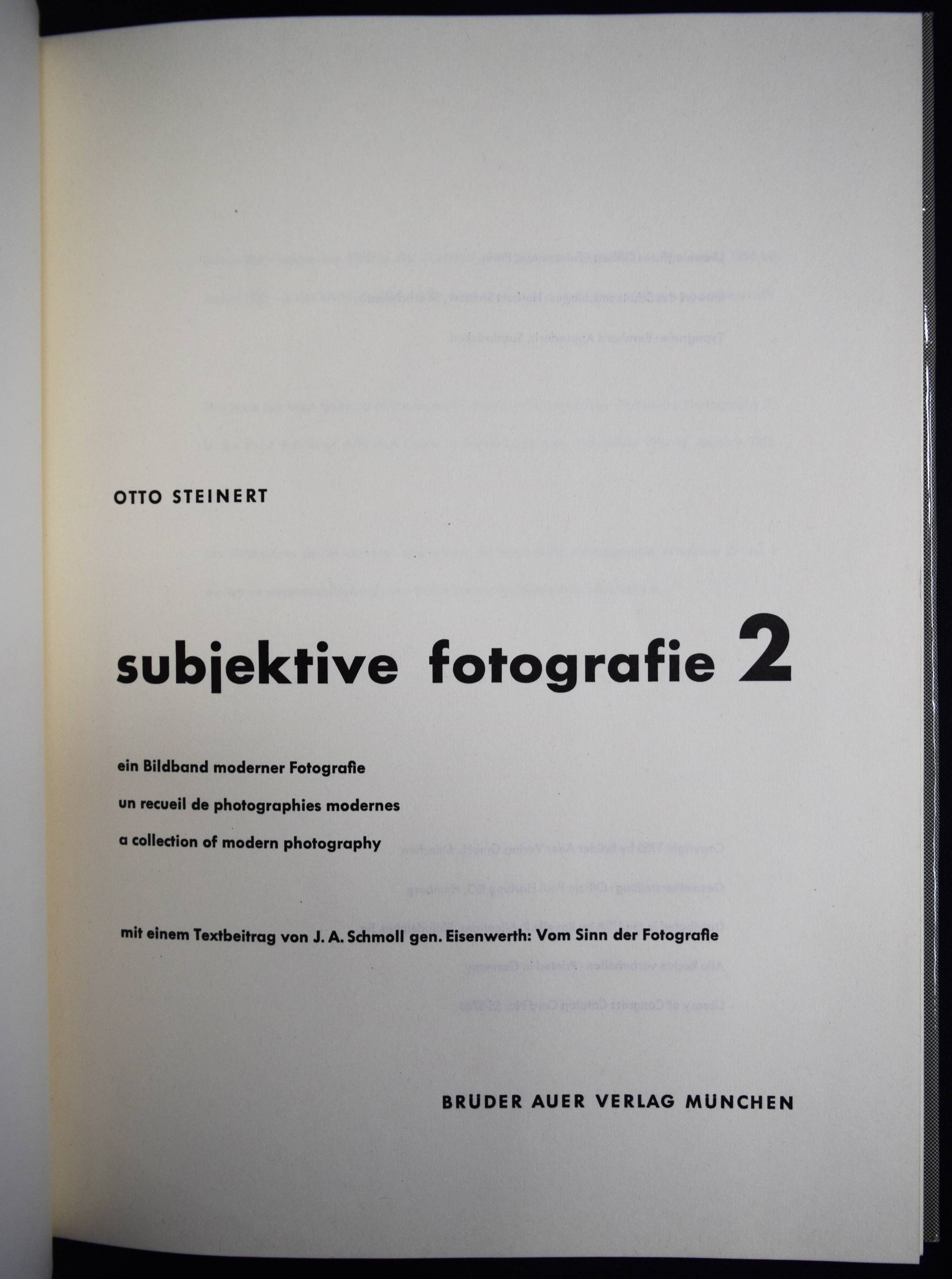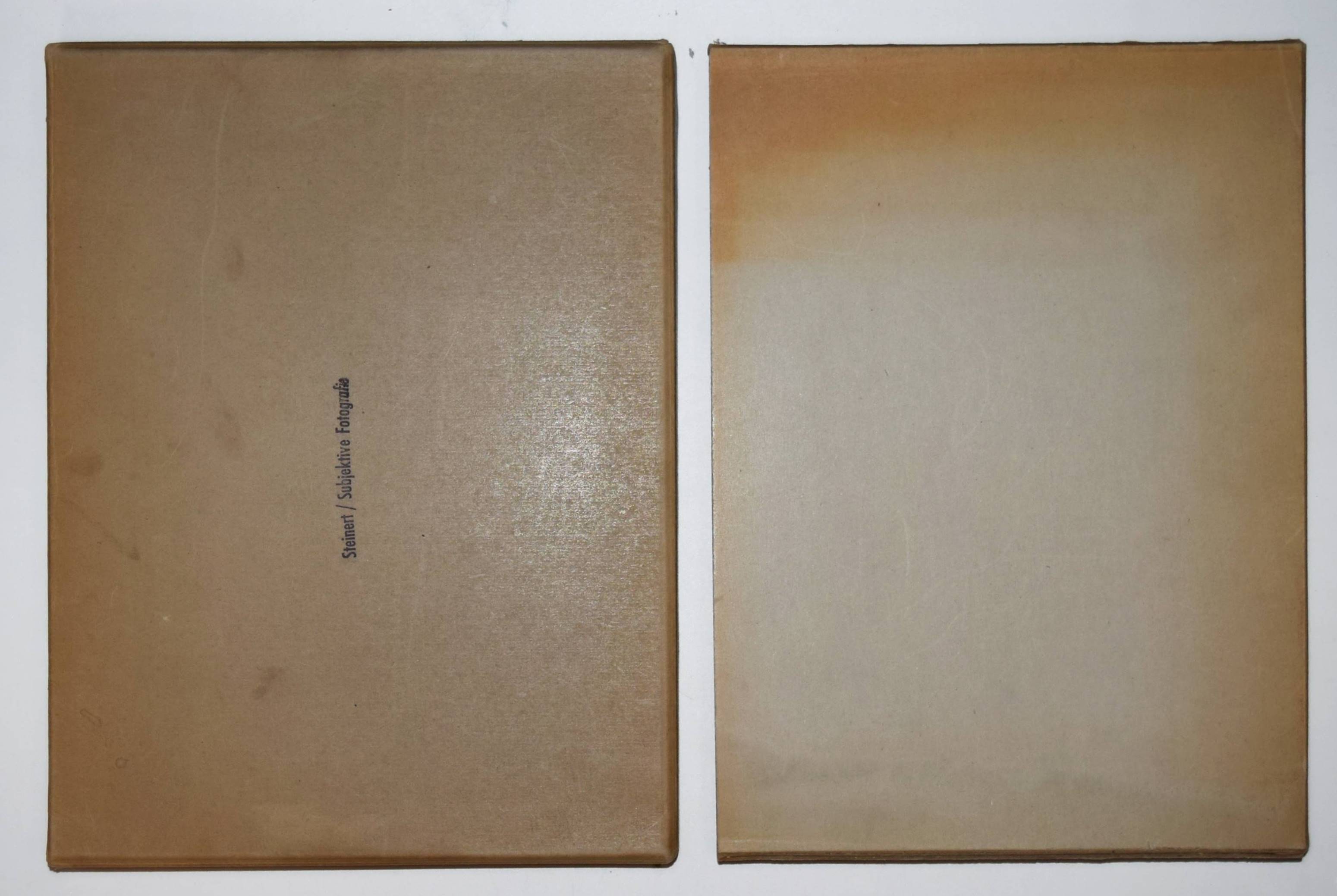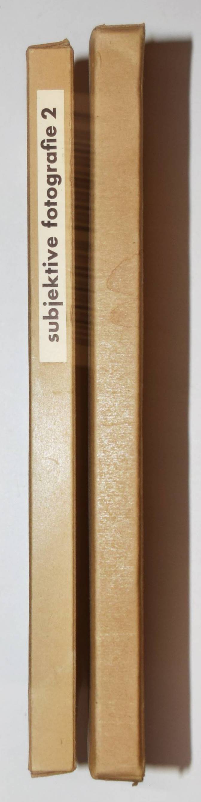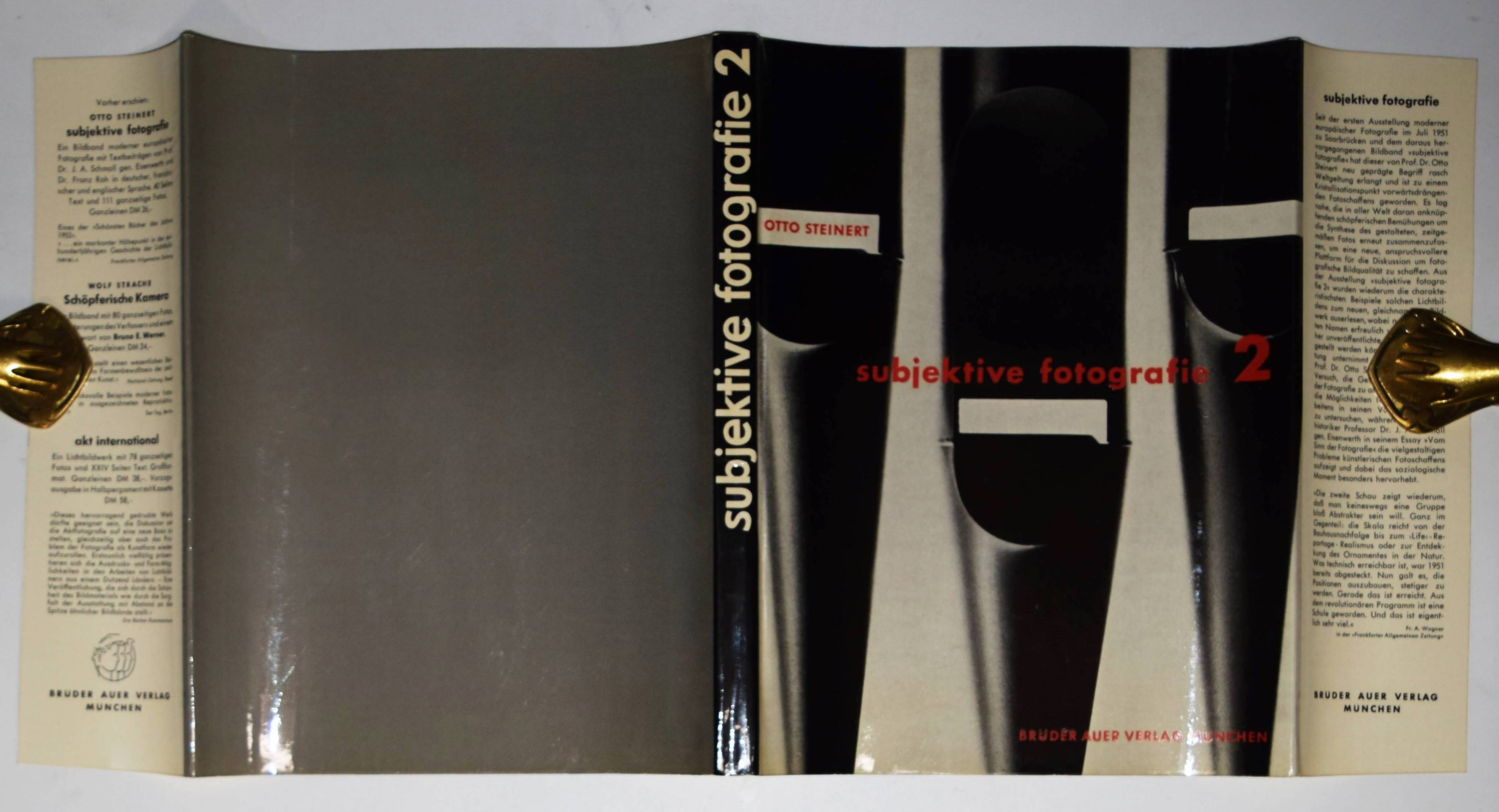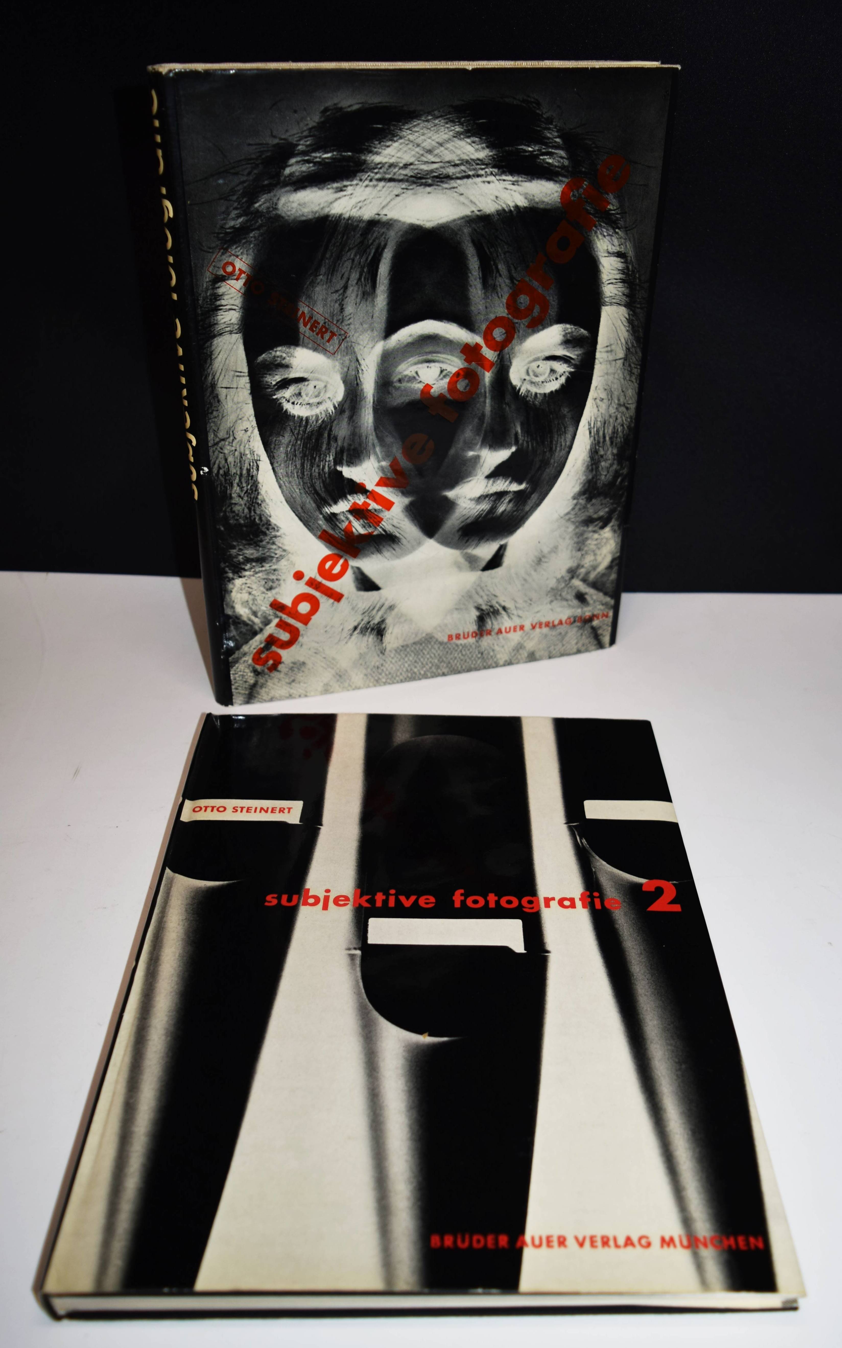 Steinert, Otto (Hugo Wilhelm). Subjektive Fotografie. Ein Bildband moderner Fotografie. (Mit Texten von J. A. Schmoll gen. Eisenwerth, Franz Roh u. O. Steinert). – Und: Ders. Subjektive Fotografie 2. Ein Bildband moderner Fotografie. Mit einem Textbeitrag von J. A. Schmoll gen. Eisenwerth: Vom Sinn der Fotografie. 2 Bände. München, Brüder Auer Verlag 1952 und 1955. 4°. 40 S., 111 Tafeln, 1 gefalt. Bl.; 39, (1) S., 111 Tafeln, 1 gefalt. Bl. Orig.-Leinenbände mit illustr. Orig.-Schutzumschlägen und Orig.-Pappschubern. Auer 352. Heidtmann 10781 . Koetzle 439 f. Parr/Badger I, 205. The Open Book 156 f. – Erste Ausgaben. – Beide Bände erschienen anlässlich der zwei wichtigen Ausstellungen „subjektive fotografie“ (Saarbrücken 1951-1955), 1958 folgte eine dritte Ausstellung. Erster umfassender Versuch, „die gestalterischen Möglichkeiten des Mediums Fotografie in Deutschland wieder aufzuzeigen“ (T. Koenig). – Mit Bildbeiträgen von Moholy-Nagy, Man Ray, H. Bayer, P. Keetman, E. Bourbat, F. Brill, W. Bischof, Chargesheimer, H. List, H. Hajek-Halke, R. Groebli, F. Roiter, R. Hausmann, Y. Ishimoto u.v.a. – „Otto Steinert war der einflussreichste Mentor der westdeutschen Fotografie nach 1945. … Die Betonung der eigengesetzlichen Mittel der Fotografie in Optik und Chemie sind Grundlage seines Schaffens – ein fast naturwissenschaftlich anmutendes Credo, das sich in gelegentlich etwas sterilen, zugleich aber von enormer formaler Dichte geprägten Darstellungen artikulierte“ (U. Pohlmann in Koetzle). – „Its exhibitions, as well as the two ‚Subjektive Fotographie‘ (Subjective Photography) books published by Steinert, were highly influential, and iis approach to photography might be compared to the kind of formalist work being made around the same time at the Chicago Institute of Design and other teaching centers in the United States. … Thus although ‚Subjektive Fotografie‘ was a widely influential book for a while, its significance waned fairly quickly and the movement withered away through the 1960s“ (Parr/Badger). – Die Pappschuber etwas fleckig, gebräunt und angestaubt, außergewöhnlich gute Exemplare des wichtigen Werks.
