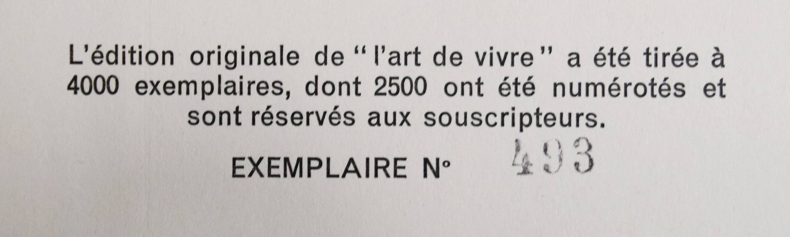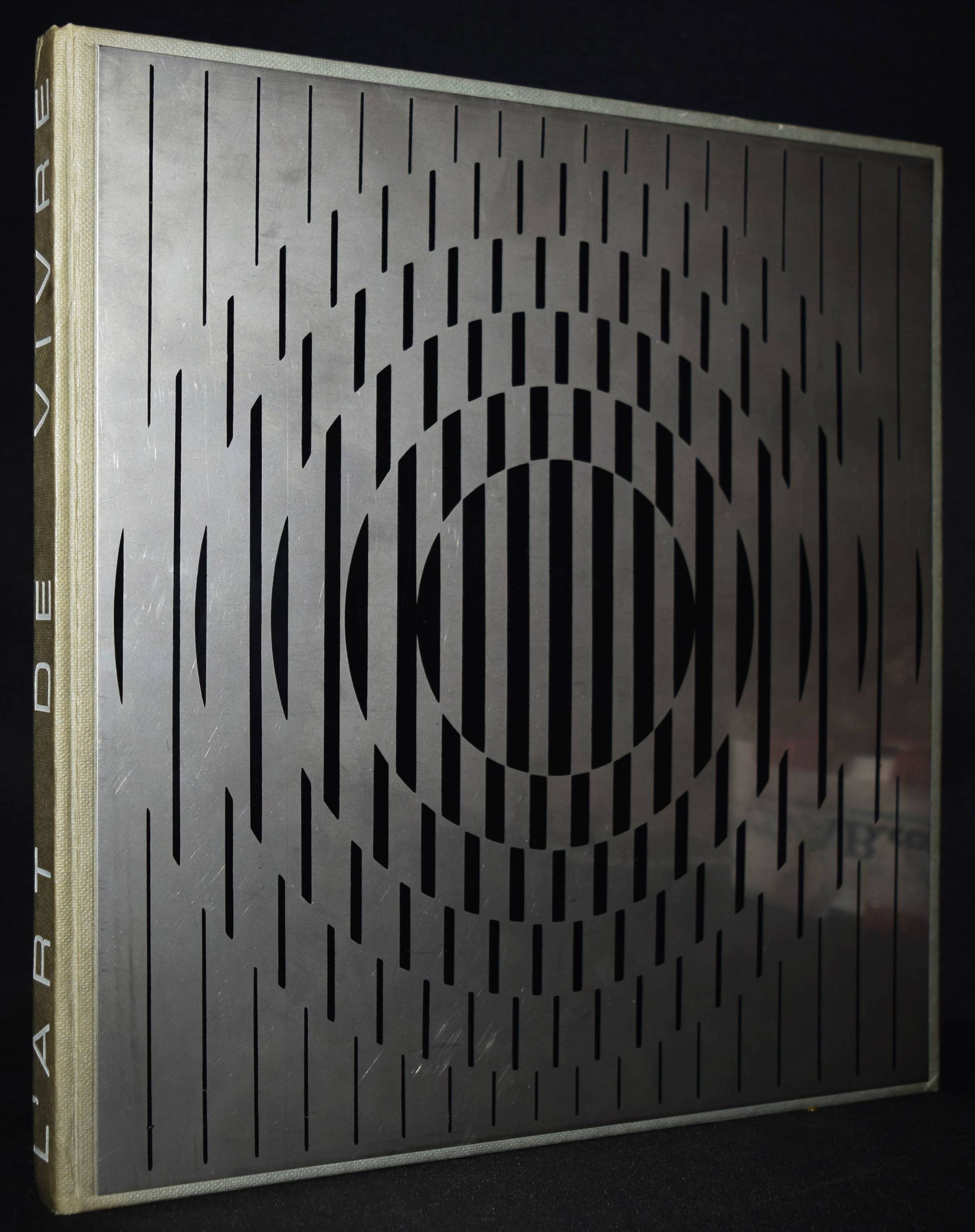 Jankowski, Michel (Ed.). L’Art de vivre. (Catalogue du 45e Salon de la Société des artistes décorateurs). Paris, Éditions Michel Jankowski (1968). 4° (29 x 27 cm.). 122 S., [1] Bl. mit zahlr. teils farb. und ganzs. Abb. Grauer Orig.-Leinenband mit mont. Edelstahl-Platte (Uginox, 28 x 25.7 cm.) mit einer Komposition von Victor Vasarely. Eines von 2500 num. Exemplaren für Subskribenten (Gesamtauflage 4500 Exemplare). – Buch-Design: M. Jankowski und Ghislaine Werner. Photographie: Pierre Joly und Véra Cardot. – Der berühmte Möbel-Designer Joseph-André Motte (1925-2013), von 1966 bis 1968 President der 1901 gegründeten Société des artistes décorateurs (SAD) schreibt in seinem Vorwort: „En plaçant le 45° salon de la société des artistes décorateurs sous le vocable „l’art de vivre“, nous avons voulu rappeler que la vocation des artistes créateurs de formes est attaché e aux comditions de la vie la vie d’une époque, et qu’ils peuvent ainsi les modifier profondément au-delà des apparences. L’art, expression la plus haute de la vie, passe par l’acte de création de l’artiste, engagé, comme le dit André Malraux, dans cette „lutte de la forme en puissance ″ contre la forme imitée.“ qui place les hommes de tous temps directement en hommes de tous temps directement en face de leurs responsabilités vis-à-vis des objets, acteurs et témoins de leur vie. Aux 300 artistes qui ont nourri cette manifestation de leurs œuvres, reproduites dans cet ouvrage, aux industriels au Mobilier National, enfin, aux personnalités qui ont bien voulu apporter à cette action l’autorité de leur engagement, j’adresse l’expression de ma vive gratitude“. – Sehr gutes Exemplar.