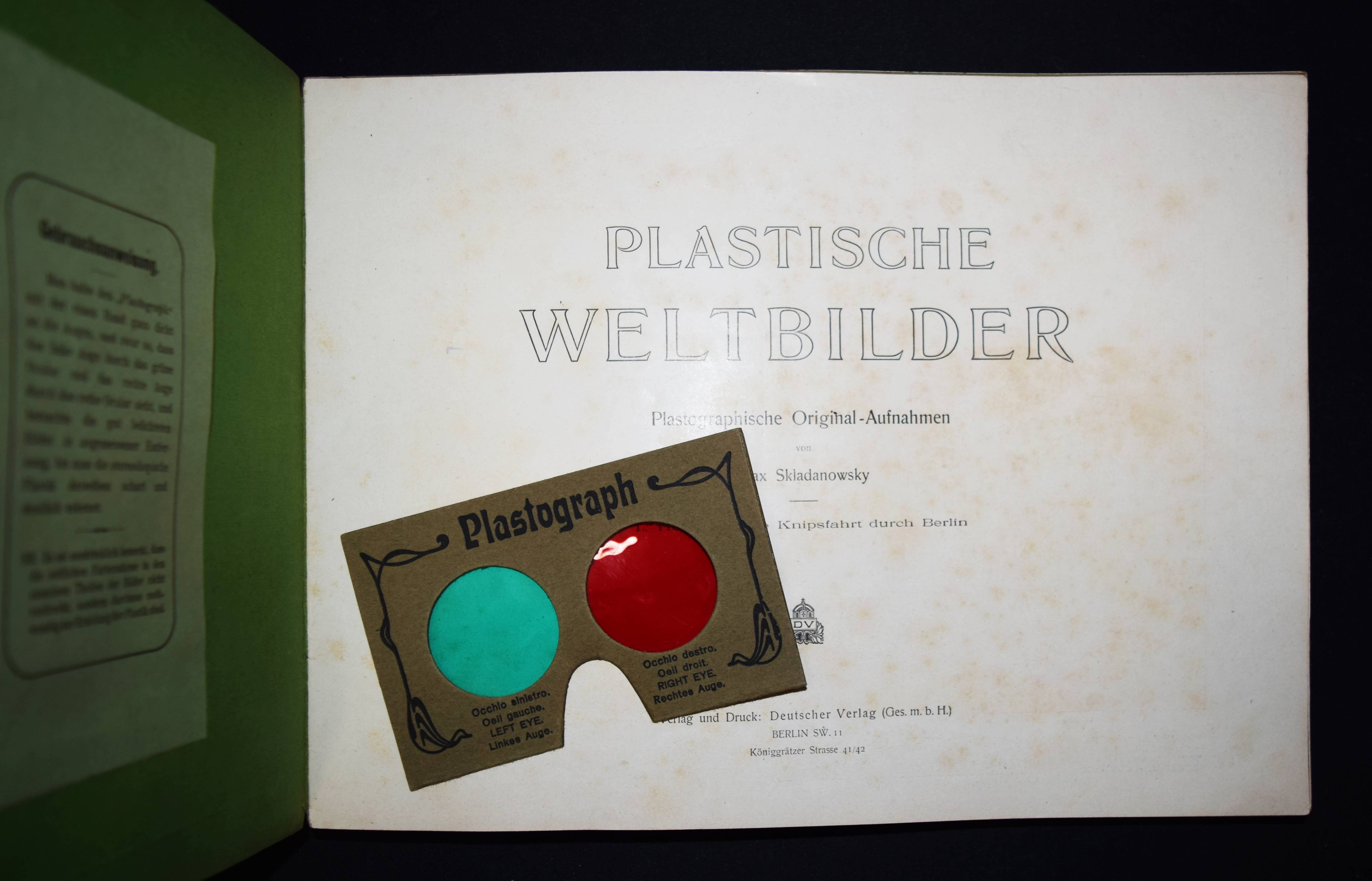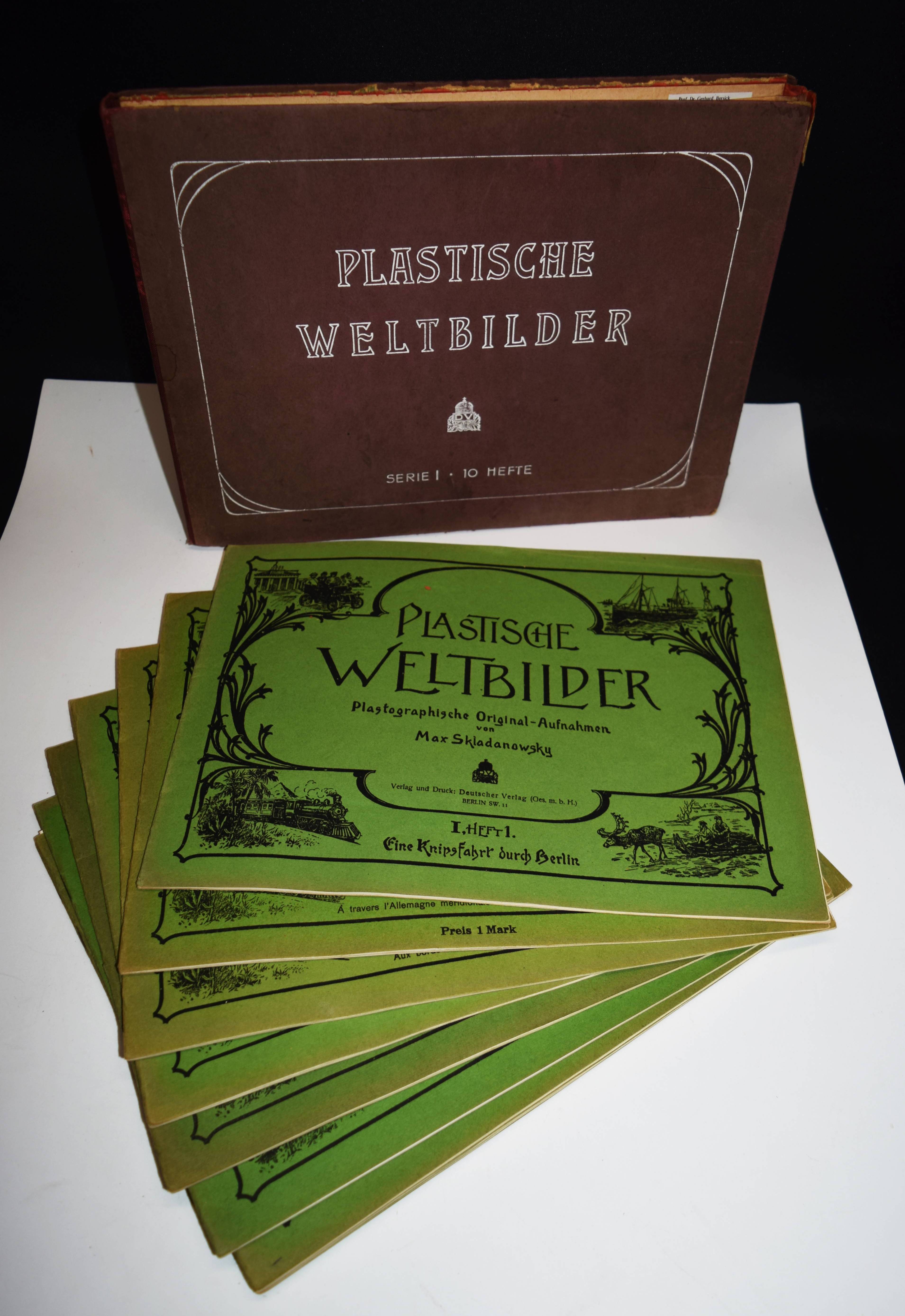 Stereo-Photographie – Skladanowsky, Max (Richard). Plastische Weltbilder. Vues plastographiques. – Plastographical views of the world. – Plastographische Orignalaufnahmen. – Serie I (von 2). Heft 1-10. 10 Hefte. Berlin, Deutscher Verlag o. J. (1902-1904). Quer-4° (24 x 32 cm.). Jeweils [8] Bl. mit 15 Tafeln in Anaglyphendruck und beilieg. Orig.-Rot-Grün-Brille. Illustr. Orig.-Kartonumschläge in Orig.-Halbleinen-Flügelmappe. Heidtmann 18519. NDB XXIV, 486 f. – Interessante Stereofotografie-Folge mit 10 Orig.-Plastograph-Brillen für die 3-D-Betrachtungsweise. – I. Eine Knipsfahrt durch Berlin. – II. Eine Blitzfahrt durch Süddeutschland. – III. Rheinwanderweg. – IV. Potsdam, Charlottenburg und die Mark. – V. Niederrhein und Nordseestädte. – VI. Die Weltstadt London. – VII. Ein Ausflug nach Paris. – VIII. Kreuz und quer durch Ostdeutschland. – IX. Niederländische Fahrten. – X. Im Herzen Deutschlands. – M. R. Skladanowsky (1863-1939) „gehört zu der kleinen Gruppe von Filmpionieren, die weltweit zwischen 1892 und 1896 am Problem der Filmaufnahme und -projektion arbeiteten. Wenn auch seine Erfindung technisch nicht wegweisend war, gehörte er zu den wenigen, denen eine funktionierende Projektion von Bewegtbildern vor Publikum gelang. S.s Berliner Straßenszenen von 1896 haben bleibenden kulturhistorischen Wert. Seine Filme sind die ersten kinematographischen Szenen, die in Deutschland aufgenommen wurden“ (J. Castan in NDB). – Die Flügelmappe etwas angestaubt und berieben, 1 Flügel lose, sonst sehr gut erhalten und mit allen 10 Anaglyphen-Brillen.