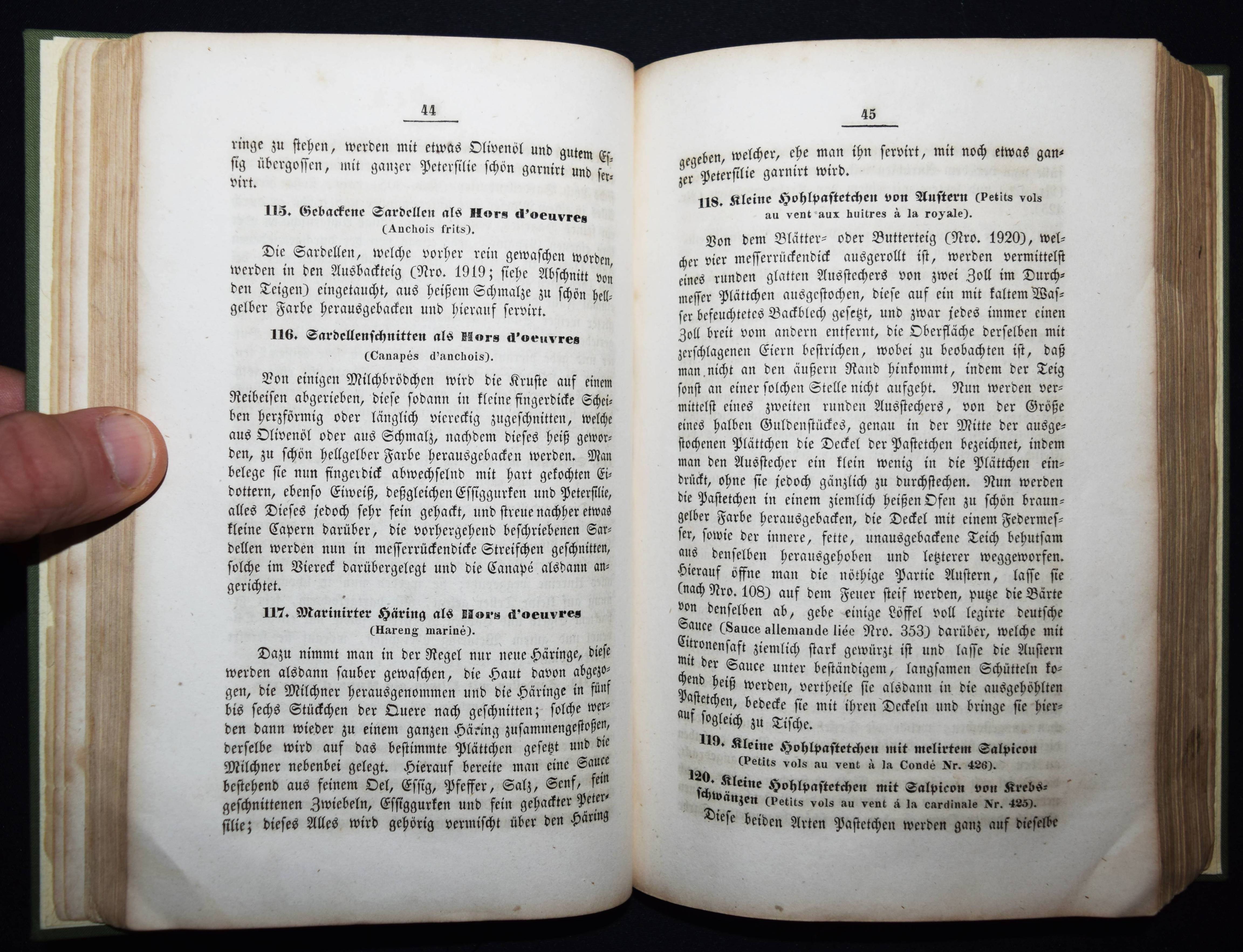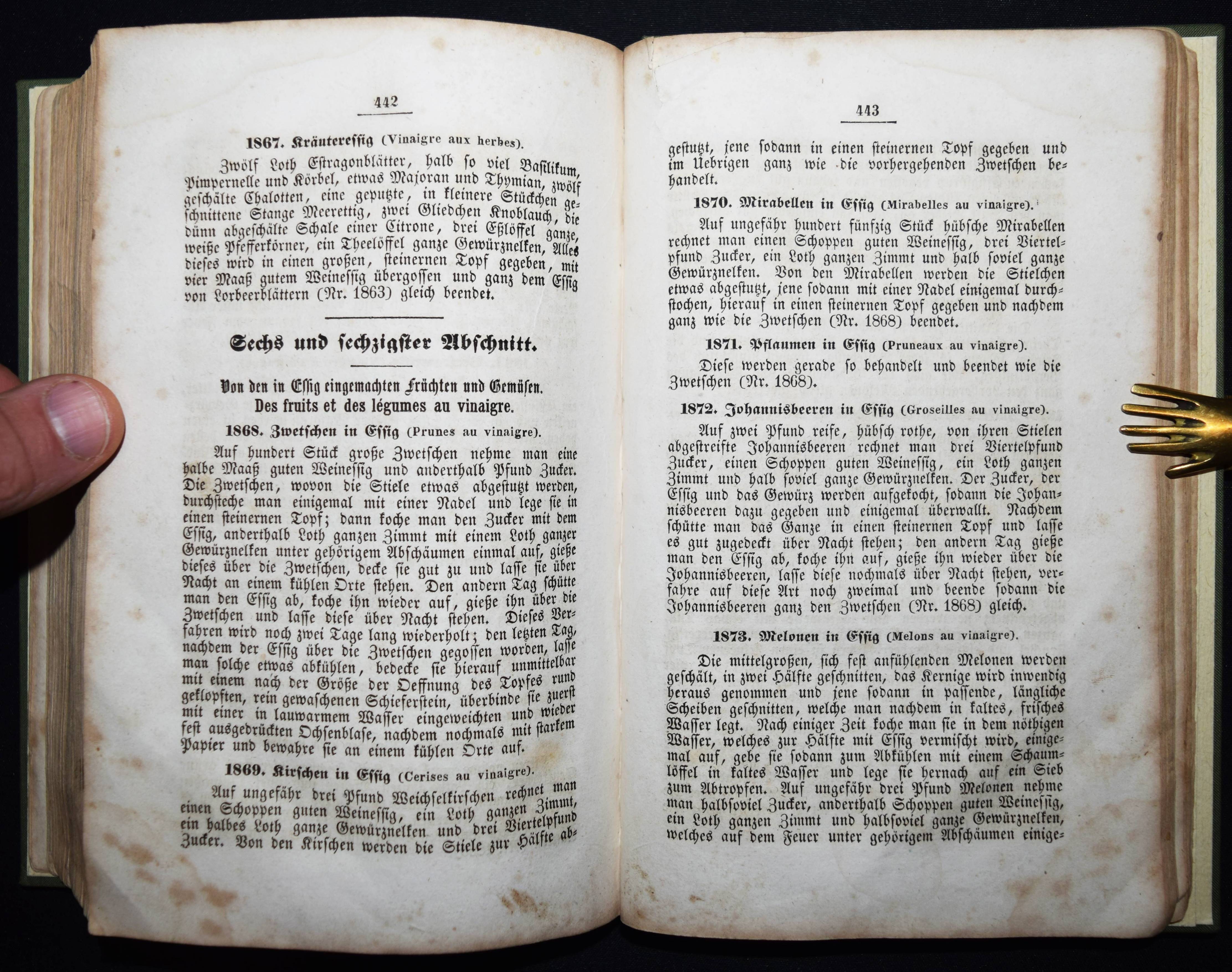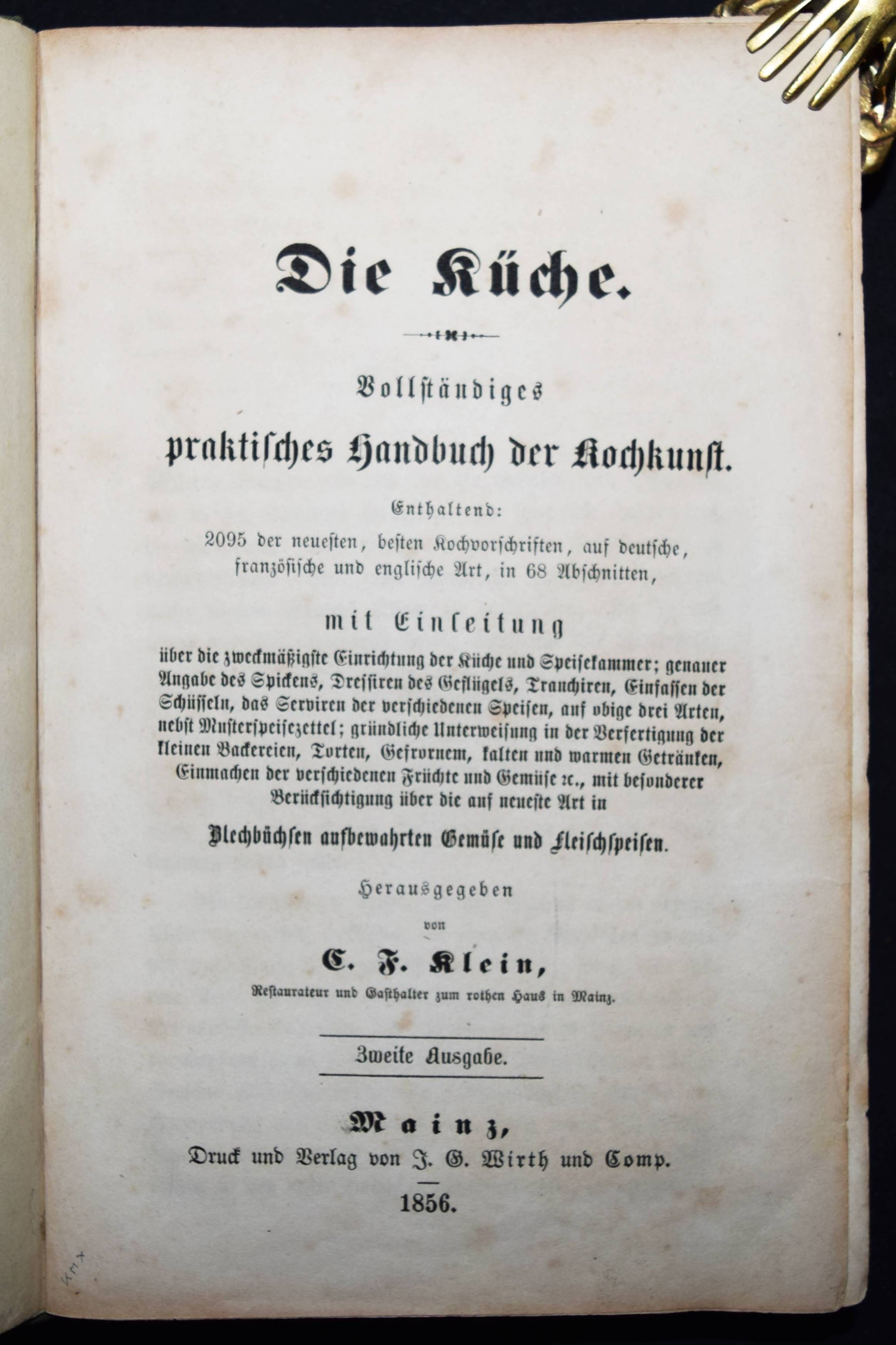 Klein, C(arl) F(riedrich). Die Küche. Vollständiges praktisches Handbuch der Kochkunst für die feinere und gewöhnliche Küche. Enthaltend: 2095 der neuesten, besten Kochvorschriften auf deutsche, französische und englische Art, in 68 Abschnitten. Mit einer Einleitung über die zweckmäßigste Einrichtung der Küche und Speisekammer; genauere Angabe des Spickens, Dressieren des Geflügels, … etc. mit besonderer Berücksichtigung der in Blechbüchsen aufbewahrten Gemüse und Fleischspeisen. 2. Auflage. Mainz, J. G. Wirth 1856. 8°. LXX S., [1] Bl., 499 S. Moderner Leinenband mit mont. farbig illustr. Orig.-Umschlag. Georg 1227. Weis 1897. – Die erste Ausgabe von 1850 war nach Weiss „eines der ersten von einem Restaurateur geschriebenen Kochbücher“ (Restaurateur und Gasthalter zum rothen Haus in Mainz, vorher u.a. Küchenchef des Vier Jahreszeiten in Wiesbaden und Hofkoch der Herzöge Wilhelm zu Nassau und Ferdinand v. Württemberg). – Der Umschlag stärker berieben, Exlibris (Kaltnadel-Radierung von Hans Meid), durchgehend etwas braunfleckig.