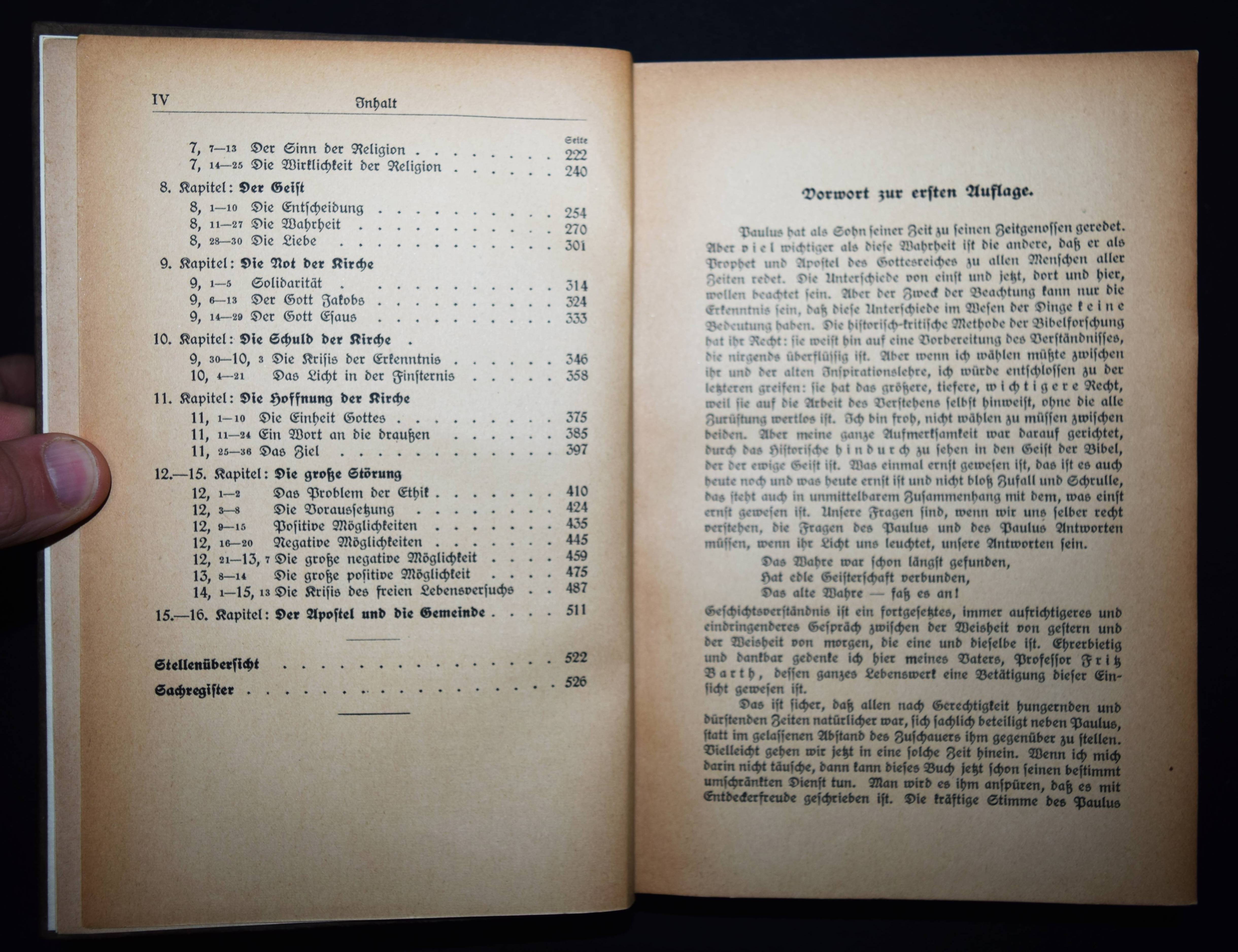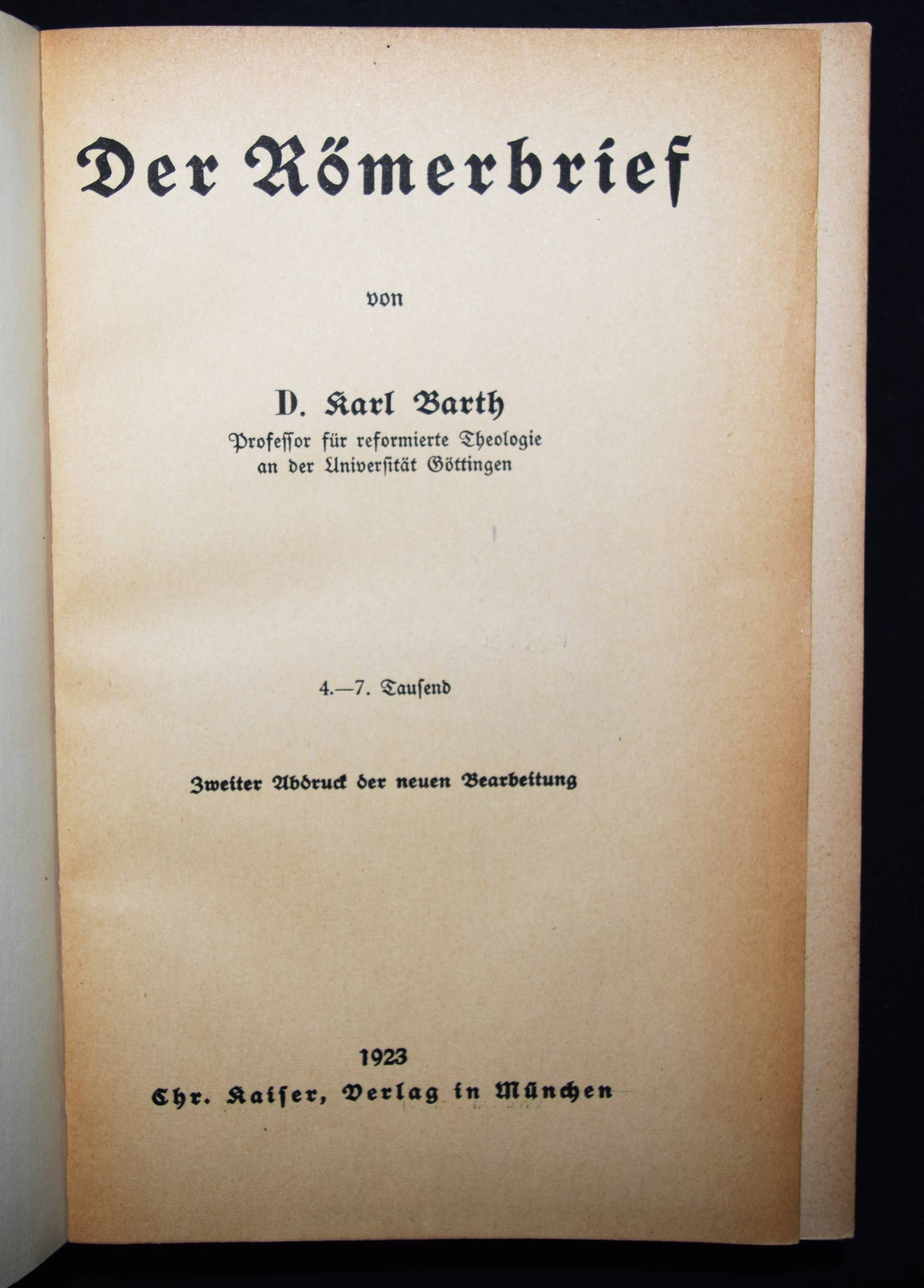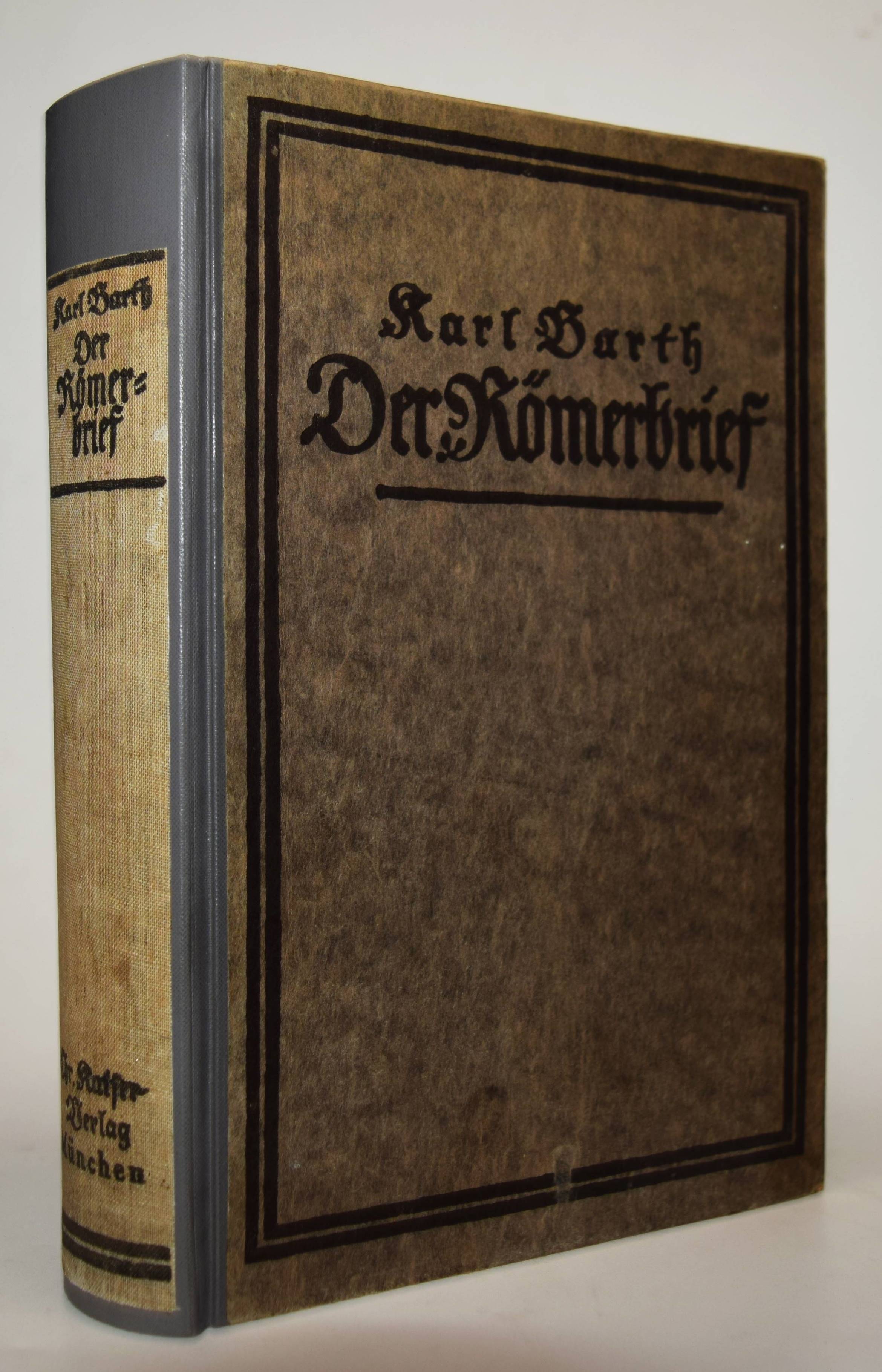 Barth, Karl. Der Römerbrief. Zweiter Abdruck der neuen Bearbeitung. 4. – 7. Tsd. München, Chr. Kaiser 1923. Gr.-8°. XXIV, 528 S. Orig.-Halbleinenband. Ziegenfuss I, 78. – Maßgebliche zweite Ausgabe des Hauptwerks. Die erste Ausgabe erschien 1919 in Bern und nur wenige Exemplare konnten verkauft werden; der Verleger Bäschlin verkaufte die meisten Exemplare an den Münchener Ch. Kaiser-Verlag, der diese unter seinem eigenen Signet weiter vertrieb. – „Die zweite Auflage des „Römerbriefs“ und die um sie gruppierten Arbeiten von 1921/22 zeigten Barth auf dem Höhepunkt dieser „dialektischen Theologie“, die in der Theologiekritik Franz Overbecks (1837–1905), dem Neukantianismus in der Interpretation seines Bruders Heinrich Barth (1890–1965) und, zumindest begrifflich, in der Paradoxdialektik Søren Kierkegaards (1813–1855) Inspirationsquellen fand. Fruchtbar für den weiteren Weg wurden neben der lebenslangen Freundschaft mit Thurneysen Begegnungen mit Friedrich Gogarten (1887–1967) und Emil Brunner (1889–1966) sowie der Austausch mit Rudolf Bultmann (1884–1976). Ihr gemeinsames Diskussionsforum fand diese Gruppe von 1922 bis zu ihrem Zerfall 1933 in der Zeitschrift „Zwischen den Zeiten“, die als Organ des Aufbruchs galt“ (M. Beintker in NDB online). – Rücken und Vorsätze fachgerecht erneuert, papierbedingt wie meist etwas gebräunt, sehr gutes Exemplar.
