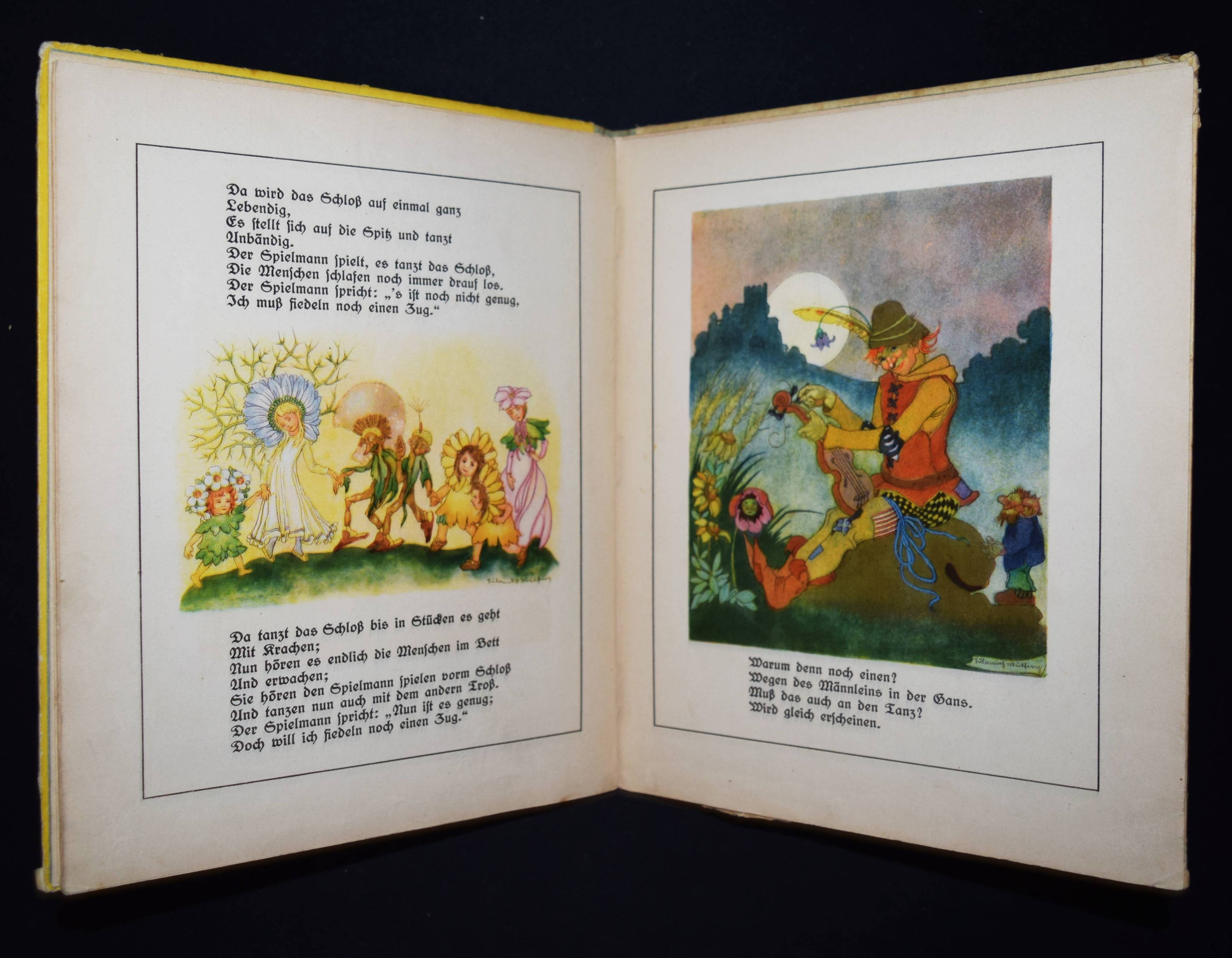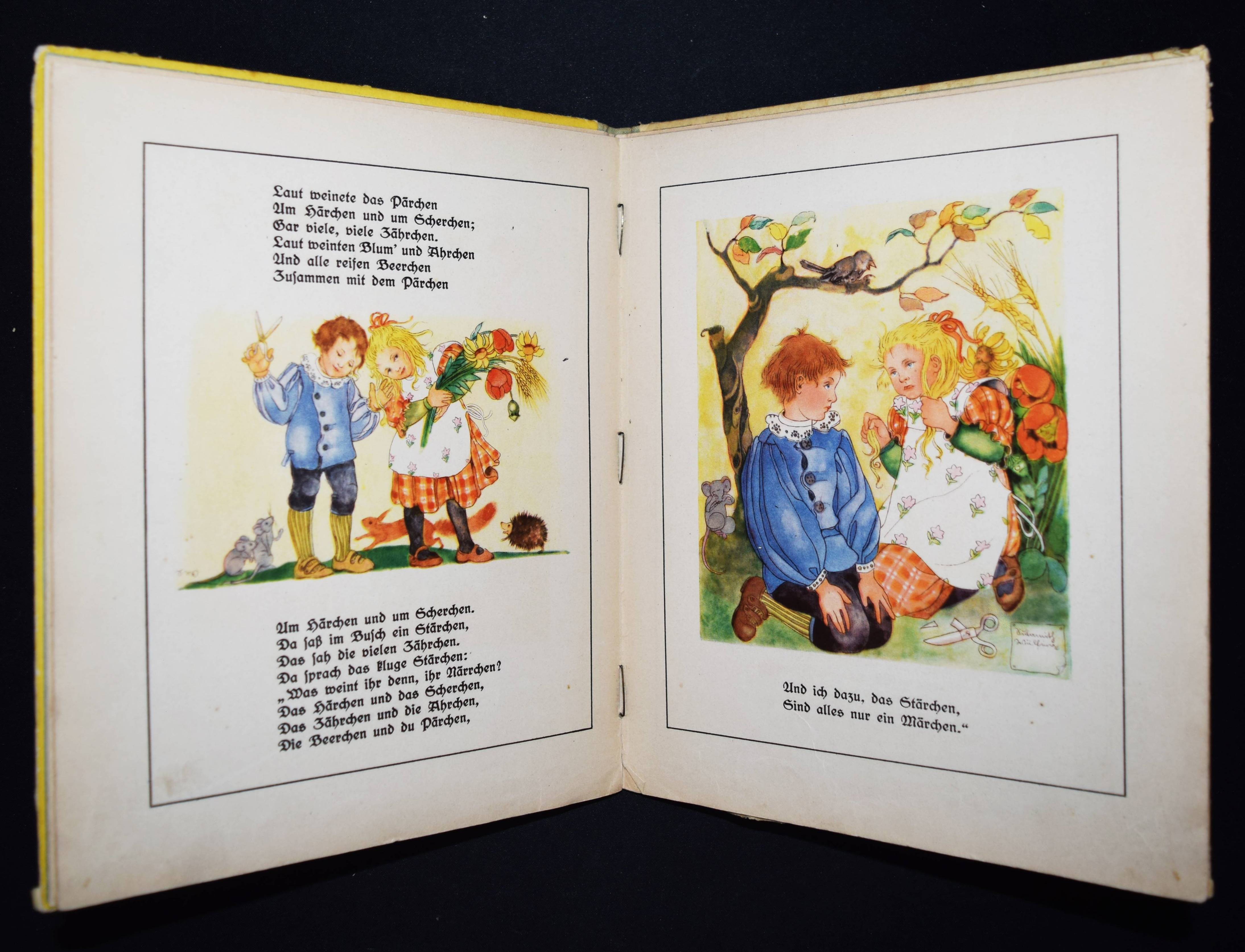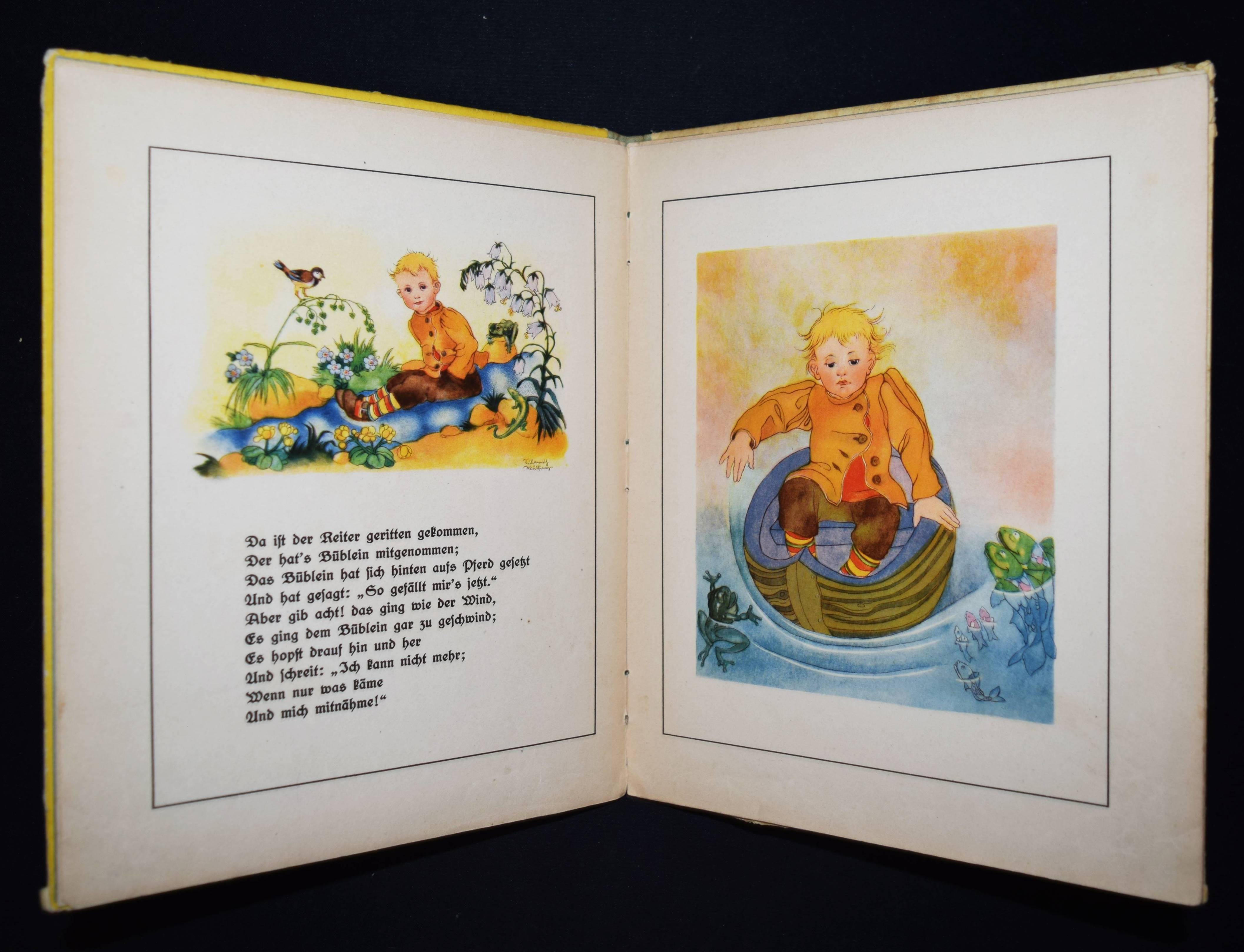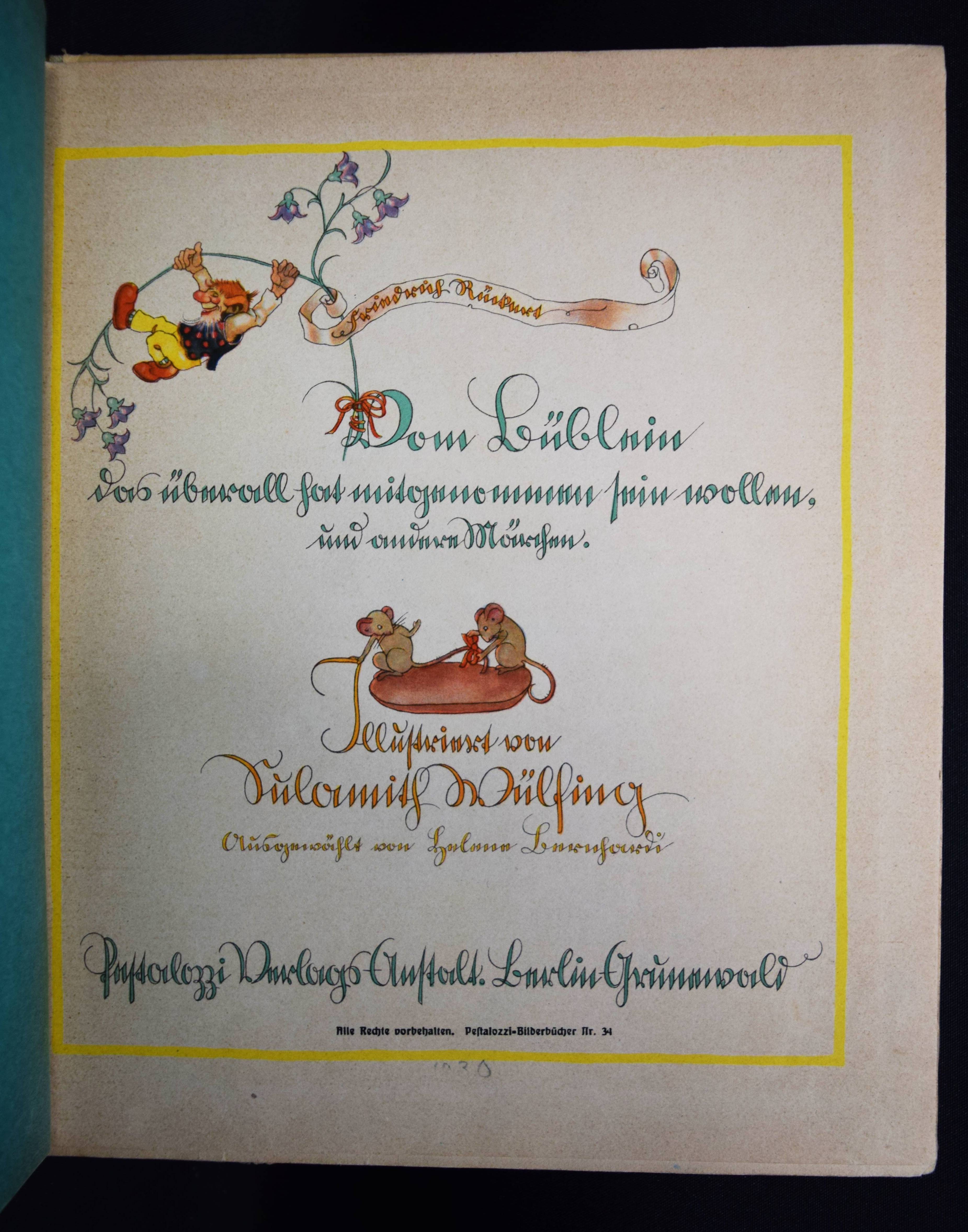 Rückert, Friedrich. Vom Büblein, das überall mitgenommen hat sein wollen, und andere Märchen. Illustriert von Sulomith Wülfing. Ausgewählt von Helena Bernhardt. Berlin-Grunewald, Pestalozzi-Verlag o. J. (1928). 4°. [8] Bl. mit teils farb. Illustrationen. Farbig illustr. Orig.-Halbleinenband. Klotz 6056/10. – Erste Ausgabe mit diesen Illustrationen. – Titel in Sütterlin-Schrift. – Einband etwas angestaubt und braunfleckig, Kanten berieben, gutes Exemplar.