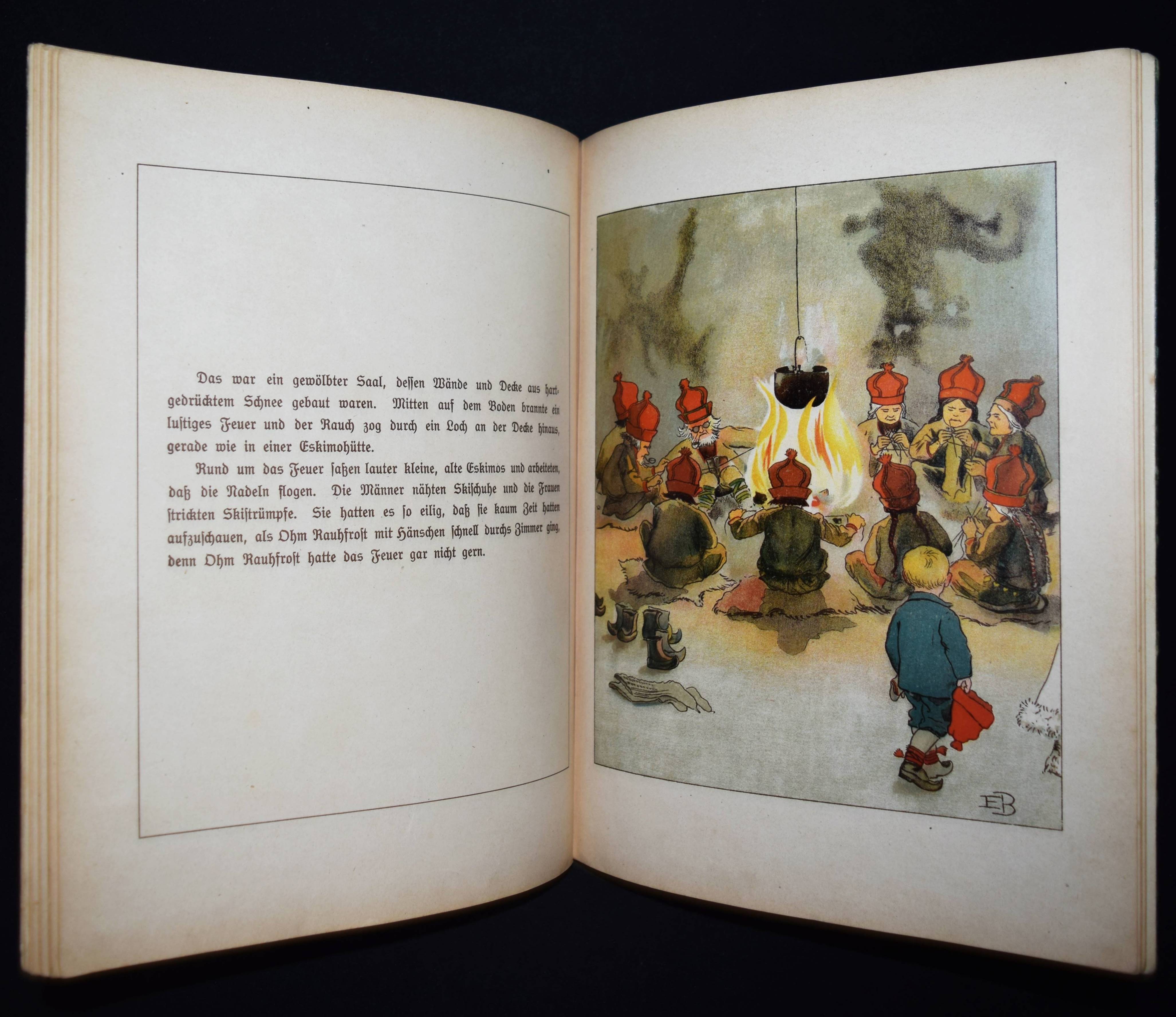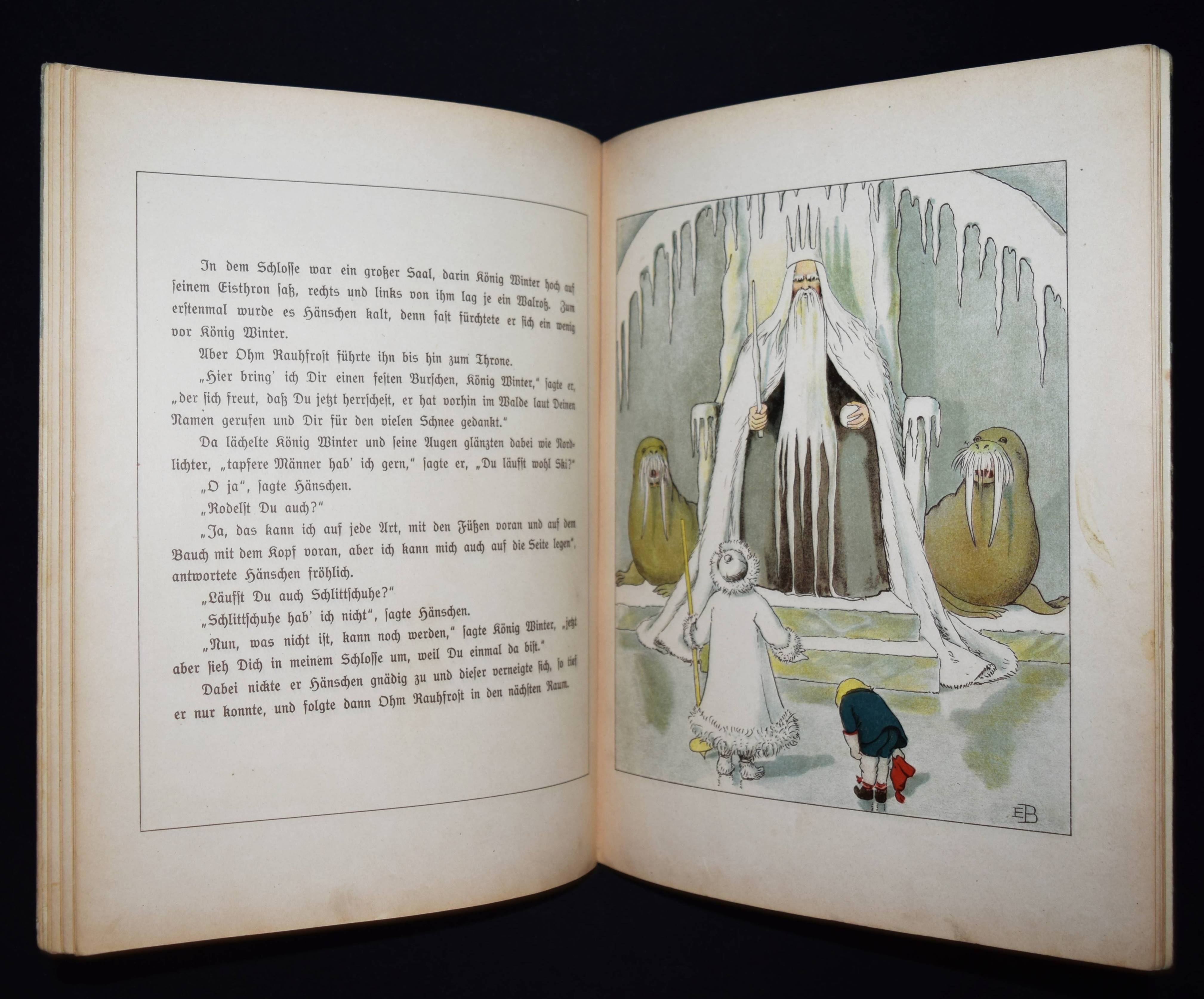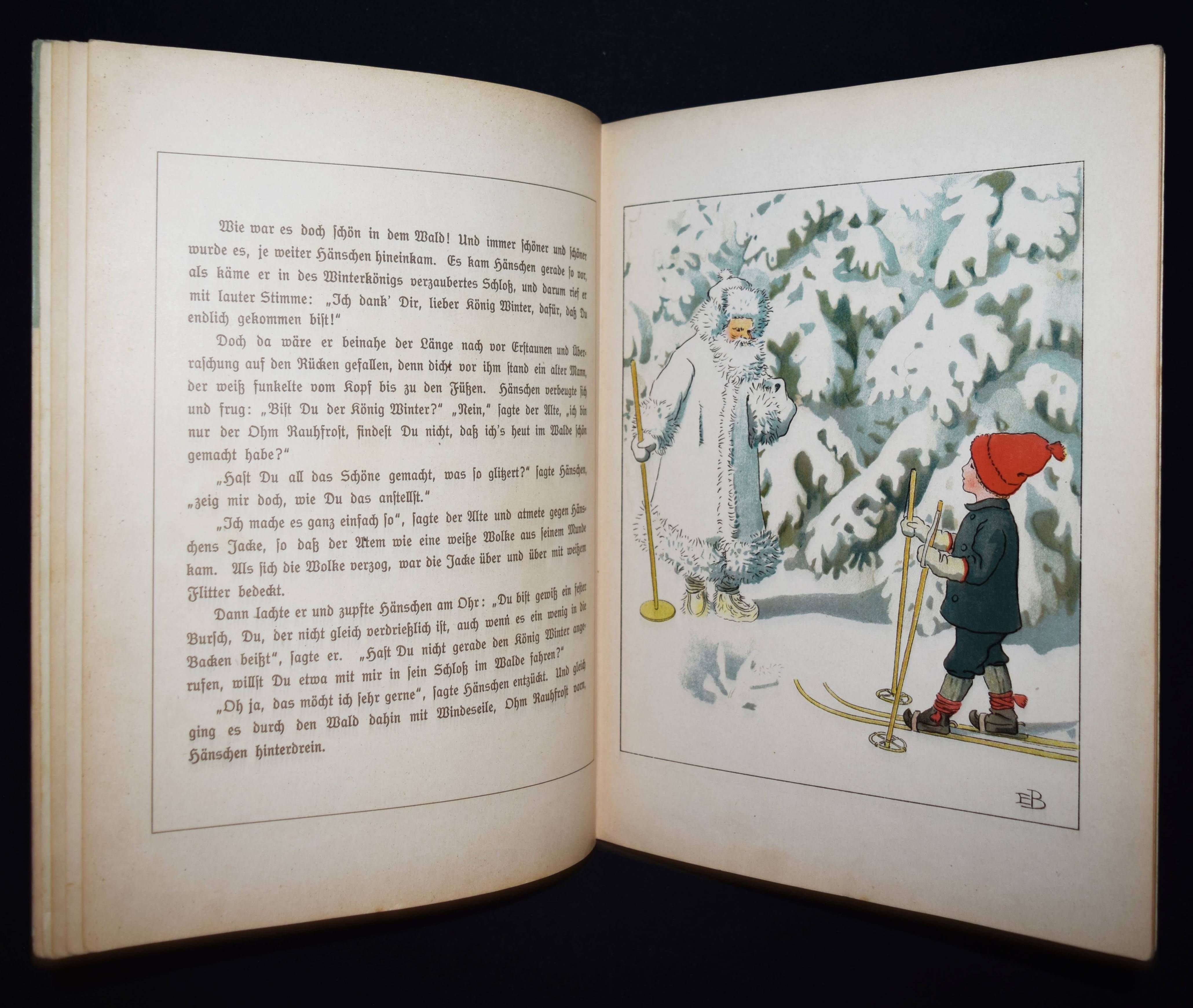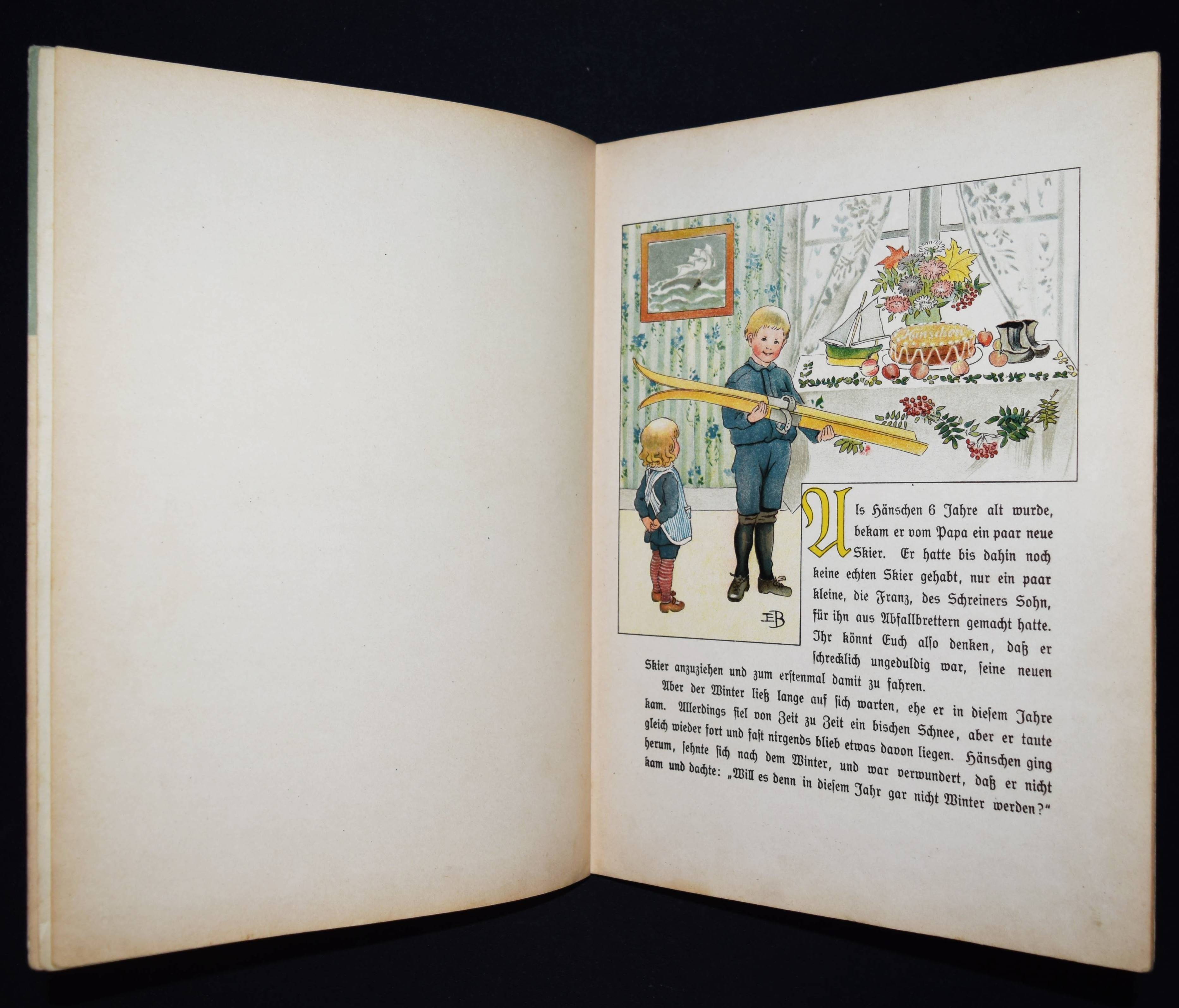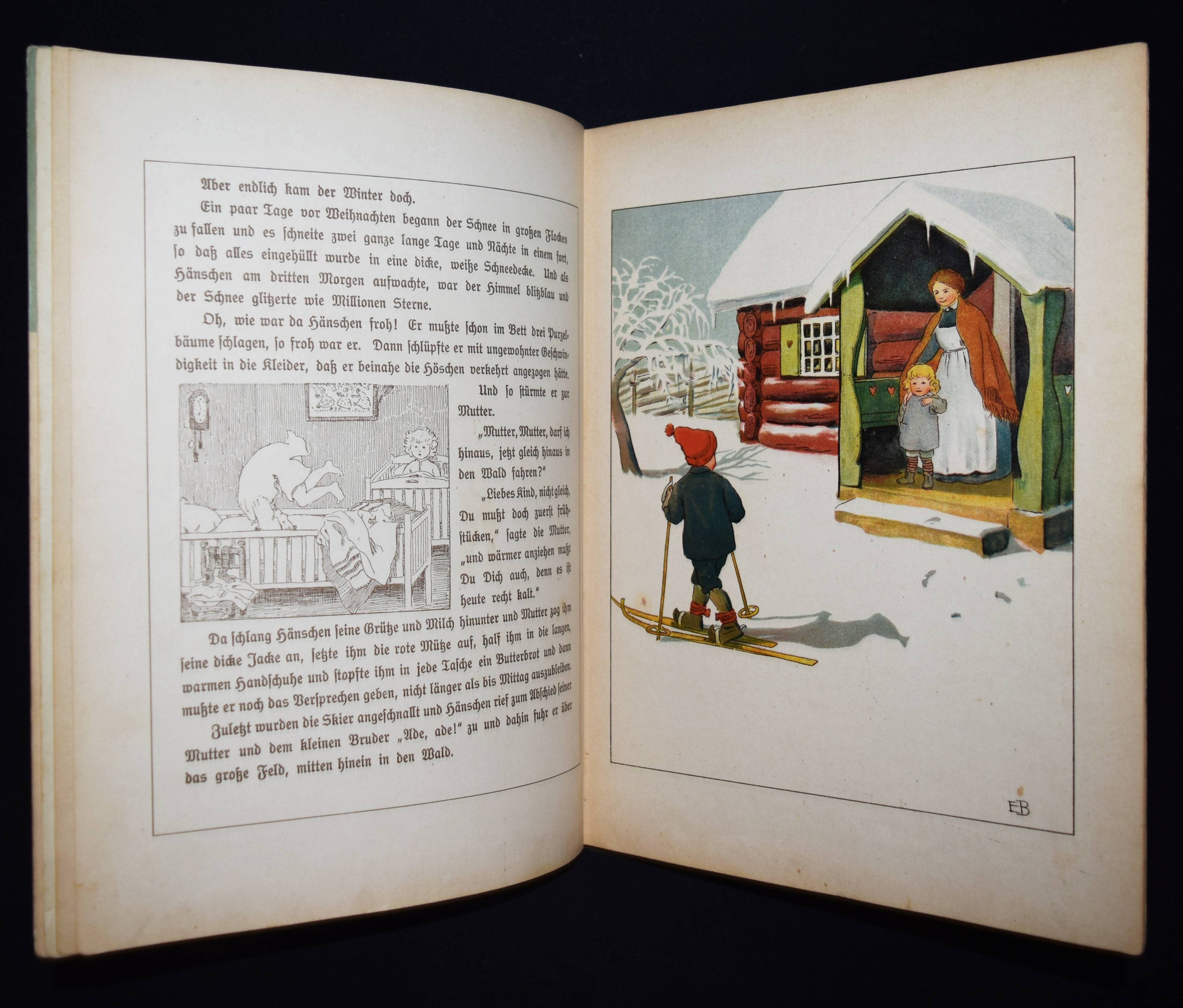 Beskow, Elsa. Hänschens Skifahrt. Bilderbuch. (Text von M. Cornelius). München, Georg W. Dietrich o. J. (1908). 4°. [15] Bl. mit farbig illustr. Titel und 14 (13 ganzs.) farblithogr. Illustrationen. Farbig illustr. Orig.-Halbleinenband mit illustr. Vorsätzen (Hänschen beim Skifahren). (Dietrichs Münchener Künstler-Bilderbücher, Band 2). Bilderwelt 2828. LKJ I, 143. Liebert, Dietrich 2. Ries 435, 3. – Erste deutsche Ausgabe des wohl ersten Bilderbuchs zum Skifahren. Die schwedische Orig.-Ausgabe erschien 1907 in Stockholm mit dem Titel „Olles skidfärd“ mit Versen von E. Beskow. – „Olle’s Ski Trip. (1907) zeigt kindgemäße Bild- und Textkomposition zum Schilauf eines kleinen Jungen und eine eindringliche Wiedergabe des schwedischen Winters. Künstlerische Anstöße kommen aus dem Schaffen W. CRANES – eine Ausstellung seiner Werke in Stockholm 1896 beeinflußte ihre Arbeit nachhaltig“ (H. Künnemann in LKJ). – Einband etwas angestaubt und leicht fleckig, im unteren Blattrand leicht fingerfleckig, gutes Exemplar.