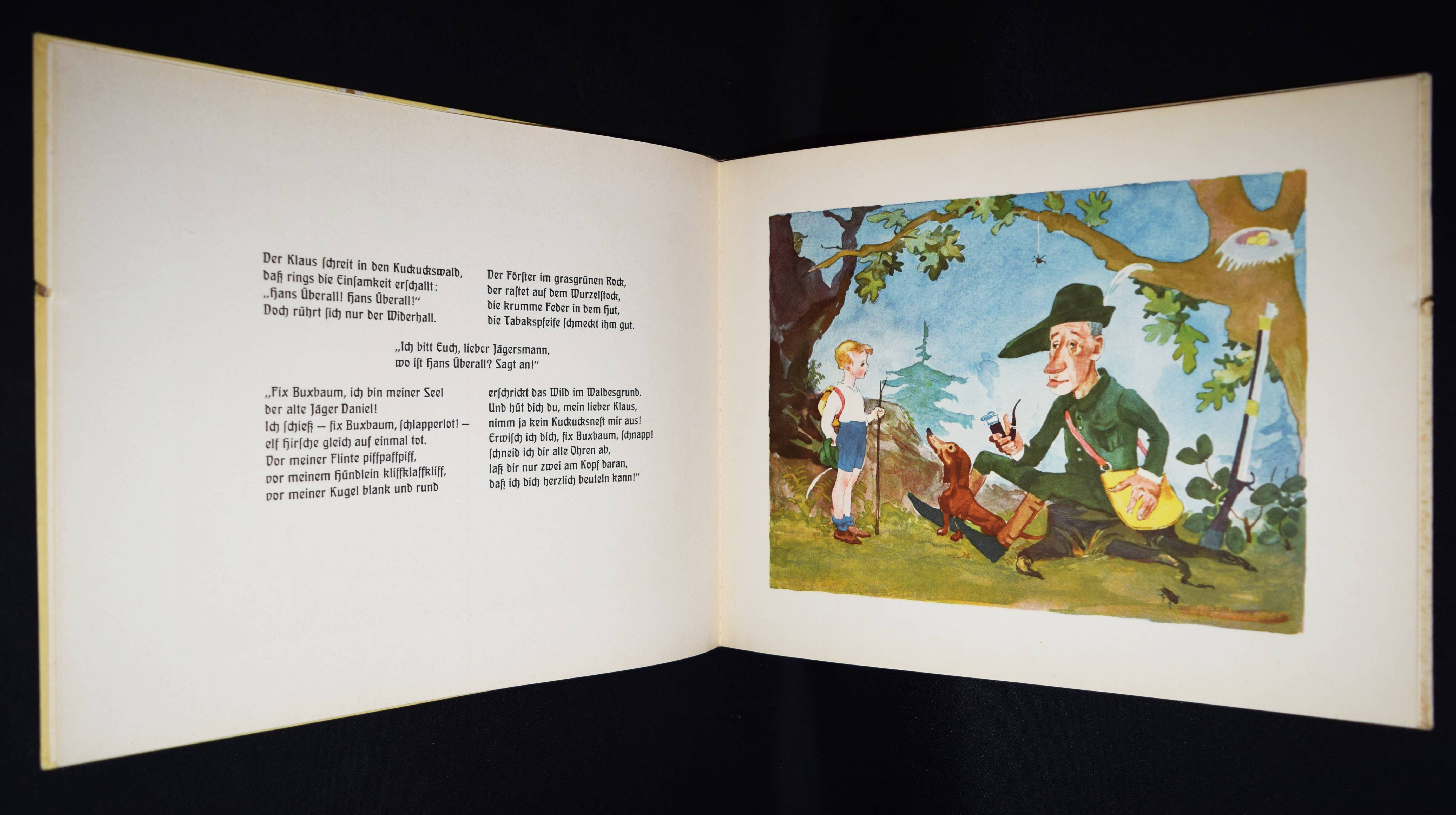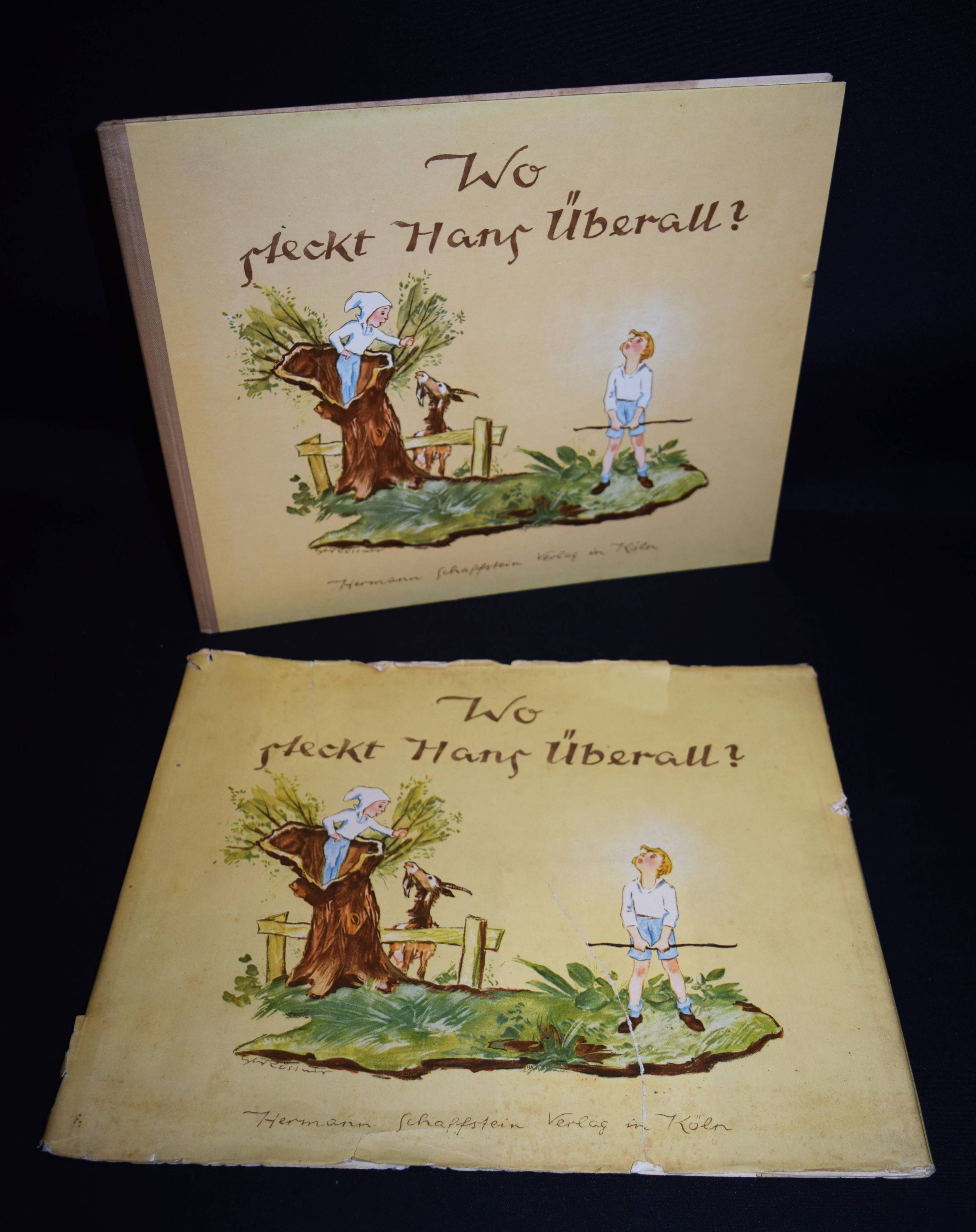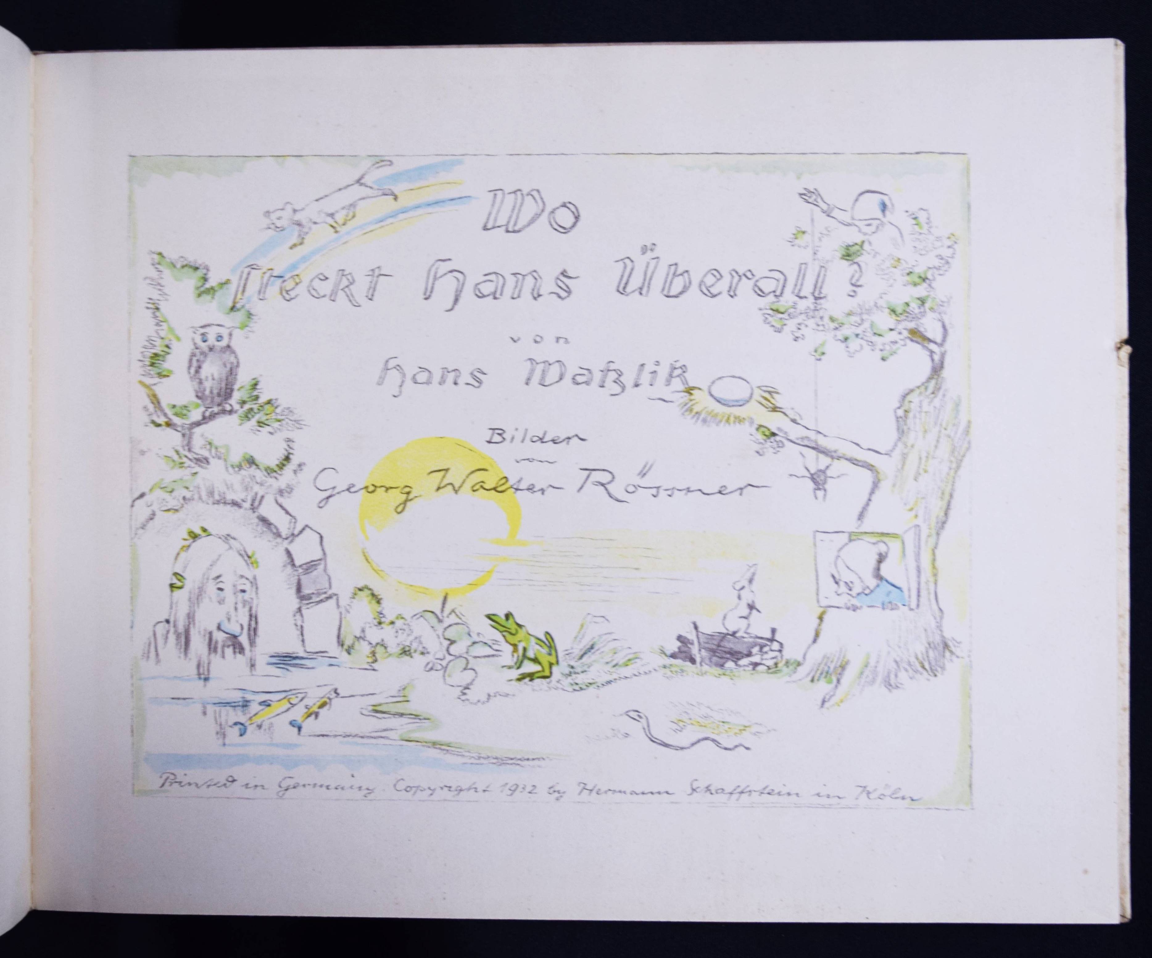 Watzlik, Hans. Wo steckt Hans Überall. Bilder von Georg Walter Rössner. Köln, Herrmann Schaffstein 1932. Quer-4°. [13] Bl. mit farb. illustr. Titel u. 12 ganzs. farb. Illustrationen. Farbig illustr. Orig.-Halbleinenband. Slg. Hürlimann 1670. Klotz 7938/18. – Einzige Ausgabe dieses seltenen Künstler-Bilderbuchs. – Der Maler und Graphiker G. W. Rössner (geb. 1885 in Leipzig) war Schüler von L. Corinth und seit 1920 Professor an der Staatlichen Kunstschule in Berlin, später (seit 1934) an der Staatlichen Hochschule für bildende Künste (vgl. Vollmer IV, 91). – Der aus Böhmen stammende Romanschriftsteller und Jugendbuchautor H. Watzlik (1879-1948) hat vorwiegend Märchen und Sagenstoffe für Kinder bearbeitet (vgl. H. Bertlein in LKJ III, 766 f., verz. vorliegenden Titel nicht). – „Diese gereimte Kindermythologie trägt der kindlichen Vorstellung urhafter Dinge Rechnung und führt schalkisch und abenteuerlich in den tiefen deutschen Wald hinein zu Bauer und Jäger und seltsamem Getier, zu den Geschöpfen des Märchens, zu Wassergeist, Moosfrau, Glühebold und Himmelsvogel und endlich zu Wind und Mond und Sonne“ (H. Watzlik in der Verlagswerbung). – Deckel an der Vorderkante geringf. beschädigt, lädierter Orig.-Schutzumschlag liegt bei, sehr gutes sauberes Exemplar.