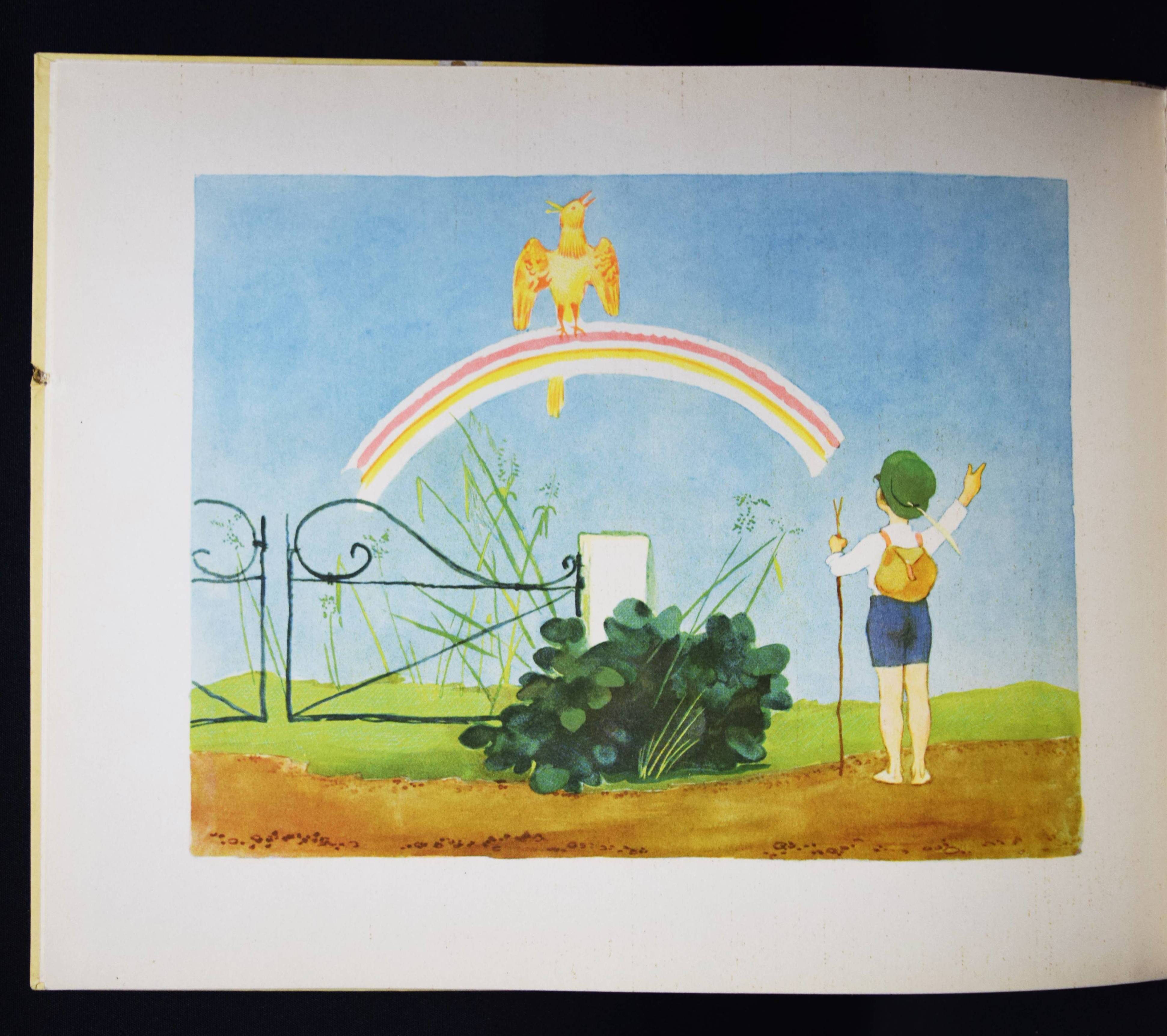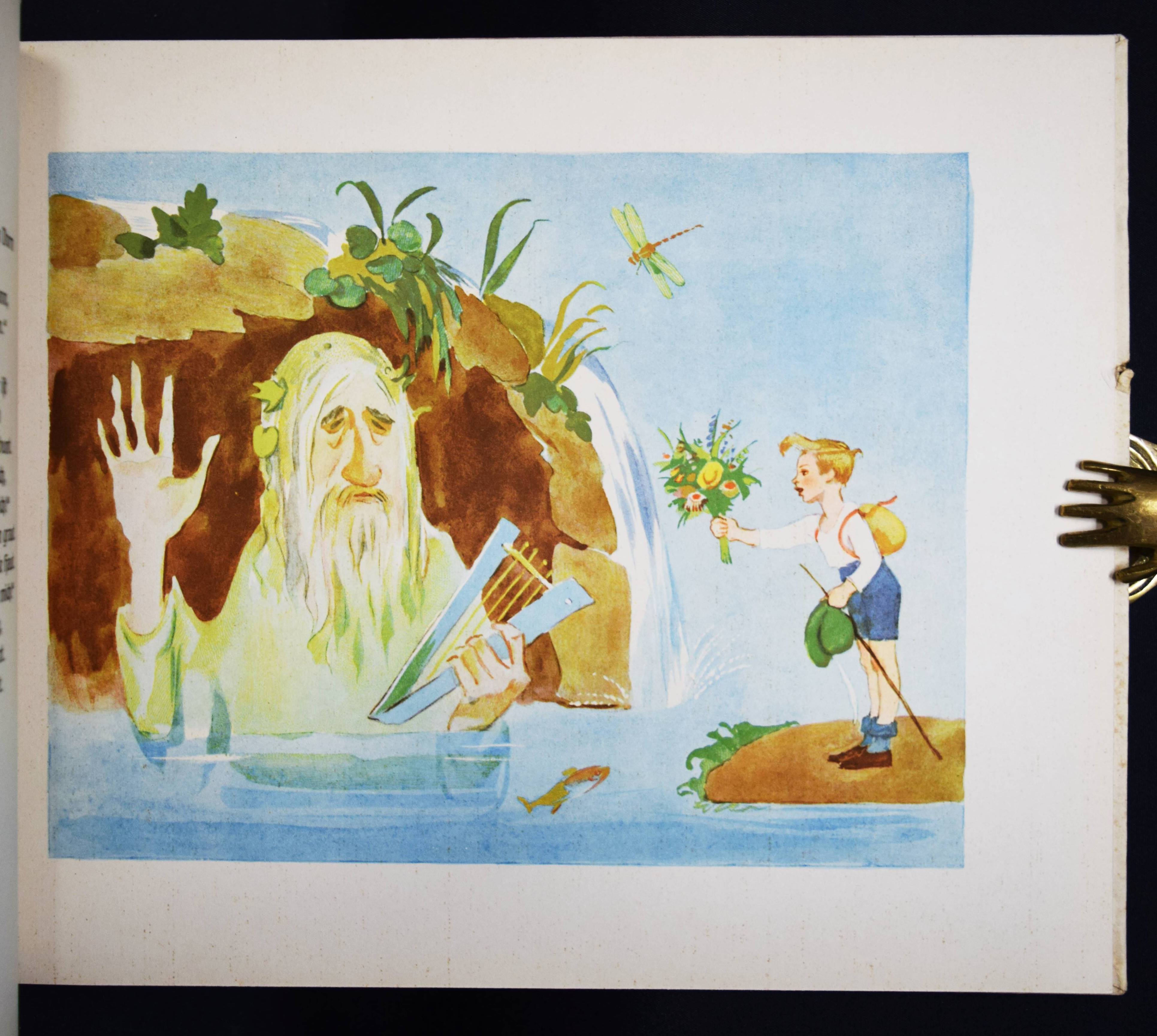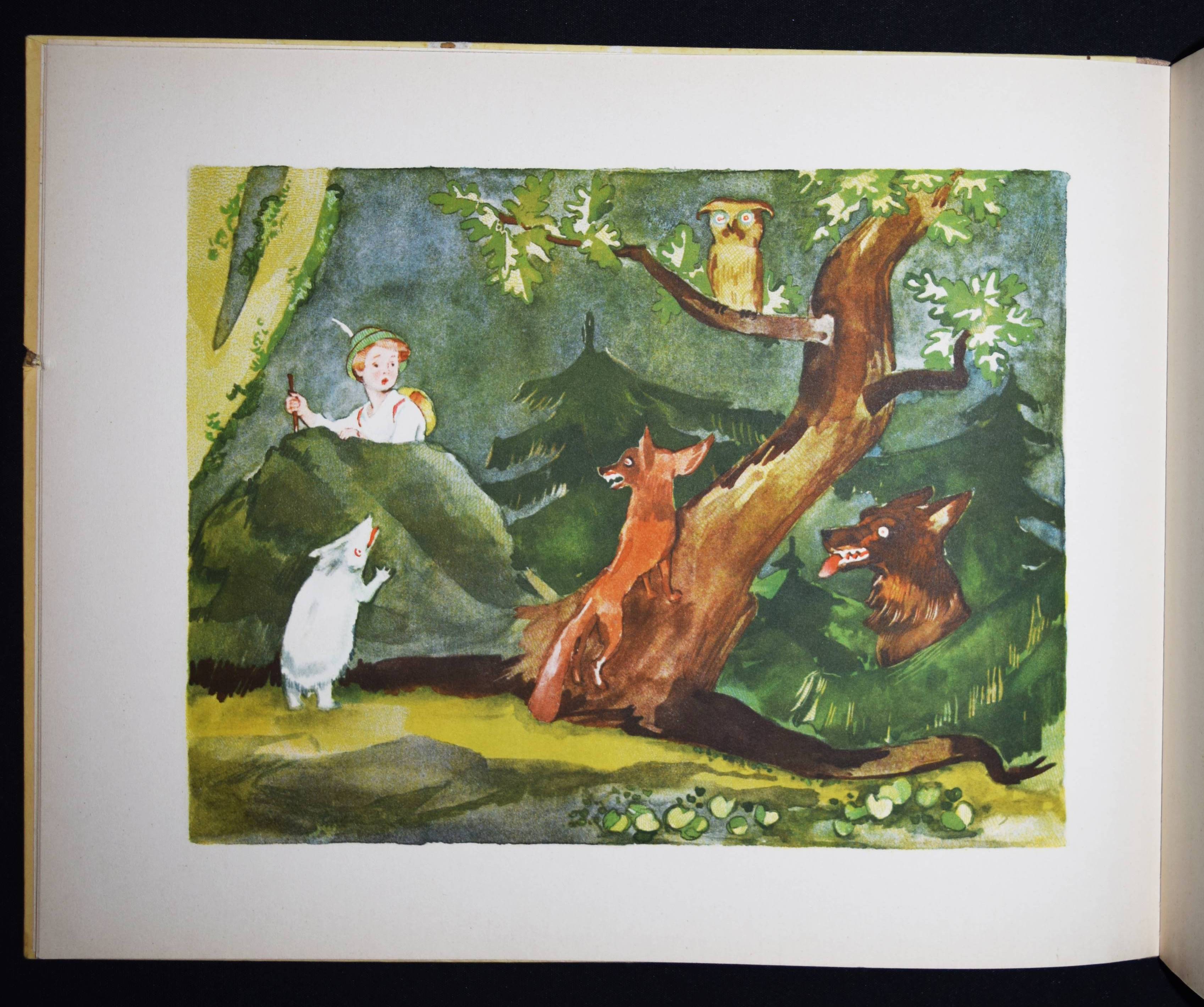 Watzlik, Hans. Wo steckt Hans Überall. Bilder von Georg Walter Rössner. Köln, Herrmann Schaffstein 1932. Quer-4°. [13] Bl. mit farb. illustr. Titel u. 12 ganzs. farb. Illustrationen. Farbig illustr. Orig.-Halbleinenband. Slg. Hürlimann 1670. Klotz 7938/18. – Einzige Ausgabe dieses seltenen Künstler-Bilderbuchs. – Der Maler und Graphiker G. W. Rössner (geb. 1885 in Leipzig) war Schüler von L. Corinth und seit 1920 Professor an der Staatlichen Kunstschule in Berlin, später (seit 1934) an der Staatlichen Hochschule für bildende Künste (vgl. Vollmer IV, 91). – Der aus Böhmen stammende Romanschriftsteller und Jugendbuchautor H. Watzlik (1879-1948) hat vorwiegend Märchen und Sagenstoffe für Kinder bearbeitet (vgl. H. Bertlein in LKJ III, 766 f., verz. vorliegenden Titel nicht). – „Diese gereimte Kindermythologie trägt der kindlichen Vorstellung urhafter Dinge Rechnung und führt schalkisch und abenteuerlich in den tiefen deutschen Wald hinein zu Bauer und Jäger und seltsamem Getier, zu den Geschöpfen des Märchens, zu Wassergeist, Moosfrau, Glühebold und Himmelsvogel und endlich zu Wind und Mond und Sonne“ (H. Watzlik in der Verlagswerbung). – Deckel an der Vorderkante geringf. beschädigt, lädierter Orig.-Schutzumschlag liegt bei, sehr gutes sauberes Exemplar.