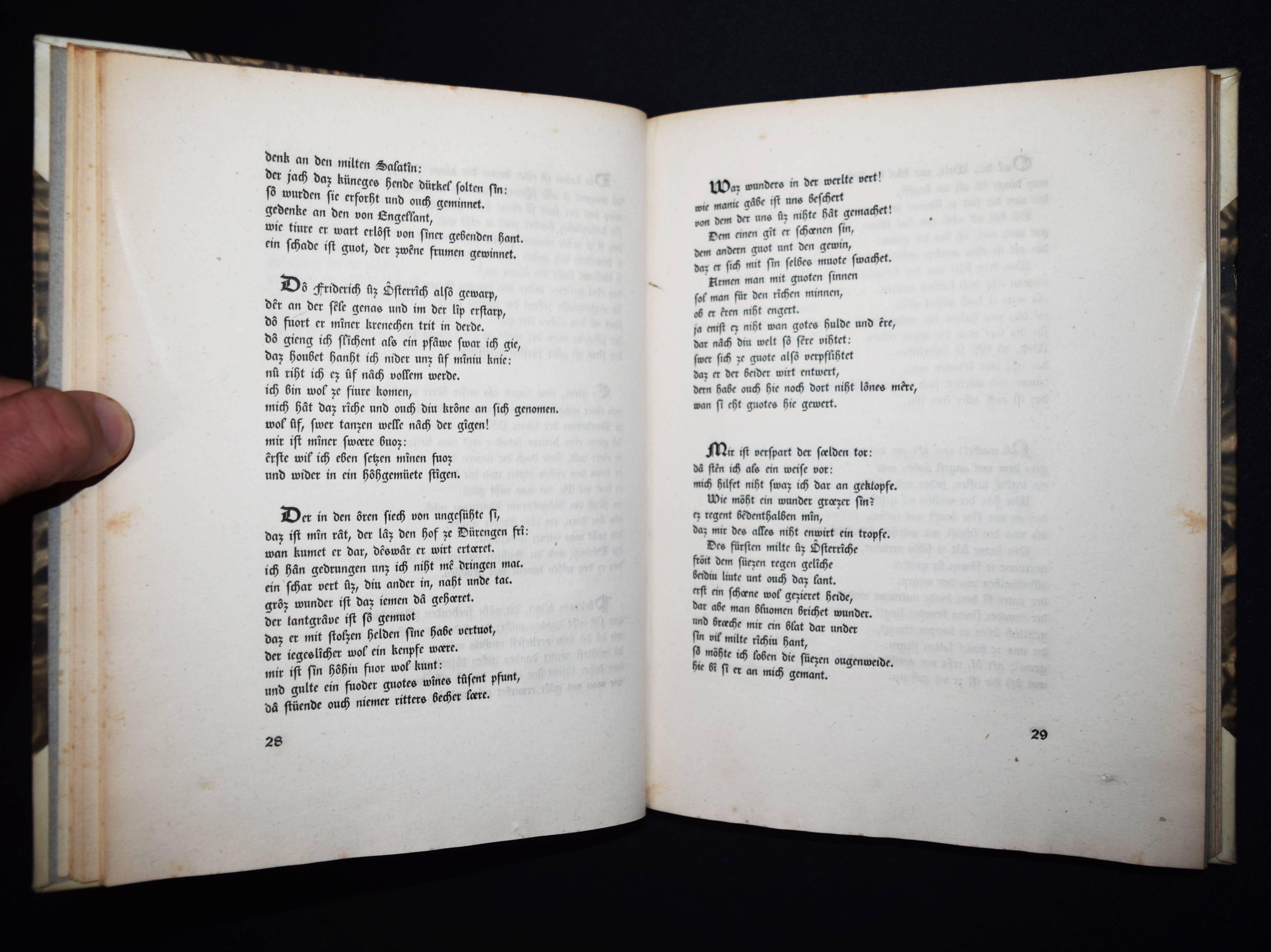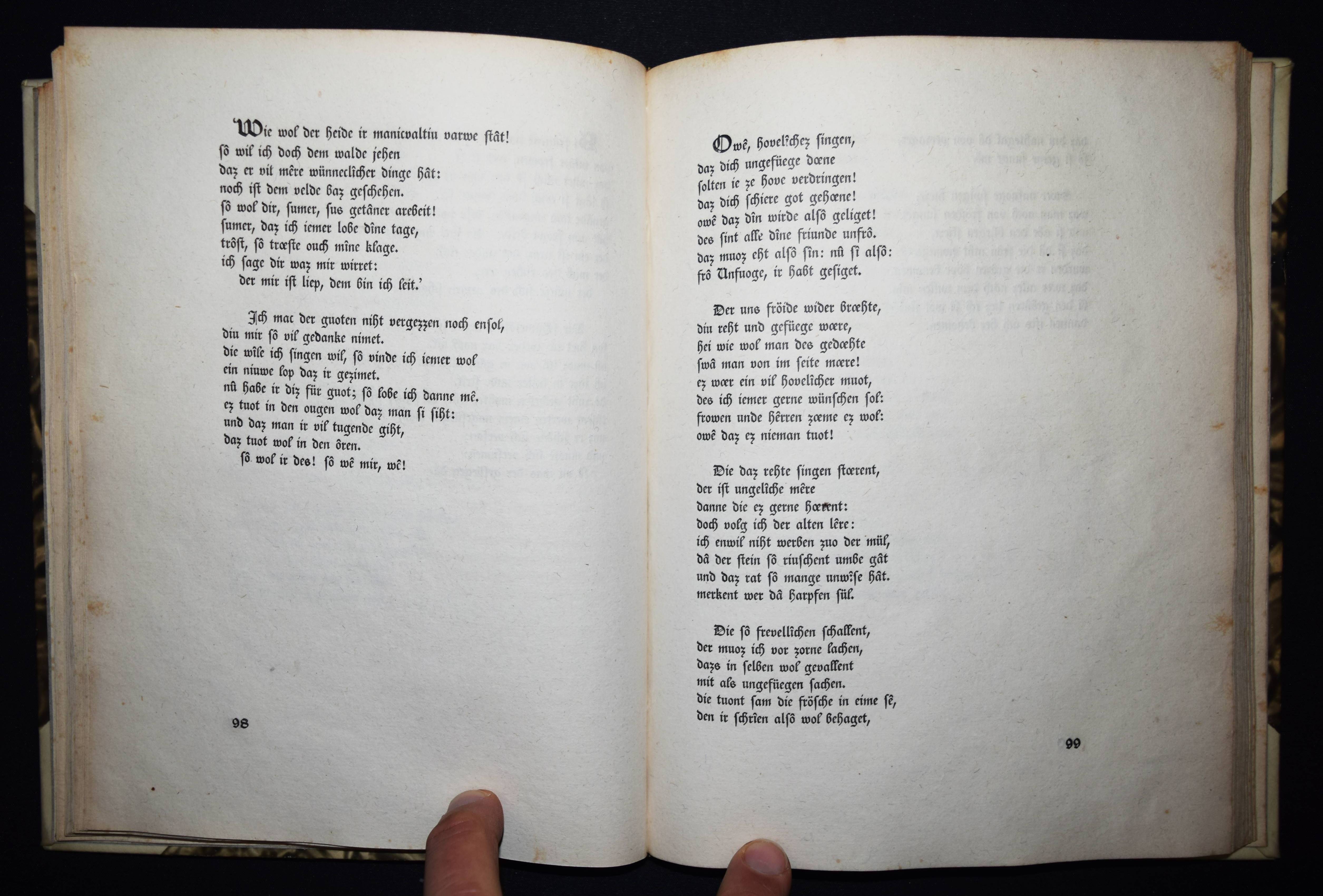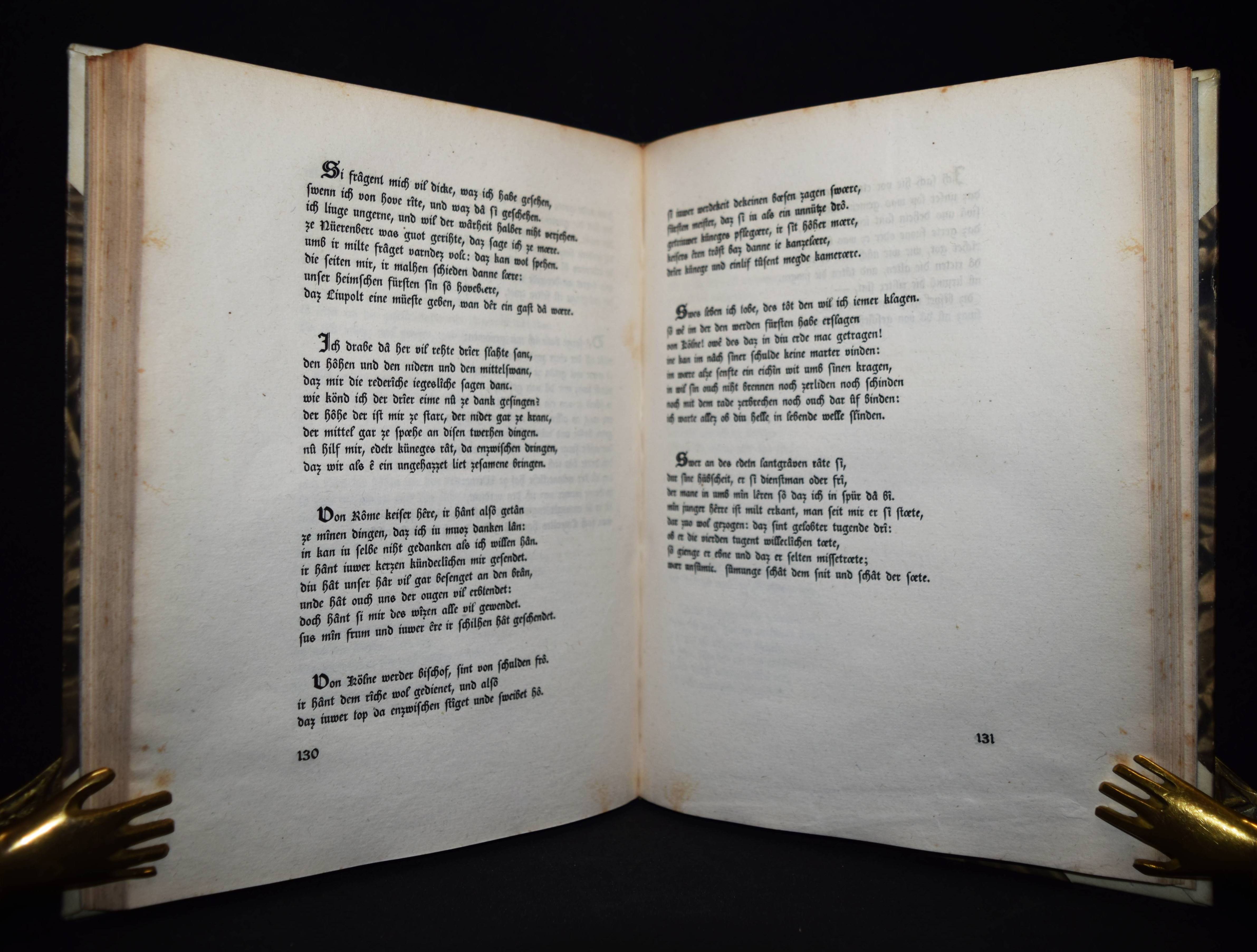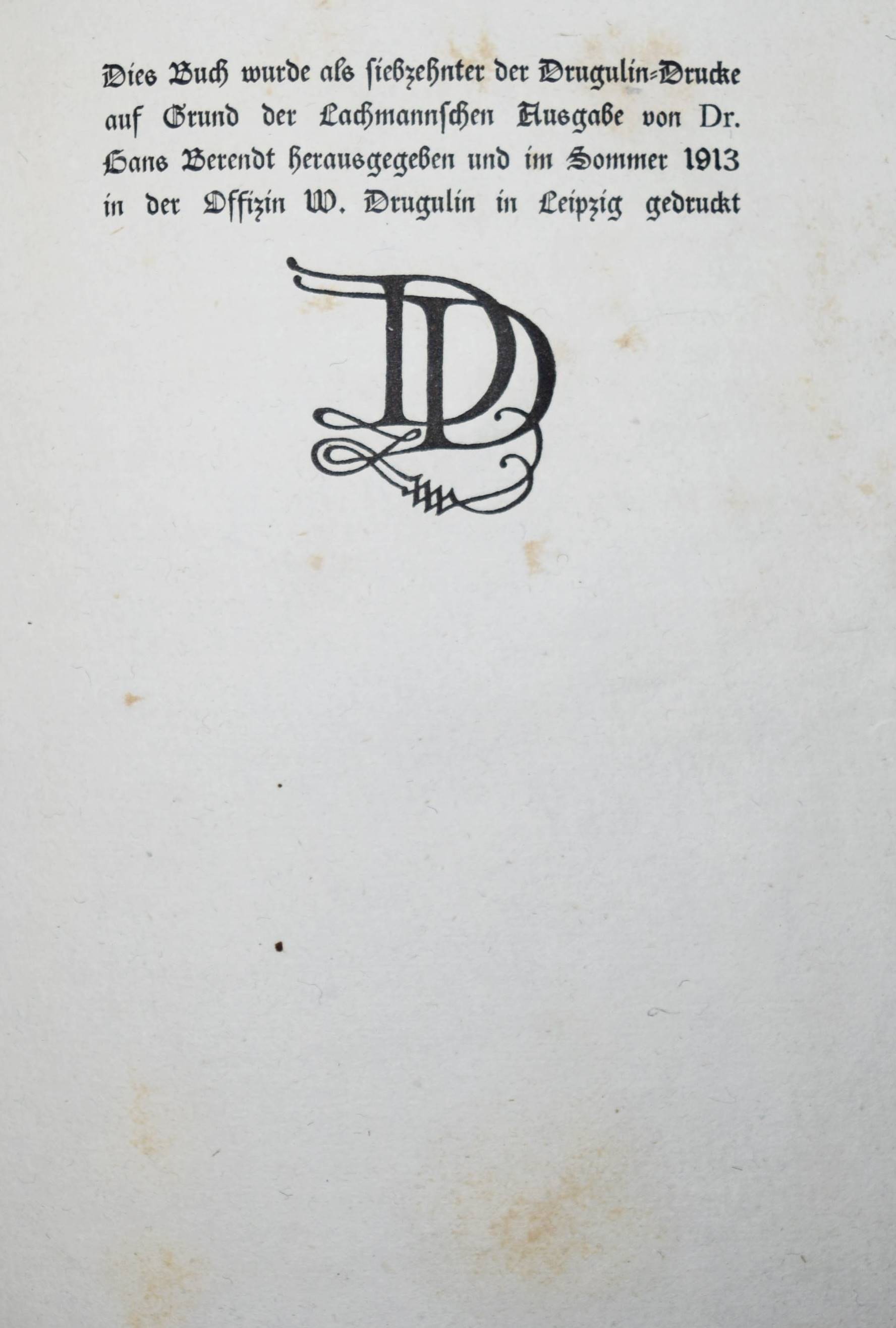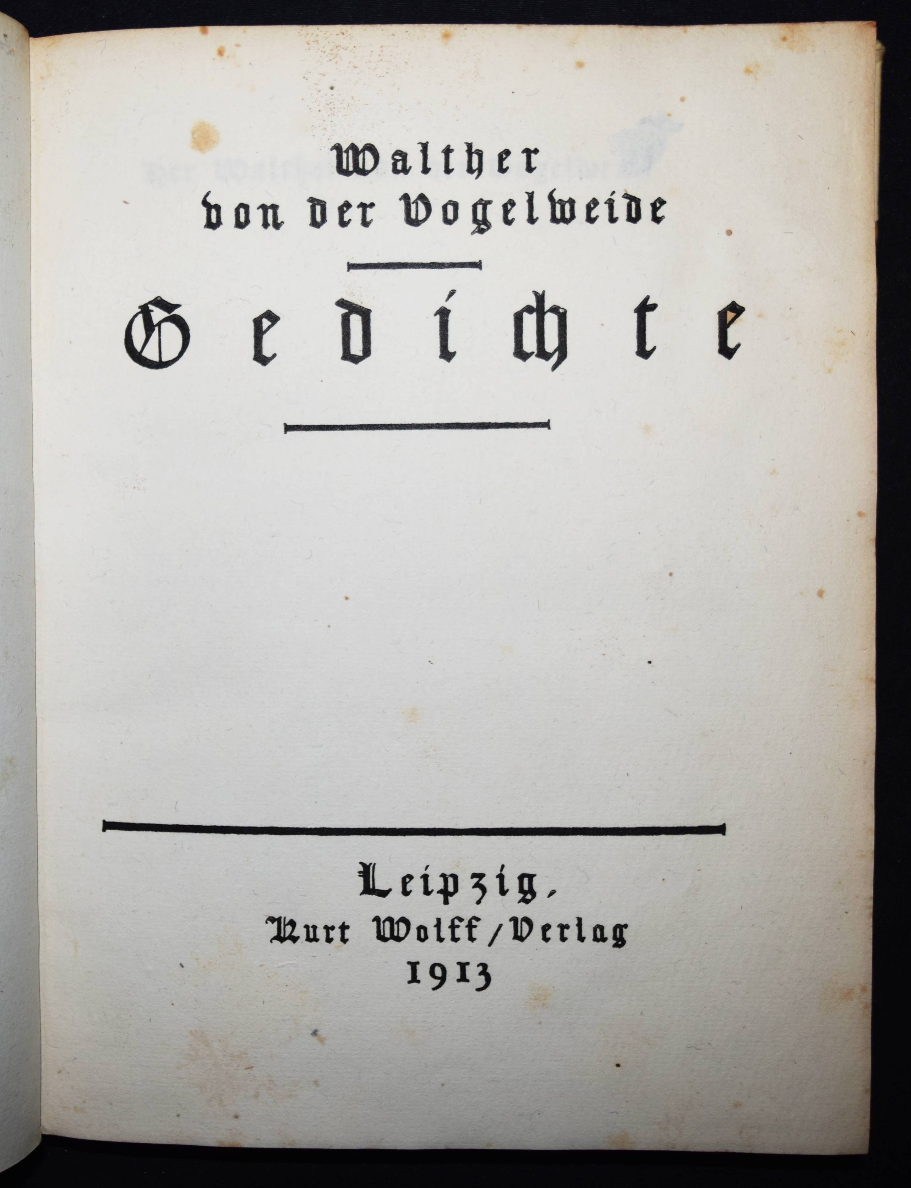 Walther von der Vogelweide. Gedichte. (Auf Grund der Lachmannschen Ausgabe von Hans Berendt herausgegeben). Leipzig, Kurt Wolff 1913. Gr.-8°. 204 S. Orig.-Halbpergamentband mit goldgepr. Rückenschild. (17. Drugulin-Druck). Erste Ausgabe. – Rückenschild etwas berieben, stellenweise etwas braunfleckig, gutes Exemplar aus der Bibliothek des Bibliotheksdirektors, Verlegers und Literaturwissenschaftlers Herbert Hans Wilhelm Stubenrauch (1896-1958)mit dessen Exlibris.