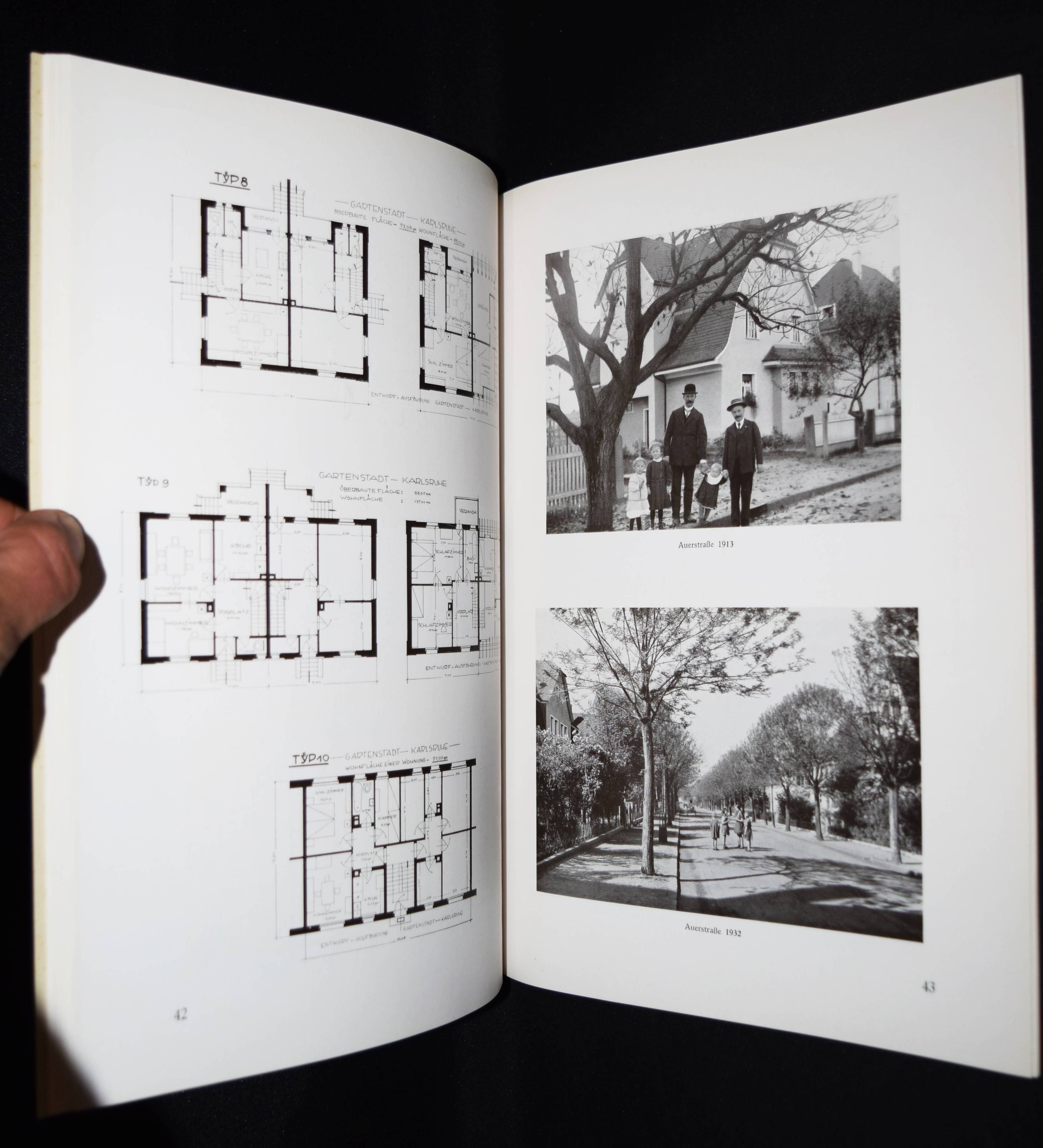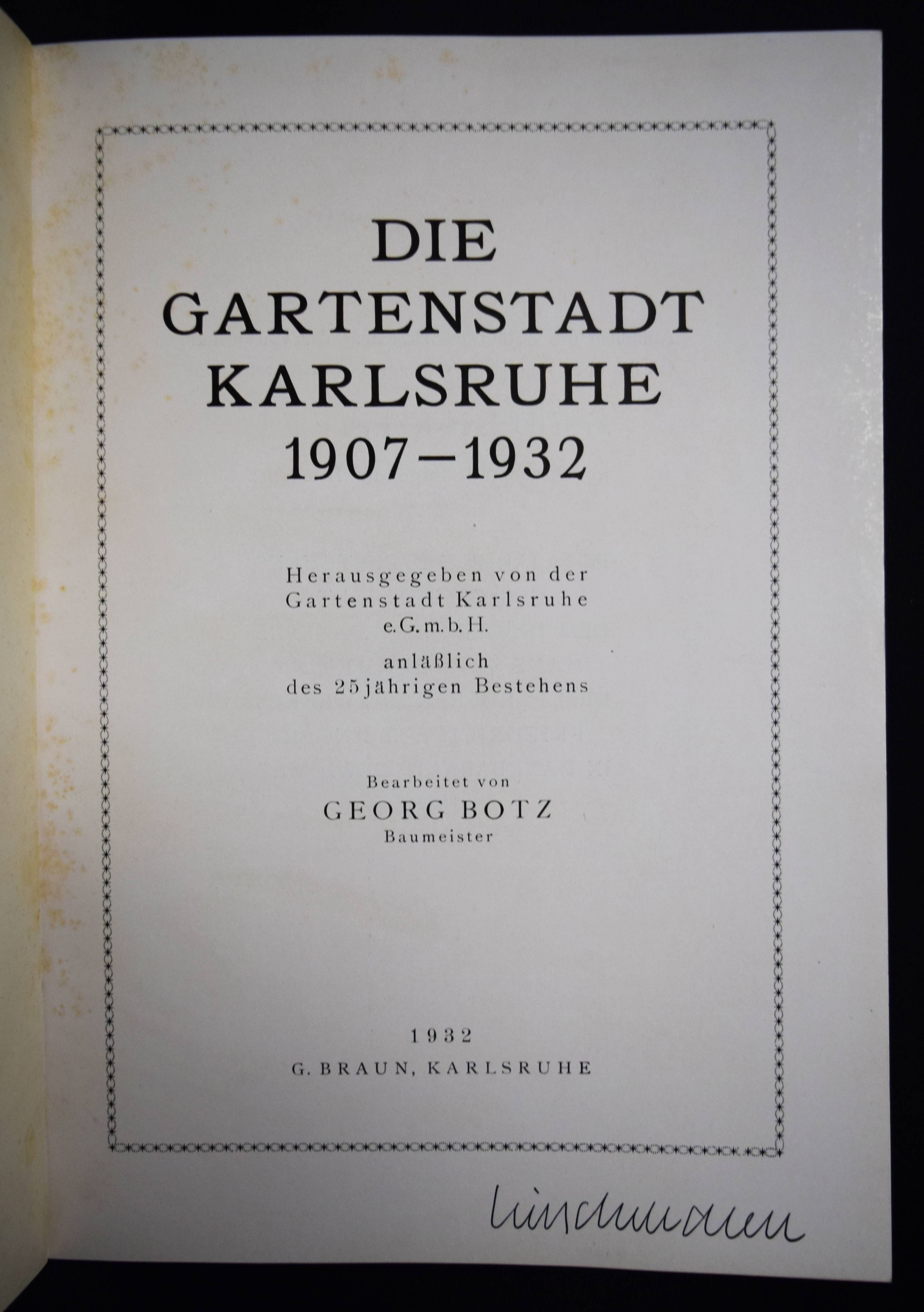 Botz, Georg. Die Gartenstadt Karlsruhe, 1907-1932. Herausgegeben … anlässlich des 25jährigen Bestehens. Karlsruhe, G. Braun 1932. 4°. 64 S. mit zahlr. Abb. Orig.-Kartonumschlag. „Die Gartenstadt Karlsruhe ist eine Wohnsiedlung im Südosten von Karlsruhe-Rüppurr, die nach den Grundsätzen einer Gartenstadt geplant und realisiert wurde. 1907 wurde die Baugenossenschaft Gartenstadt Karlsruhe eGmbH gegründet, 1911 wurde mit dem Bau der Gartenstadt begonnen, 1912 konnten die ersten 42 Häuser bezogen werden. Die Gartenstadt Karlsruhe gehört damit – neben Hellerau – zu den ältesten deutschen Gartenstädten auf der Grundlage eines gemeinschaftlichen Haus- und Grundbesitzes“ (Wikipedia). – Sehr gutes Exemplar.