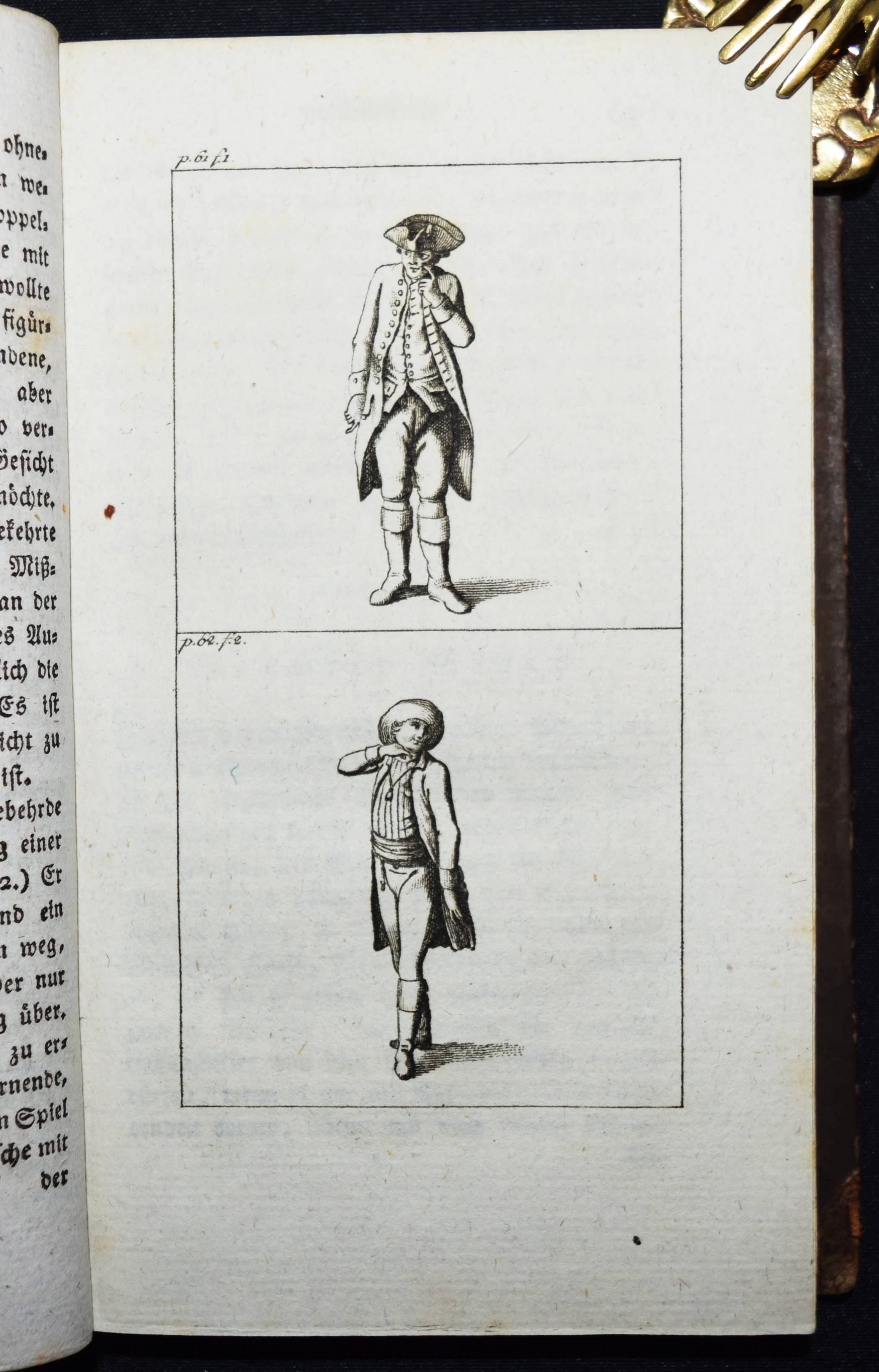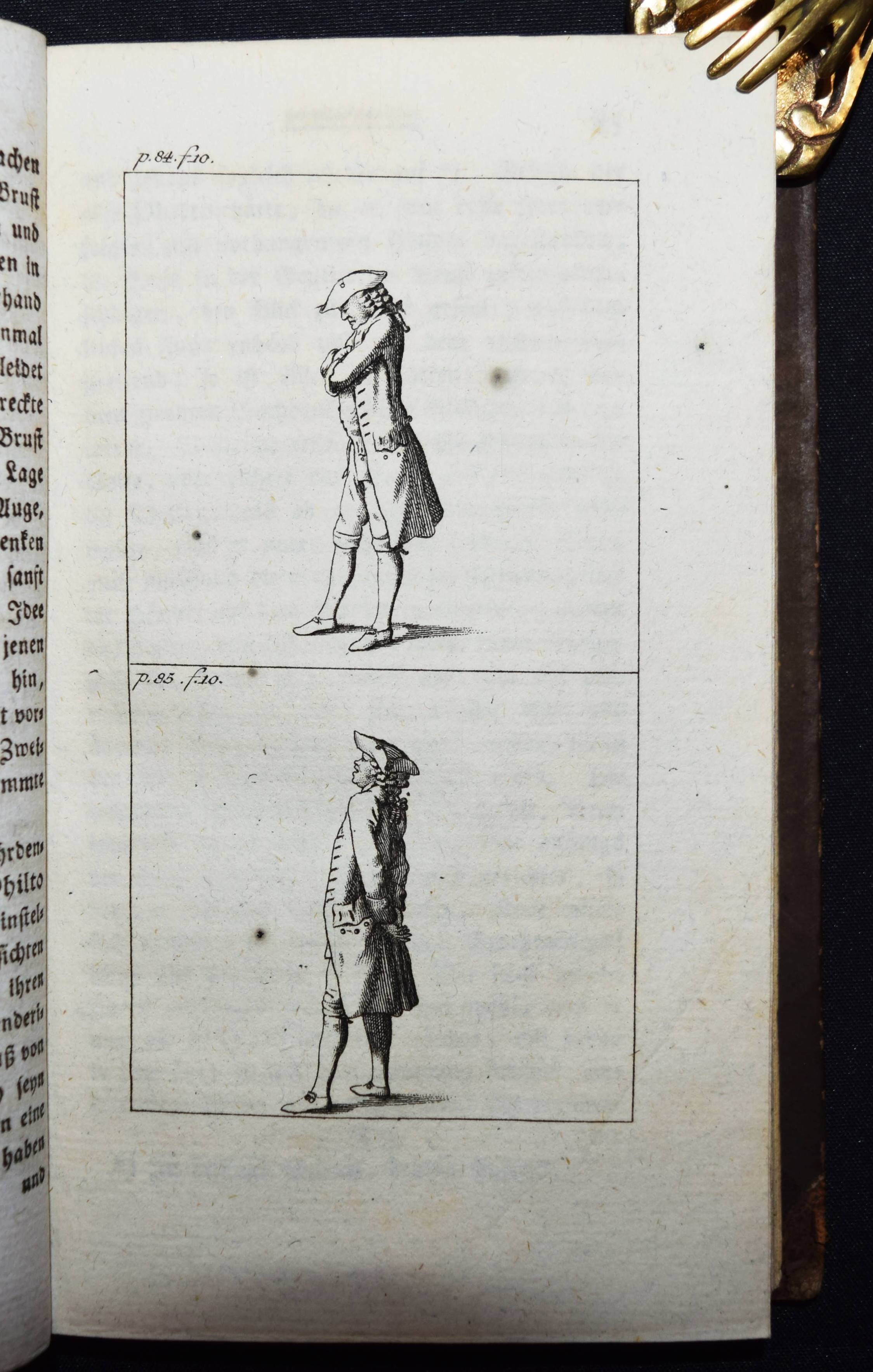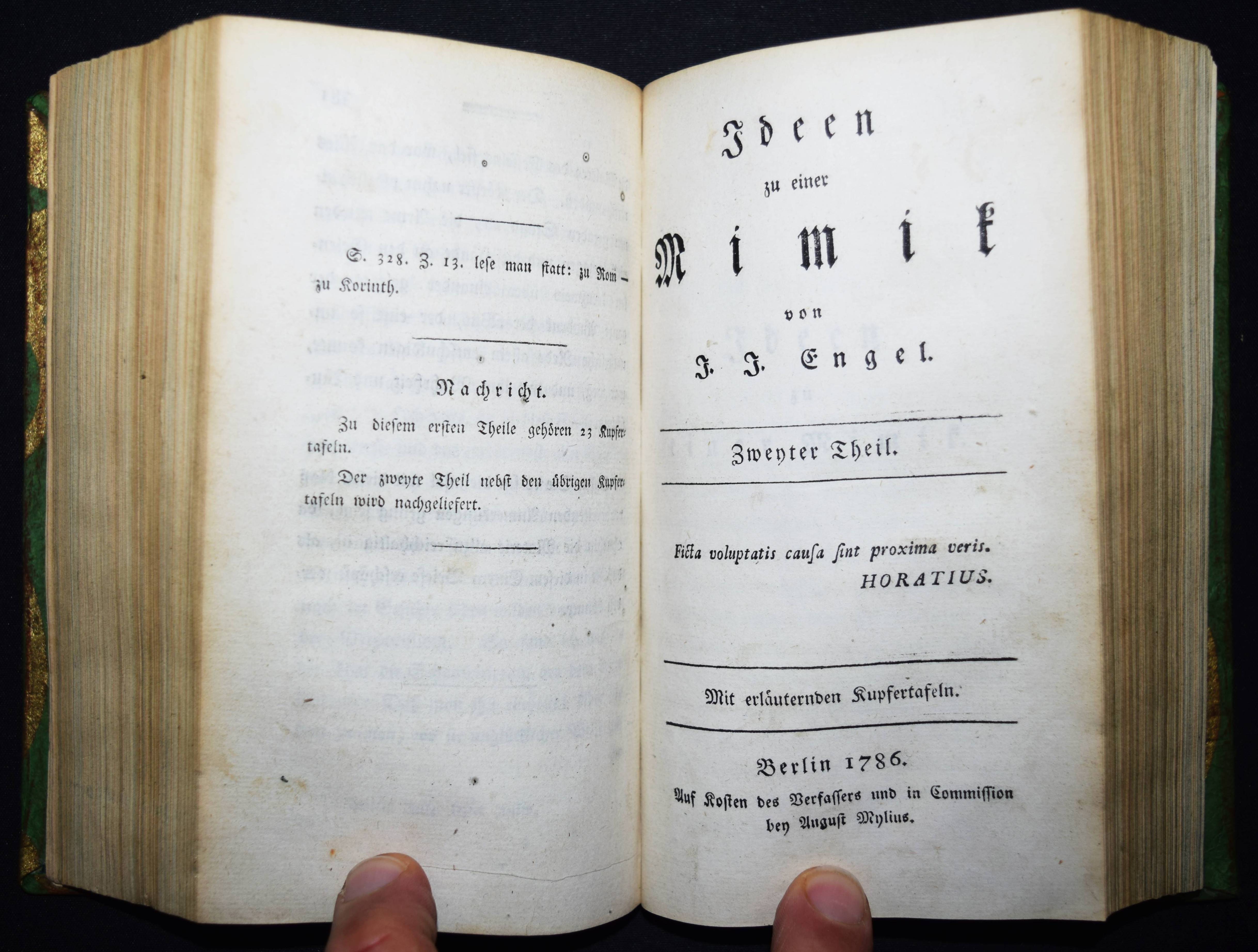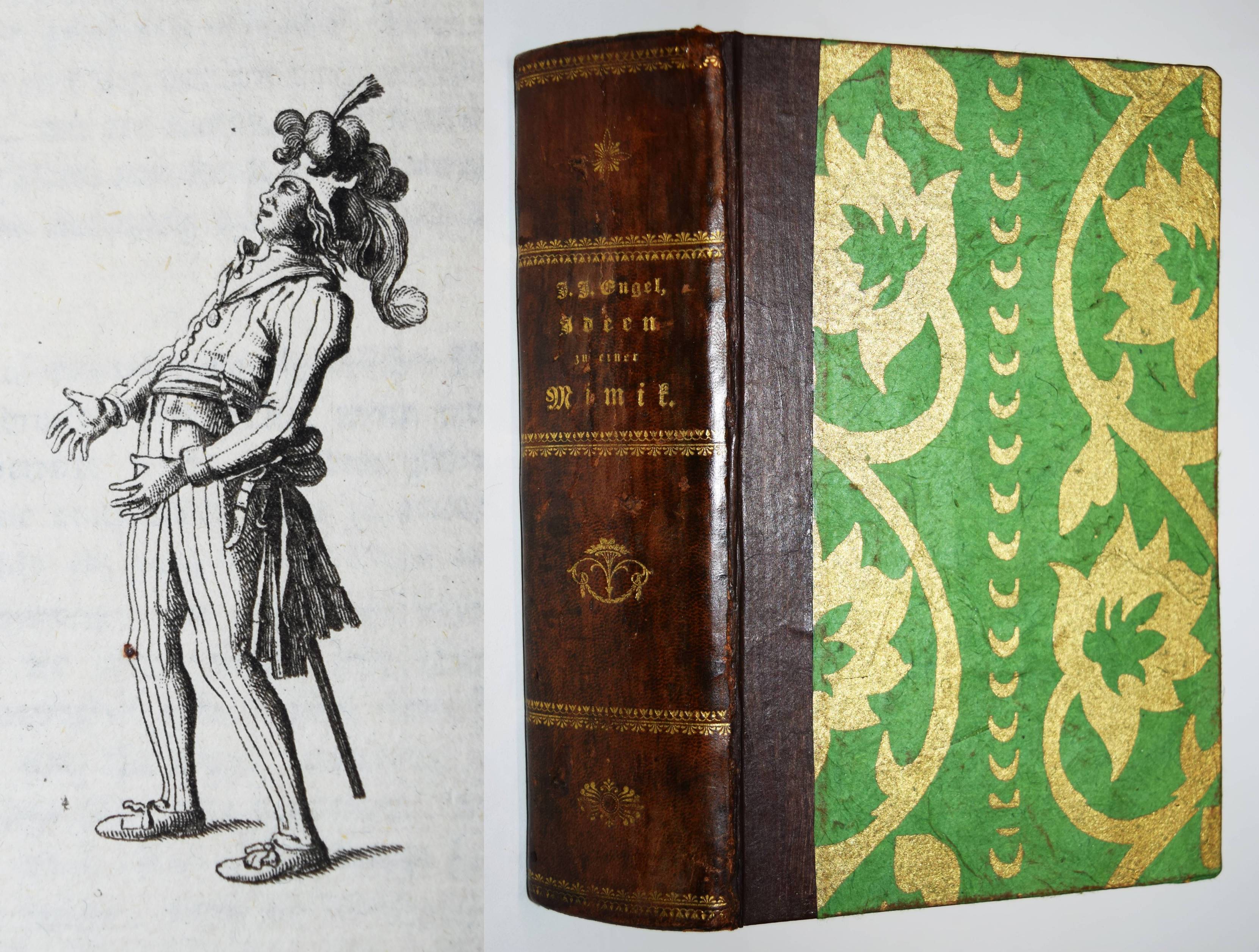 Engel, Johann Jakob. Ideen zu einer Mimik. 2 Teile in 1 Band. Berlin, Auf Kosten des Verfassers und in Commission bey August Mylius 1785-1786. 8°. Titel, 381, (1) S.; Titel, 1 Bl., 314 S. mit gestoch. Frontispiz u. zus. 59 Abb. auf 34 Kupfertafeln von Johann Wilhelm Meil. Halblederband der Zeit mit goldgepr. Rückentitel, Rückenvergoldung, Deckel mit Goldbrokatpapier bezogen. Goedeke V, 474, 13. Wilpert-Gühring² 16. Rümann 232. Dorn, Meil 447-481. Lanckoronska-Oehler II, 84. NDB IV, 504 f. – Erste Ausgabe. – Bedeutendes Werk für die Schauspieltheorie der Goethezeit. – „Johann Jacob Engel (1741-1802), wichtiger Vertreter der Berliner Aufklärung, war Lehrer der Brüder Alexander und Wilhelm von Humboldt sowie Prinzenerzieher, besonders des späteren Königs Friedrich Wilhelm III. 1787 wurde er mit der Leitung des Königlichen Theaters beauftragt. Er hat ein wesentliches Verdienst daran, daß aus der Wanderbühne ein Berliner Nationaltheater wurde“ (NDB). – „Johann Wilhelm Meils Blätter, die den Schauspieler in Posen jeder Art … zeigen, sind von großer Ausdruckskraft. Zugleich geben sie ein Bild von der Schauspielkunst damaliger Zeit … Auch für die Geschichte des Kostüms sind diese 34 Tafeln, die Hauptarbeit der letzten Jahre, von Belang“ (Lanckoronska-Oehler). – Einband restauriert, vorderes freies Vorsatzblatt fehlt, Besitzvermerk auf der Rückseite des Frontispiz, schönes dekorativ gebundenes Exemplar.