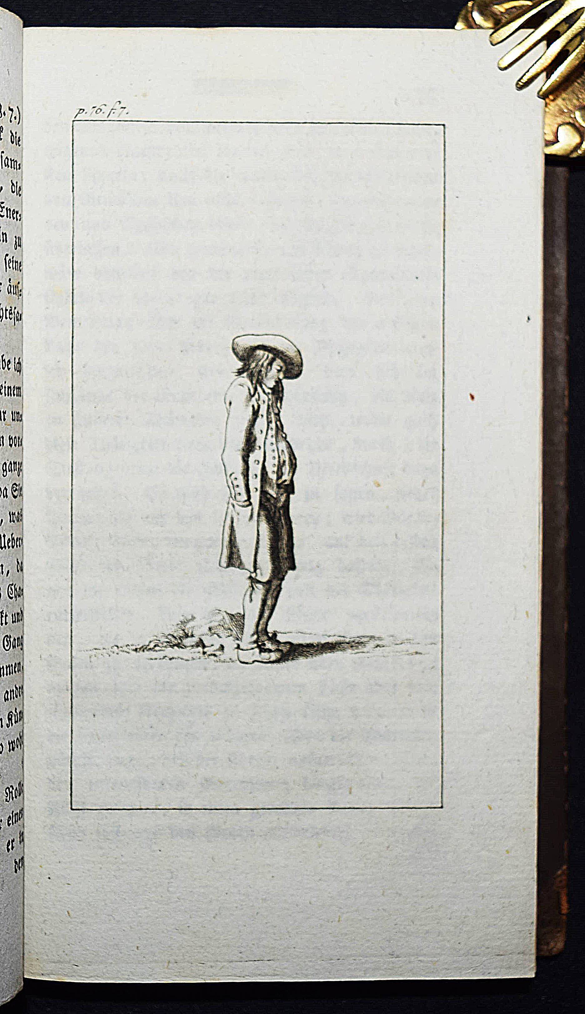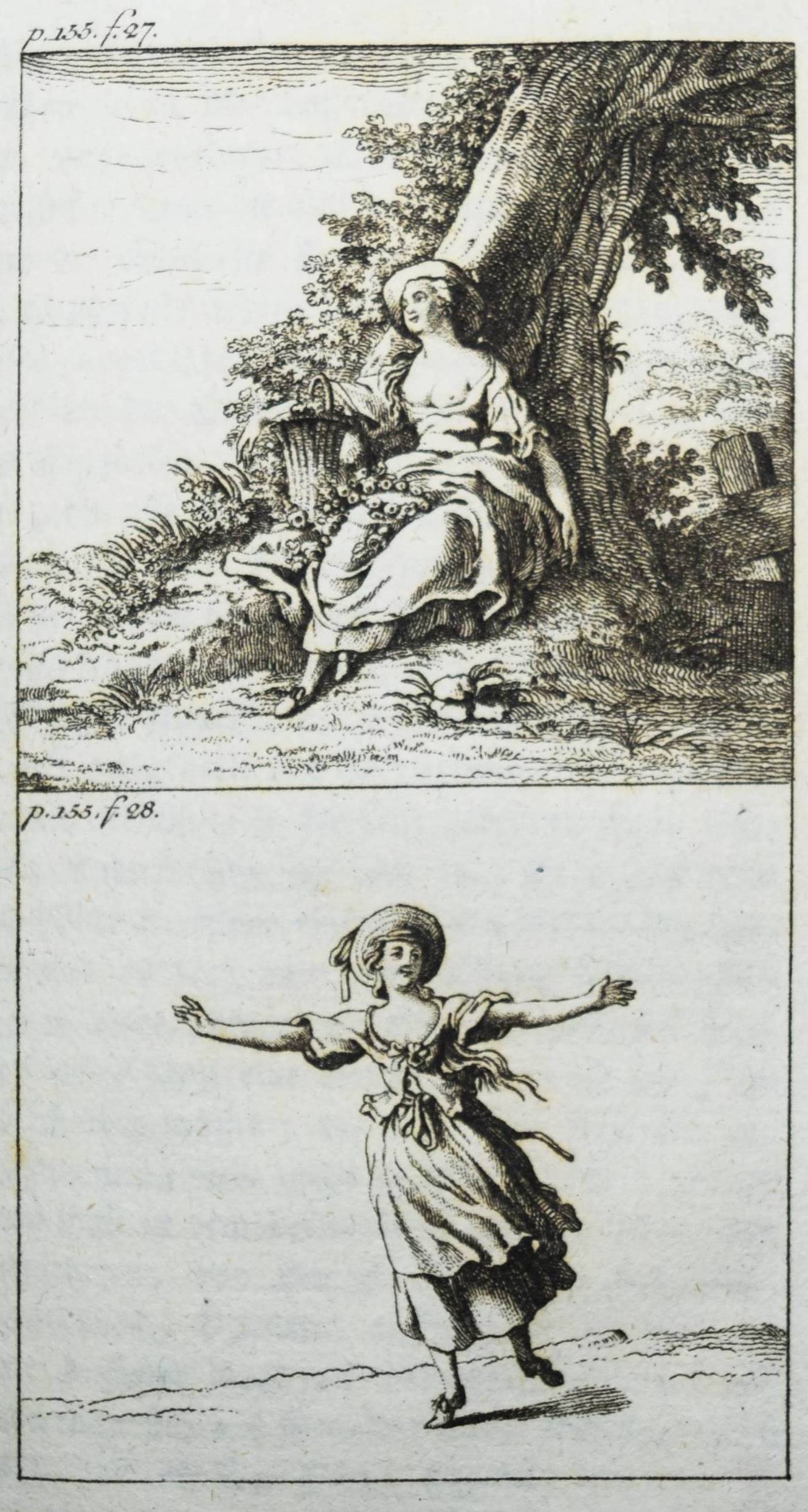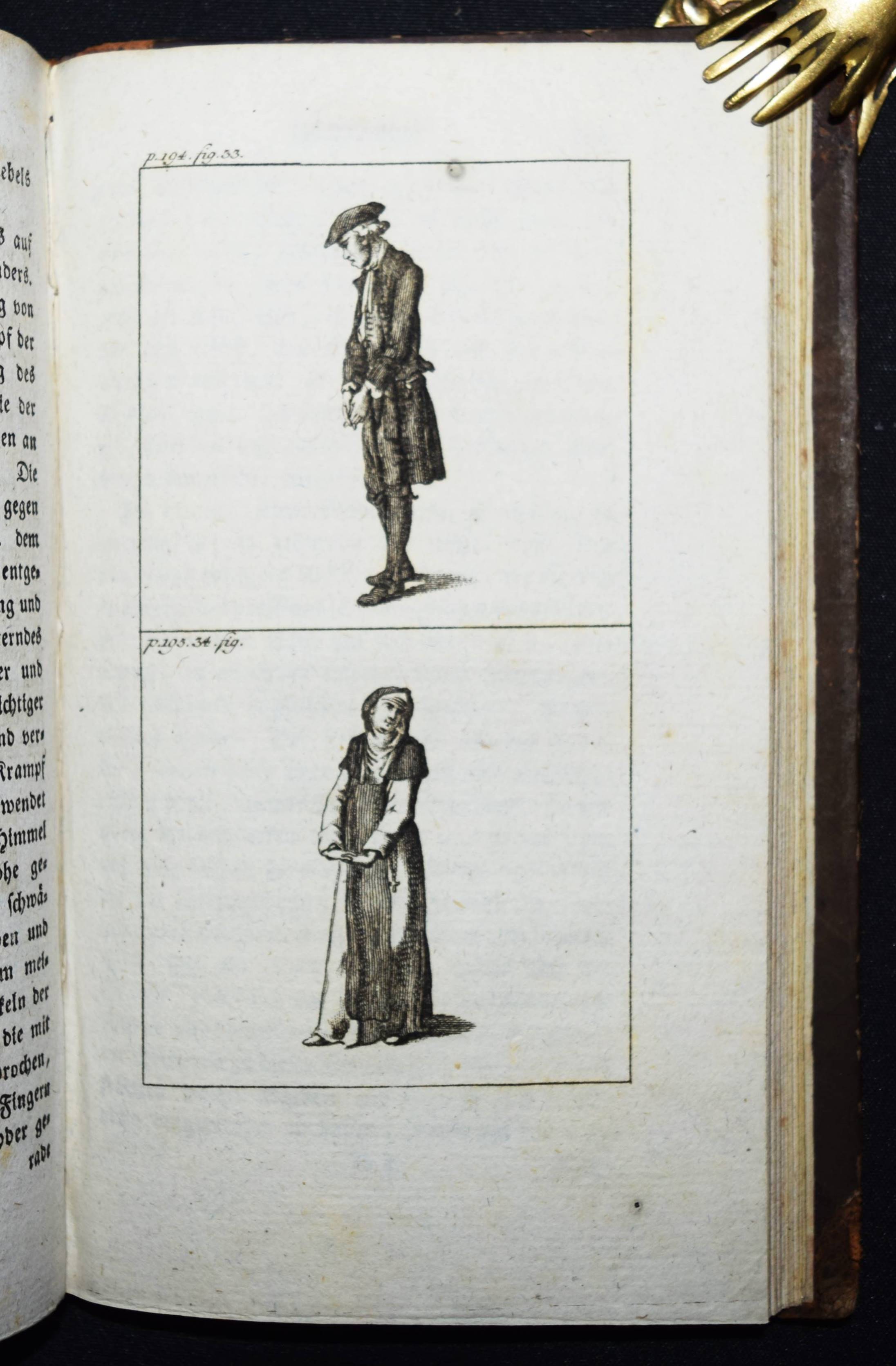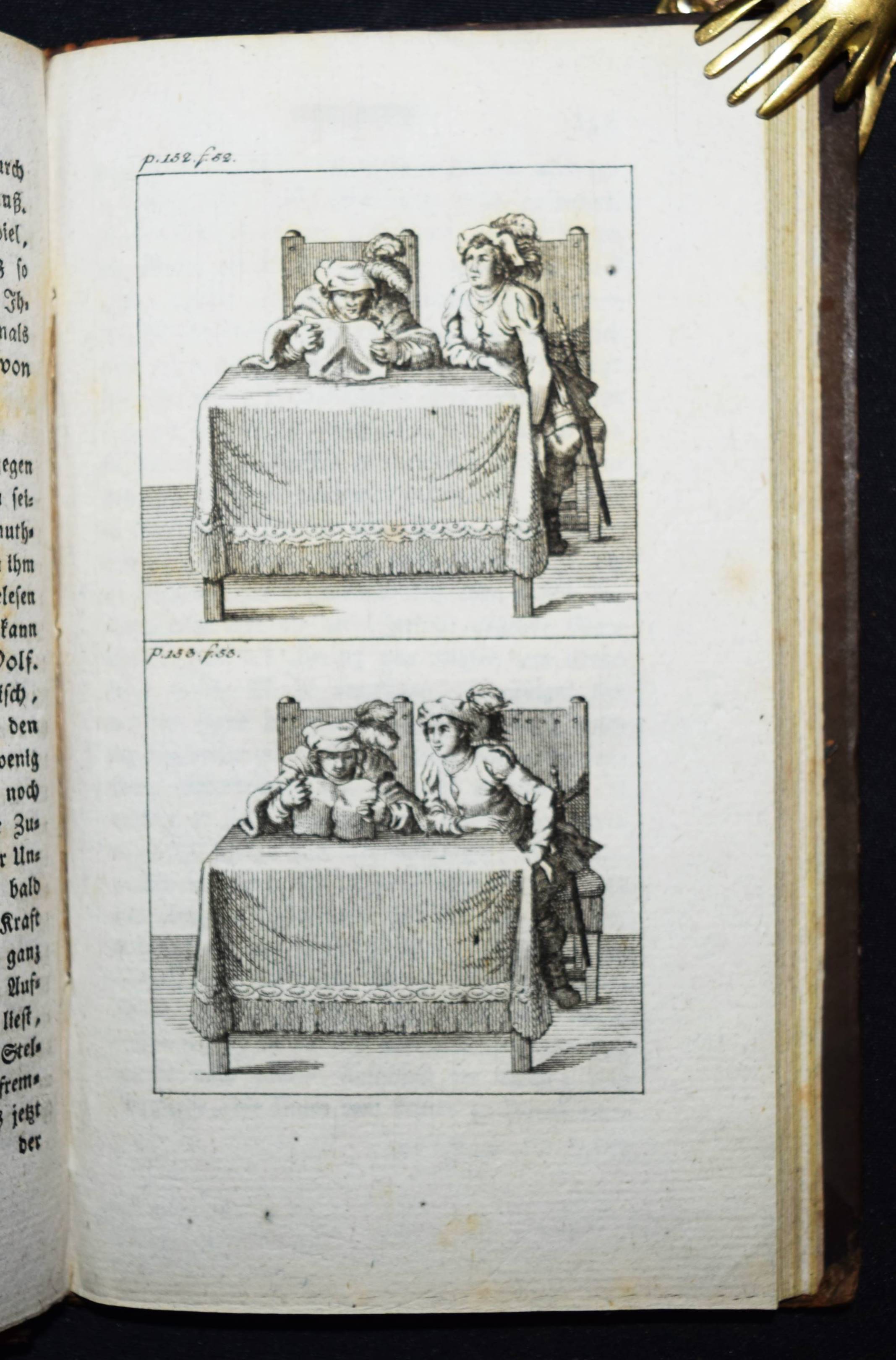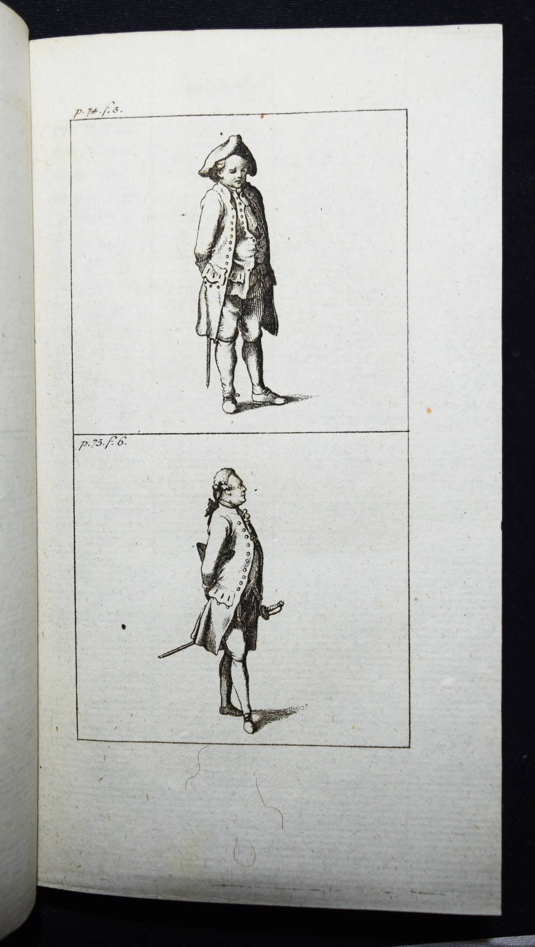 Engel, Johann Jakob. Ideen zu einer Mimik. 2 Teile in 1 Band. Berlin, Auf Kosten des Verfassers und in Commission bey August Mylius 1785-1786. 8°. Titel, 381, (1) S.; Titel, 1 Bl., 314 S. mit gestoch. Frontispiz u. zus. 59 Abb. auf 34 Kupfertafeln von Johann Wilhelm Meil. Halblederband der Zeit mit goldgepr. Rückentitel, Rückenvergoldung, Deckel mit Goldbrokatpapier bezogen. Goedeke V, 474, 13. Wilpert-Gühring² 16. Rümann 232. Dorn, Meil 447-481. Lanckoronska-Oehler II, 84. NDB IV, 504 f. – Erste Ausgabe. – Bedeutendes Werk für die Schauspieltheorie der Goethezeit. – „Johann Jacob Engel (1741-1802), wichtiger Vertreter der Berliner Aufklärung, war Lehrer der Brüder Alexander und Wilhelm von Humboldt sowie Prinzenerzieher, besonders des späteren Königs Friedrich Wilhelm III. 1787 wurde er mit der Leitung des Königlichen Theaters beauftragt. Er hat ein wesentliches Verdienst daran, daß aus der Wanderbühne ein Berliner Nationaltheater wurde“ (NDB). – „Johann Wilhelm Meils Blätter, die den Schauspieler in Posen jeder Art … zeigen, sind von großer Ausdruckskraft. Zugleich geben sie ein Bild von der Schauspielkunst damaliger Zeit … Auch für die Geschichte des Kostüms sind diese 34 Tafeln, die Hauptarbeit der letzten Jahre, von Belang“ (Lanckoronska-Oehler). – Einband restauriert, vorderes freies Vorsatzblatt fehlt, Besitzvermerk auf der Rückseite des Frontispiz, schönes dekorativ gebundenes Exemplar.