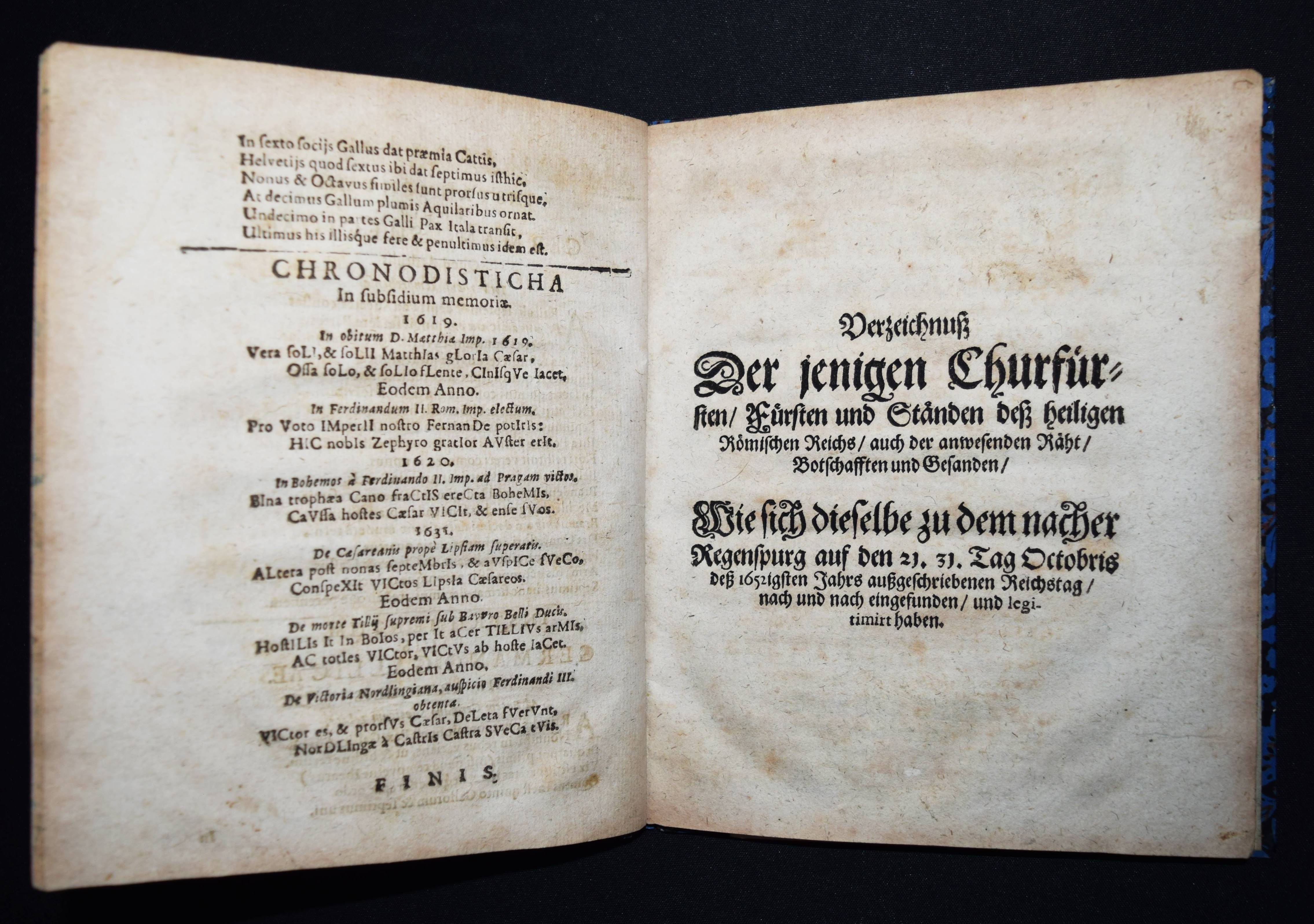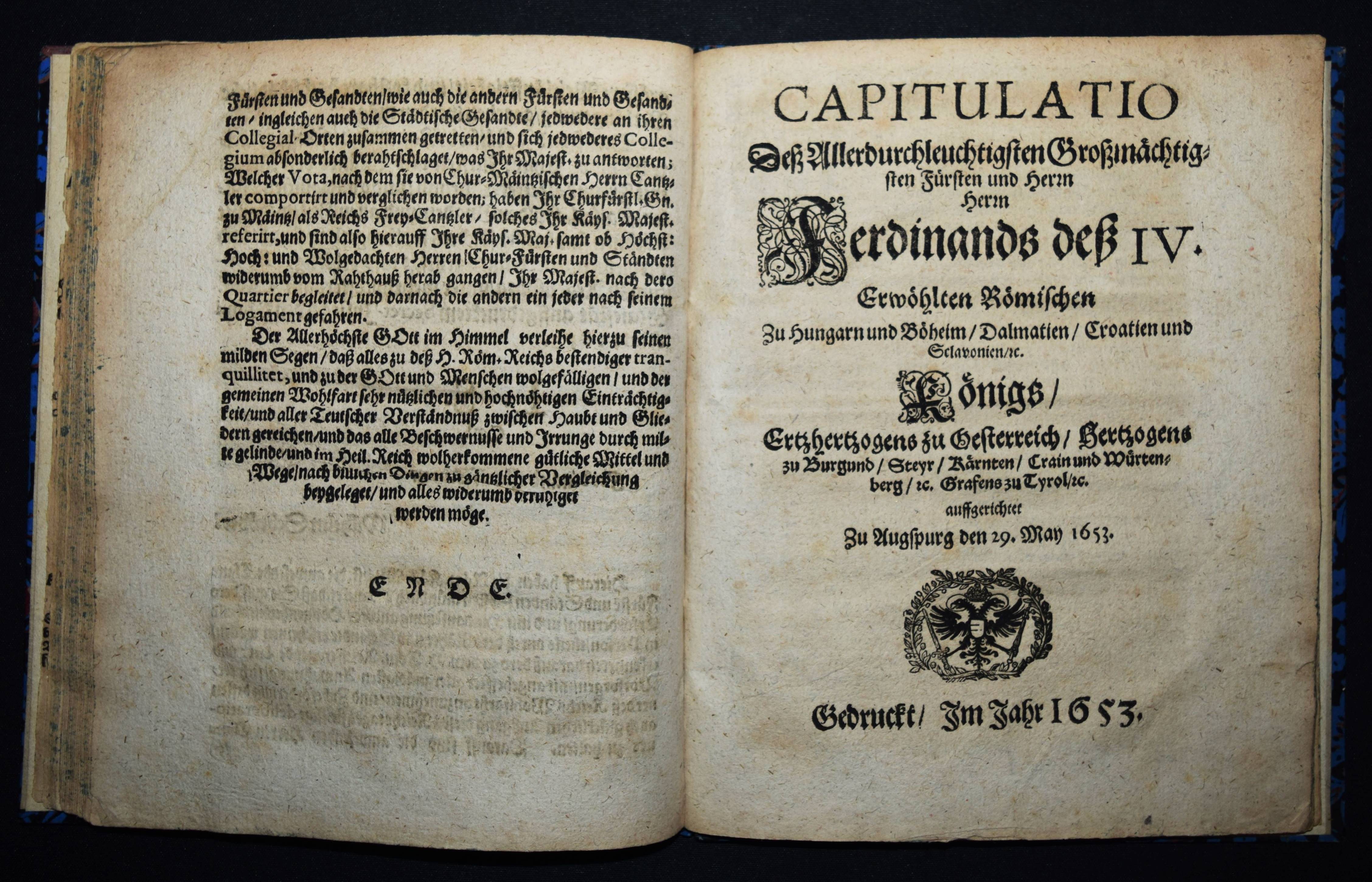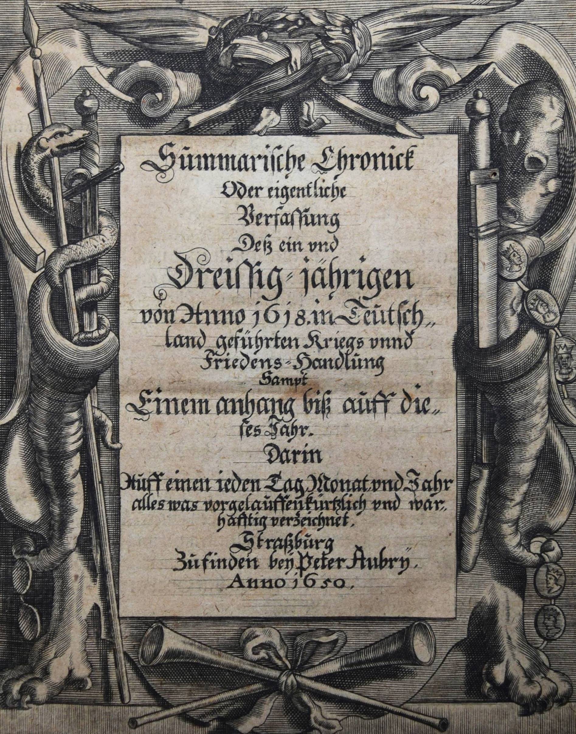 Summarische Chronick oder eigentliche Verfassung deß ein vnd Dreyssig-jährigen von Anno 1618. in Teutschland geführten Kriegs vnnd Friedens-Handlung. Sampt einem Anhang biß auff dieses Jahr, darin auff einen jeden Tag, Monat vnd Jahr alles was vorgelauffen kürtzlich vnd warhafftig verzeichnet. – Beigebunden: Verzeichnuß der jenigen Churfürsten, Fürsten und Ständen deß heiligen Römischen Reichs, auch der anwesenden Räht, Boschafften und Gesanden, wie sich dieselbe zu dem nacher Regenspurg auf den 21. 31. Tag Octobris deß 1652igsten Jahrs außgeschriebenen Reichstag, nach und nach eingefunden, und legitimirt haben. – Beigebunden: Röm. Käyserl. Majestät Allergnädigstes Außschreiben, zu deren nacher Regenspurg auff den 31. N. Octobr. 10. A. Novembr. im Jahr 1652. angestellten allgememeiner Reichs-Versamlung. Wie auch den 20. 30. Iunii darauff erfolgte Reichs-Proposition, Welche In Gegenwart der Röm Käys. Majäst. auch grosser Versamlung der Chur-Fürsten und Stände auff dem Rahthause zu Regenspurg abgeleget worden. Samt dem gewöhnlichen Process von der Ritterstuben in die Thomkirchen, und von dar auff das Rahthause zu Regenspurg abgeleget worden. Samt dem gewöhnlichen Prozess von der Ritterstuben in die Thomkirchen, und von dar auff das Rahthauß. – Beigebunden: Capitulatio Deß Allerdurchleuchtigsten Großmächtigsten Fürsten und Herrn Herrn Ferdinands deß IV. Erwöhlten Römischen Zu Hungarn und Böheim, Dalmatien, Croatien, und Sclavonien, [et]c. Königs, Ertzhertzogens zu Oesterreich, Hertzogens zu Burgund, Steyr, Kärnten, Crain und Würtenberg, [et]c. Grafens zu Tyrol, [et]c. auffgerichtet zu Augspurg den 29. May 1653. 4 Werke in 1 Band. Straßburg, Peter Aubry (1. Werk) und ohne Ort und Druck (2.-4. Werk) 1650 und 1653. 22 S., [1] Bl. mit illustr. gestoch. Titel; [14] Bl.; [10] Bl.; [12] Bl. Moderner Pappband mit floralem Buntpapier. I. VD17 12:150825V. – III. VD17 12:112110H. – IV. VD17 14:005995Z. – Interessanter Sammelband mit 4 seltenen Flugschriften zum Dreissigjährigen Krieg und Westfälischen Frieden am 24. Oktober 1648 bzw. den sog. Jüngsten Reichsabschieds (Schlussdokument des Regensburger Reichstages von 1653/1654): „Bei dem Dokument mit der ungewöhnlichen Bezeichnung handelt es sich um den letzten Reichsabschied eines offiziell einberufenen und offiziell beendeten Reichstags des Heiligen Römischen Reiches. Dieser letzte offizielle Reichstag war zugleich auch der erste Reichstag nach dem Ende des Dreißigjährigen Krieges. Der Reichstag sollte sich mit Fragen und Problemen beschäftigen, die beim Abschluss des Westfälischen Friedens ungeklärt geblieben waren. Einige schwierige Aufgaben konnten nicht abgeschlossen werden und auch der 10 Jahre später 1663 nach Regensburg einberufene Reichstag konnte diese alten und auch neue Probleme nicht lösen. Er wurde deshalb nicht offiziell beendet und wurde bald als Immerwährender Reichstag bezeichnet. Auch die gefassten Beschlüsse wurden nicht mehr als offizielle Reichsabschiede erarbeitet und konnten nicht mehr so bezeichnet werden. Stattdessen wurden diese Beschlüsse nur als Reichsschlüsse (conclusa imperii) bezeichnet“ (Wikipedia). – Das schöne Titelblatt des ersten Werks mit altem Besitzvermerk (dat. 1705), durchgehend etwas gebräunt, sonst sehr gut erhalten.