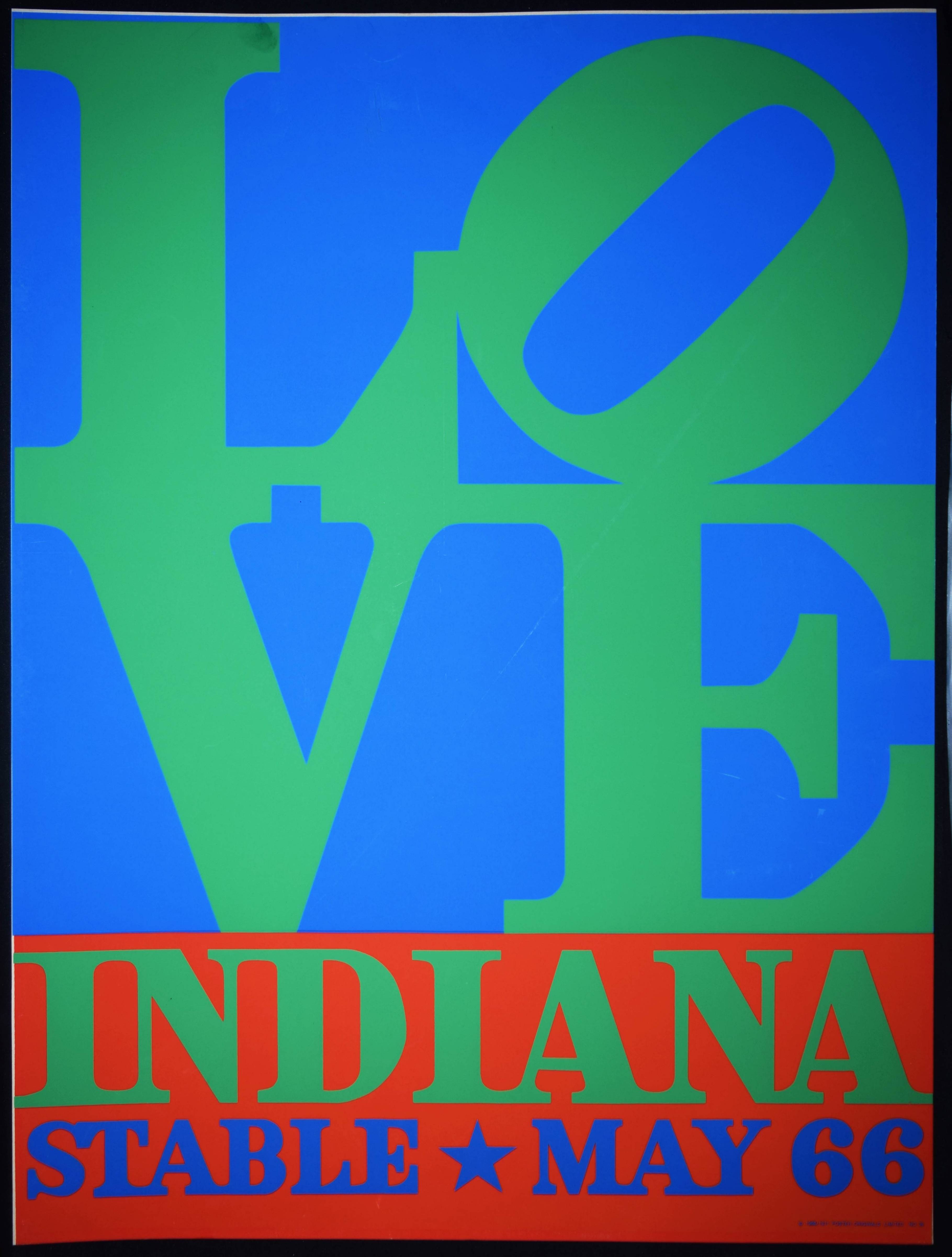 Indiana, Robert. Love Stable May 66. Plakat. Farbige Serigraphie auf Papier. Rechts unten im Druck typographisch bezeichnet: 1966 / 1971 Poster Originals Limited No 39. New York, Poster Originals Limited 1971. Robert Indiana (1928-2018), ein Hauptvertreter der Pop Art und der Signalkunst, wurde durch seine plakativen Zeichenbilder bekannt und hatte seine erste Einzelausstellung in der Stable Gallery in New York 1966. Im selben Jahr entstand auch sein bekanntestes Werk LOVE mit seinen Buchstaben L und O, darunter V und E – in den Farben Rot, Blau und Grün. Das Motiv wurde 1964 vom „Museum of Modern Art“ in New York als Weihnachtskarte bei Indiana in Auftrag gegeben. – „Für mich stellt das ‚LOVE‘-Gemälde ein Ein-Wort-Gedicht dar. Das ‚O‘ ist Teil einer typographischen Tradition – bei im Handsatz hergestellten Skripten ist das ‚O‘ gekippt. Das war ganz und gar nicht meine Erfindung. Ich habe einfach eine Tradition fortgeführt.“ (R. Indiana zit. nach Katalog zur Ausstellung im Museum Kurhaus und Koekkoek Haus Kleve 2007, S. 106 f.). – Mit leichtem Fingerabdruck im Buchstaben „L“, sehr gutes Exemplar. – Robert Indiana (1928-2018), a major representative of Pop Art and signal art, became known for his striking drawings and had his first solo exhibition at the Stable Gallery in New York in 1966. In the same year, he also created his best-known work LOVE with his letters L and O, including V and E – in red, blue and green. The motif was commissioned from Indiana by the Museum of Modern Art in New York in 1964 as a Christmas card. – “For me, the ‚LOVE‘ painting represents a one-word poem. The ‚O‘ is part of a typographical tradition – in hand-set scripts, the ‚O‘ is tilted. That wasn’t my invention at all. I was simply continuing a tradition.” (R. Indiana in the catalog of the exhibition at Museum Kurhaus and Koekkoek Haus Kleve 2007, p. 106 f.). – With a slight fingerprint in the letter “L”, very good copy.