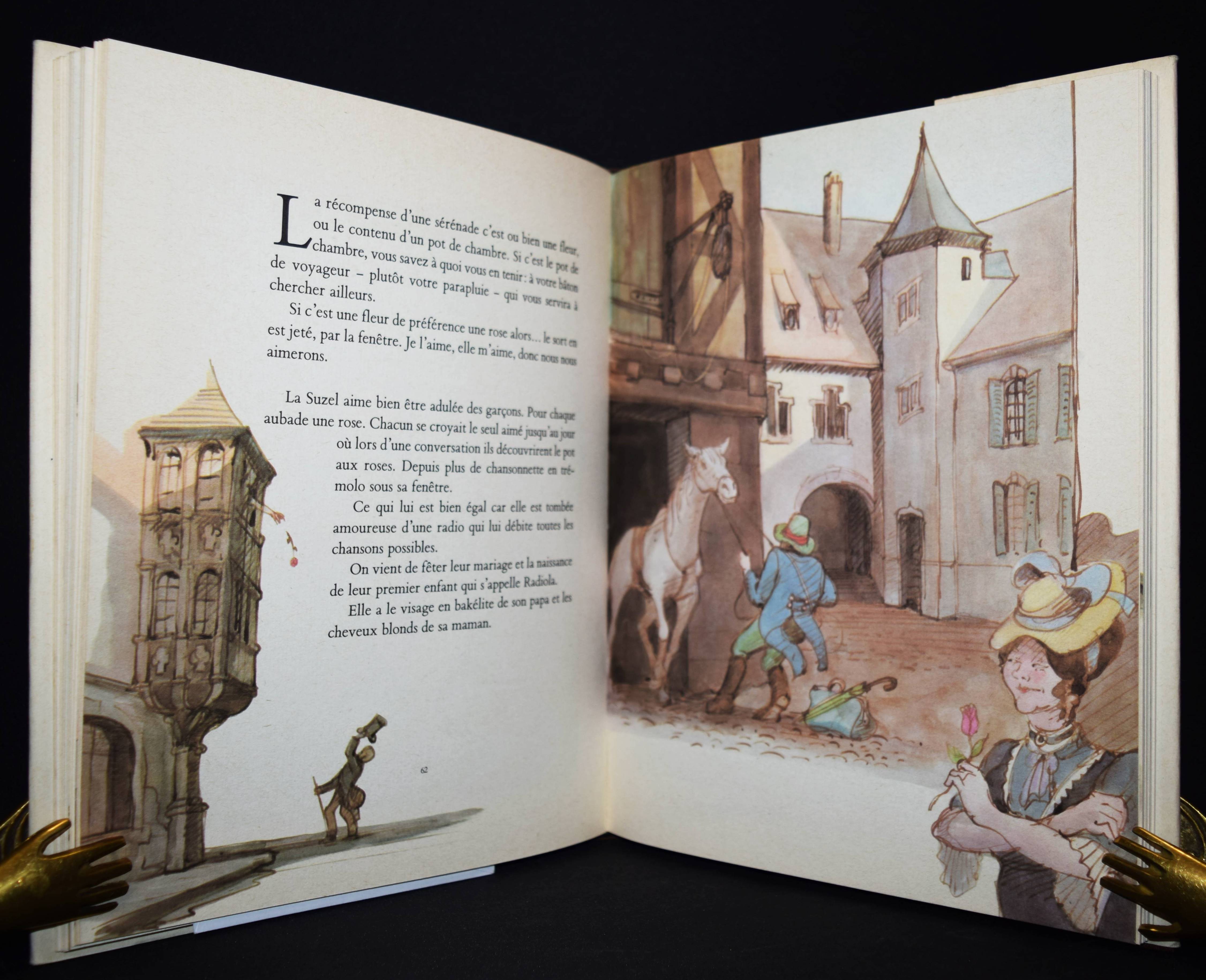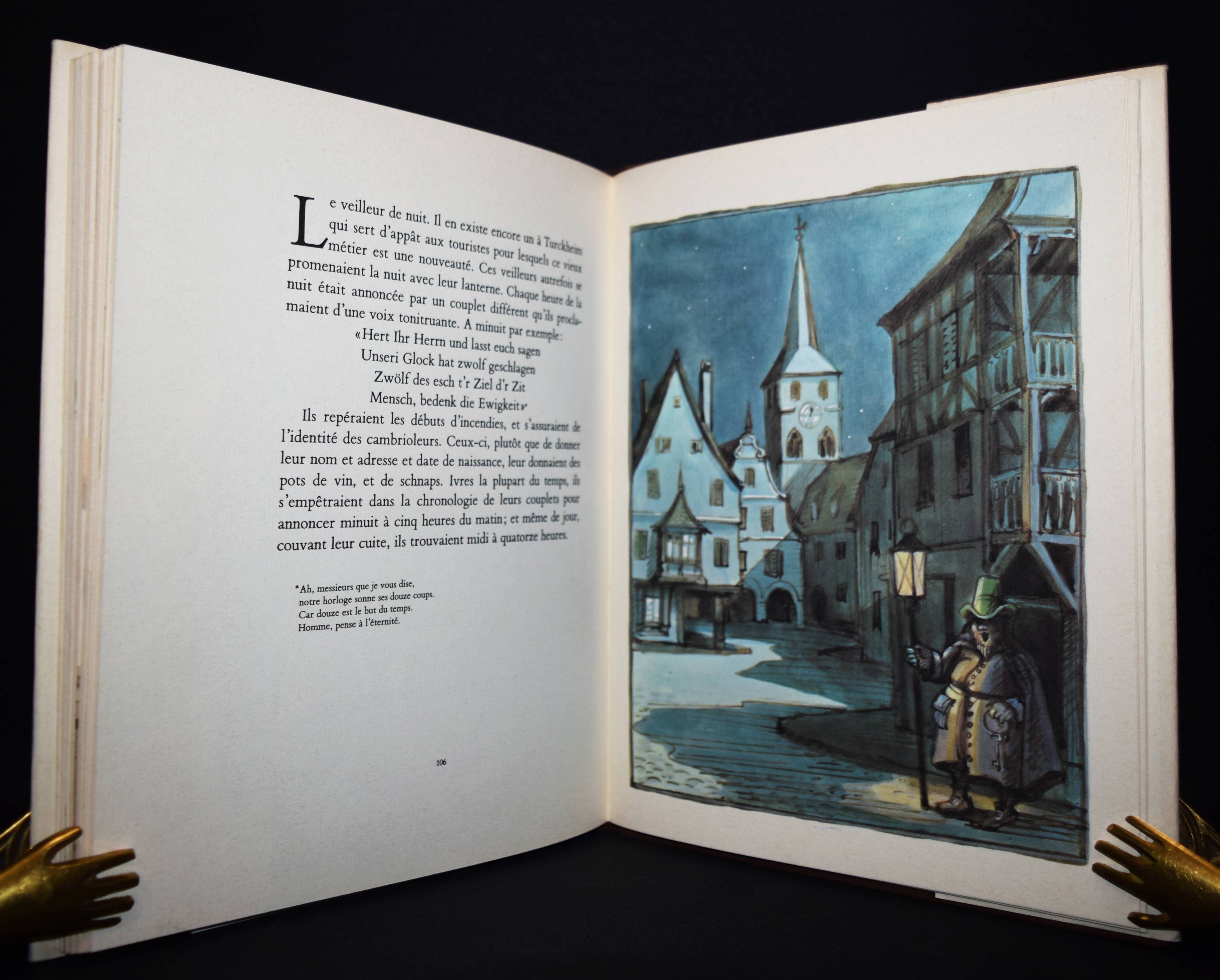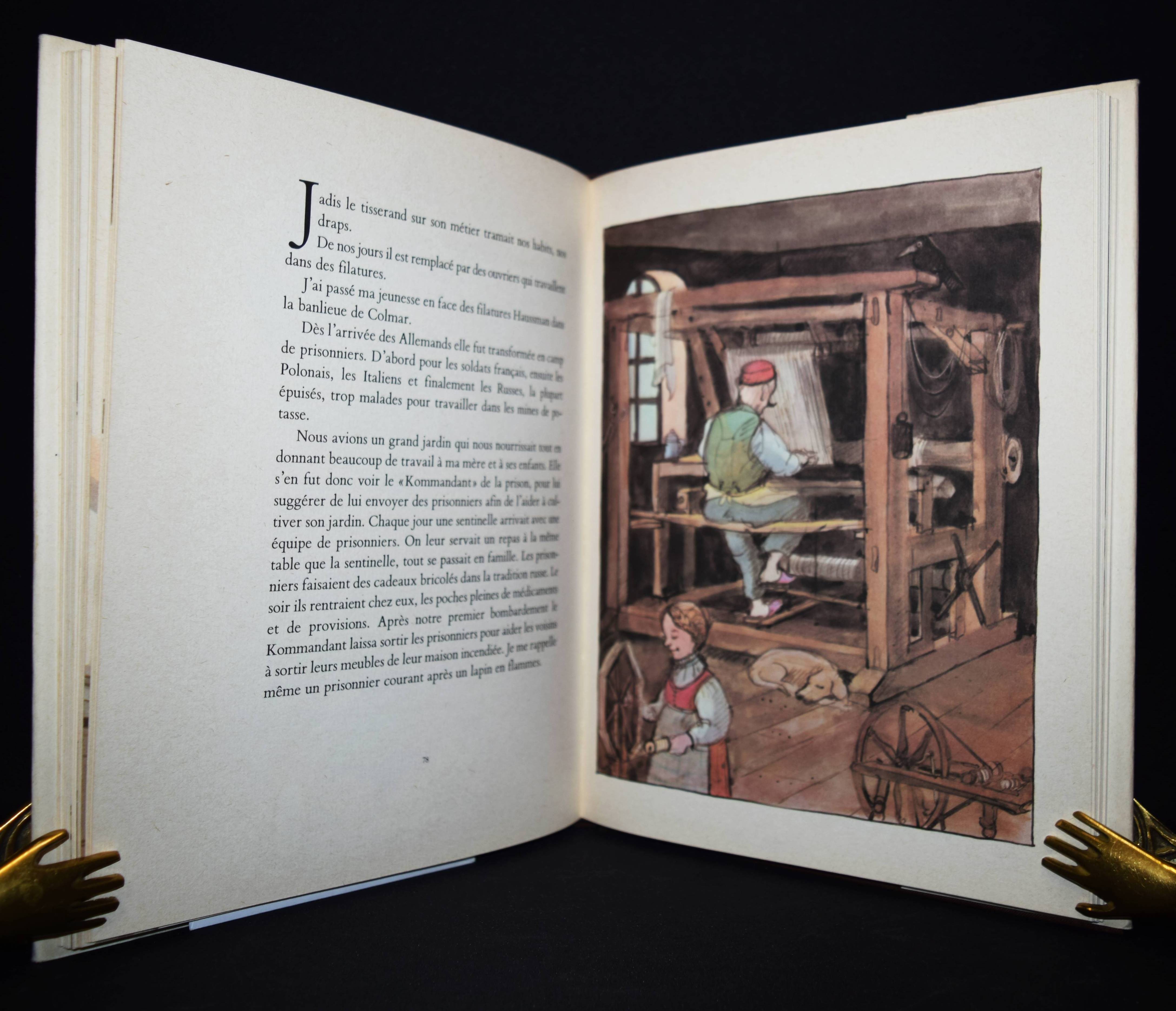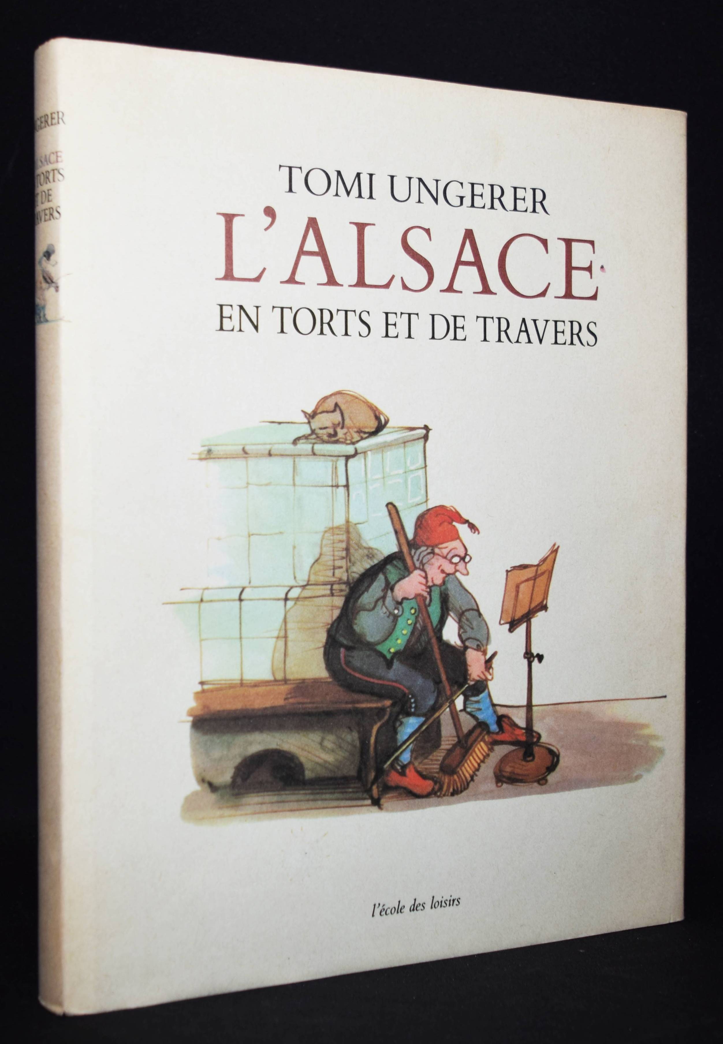 Ungerer, Tomi. L’ Alsace en torts et de travers. Paris, École des Loisirs 1988. 4°. 116 p. avec illustrations en couleur. Reliure en toile originale avec jaquette illustrée en couleur. Première édition avec belle envoi de T. Ungerer „Pour Francois T. Ungerer“. – „Ce livre, de façon exagérée, manifeste ce que je ressens en tant qu’Alsacien. Mais je ne suis qu’un Alsacien parmi d’autres… J’enfin, j’espéride que mes batifollations, sans queue et sans trop de têtes, rédigées du coq à l’âme sauront vous fendre un sourire dans le visage.“ (T. Ungerer). – Très bon exemplaire.