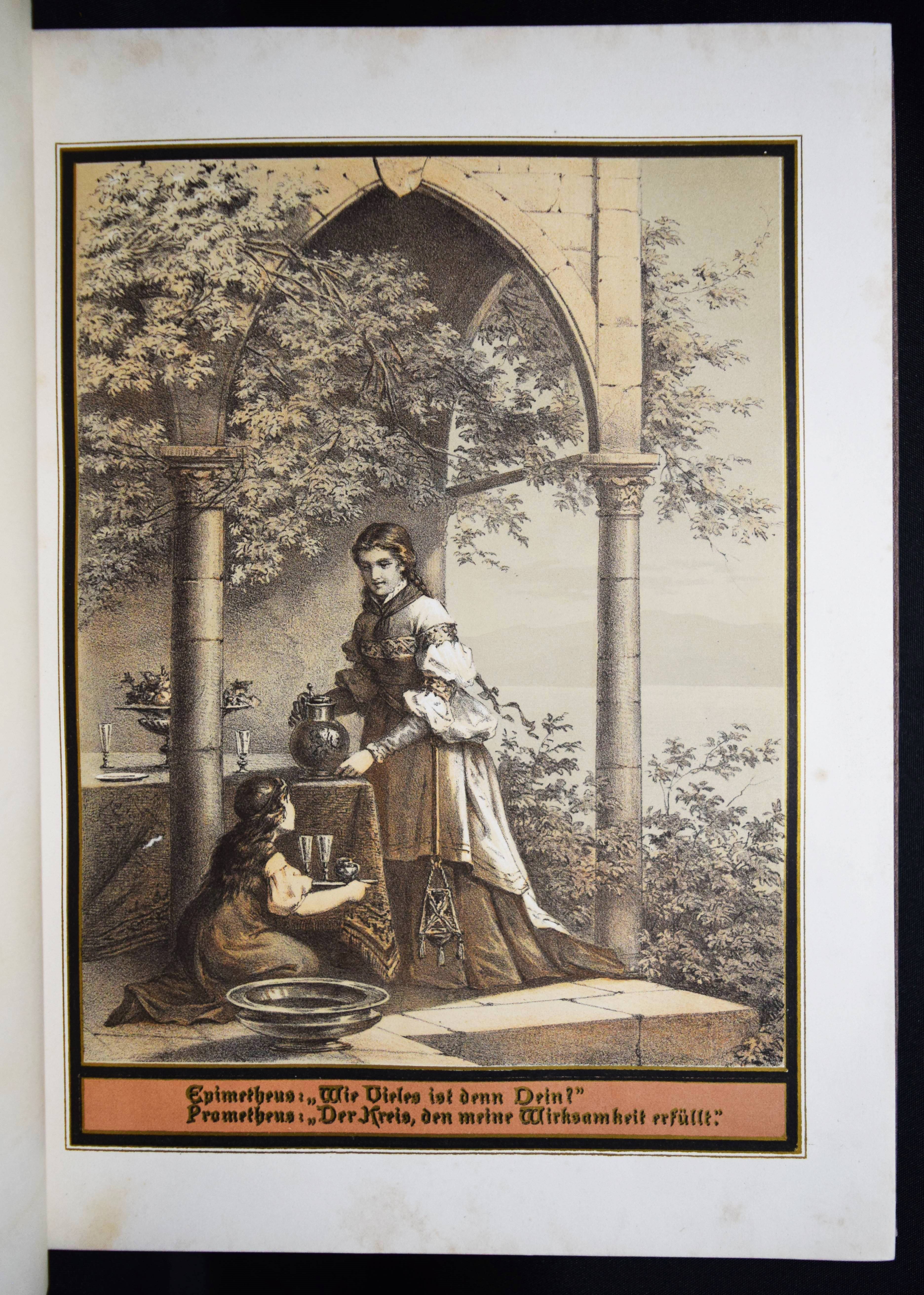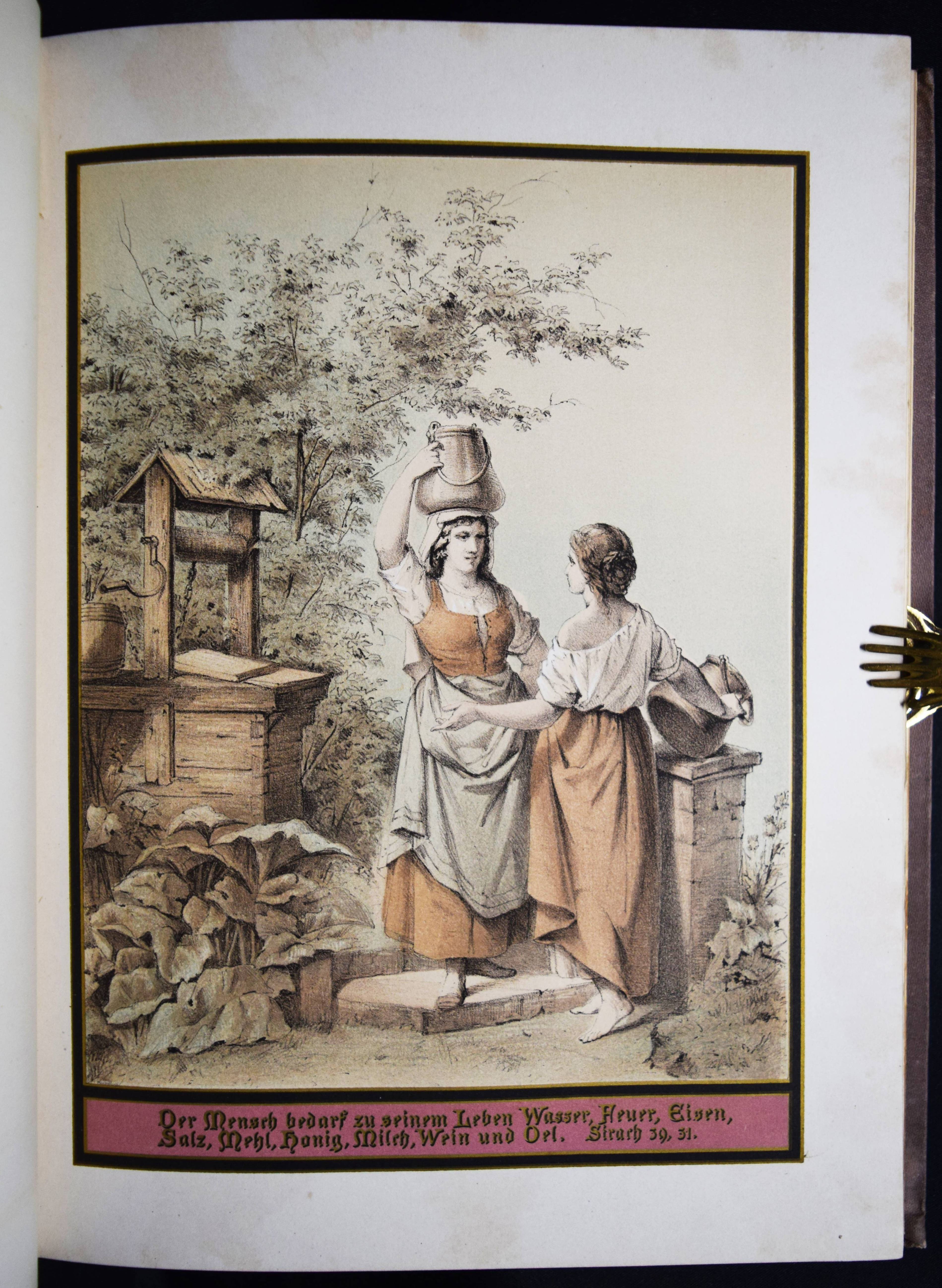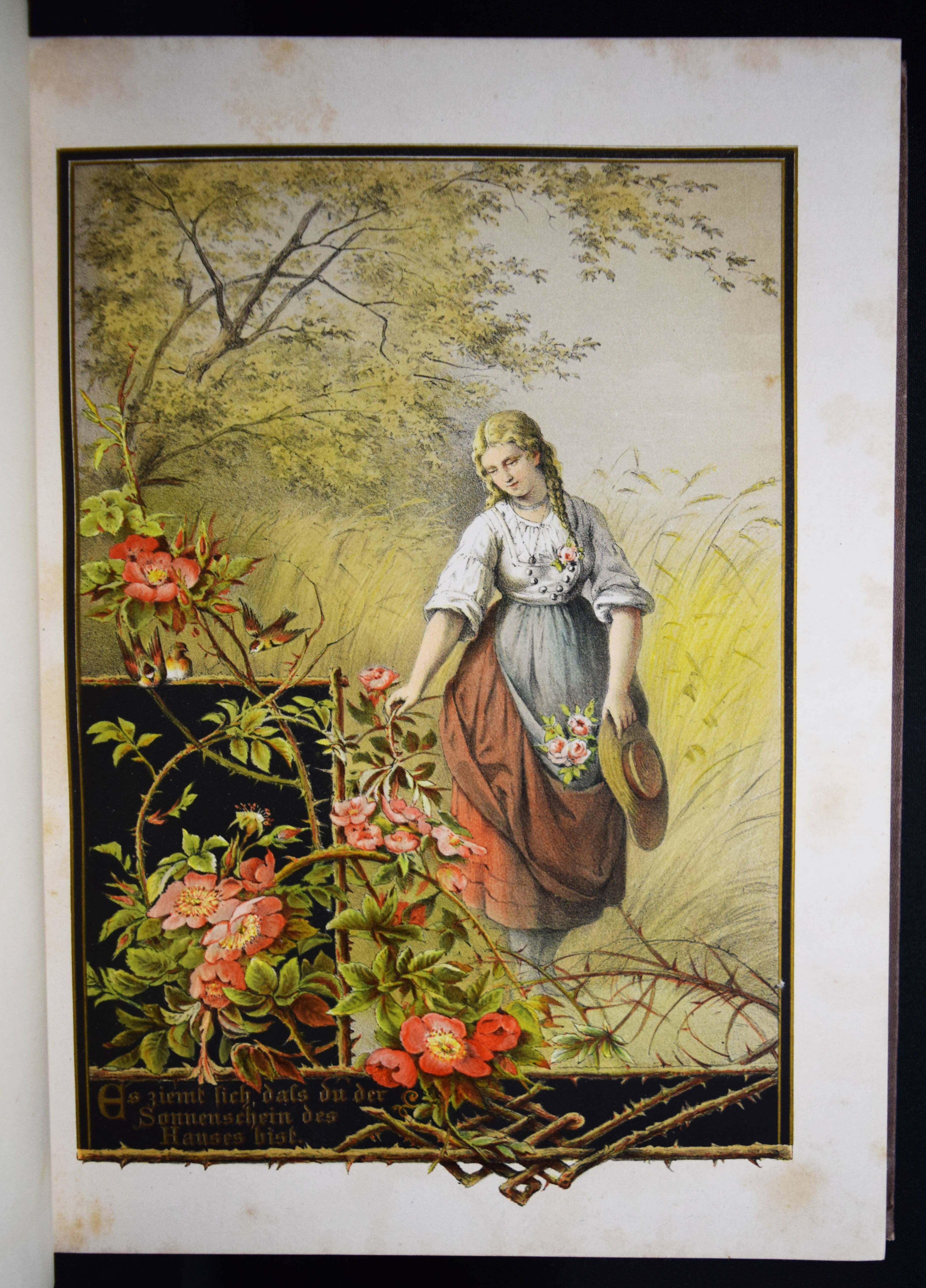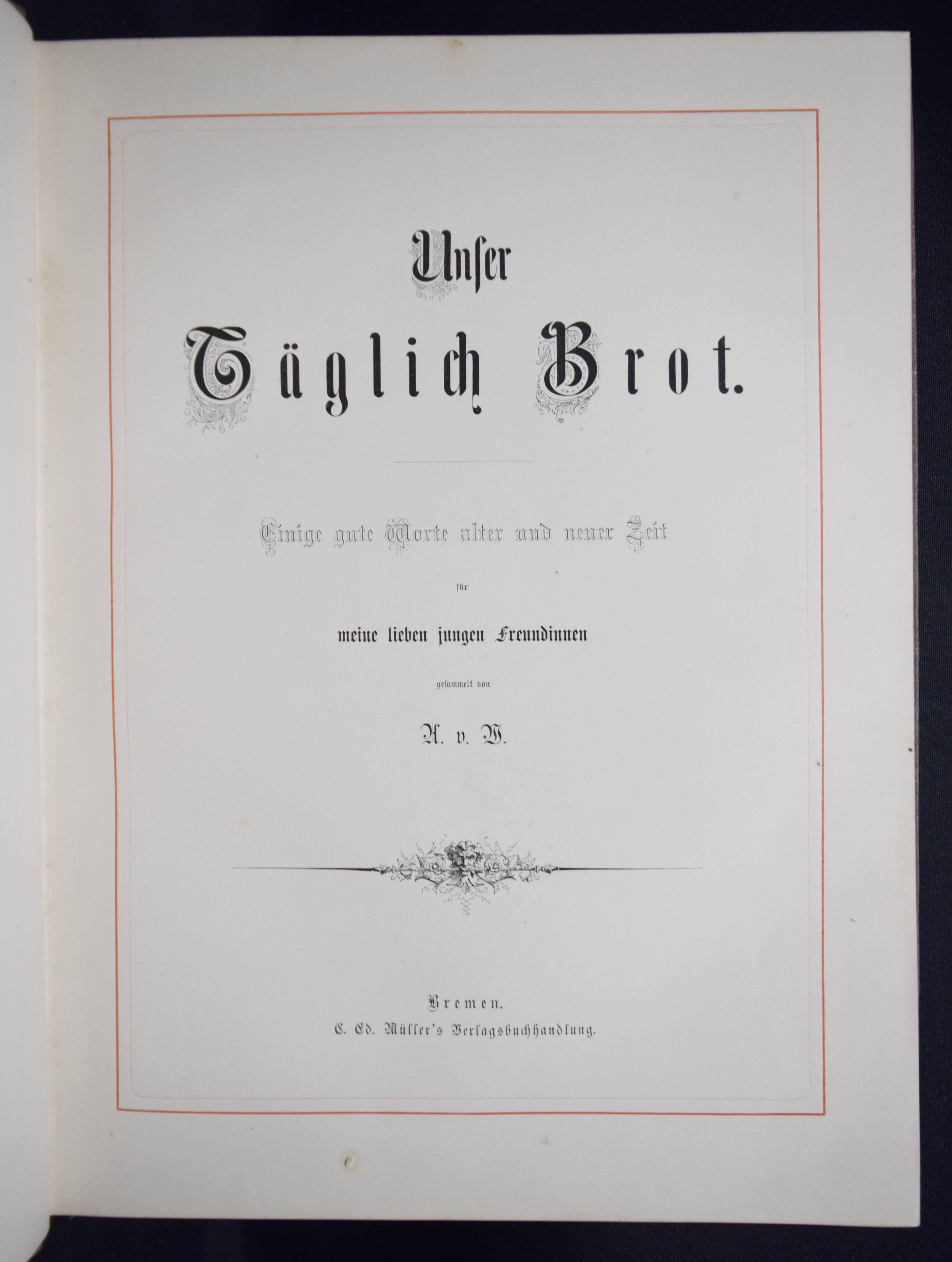W(oringen), A(ngelica) v. Unser täglich Brot. Einige gute Worte alter und neuer Zeit für meine lieben jungen Freundinnen. Bremen, C. Ed. Müller (1876). 4°. [3] Bl., 143 S., [14] Bl. mit 14 (12 farb. lithogr., 2 Holzstich) Tafeln. Grüner Orig.-Leinenband mit goldgepr. Rücken- und Deckeltitel, dekorativer Rücken- und Deckelvergoldung und Goldschnitt. Horn-Arndt 625. Weiss 4292. – Einzige Ausgabe, selten. – „Prunkkochbuch mit dürftigem Rezeptteil. Das mit einem Preis von 60 Goldmark mit Abstand teuerste Kochbuch der Zeit“ (H.-U. Weiss). – Inhalt: „Die Tochter des Hauses. – Die Frau des Hauses. – Eigner Herd ist Goldes wert. – Feuer und Wasser dienen gern etc. – Werth des Geldes. – Sonst und Jetzt. – Mässigkeit und Genügsamkeit. – Feine Küche. – Ruhe nach der Arbeit. – Gastfreiheit und Schmuck der Tafel. – Getränke (mit einer Weinkarte).“ – Die schönen Tafeln mit romantischen Genreszenen. – Kapital und Fuß geringfügig bestossen, im Blattrand teils etwas fingerfleckig, gutes Exemplar.