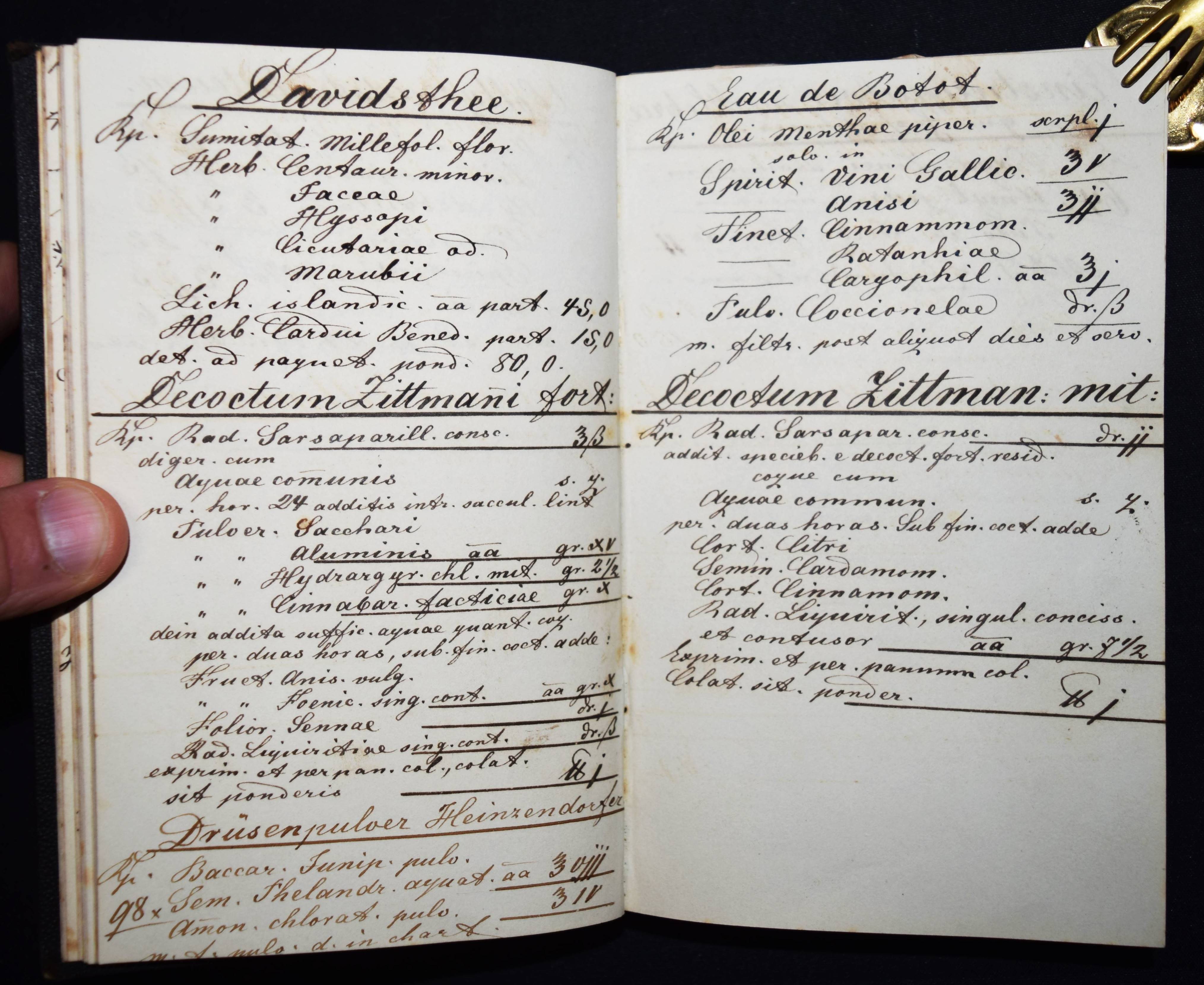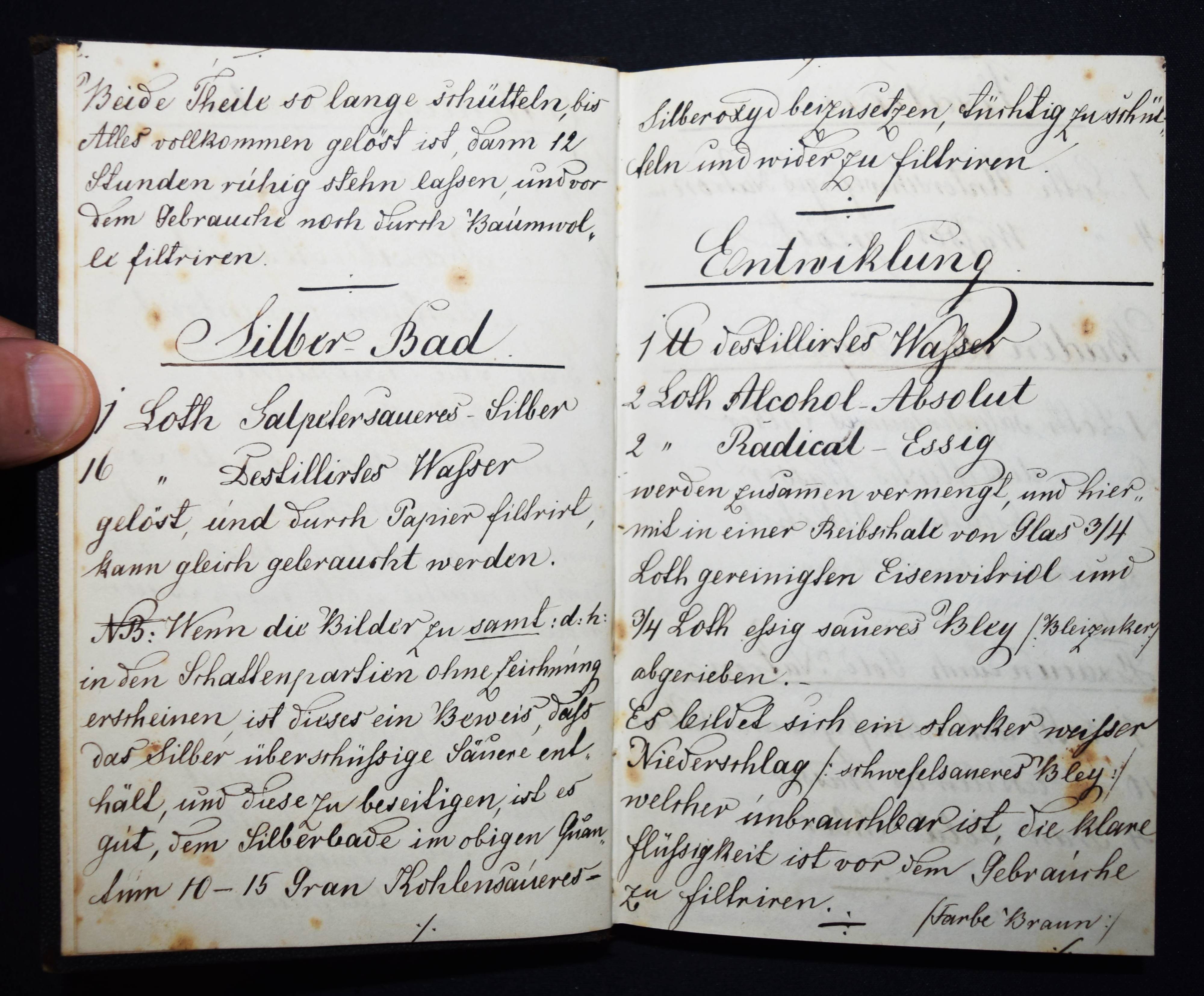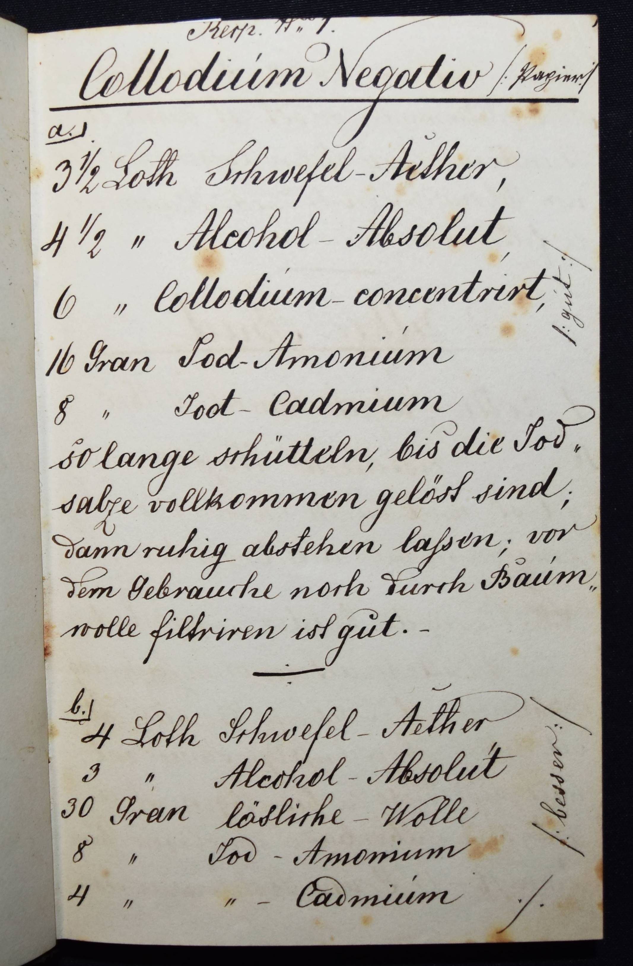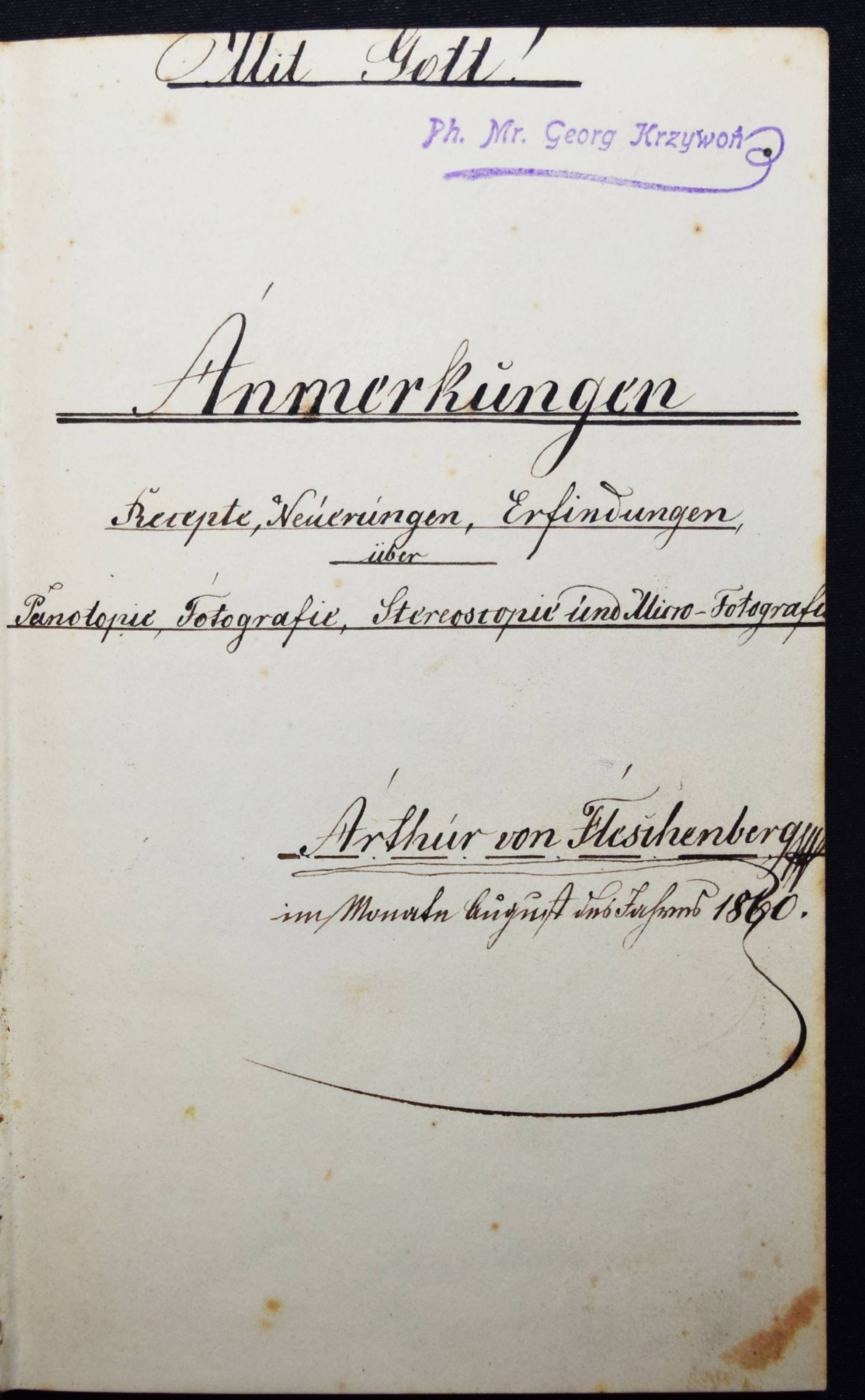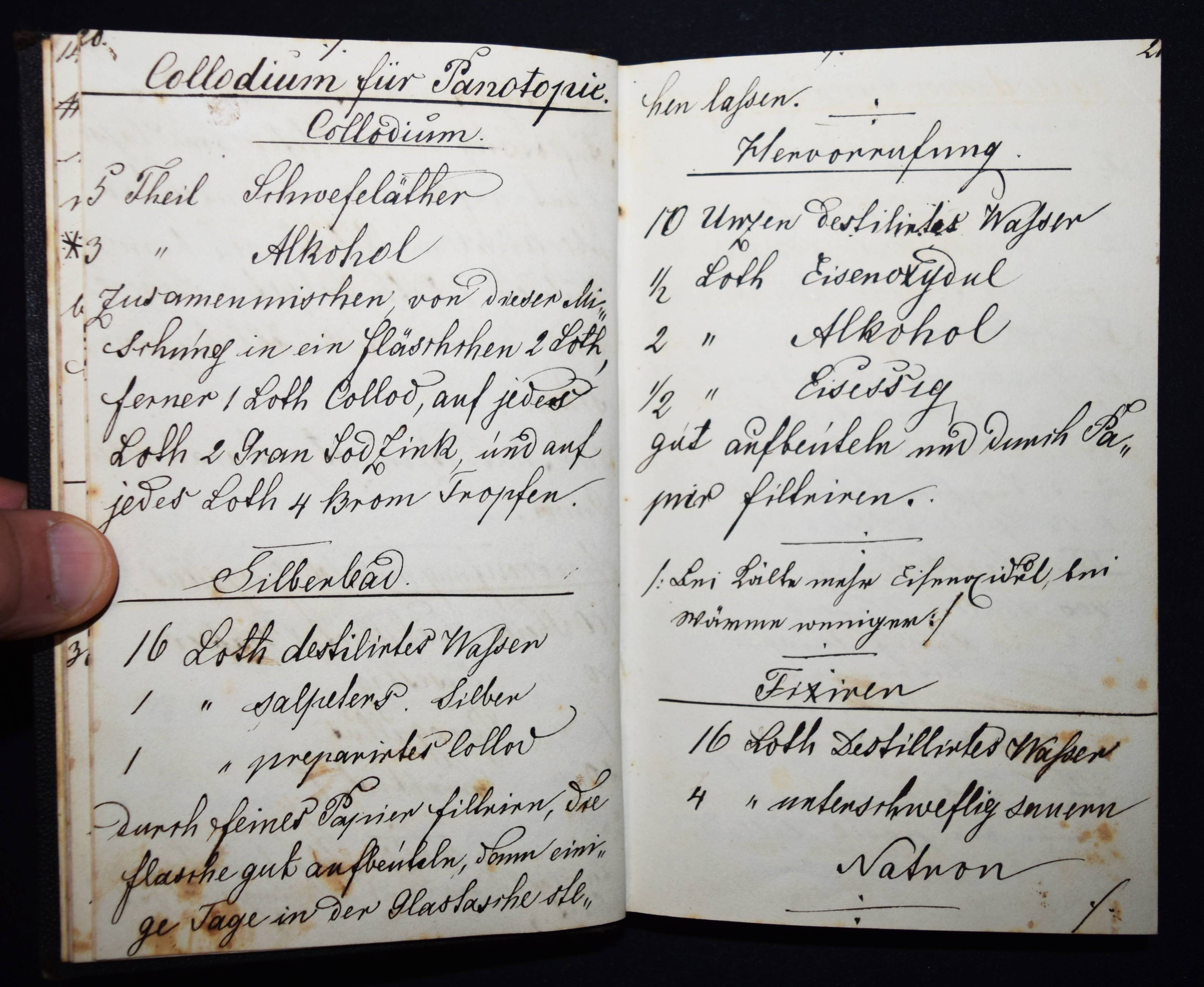 Fleschenberg, Arthur v. Anmerkungen. Recepte, Neuerungen, Erfindungen über Panotopie, Fotografie, Stereoscopie und Micro-Fotografie. Deutsche und lateinische Handschrift auf Papier. Ohne Ort (Wien ?) 1860. 8°. Titel, [27] beschriebene S. mit 2 kl. Zeichnungen und ca. 100 weitere teils beschriebene Blätter (meist mit Rezepten für Arzneimittel). Leinenband der Zeit mit Linienvergoldung. Interessantes frühes Rezeptbuch eines Amateur-Fotografen und Apothekers. – Mit Anleitungen und Rezepten: „Collodium Negativ“, „Silber-Bad“, „Entwicklung“, „Fixation“, „Gelatiren“, „Das Eiweißen der Bilder“, „Bereitung des Chlorgoldes (und) Chlor-Silbers“, „Panalopie. Glas und Leinwandbilder“, „Collodium für Panotopie“ etc. Der Verfasser gibt genaue Anweisungen, z. B. „Entwicklung. 1 Loth destilliertes Wasser, 2 Loth Alcohol-Absolut, 2 Loth Radical-Essig werden zusammen vermengt, und hier mit einer Reibsihale von Glas 3/4 Loth gereinigten Eisenvitriol und 3/4 Loth essig saures Bley, Bleizucker abgerieben…“ – Außerdem enthält das Buch noch zahlreiche pharmazeutische Rezepte: „Aqua Cologniens“, „Gallus-Tinte“, „Lac. Magnesiae“, „Pulver für Frau Hollaender“, „Prinzessen-Wasser“, „Keuchhusten-Pulver“ etc. – Stellenweise etwas braunfleckig, sonst sehr gut erhalten.