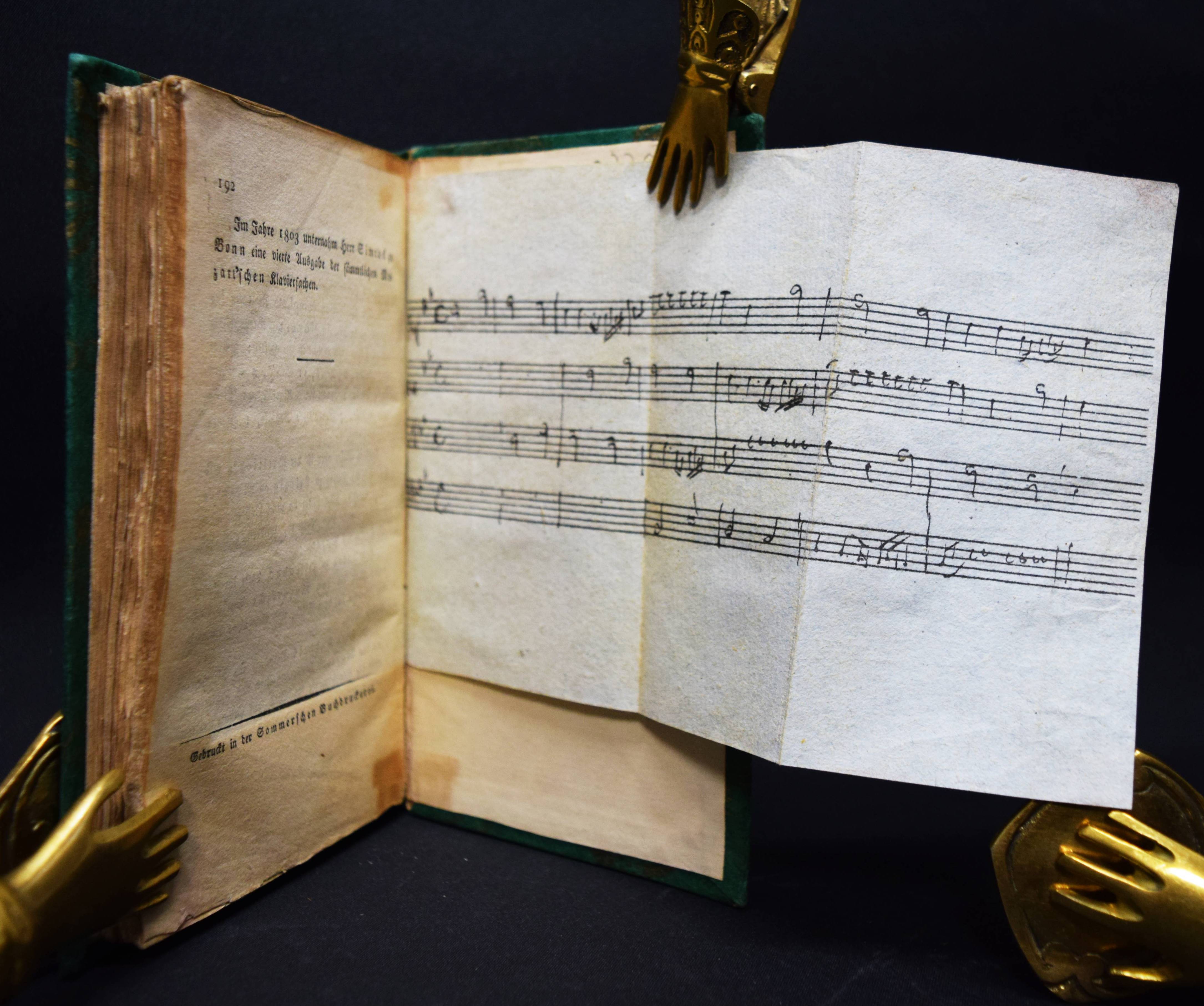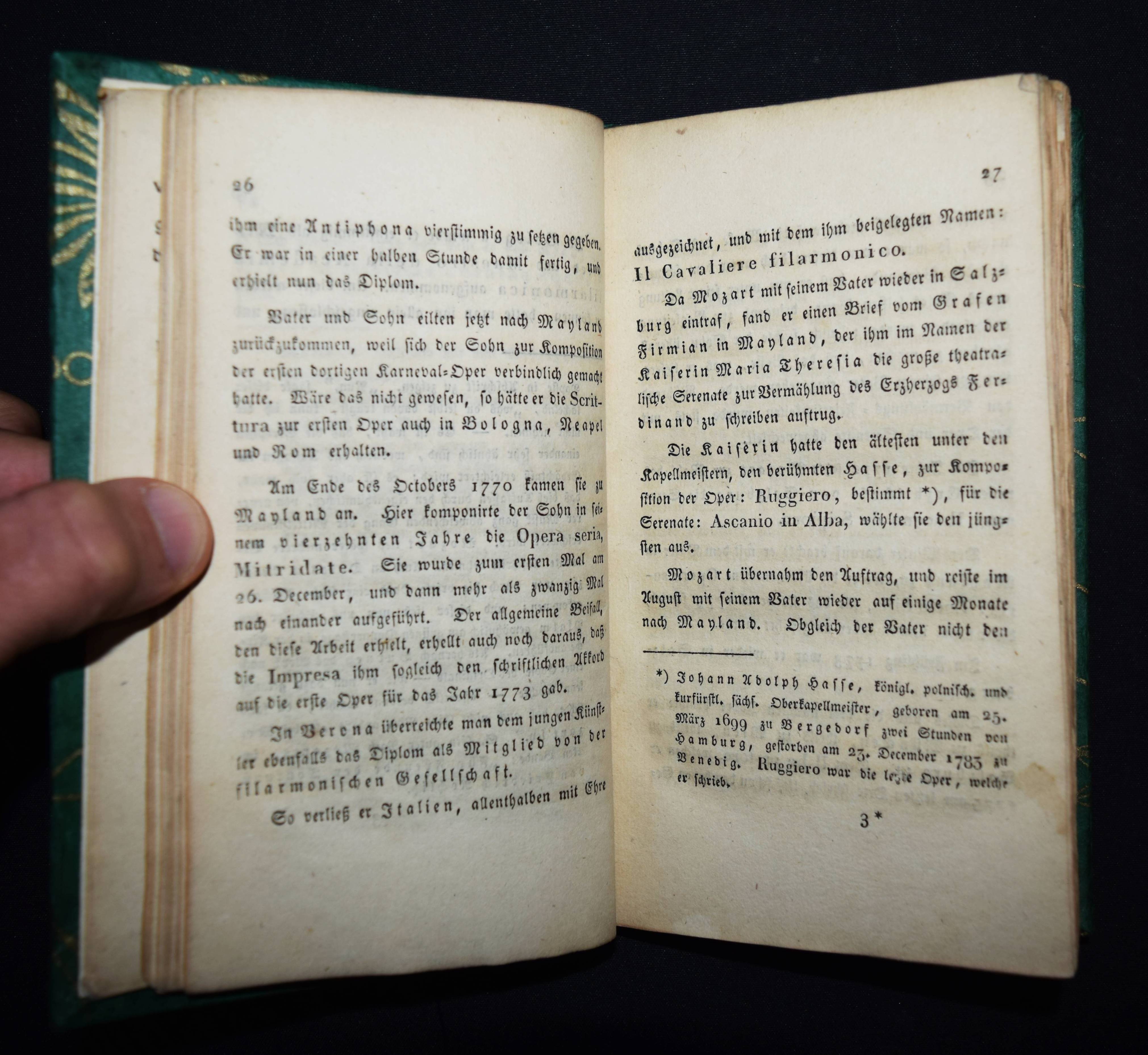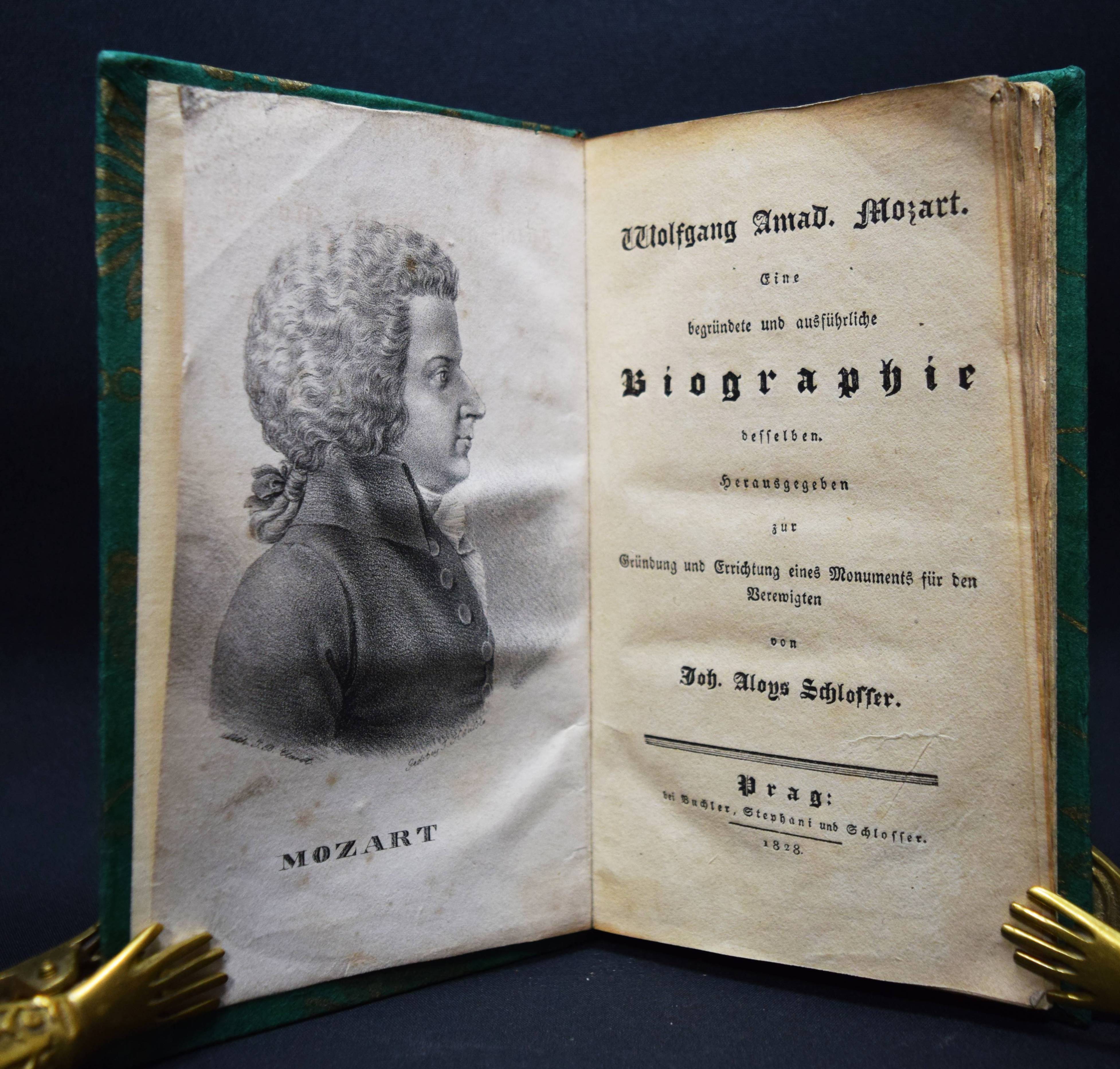 Mozart – Schlosser, Johann Aloys. Wolfgang Amad(eus) Mozart. Eine begründete und ausführliche Biographie desselben. Herausgegeben zur Gründung eines Monuments für den Verewigten. Prag, Buhler, Stephani und Schlosser 1828. Kl.-8°. VIII S., [2] Bl., 192 S. mit lithogr. Portrait-Frontispiz von J. Häussle nach J. B. Clarot und lithogr. gefalt. Noten-Faksimile. Pappband des 20. Jahrhundert mit floralem Gold-Brokatpapier. Eitner VII, 98. – Seltene erste Ausgabe. – Enthält den Erstdruck von Mozarts eigenem Werkverzeichnis und den Erstdruck des Kanons zu vier Stimmen in B-Dur (KV 562 a). – J. A. Schlosser (1785 ? – 1858) aus Lann (Böhmen), hat im selben Jahr auch die erste Biographie Beethovens herausgegeben und war Teilhaber des Prager Verlags. – Das Portrait etwas braunfleckig und durchgehend gleichmässig gebräunt, gutes Exemplar.
