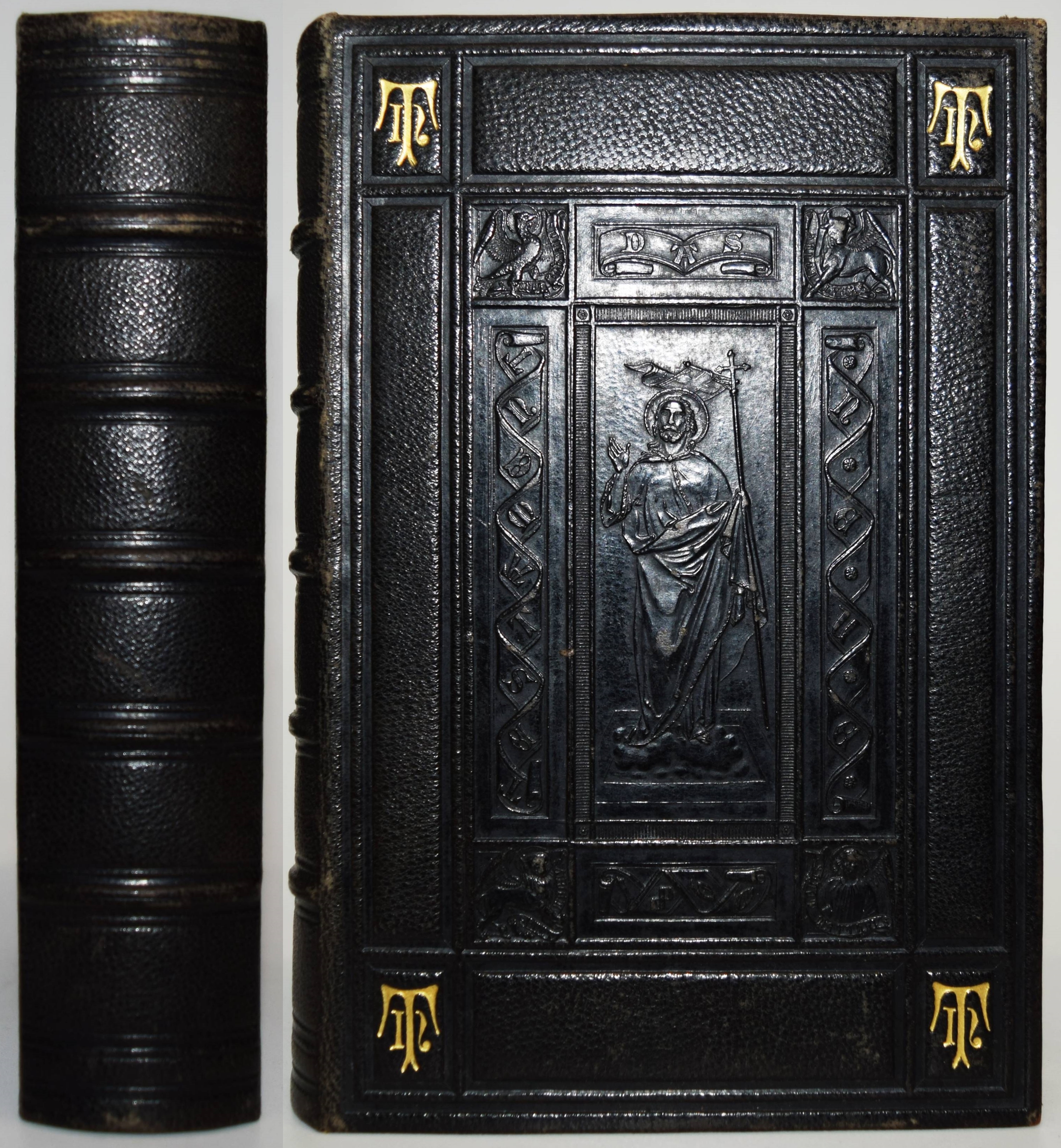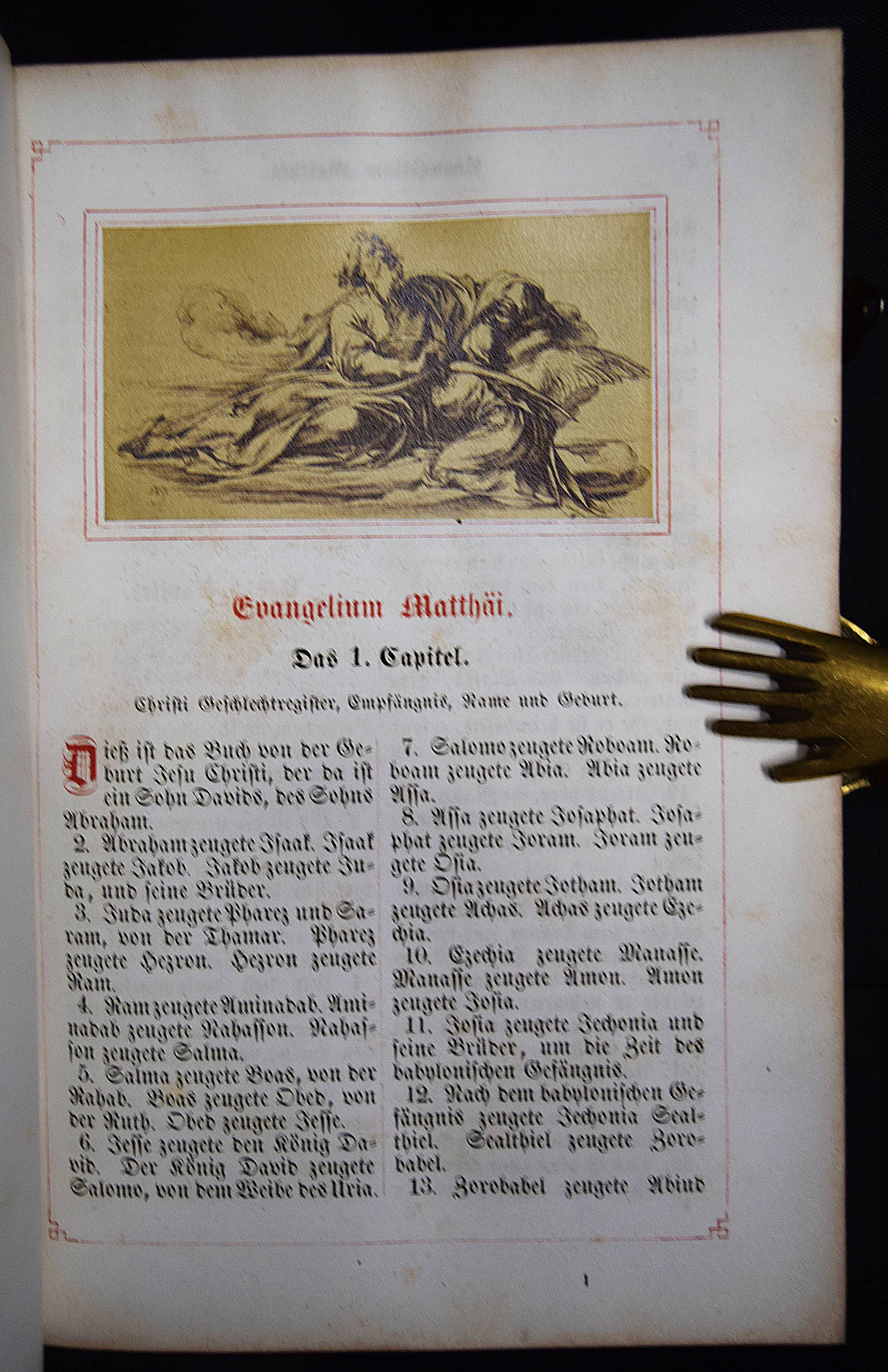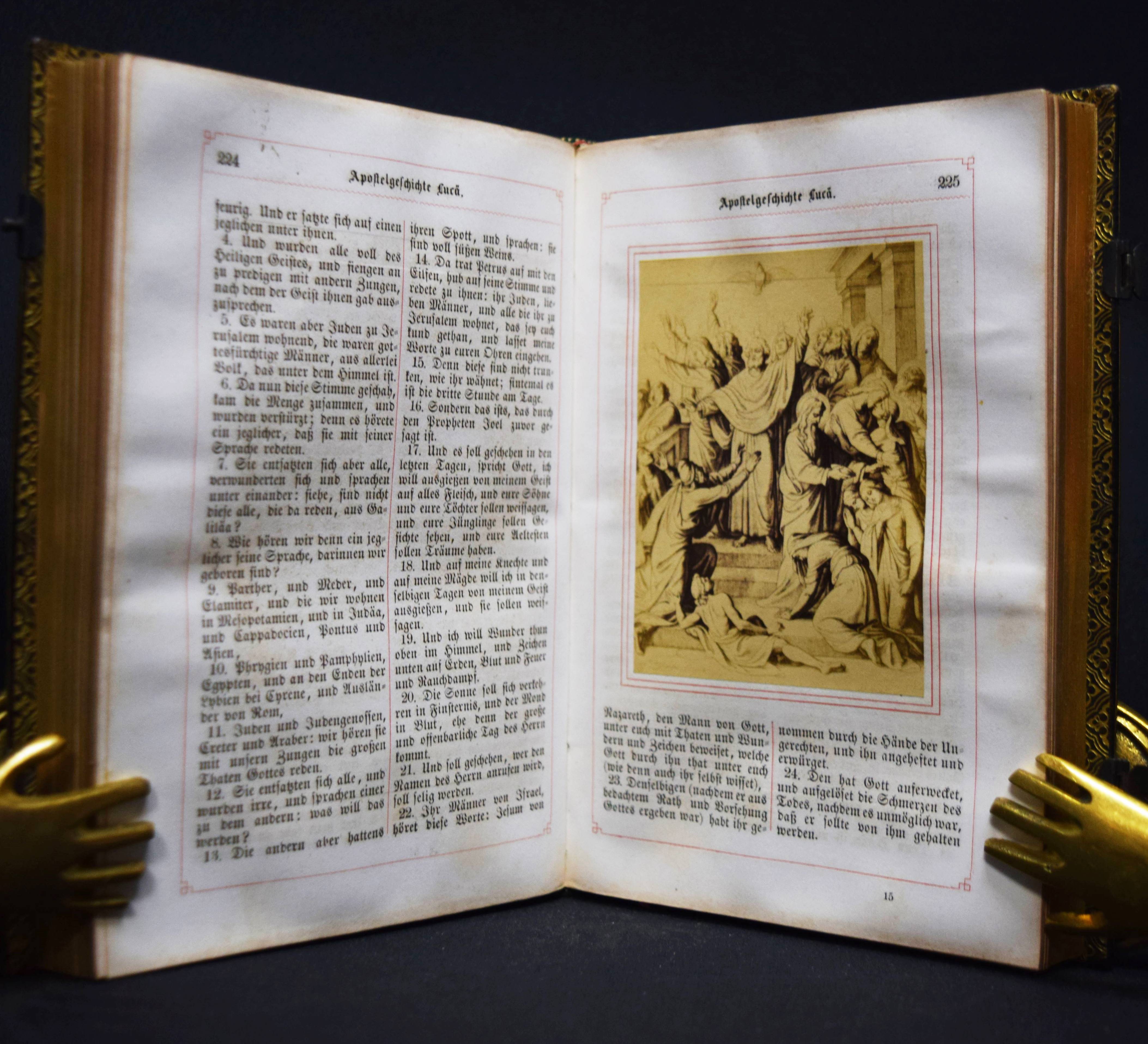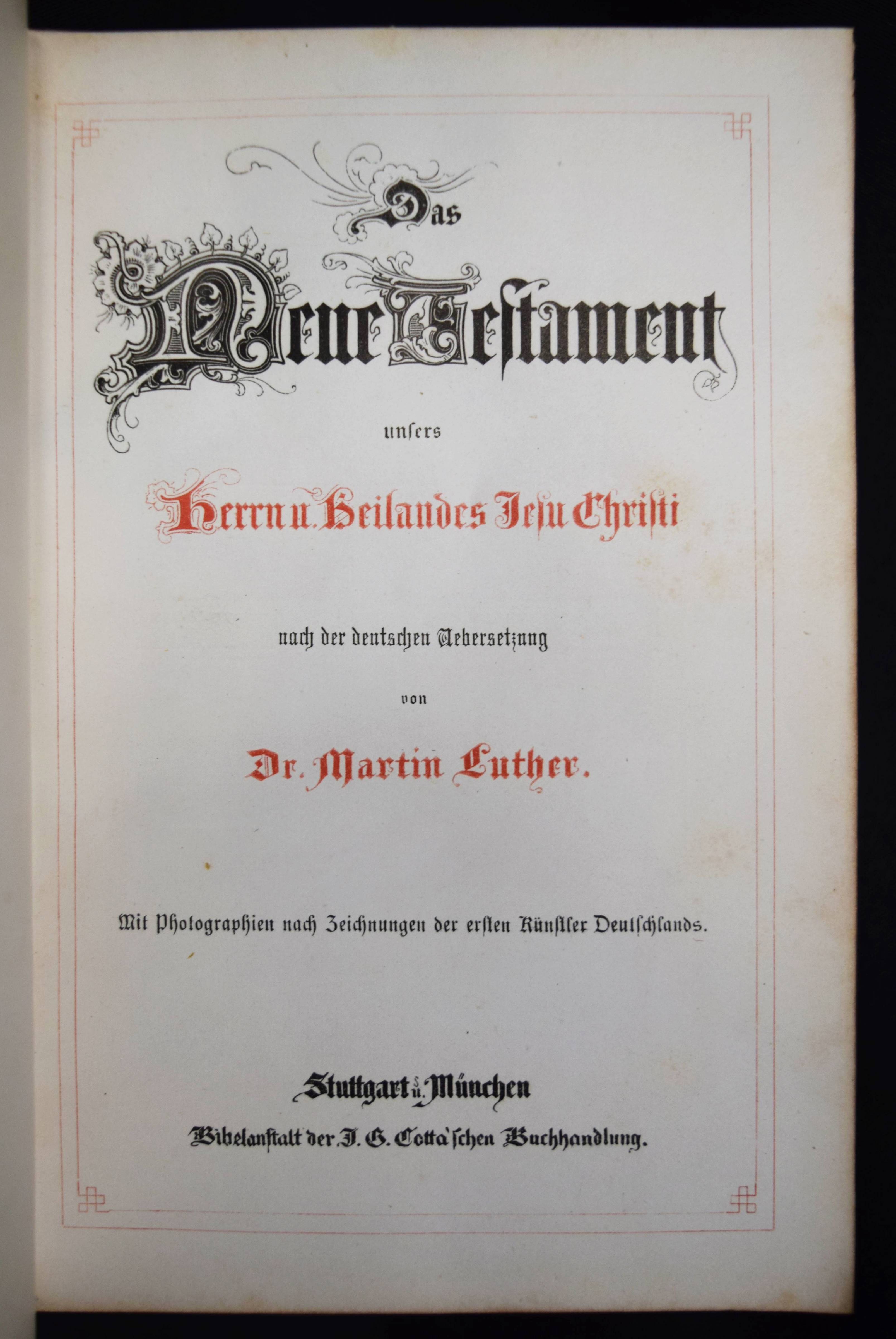 Albert – Luther, Martin (Übers.). Das Neue Testament unsers Herrn u. Heilandes Jesu Christi. Mit Photographien der ersten Künstler Deutschlands (u. a. Ludwig Richter, Rethel, Schnorr v. Carolsfeld, Strähuber und G. Jäger). Stuttgart u. München, Bibelanstalt der J. G. Cotta’schen Buchhandlung o. J. (1860). 8°. Titel in Rot und Schwarz, 484 S., [2] Bl. mit 44 (2 ganzs.) mont. Orig.-Photographien (Abuminabzüge, meist ca. 5,5 x 6 cm.) von Joseph Albert. Blindgepr. Chagrin-Ledereinband mit 8 goldgepr. Monogrammen „NT“ in den Ecken, Steh- und Innenkantenvergoldung und Goldschnitt. Heidtmann, Wie das Photo ins Buch kam 1444. – Die ersten deutschen Bibel-Illustrationen in Fotografie. 1869 erschien eine zweite Ausgabe, ergänzt mit „Der Psalter“ bei Brockhaus in Leipzig. 1850 erschien bei Cotta eine Quartausgabe mit den Illustrationen in Holzschnitten. J. Albert (1825-1886), seit 1858 Hofphotograph in München und „Meister der Reproduktionsphotographie“ (F. Heidtmann), stattete bereits 1859 eine Prachtausgabe von Schillers Gedichten für Cotta mit Fotografien aus. – „Kein anderer etablierter Verlag beschäftigte sich damals in nennenswertem Umfange mit der Illustration durch Photographien. Für dieses Gebiet entstanden vielmehr neue Verlage, wie die von Schauer, Bruckmann, Hanfstaengl und Albert. Cotta war illustrationstechnisch interessiert und pflegte auch ein wenig das schöne illustrierte Buch, er stand auch neuen technischen Entwicklungen auf dem Bereich der Buchherstellung aufgeschlossen gegenüber. Der riesige und enorm reiche Verlag hatte neben ‚Schöner Literatur‘ ein breites Programm mit Titeln aus allen Fachgebieten, so auch Medizin und Kunst. Was Cotta ¡m einzelnen bewog, die Photographie in so verschiedenen Fachgebieten einzusetzen und warum Cotra nicht weiter mit Photographien illustrierte Bücher herausgab, ist nicht bekannt. möglicherweise bestanden Zweifel hinsichtlich der Haltbarkeit der Photographien, ein damals viel diskutiertes Thema, obwohl es mit Albert als Fachmann sicher keinen Grund für diese Befürchtungen gab. Oder aber die (zu) teuren Bände waren einfach kein Geschäft“ (F. Heidtmann S. 83). – Stellenweise etwas braunfleckig, sehr gutes Exemplar.