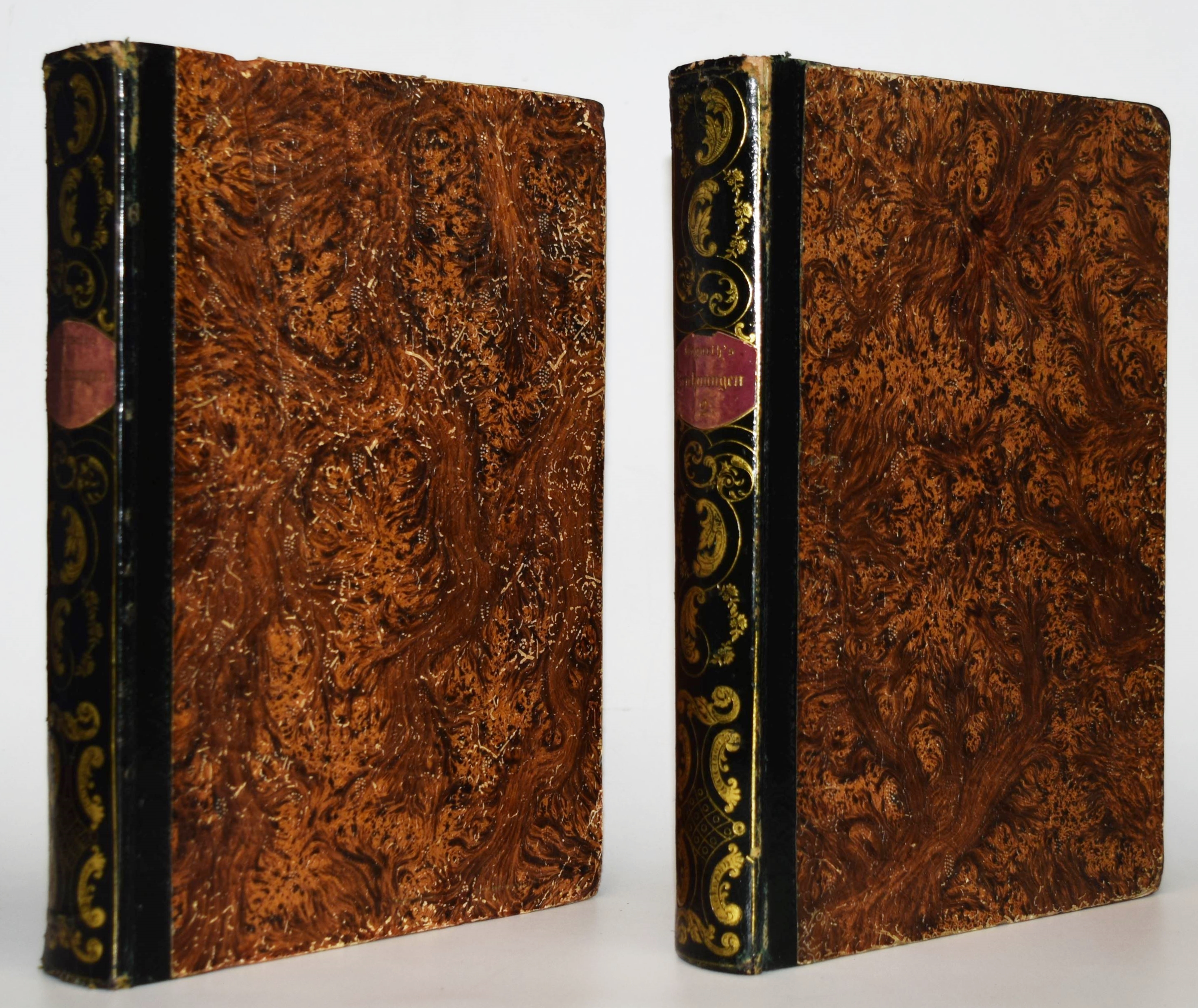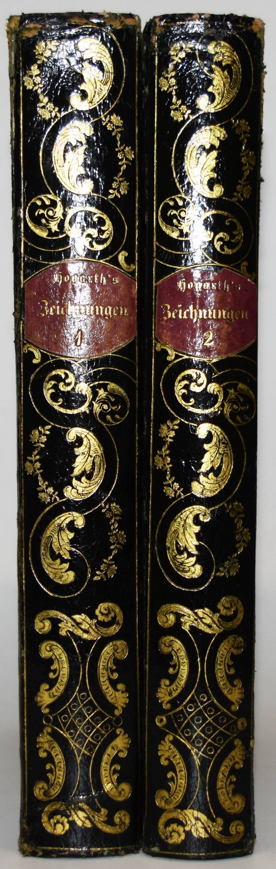 Hogarth – Lichtenberg, G(eorg) C(hristoph). W(illiam) Hogarth’s Zeichnungen. Nach den Originalen in Stahl gestochen. Mit der vollständigen Erklärung derselben herausgegeben und fortgesetzt von Franz Kottenkamp. 2 Bände. Stuttgart, Literatur-Comptoir 1840. Gr.-8°. [2] Bl., XXIV, 591 S.; [4] Bl., S. 592-994 mit 92 Stahlstich-Tafeln. Schwarze Halblederbände der Zeit mit goldgepr. Rückenschildern und Romantikervergoldung. Goedeke IV/1, 639, 7. Jung, Lichtenberg-Bibl. 2141. Graesse III, 316. – Erste Ausgabe dieser Zusammenstellung und mit der Lebensgeschichte Hogarth’s von F. Kottenkamp. – Erste Neuausgabe der satirischen Zeichnungen Hogarths, welche den moralischen Verfall seiner Zeit am Beispiel der sogenannten „High Society“ Englands zeigen sollen (Wahlbetrug, Trunksucht, geistiger Verfall etc.). – Gelenke oben leicht angeplatzt und etwas berieben, Stempel auf dem Vorsatz, im Text stellenweise etwas braunfleckig, die Tafeln im Rand teils etwas fingerfleckig, sehr gutes Exemplar in einem dekorativen zeitgenössischen Einband.