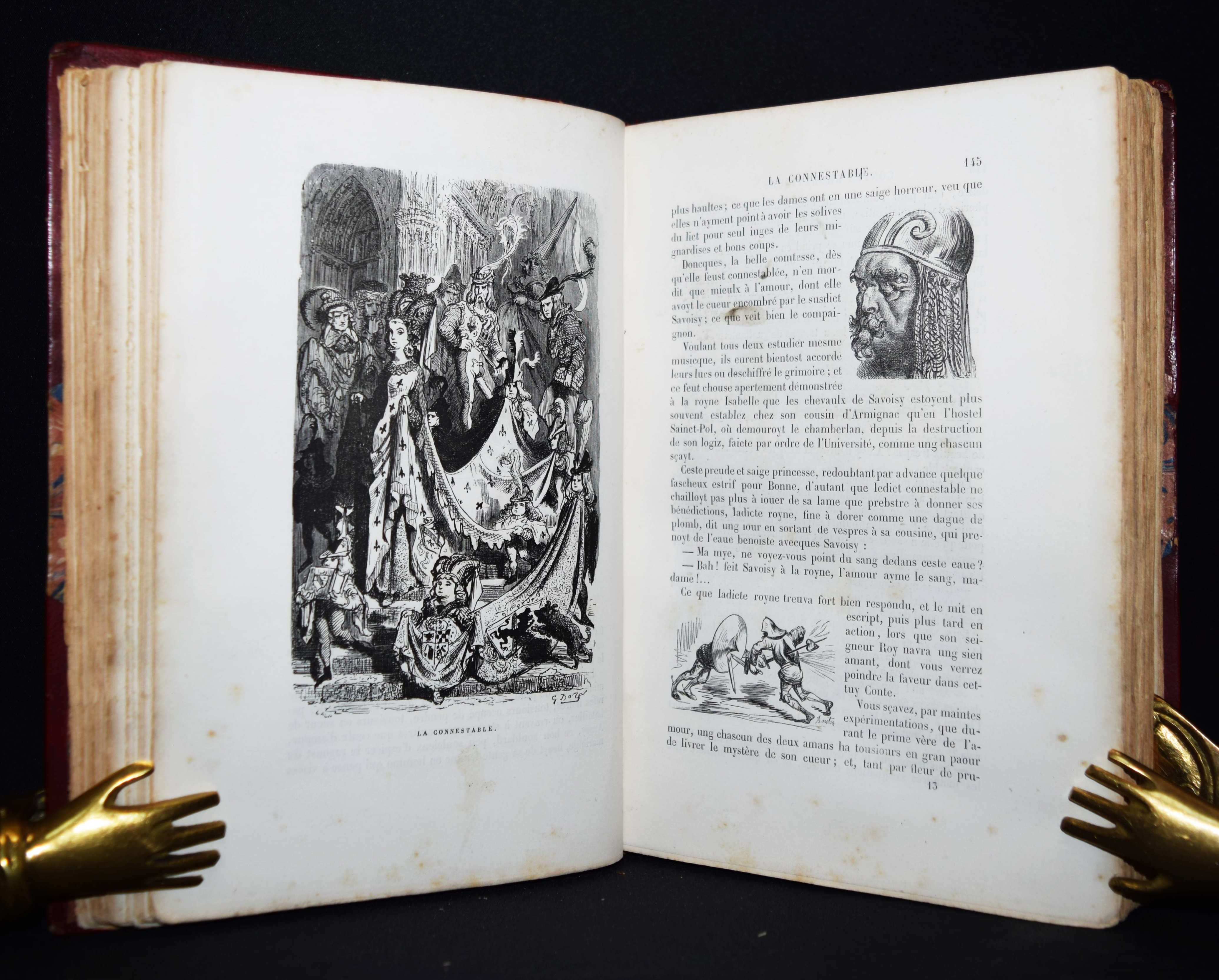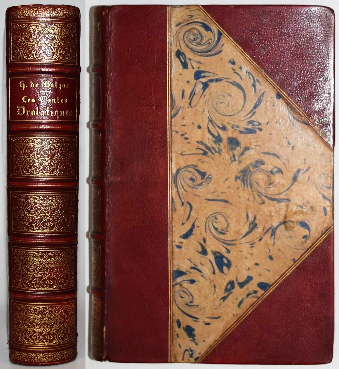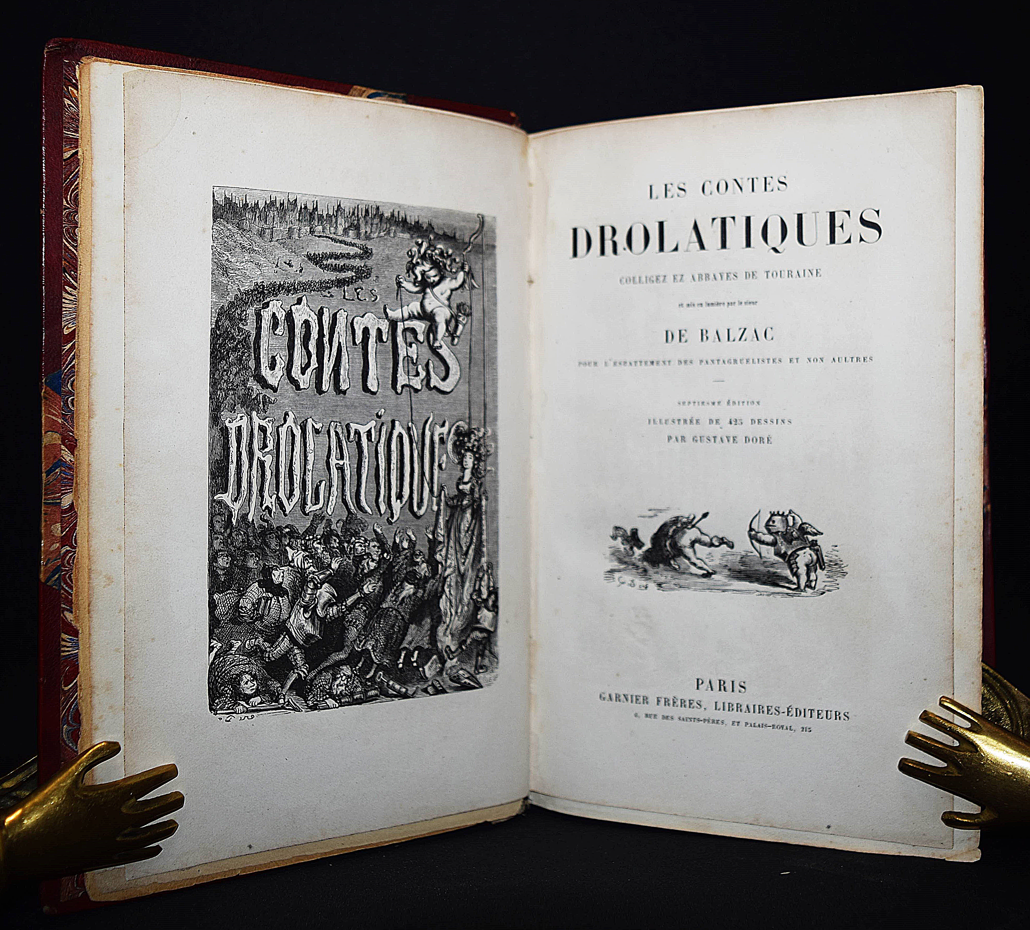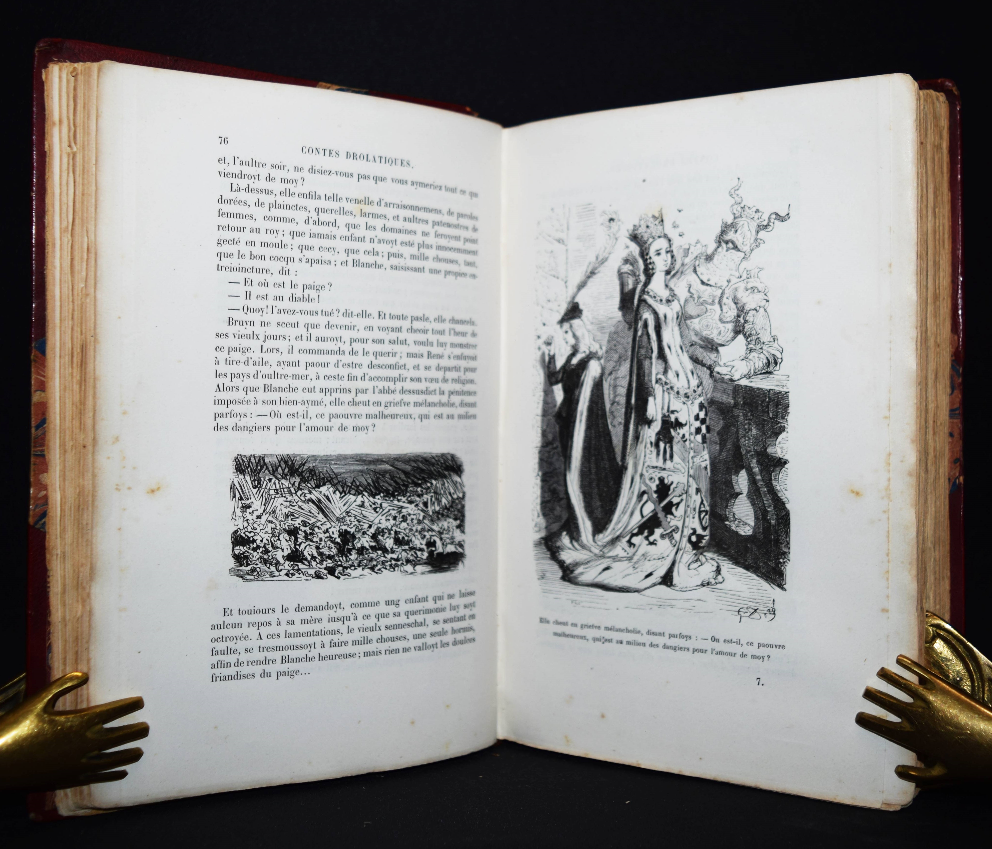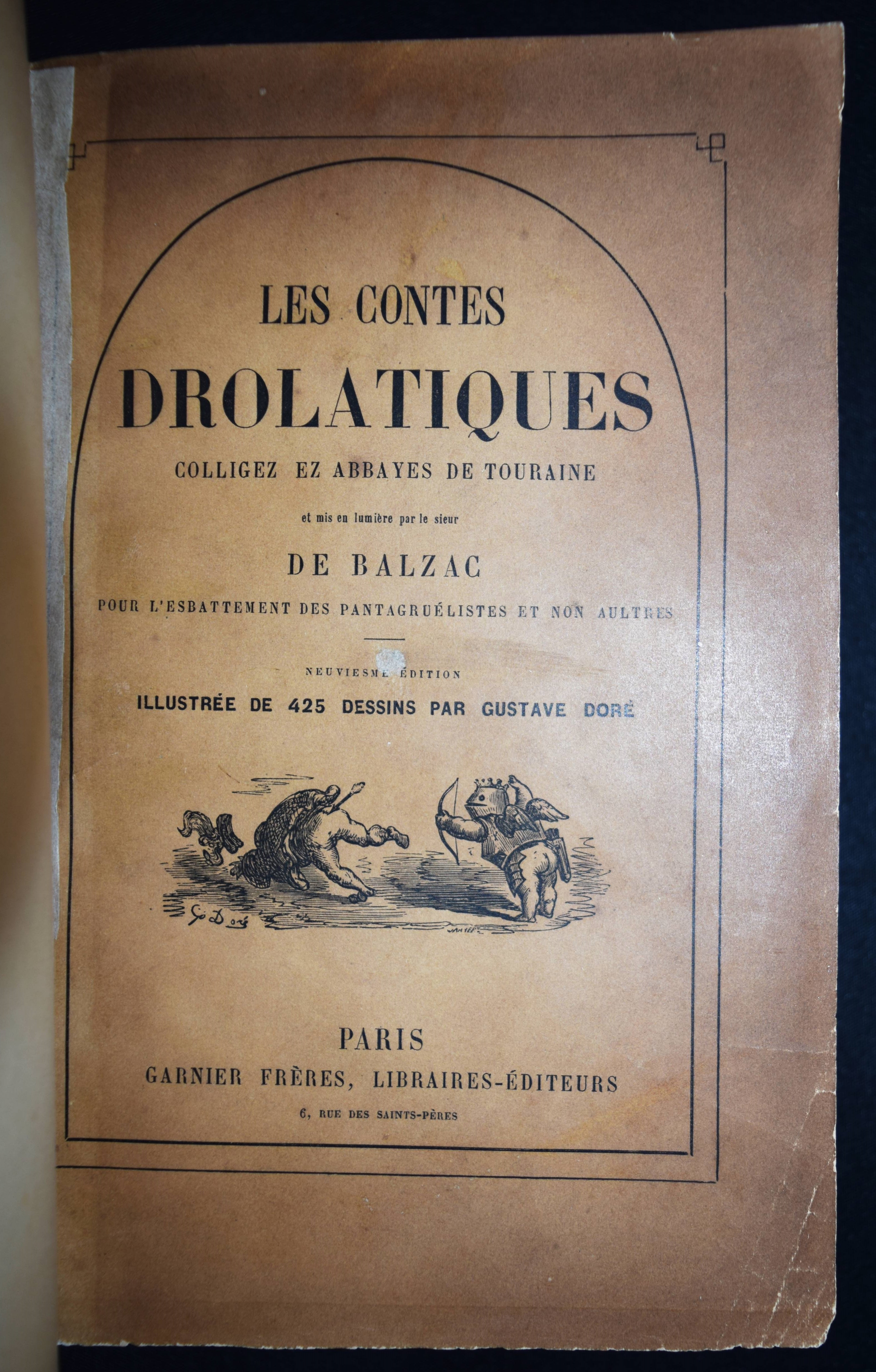 Balzac, Honoré de. Les contes drôlatiques. Colliges ez abbayes de Touraine. Septièsme édition illustrée de 425 dessins par Gustave Doré. Paris, Garnier Frères s. d. (1873). Gr-8°. XXXI, 614 S., [1] Bl. mit 425 teils ganzs. Holzstich-Illustrationen. Weinroter Halblederband der Zeit mit goldgepr. Rückentitel und reicher Rückenvergoldung. (Oeuvres illustrées de H. de Balzac). Brivois 32. Carteret III, 48 ff. Leblanc 43. Vicaire I, 190 f. – „Cette illustration est à nulle autre semblable par sa puissante originalité: elle est gauloise, rabelaisienne, et pétillante d’esprit. un des ouvrages de Doré les plus recherchés“ (Leblanc). – „Si de tous les ouvrages par Gustave Doré, il ne devait en rester qu’un, ce serat celui-là: l’illustration est à la hauteur du texte, et ce n’est pas peu dire, puisque Balzac considérait les ‚Contes drôlatiques‘ comme son chef-d’oeuvre“ (Brivois). – Durchgehend etwas braunfleckig, gutes dekorativ gebundenes Exemplar.
