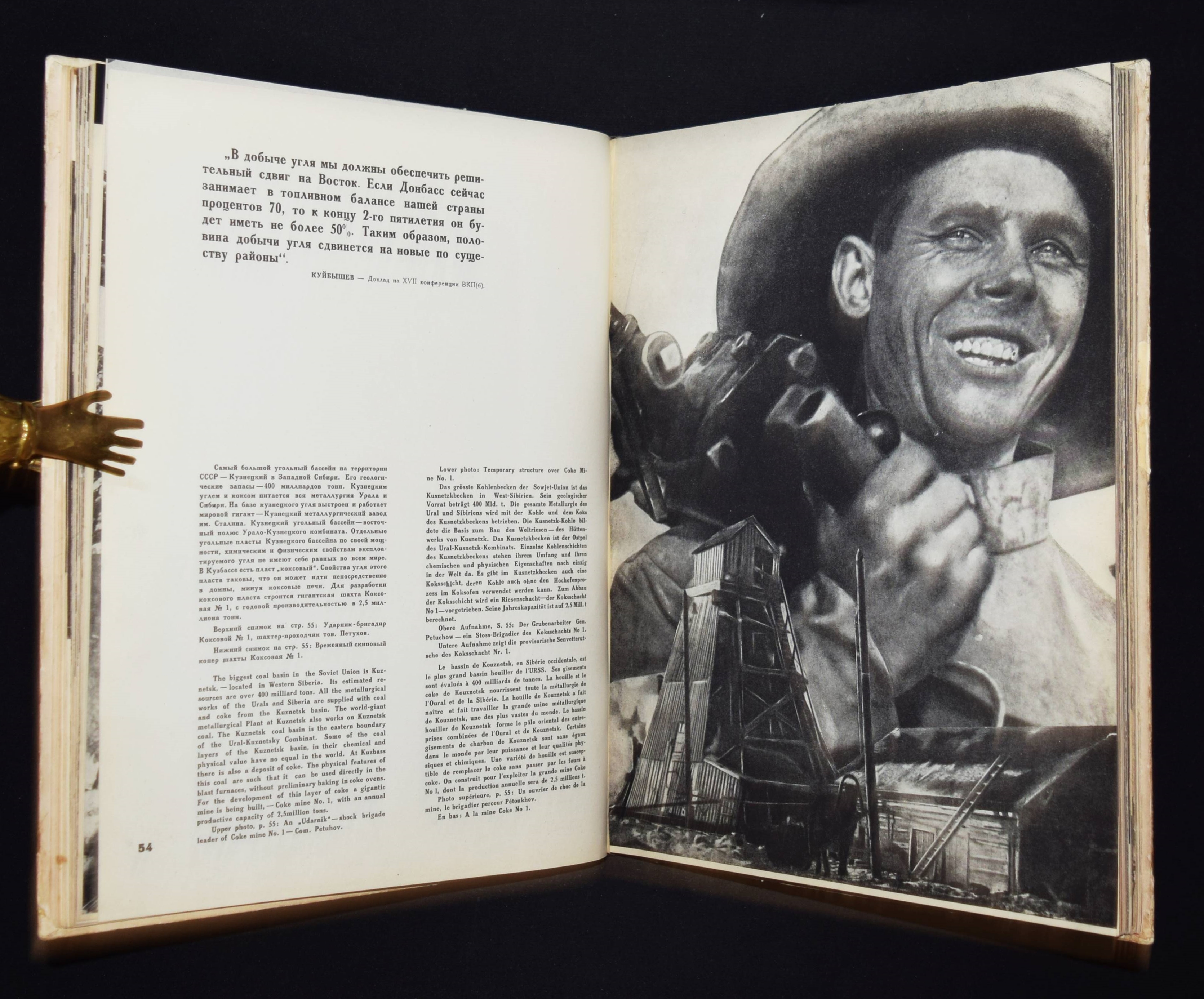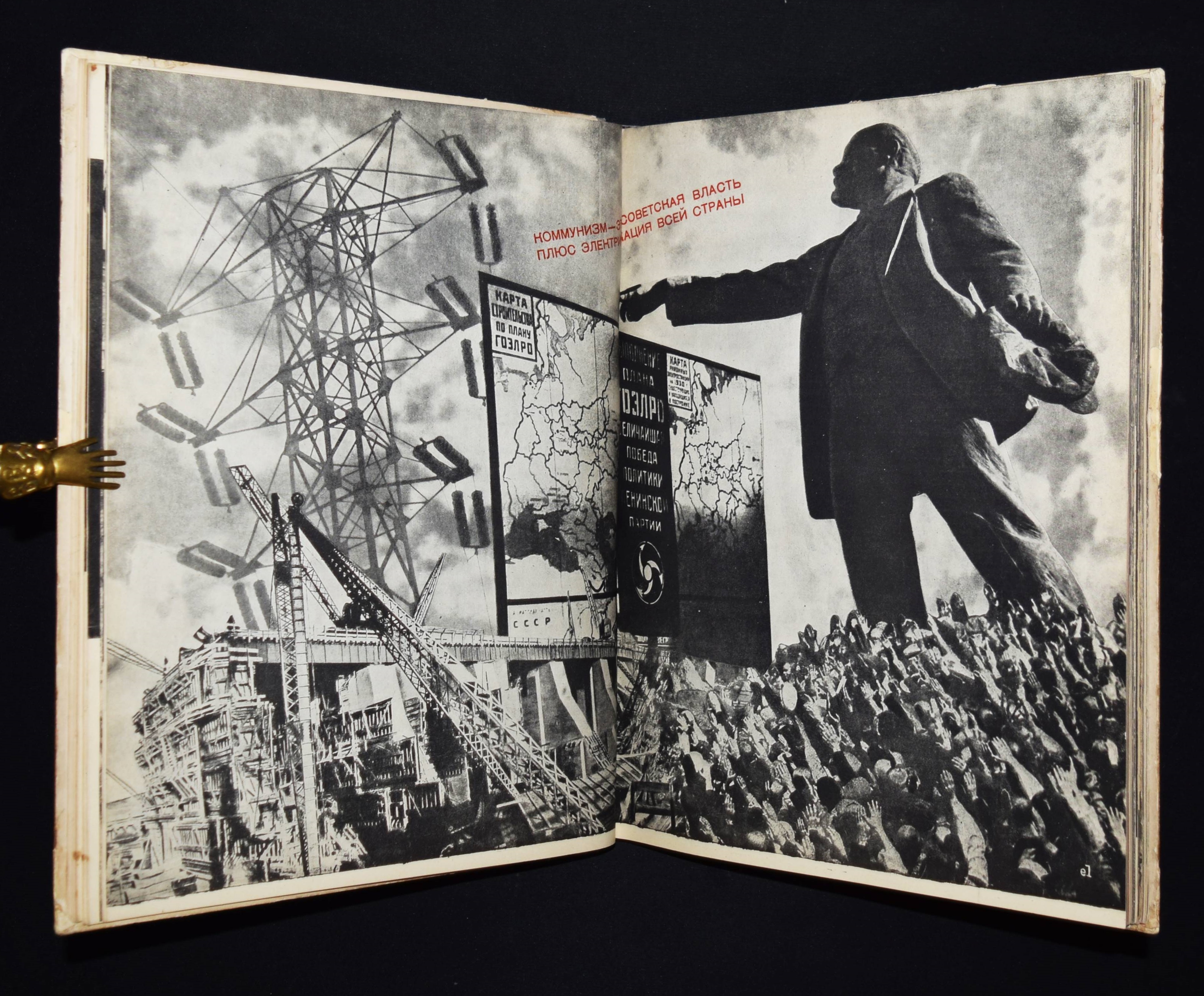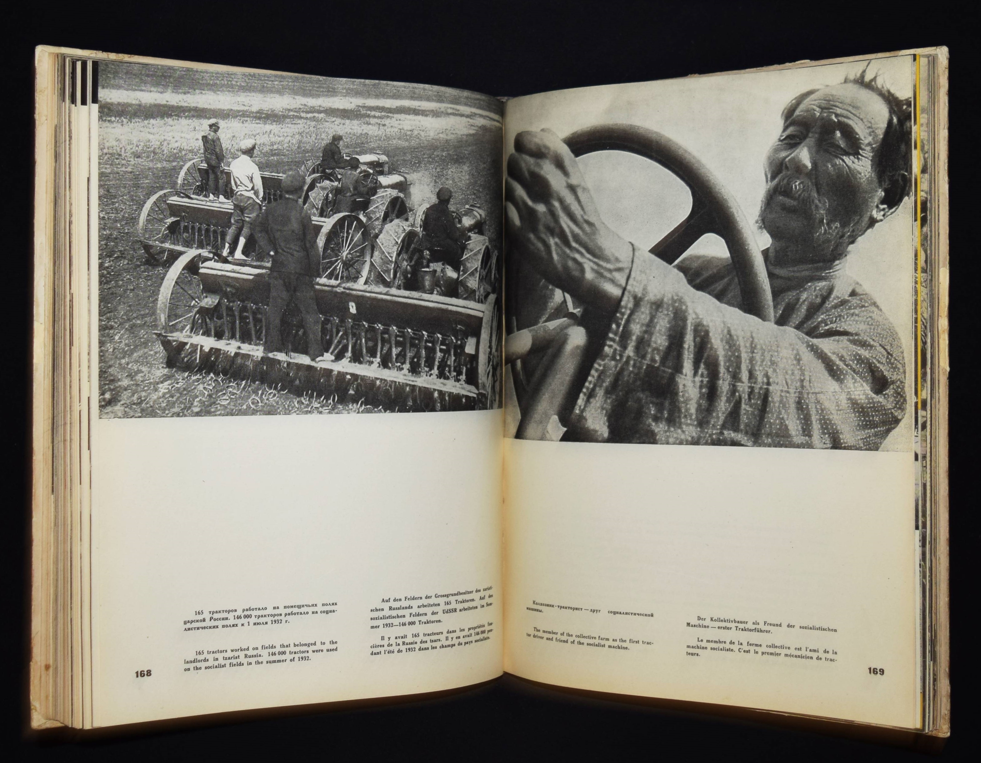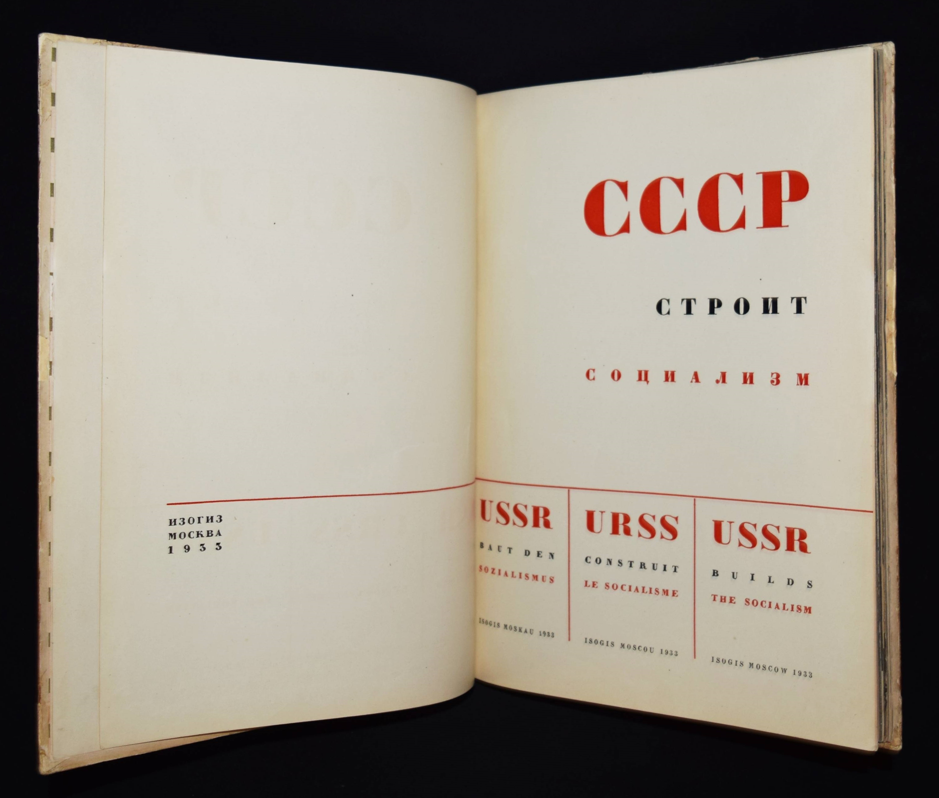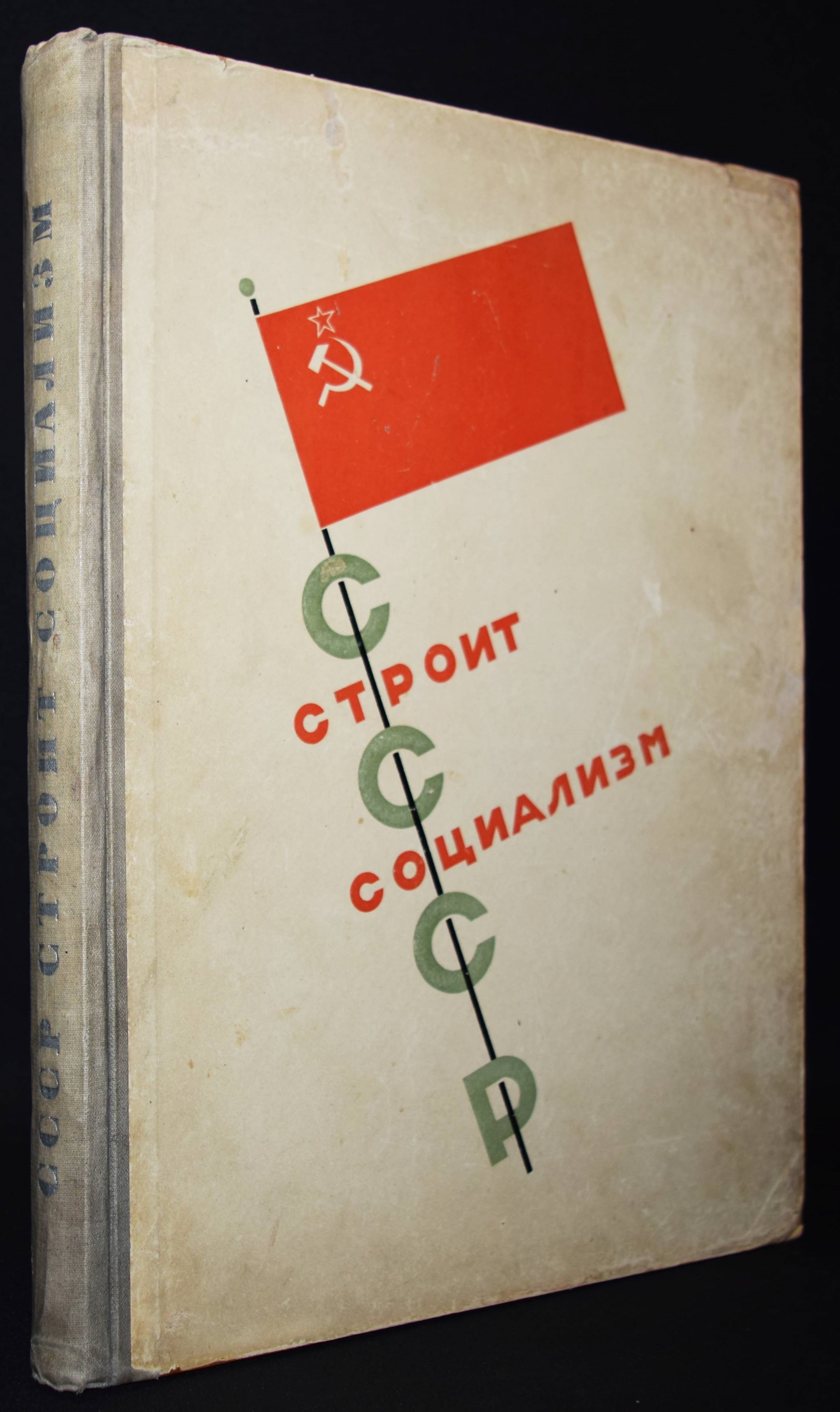 Lissitzky, El (Book-Design). SSSR stroit Sotsializm. USSR baut den Sozialismus. – URSS construit le Socialisme. – USSR builds the Socialism. (Technical Editer: Alexander Brodsky). Moscow, IZOGIZ (printed by Ivan Fiodorov, Leningrad) 1933. Folio (34,5 x 26 cm.). XXVI, 284, (2) S. mit 2 Portrait-Tafeln und teils ganz- und doppelseitigen Abbildungen nach Fotografien und Foto-Montagen. Orig.-Halbleinenband mit silbergepr. Rückentitel, soviet. Flagge und zweifarb. Titel auf dem Vorderdeckel. Heiting/Karasik 190 ff. – Einzige Ausgabe des wichtigen Propaganda-Albums. – „The year 1933 saw the publication of El Lissitzky’s first propaganda album – The USSR Is Building Sociaism, a visual chronicle, a pictorial report on the results of the first Five-Year Plan, an account of victories in the main fields of Socialist construction. The book opens with the text of Stalin’s reporton „The Results of the First Five-Year Plan” on pages VII-XVI (numbered with Roman numerals). In 1933 dozens of books were printed with this title. Three of them were designed by Varvara Stepanova, Solomon Telingater and Boris Titov. In this book there follow (on pages numbered from 1 with Arabic numerals) sections devoted to achievements in the leading branches of industry – mining, heavy industry, machine-building, ag riculture, and the main spheres of life – health services, culture, sport. The technical details about the publication are reduced to a minimum and placed at the start, on the reverse side of the endpaper. There is some interesting information „From the publishing house“: „The textual material and figures end with the editing of August 1932“ – the book was sent for setting in May and went to press in September 1932, so the data included were very much up-to-date. In 1933 statistics, like photography, still reflected the real state of affairs. By 1937 the situation had changed – figures became one of the elements of propaganda, while photography was stripped of the specifics of time and place. … The USSR Is Building Socialism is one of El Lissitzky’s first successful book projects in collaboratio n with IZOGIZ. From 1932 to May 1941 he was actively involved in the creation of the magazine USSR in Construction [SSSR na stroike] that was published by IZOGIZ. As one of the leading artist-designers, he prepared 19 issues and to a large extent determined the look of the magazine. The album The USSR Is Building Socialism is a sort of digest of the first issues of the magazine and includes a large proportion of photographs that had already been published. Many pictures became raw material for photomontages. The montage principle of presenting photographs practically supplanted individual shots: they are nearly all “knocked together“ in pairs along one edge, forming new compositions. The most original are the compositions on the double-page spreads. In them Lissitzky reveals himself to be a master of the photo-projection method of photomontage. The montage principle for the presentation of the material excludes the need to attribute the photographs, but many of them are recognizable. The photographs of Dneprostuoi, also published in USSR in Construction, were the work of Max Alpert, with whom Lissitzky made a special trip to the site of the hydro-electric project; the shots of the Donbas by Yeleazar Langman; those of the Magnitogorsk complex by Anatoly Skurikhin; those of Kuznetskstroi by Pavel Zhukov, Mikhail Kalashnikov and M. Prigozhin. The album ends with a photograph of a military man, one of the heroes of the skiing trek in a Budionny cap and greatcoat dusted with snow – this image, popular with the magazines of th e period, was the work of Arkady Shaikhet. It is a curious fact that while he continued to practice photography in the 1930s, when it had lost its experimental character, Lissitzky in contrast to Rodchenko hardly ever used his own pictures in books. The construction of the album is founded upon the magazine principle – a compilation of issues. The development of the visual blocks is accentuated by the double-page photomontages printed in two colours, black and red. The introduction of short slogan-like texts into the photomontages make these pages look like posters“ (M. Karasik). – Deckel etwas angestaubt und leicht fleckig, nur vereinzelt um Blattrand geringfügig braunfleckig, sehr gutes Exemplar.