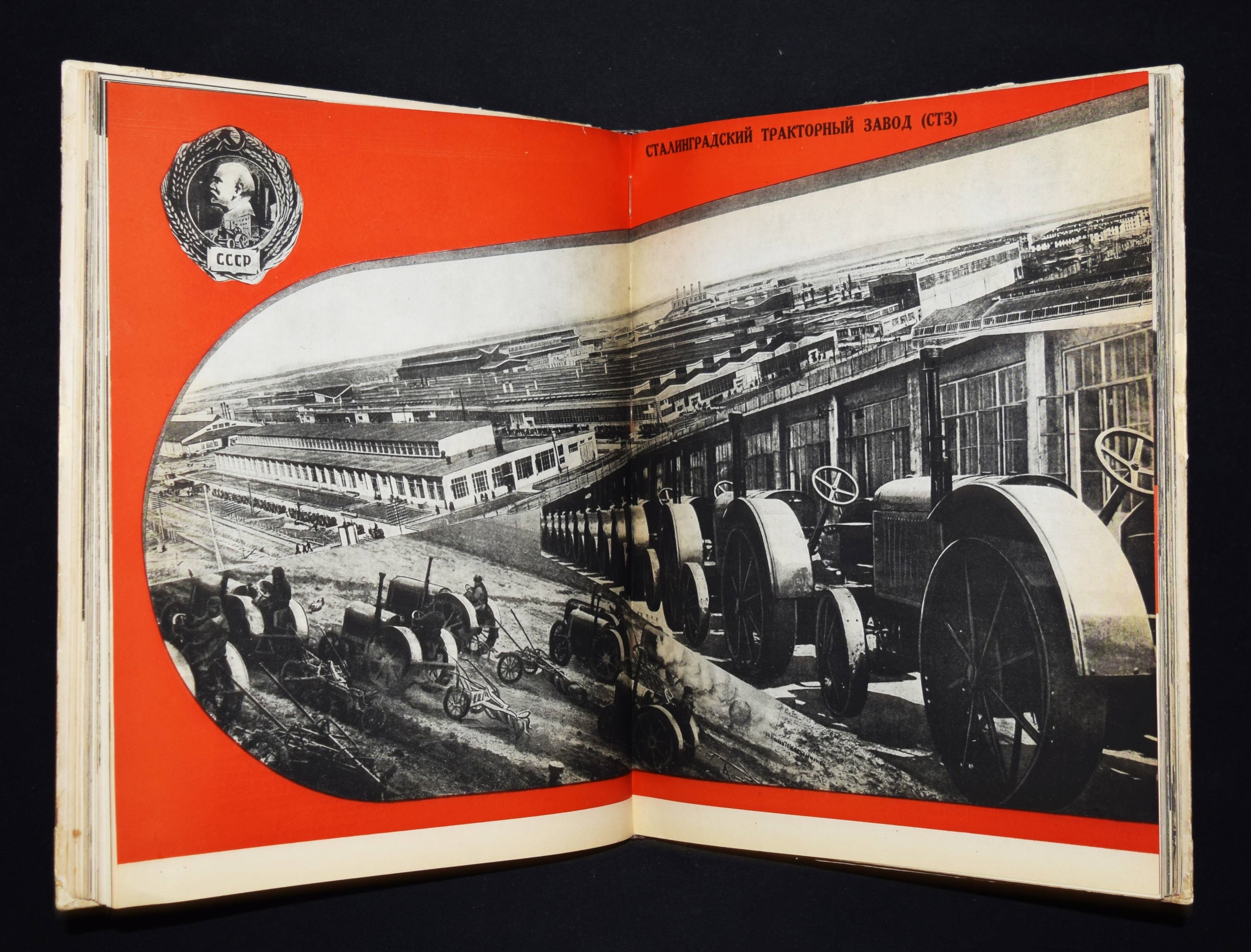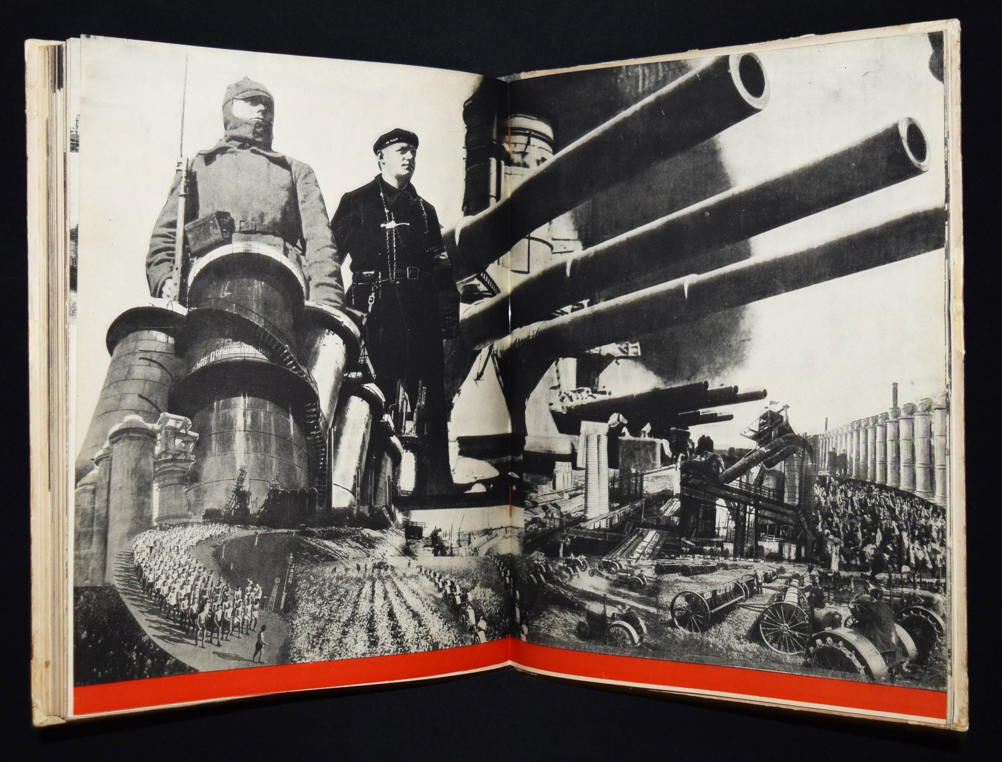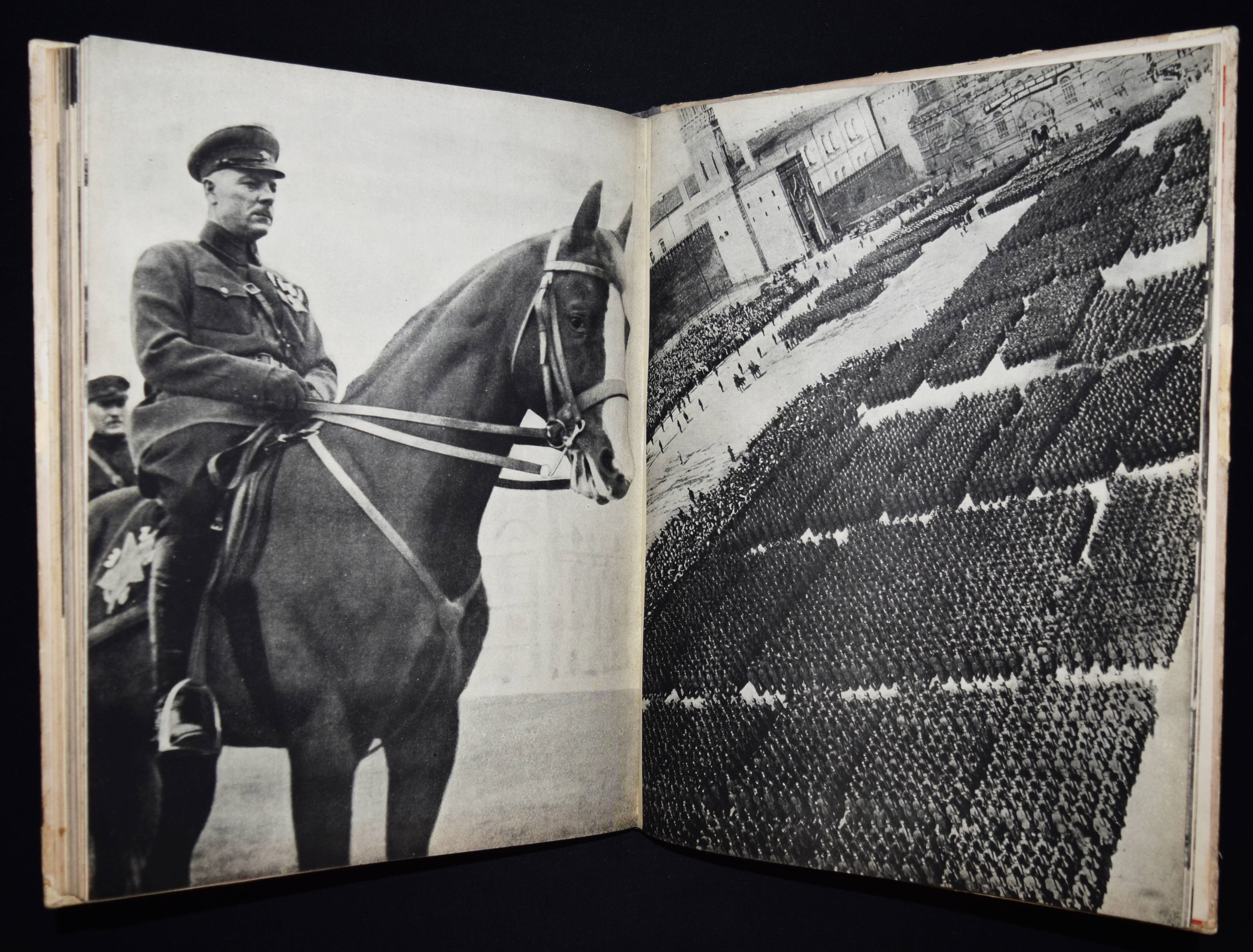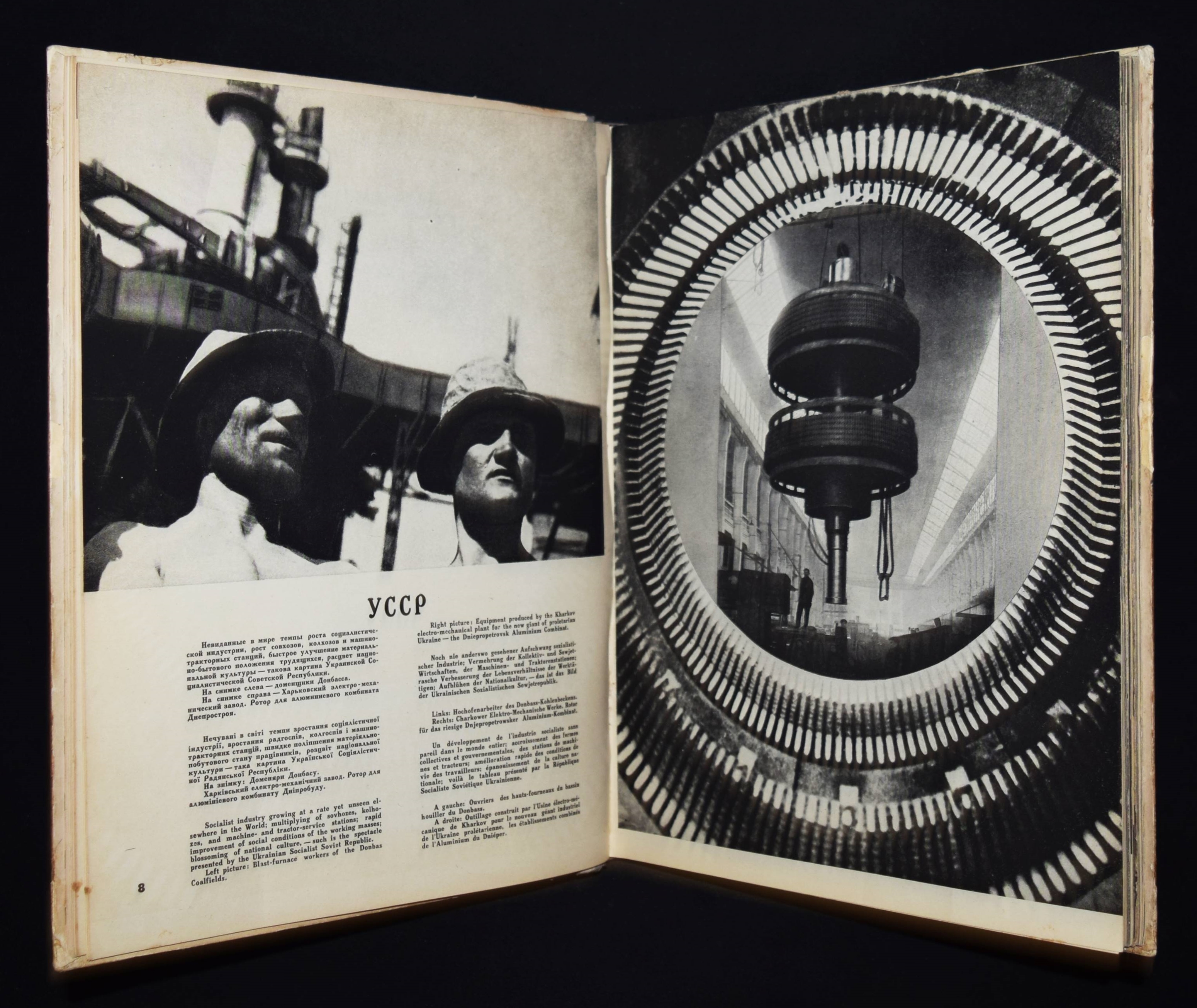 Lissitzky, El (Book-Design). SSSR stroit Sotsializm. USSR baut den Sozialismus. – URSS construit le Socialisme. – USSR builds the Socialism. (Technical Editer: Alexander Brodsky). Moscow, IZOGIZ (printed by Ivan Fiodorov, Leningrad) 1933. Folio (34,5 x 26 cm.). XXVI, 284, (2) S. mit 2 Portrait-Tafeln und teils ganz- und doppelseitigen Abbildungen nach Fotografien und Foto-Montagen. Orig.-Halbleinenband mit silbergepr. Rückentitel, soviet. Flagge und zweifarb. Titel auf dem Vorderdeckel. Heiting/Karasik 190 ff. – Einzige Ausgabe des wichtigen Propaganda-Albums. – „The year 1933 saw the publication of El Lissitzky’s first propaganda album – The USSR Is Building Sociaism, a visual chronicle, a pictorial report on the results of the first Five-Year Plan, an account of victories in the main fields of Socialist construction. The book opens with the text of Stalin’s reporton „The Results of the First Five-Year Plan” on pages VII-XVI (numbered with Roman numerals). In 1933 dozens of books were printed with this title. Three of them were designed by Varvara Stepanova, Solomon Telingater and Boris Titov. In this book there follow (on pages numbered from 1 with Arabic numerals) sections devoted to achievements in the leading branches of industry – mining, heavy industry, machine-building, ag riculture, and the main spheres of life – health services, culture, sport. The technical details about the publication are reduced to a minimum and placed at the start, on the reverse side of the endpaper. There is some interesting information „From the publishing house“: „The textual material and figures end with the editing of August 1932“ – the book was sent for setting in May and went to press in September 1932, so the data included were very much up-to-date. In 1933 statistics, like photography, still reflected the real state of affairs. By 1937 the situation had changed – figures became one of the elements of propaganda, while photography was stripped of the specifics of time and place. … The USSR Is Building Socialism is one of El Lissitzky’s first successful book projects in collaboratio n with IZOGIZ. From 1932 to May 1941 he was actively involved in the creation of the magazine USSR in Construction [SSSR na stroike] that was published by IZOGIZ. As one of the leading artist-designers, he prepared 19 issues and to a large extent determined the look of the magazine. The album The USSR Is Building Socialism is a sort of digest of the first issues of the magazine and includes a large proportion of photographs that had already been published. Many pictures became raw material for photomontages. The montage principle of presenting photographs practically supplanted individual shots: they are nearly all “knocked together“ in pairs along one edge, forming new compositions. The most original are the compositions on the double-page spreads. In them Lissitzky reveals himself to be a master of the photo-projection method of photomontage. The montage principle for the presentation of the material excludes the need to attribute the photographs, but many of them are recognizable. The photographs of Dneprostuoi, also published in USSR in Construction, were the work of Max Alpert, with whom Lissitzky made a special trip to the site of the hydro-electric project; the shots of the Donbas by Yeleazar Langman; those of the Magnitogorsk complex by Anatoly Skurikhin; those of Kuznetskstroi by Pavel Zhukov, Mikhail Kalashnikov and M. Prigozhin. The album ends with a photograph of a military man, one of the heroes of the skiing trek in a Budionny cap and greatcoat dusted with snow – this image, popular with the magazines of th e period, was the work of Arkady Shaikhet. It is a curious fact that while he continued to practice photography in the 1930s, when it had lost its experimental character, Lissitzky in contrast to Rodchenko hardly ever used his own pictures in books. The construction of the album is founded upon the magazine principle – a compilation of issues. The development of the visual blocks is accentuated by the double-page photomontages printed in two colours, black and red. The introduction of short slogan-like texts into the photomontages make these pages look like posters“ (M. Karasik). – Deckel etwas angestaubt und leicht fleckig, nur vereinzelt um Blattrand geringfügig braunfleckig, sehr gutes Exemplar.