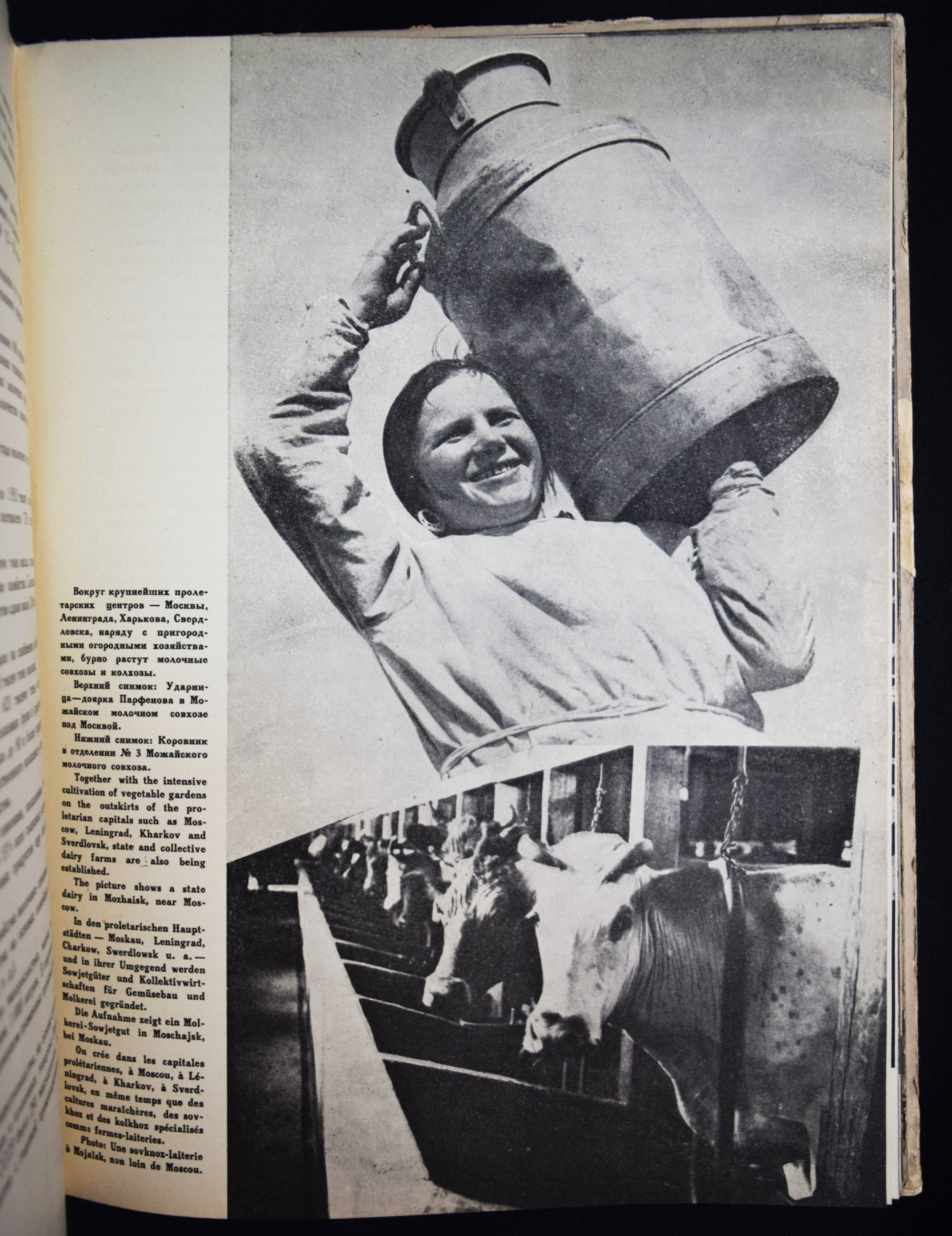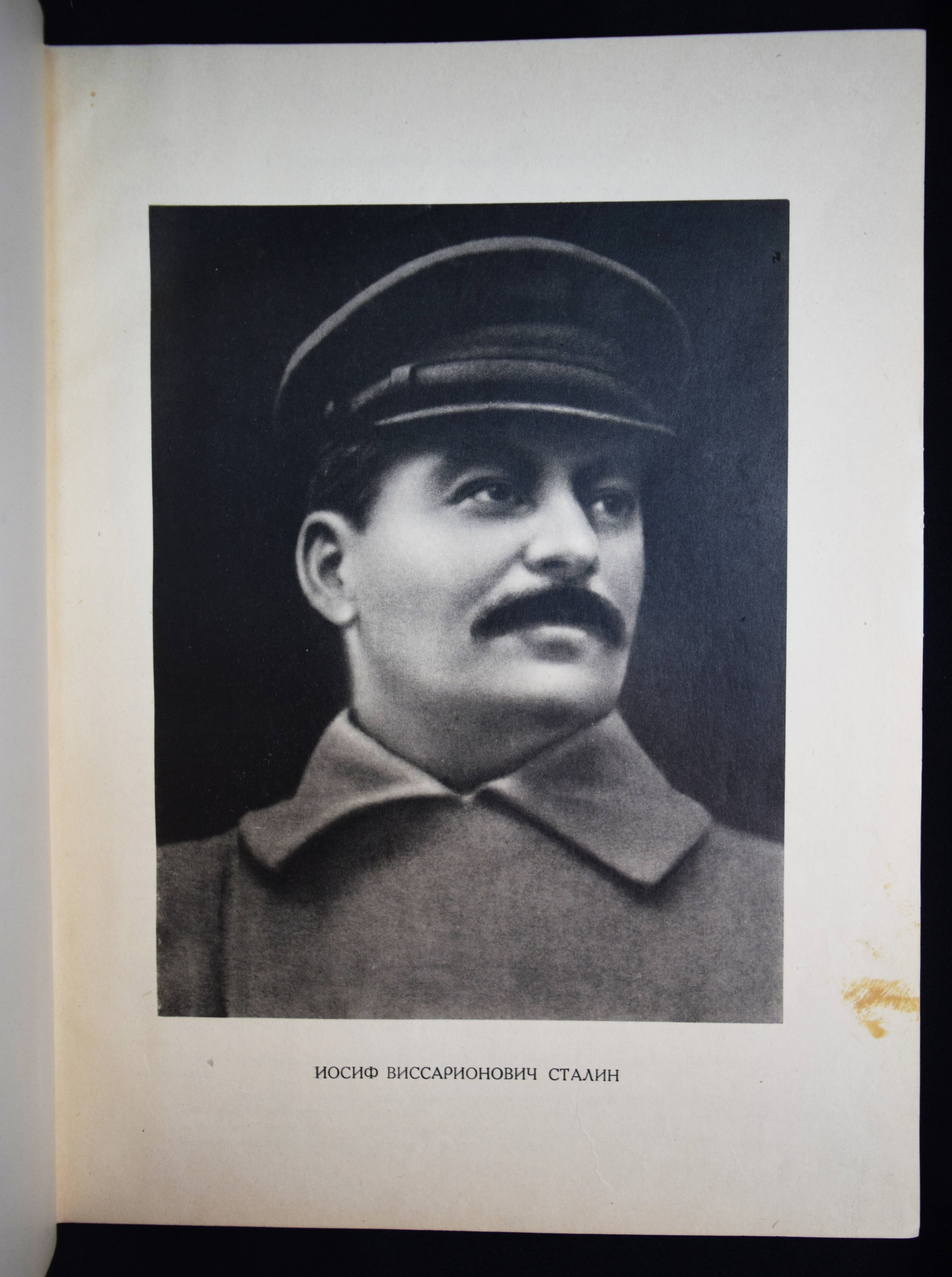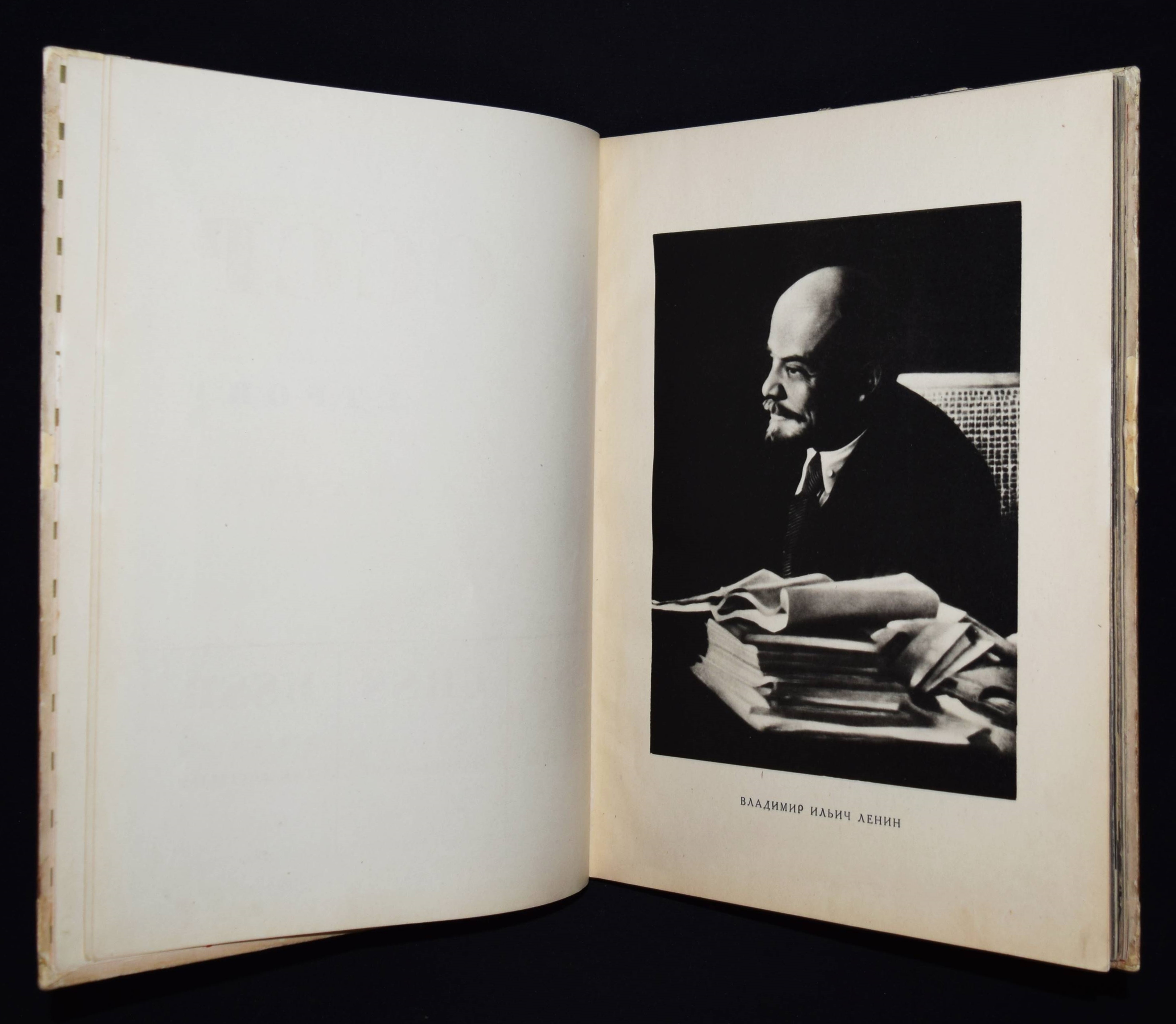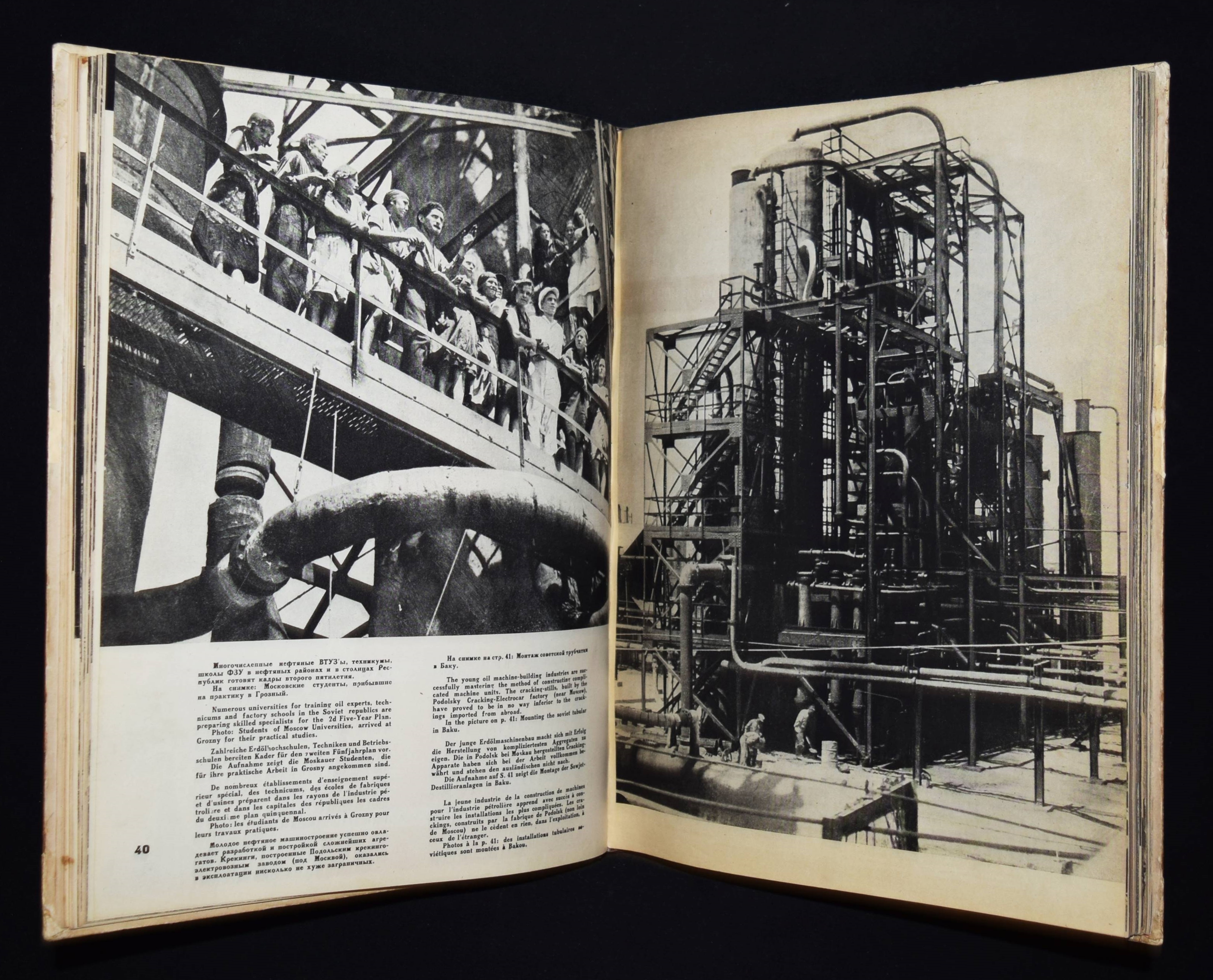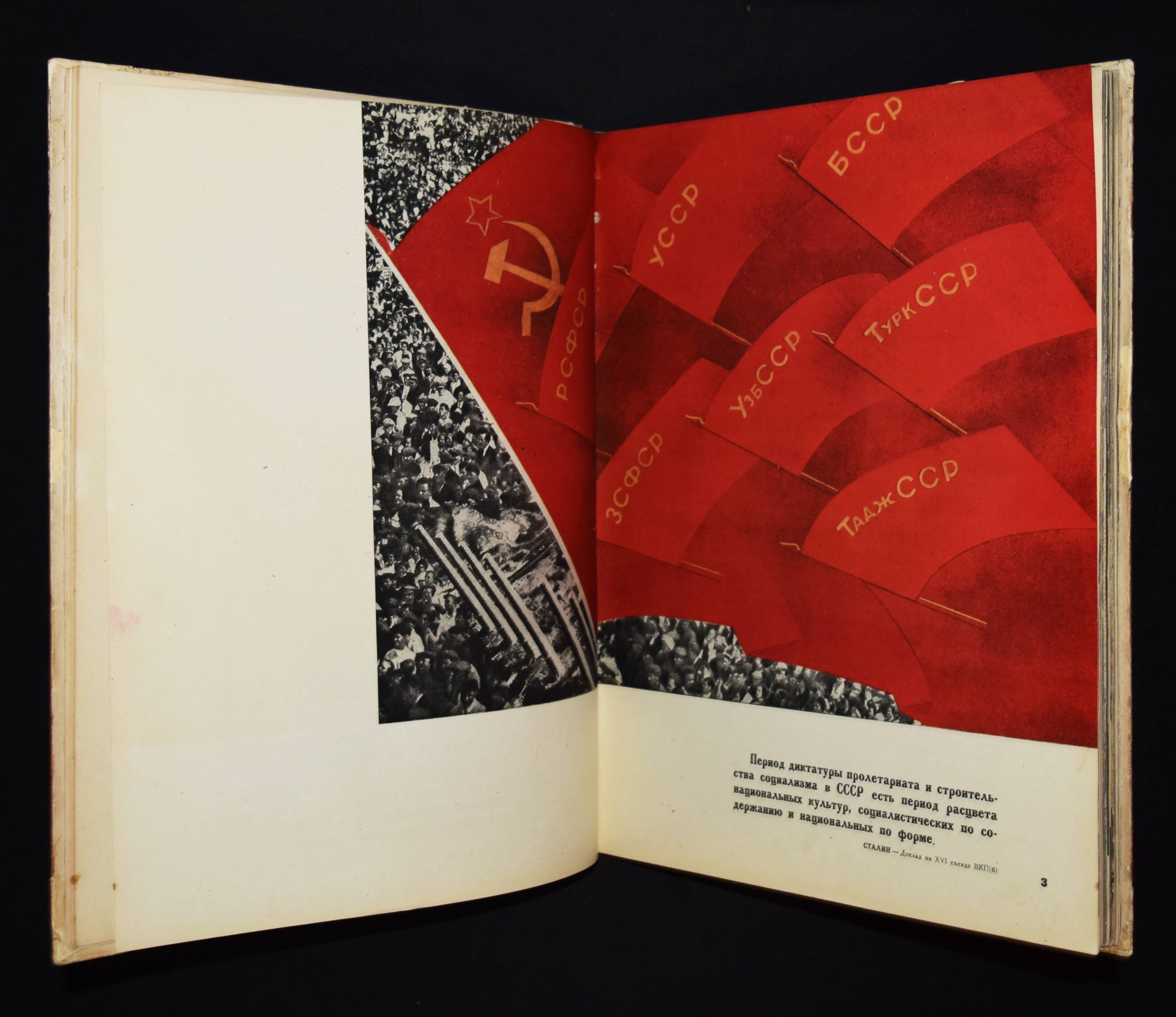 Lissitzky, El (Book-Design). SSSR stroit Sotsializm. USSR baut den Sozialismus. – URSS construit le Socialisme. – USSR builds the Socialism. (Technical Editer: Alexander Brodsky). Moscow, IZOGIZ (printed by Ivan Fiodorov, Leningrad) 1933. Folio (34,5 x 26 cm.). XXVI, 284, (2) S. mit 2 Portrait-Tafeln und teils ganz- und doppelseitigen Abbildungen nach Fotografien und Foto-Montagen. Orig.-Halbleinenband mit silbergepr. Rückentitel, soviet. Flagge und zweifarb. Titel auf dem Vorderdeckel. Heiting/Karasik 190 ff. – Einzige Ausgabe des wichtigen Propaganda-Albums. – „The year 1933 saw the publication of El Lissitzky’s first propaganda album – The USSR Is Building Sociaism, a visual chronicle, a pictorial report on the results of the first Five-Year Plan, an account of victories in the main fields of Socialist construction. The book opens with the text of Stalin’s reporton „The Results of the First Five-Year Plan” on pages VII-XVI (numbered with Roman numerals). In 1933 dozens of books were printed with this title. Three of them were designed by Varvara Stepanova, Solomon Telingater and Boris Titov. In this book there follow (on pages numbered from 1 with Arabic numerals) sections devoted to achievements in the leading branches of industry – mining, heavy industry, machine-building, ag riculture, and the main spheres of life – health services, culture, sport. The technical details about the publication are reduced to a minimum and placed at the start, on the reverse side of the endpaper. There is some interesting information „From the publishing house“: „The textual material and figures end with the editing of August 1932“ – the book was sent for setting in May and went to press in September 1932, so the data included were very much up-to-date. In 1933 statistics, like photography, still reflected the real state of affairs. By 1937 the situation had changed – figures became one of the elements of propaganda, while photography was stripped of the specifics of time and place. … The USSR Is Building Socialism is one of El Lissitzky’s first successful book projects in collaboratio n with IZOGIZ. From 1932 to May 1941 he was actively involved in the creation of the magazine USSR in Construction [SSSR na stroike] that was published by IZOGIZ. As one of the leading artist-designers, he prepared 19 issues and to a large extent determined the look of the magazine. The album The USSR Is Building Socialism is a sort of digest of the first issues of the magazine and includes a large proportion of photographs that had already been published. Many pictures became raw material for photomontages. The montage principle of presenting photographs practically supplanted individual shots: they are nearly all “knocked together“ in pairs along one edge, forming new compositions. The most original are the compositions on the double-page spreads. In them Lissitzky reveals himself to be a master of the photo-projection method of photomontage. The montage principle for the presentation of the material excludes the need to attribute the photographs, but many of them are recognizable. The photographs of Dneprostuoi, also published in USSR in Construction, were the work of Max Alpert, with whom Lissitzky made a special trip to the site of the hydro-electric project; the shots of the Donbas by Yeleazar Langman; those of the Magnitogorsk complex by Anatoly Skurikhin; those of Kuznetskstroi by Pavel Zhukov, Mikhail Kalashnikov and M. Prigozhin. The album ends with a photograph of a military man, one of the heroes of the skiing trek in a Budionny cap and greatcoat dusted with snow – this image, popular with the magazines of th e period, was the work of Arkady Shaikhet. It is a curious fact that while he continued to practice photography in the 1930s, when it had lost its experimental character, Lissitzky in contrast to Rodchenko hardly ever used his own pictures in books. The construction of the album is founded upon the magazine principle – a compilation of issues. The development of the visual blocks is accentuated by the double-page photomontages printed in two colours, black and red. The introduction of short slogan-like texts into the photomontages make these pages look like posters“ (M. Karasik). – Deckel etwas angestaubt und leicht fleckig, nur vereinzelt um Blattrand geringfügig braunfleckig, sehr gutes Exemplar.