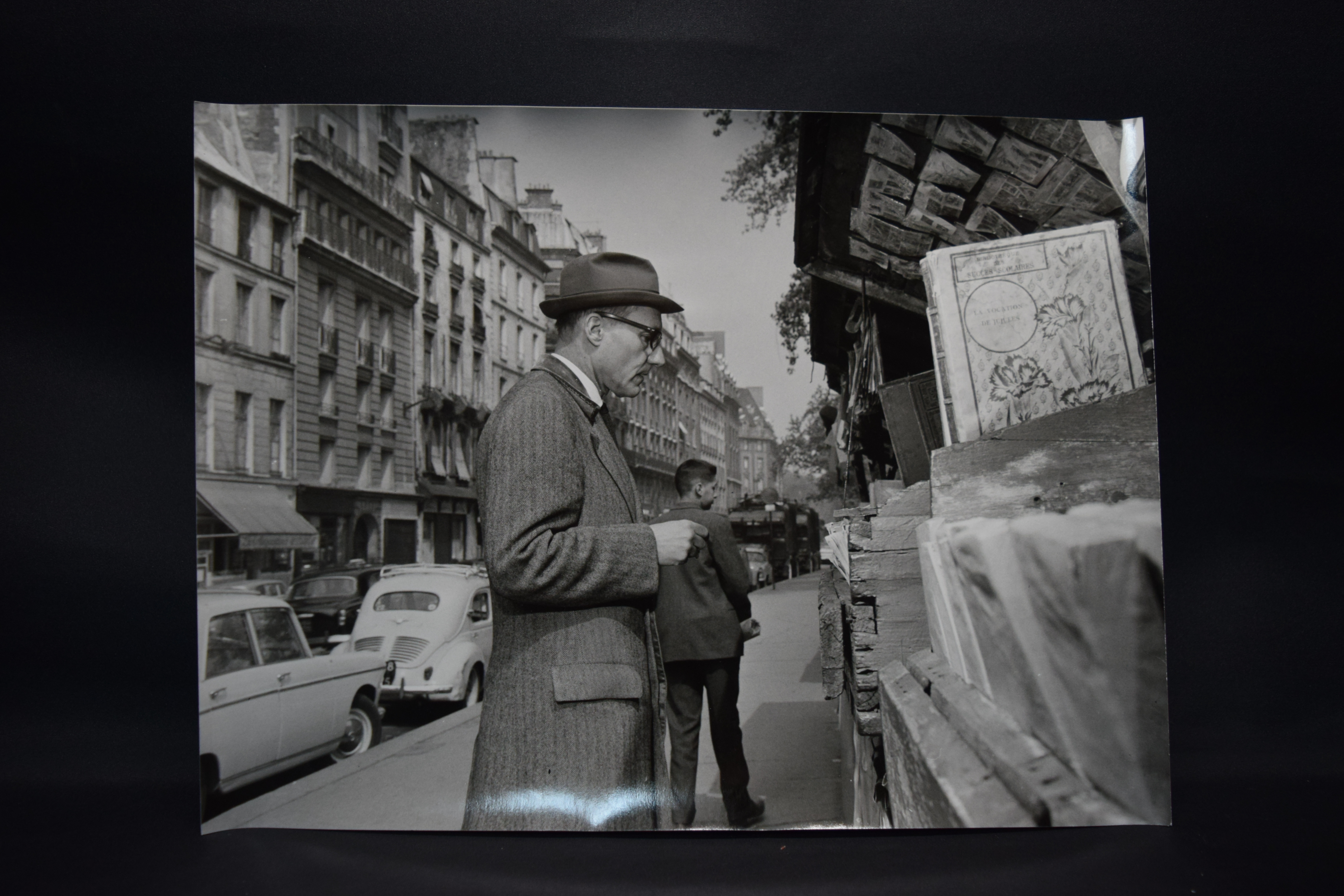 Beat Generation – William S(eward) Burroughs (1914-1997, US-amerikanischer Schriftsteller). Orig.-Portrait-Photographie von Aldo Durazzi (Silbergelatine / Silver gelatine). Paris 8. 6. 1962. Format: 30 x 40 cm. W. S. Burroughs bei den Bouquinisten am Seineufer in Paris im Sommer 1962. – Burroughs wurde mit seinem 1959 erschienenen Roman „Naked Lunch“ bekannt; er lebte damals zeitweise in Paris und Tanger. 1961 und 1962 erschien seine „Nova“-Trilogie. – Der bedeutende ital. Photograph A. Durazzi gründete 1956 in Rom die Agentur Dufoto. Seit den 70er Jahren war er Fotokorrespondet für „Time Life“ und „National Geographic“. – „Der Begriff „Beat Generation“ wurde etwa 1948 von Kerouac eingeführt, der so sein soziales Umfeld im Gespräch mit John Clellon Holmes beschrieb. Holmes veröffentlichte 1952 Go, einen frühen Roman über die Beat Generation, und das Manifest This is the beat generation in der Sunday New York Times. Das Adjektiv beat aus dem Slang der Kriminellen, den Herbert Huncke in die Gruppe um Kerouac, Ginsberg und Burroughs einbrachte, hatte die Bedeutungen „besiegt“, „müde“ und „heruntergekommen“, aber Kerouac prägte zusätzlich die Bedeutungen „euphorisch“ (upbeat), „seligmachend“ (beatific) und in Bezug auf Musik, vor allem Bebop, auch being on the beat („im Rhythmus sein“)“ (Wikipedia). – Rückseitig mit Stempel einer italienischen Foto-Agentur, wohl späterer Abzug. – W. S. Burroughs at the bouquinistes on the banks of the Seine in Paris in the summer of 1962. – Burroughs became famous with his novel “Naked Lunch”, published in 1959; he was living in Paris and Tangier at the time. His “Nova” trilogy was published in 1961 and 1962. – The important ital. Photographer A. Durazzi founded the Dufoto agency in Rome in 1956. From the 1970s he was a photo correspondent for “Time Life” and “National Geographic”. – “The term ”Beat Generation“ was introduced around 1948 by Kerouac, who used it to describe his social environment in a conversation with John Clellon Holmes. Holmes published Go, an early novel about the Beat Generation, in 1952 and the manifesto This is the beat generation in the Sunday New York Times. The adjective beat from the slang of the criminals, which Herbert Huncke brought into the group around Kerouac, Ginsberg and Burroughs, had the meanings “defeated”, “tired” and “run-down”, but Kerouac also coined the meanings “euphoric” (upbeat), ‘beatific’ (beatific) and, in relation to music, especially bebop, also being on the beat (“being in the rhythm”)“ (Wikipedia). – Stamp of an Italian photo agency on the reverse, probably a later print.
