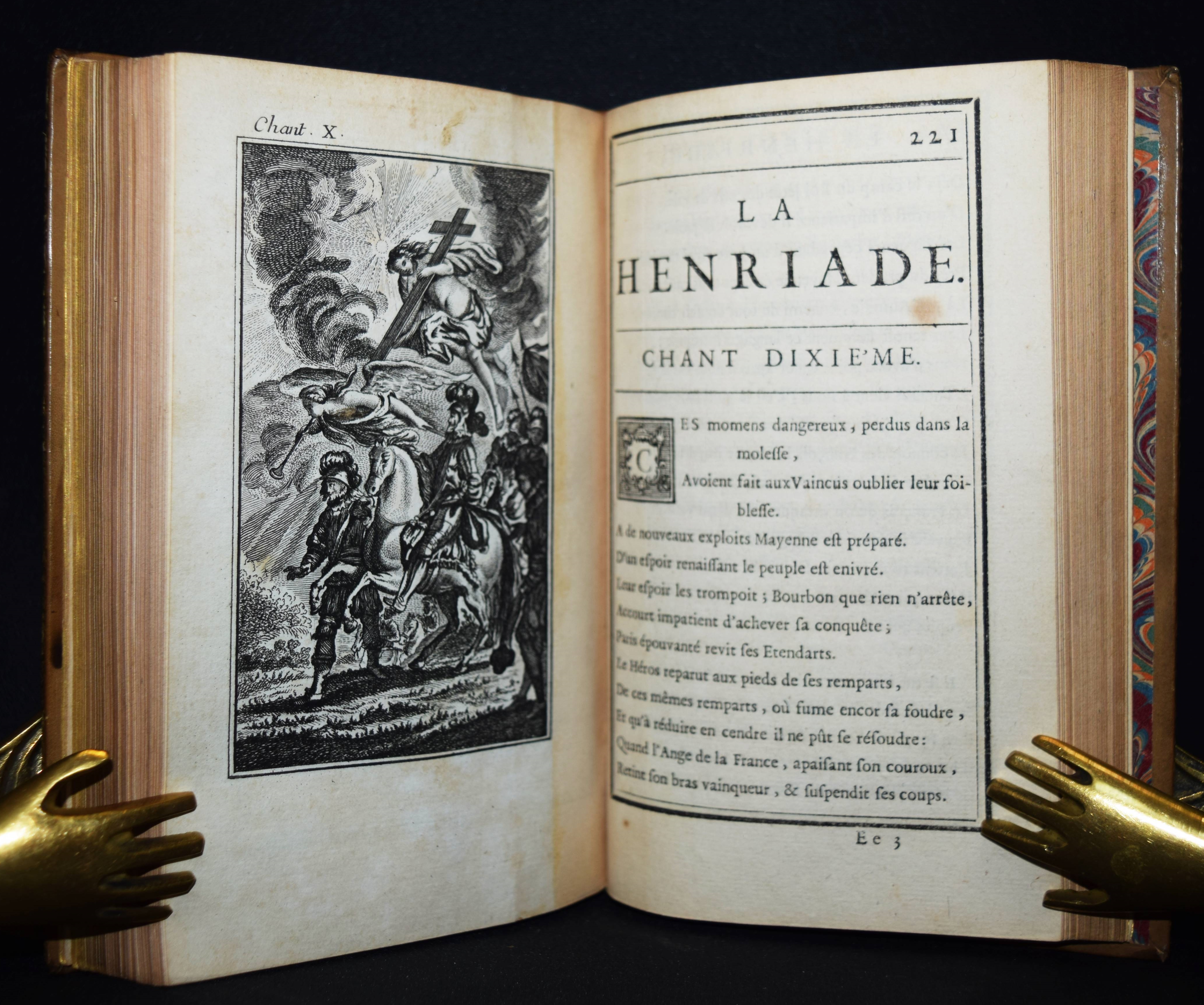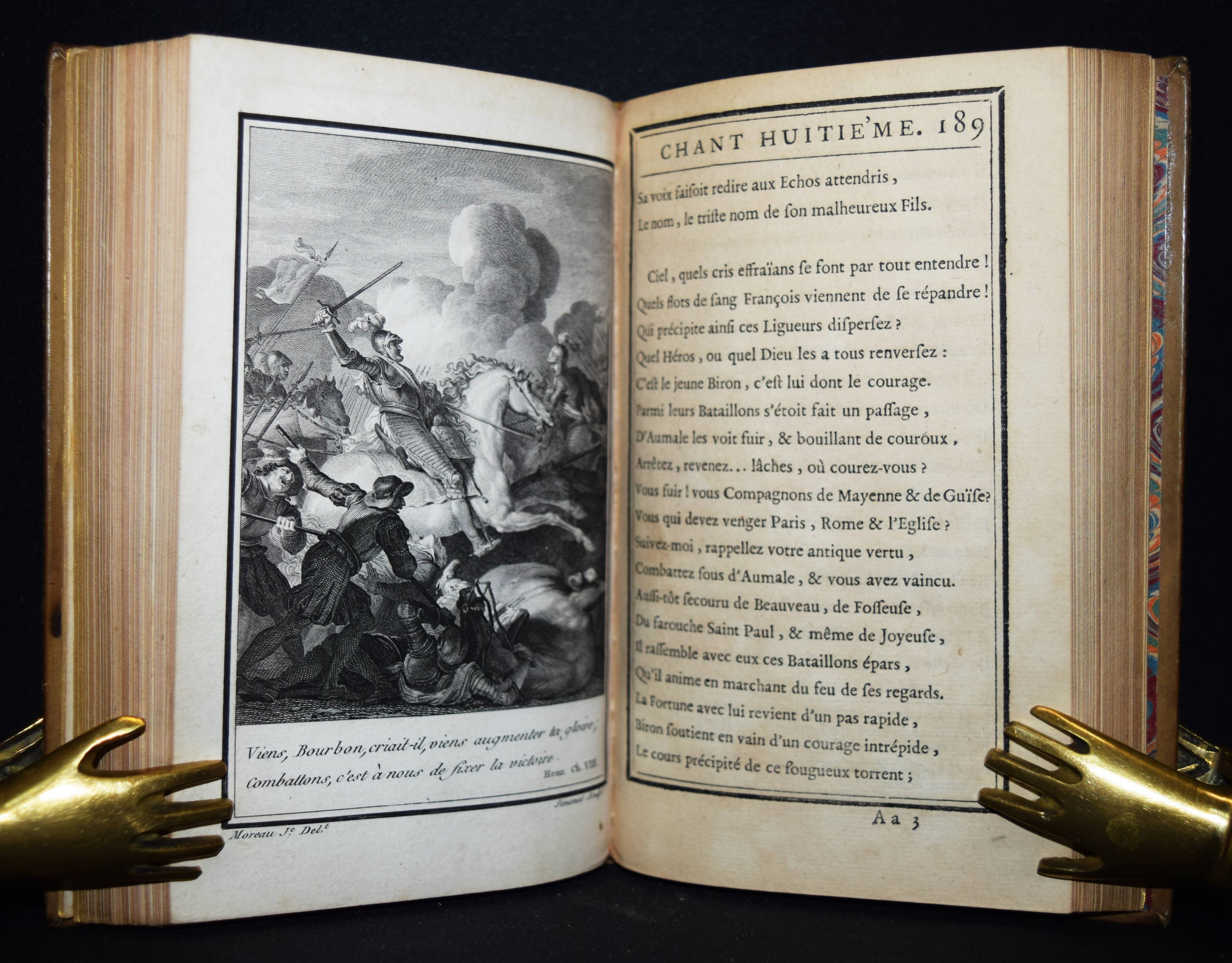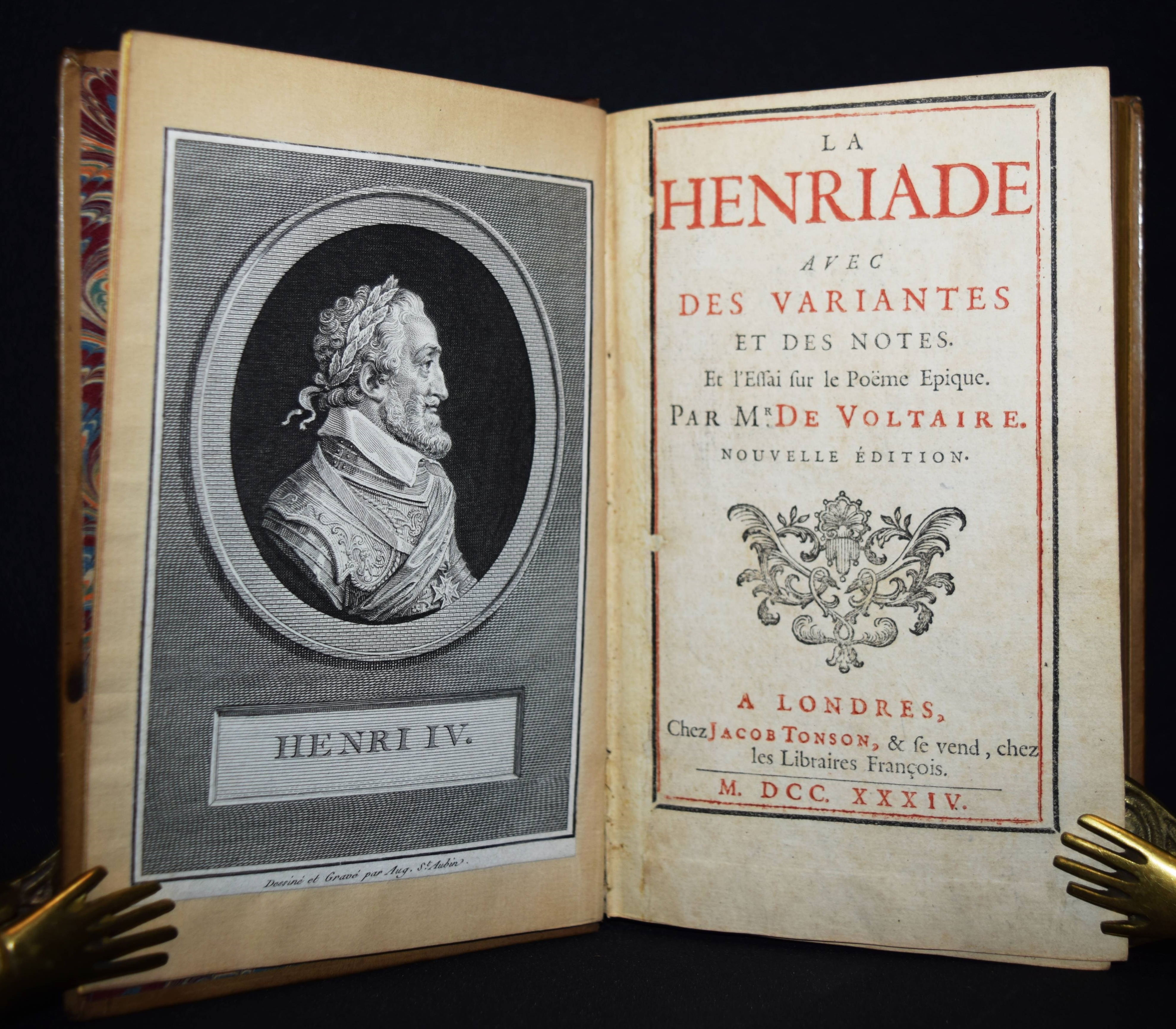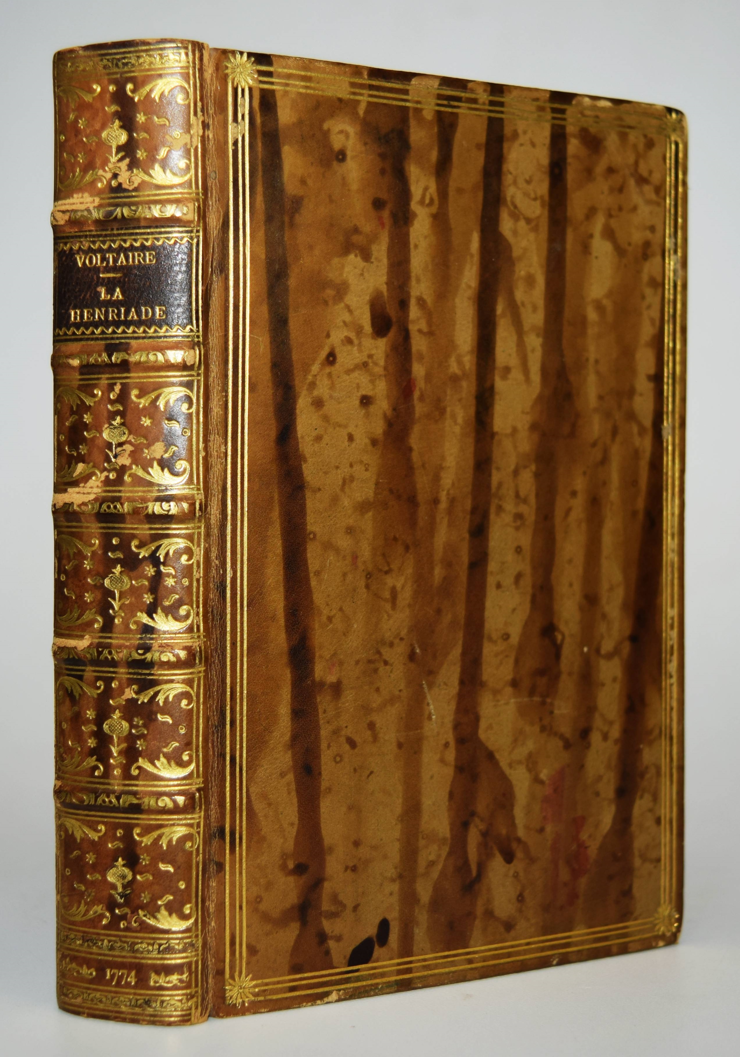 Voltaire, (François Marie Arouet). La Henriade. Avec des variantes et des notes. Et l’’essai sur le poeme epique. (Et): Essay sur la poesie epique. Nouvelle édition. 2 Teile in 1 Band. Londres, Jacob Tonson 1734. Kl.-8° (16,5 x 10,5 cm.). [11] Bl., 245, (1); 99 S. mit Titel in Rot und Schwarz und 32 Kupfertafeln nach Jean-Michel Moreau le Jeune u. a. Lederband im Stil der Zeit mit goldgepr. Rückenschild, reicher floraler Rückenvergoldung, Deckel-Filetten, Stehkantenvergoldung und Goldschnitt. Bengesco I, 372. – Neudruck der Ausgabe von 1733. Hier ausgestattet mit den berühmten Illustrationen nach Jean-Michel Moreau le Jeune (1741-1814) u. a. – Modernes Portrait Hernri IV. (nach einem Kupferstich von A. St. Aubin) gegenüber dem Titelblatt montiert, stellenweise etwas braunfleckig, gutes dekorativ gebundenes Exemplar.