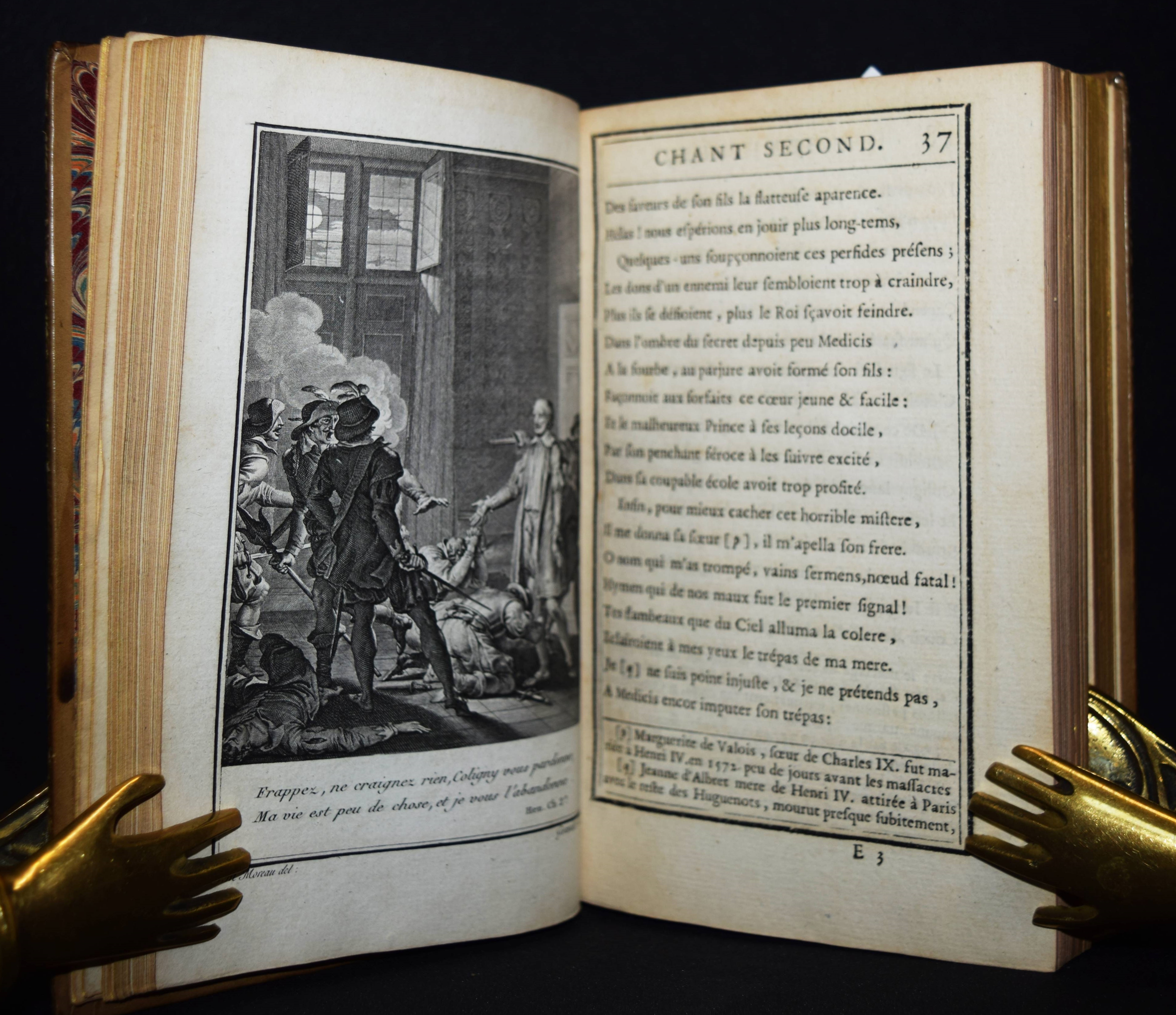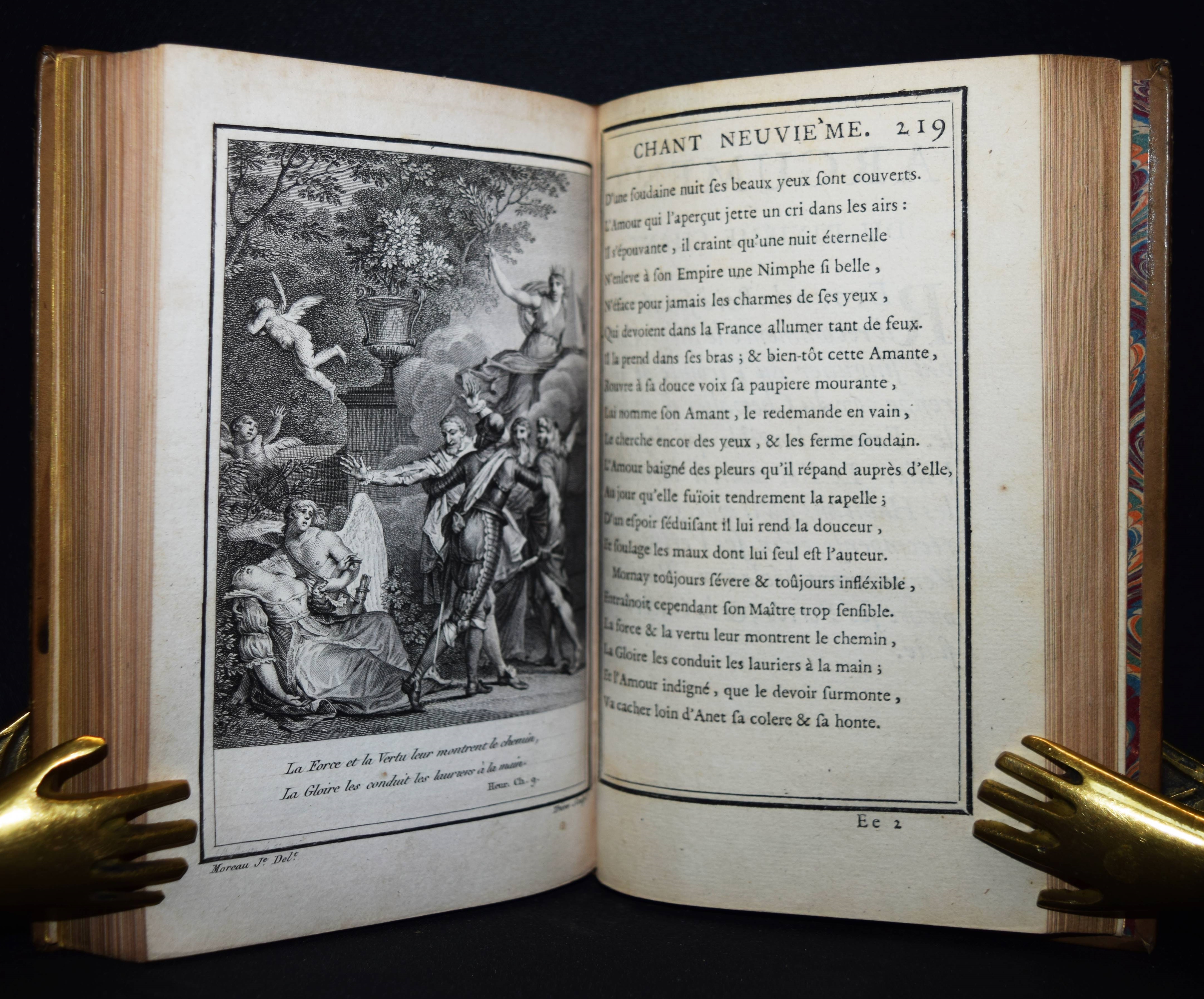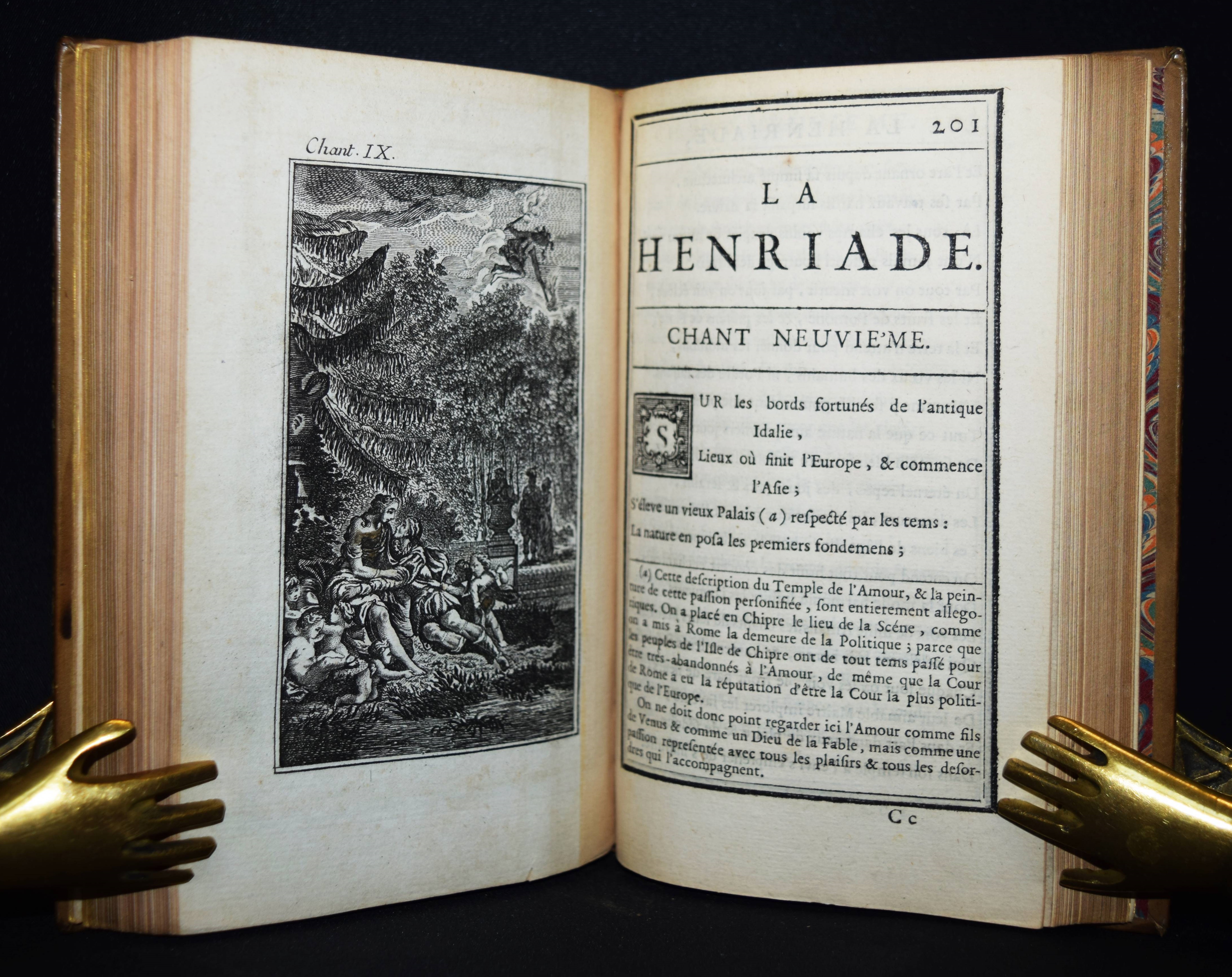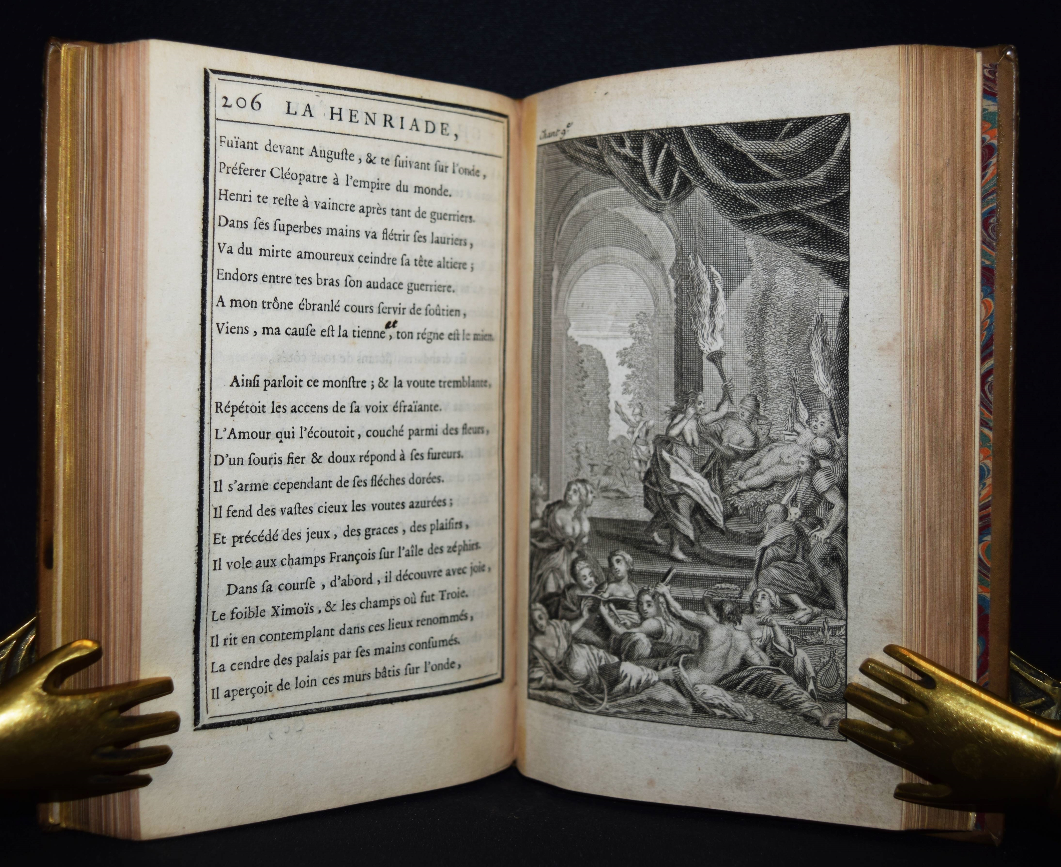 Voltaire, (François Marie Arouet). La Henriade. Avec des variantes et des notes. Et l’’essai sur le poeme epique. (Et): Essay sur la poesie epique. Nouvelle édition. 2 Teile in 1 Band. Londres, Jacob Tonson 1734. Kl.-8° (16,5 x 10,5 cm.). [11] Bl., 245, (1); 99 S. mit Titel in Rot und Schwarz und 32 Kupfertafeln nach Jean-Michel Moreau le Jeune u. a. Lederband im Stil der Zeit mit goldgepr. Rückenschild, reicher floraler Rückenvergoldung, Deckel-Filetten, Stehkantenvergoldung und Goldschnitt. Bengesco I, 372. – Neudruck der Ausgabe von 1733. Hier ausgestattet mit den berühmten Illustrationen nach Jean-Michel Moreau le Jeune (1741-1814) u. a. – Modernes Portrait Hernri IV. (nach einem Kupferstich von A. St. Aubin) gegenüber dem Titelblatt montiert, stellenweise etwas braunfleckig, gutes dekorativ gebundenes Exemplar.