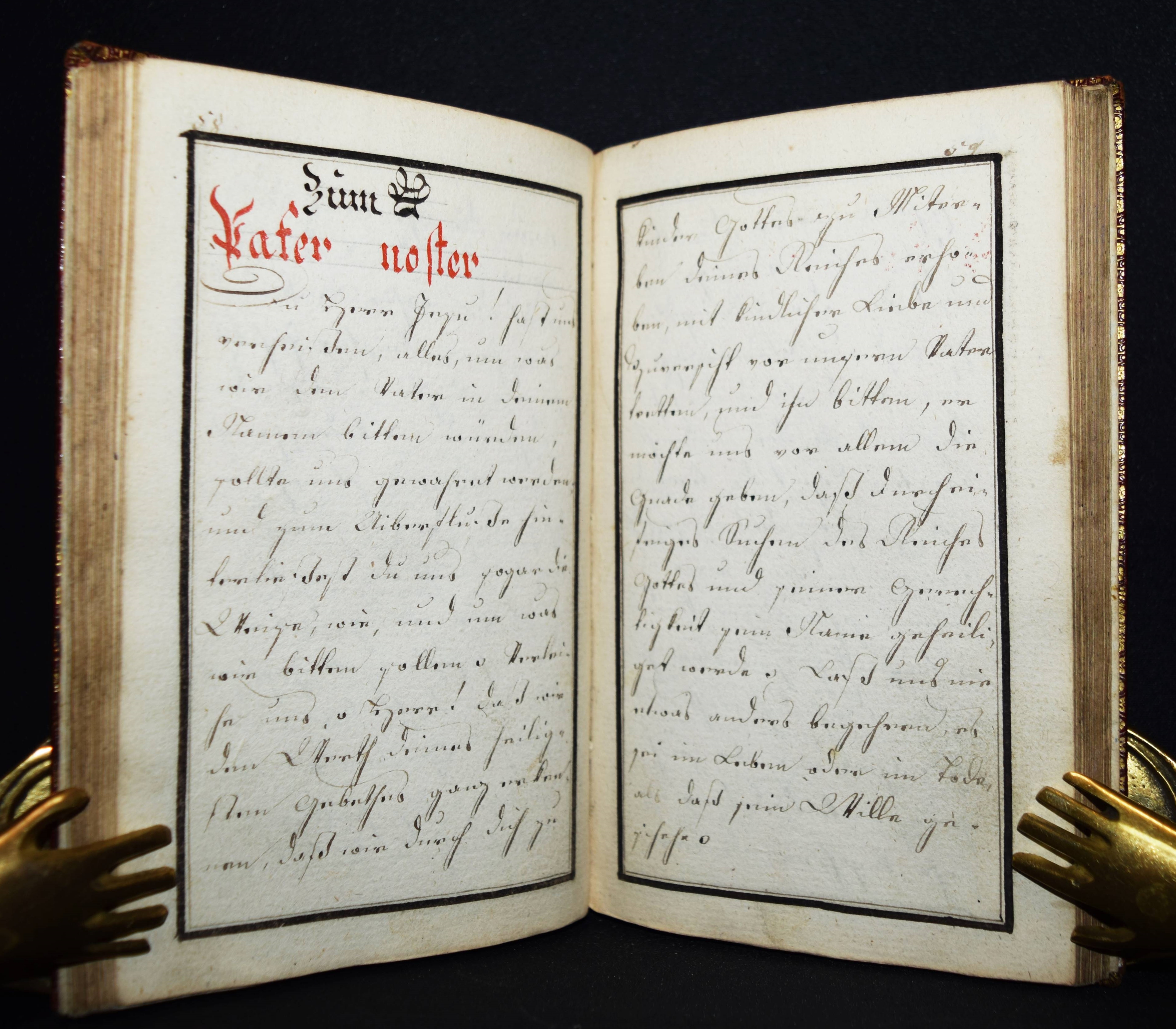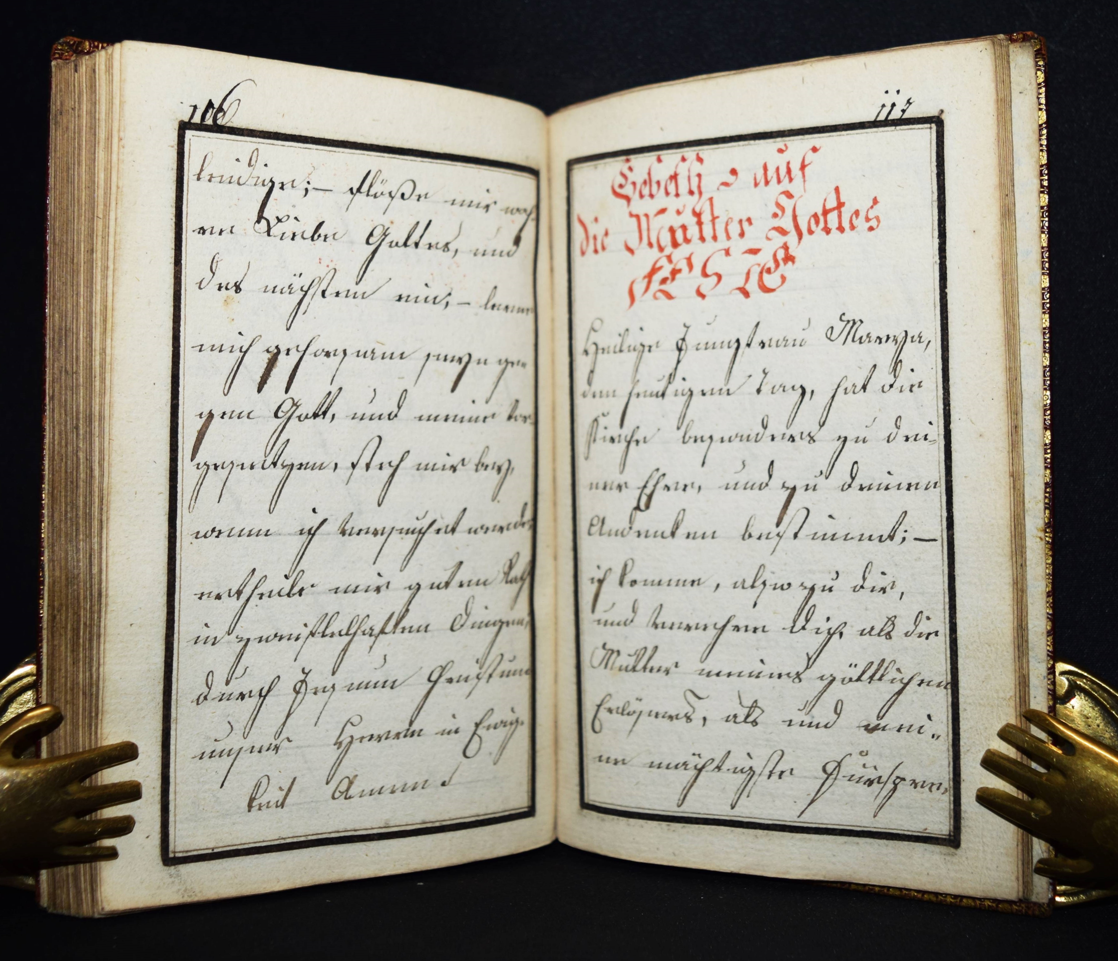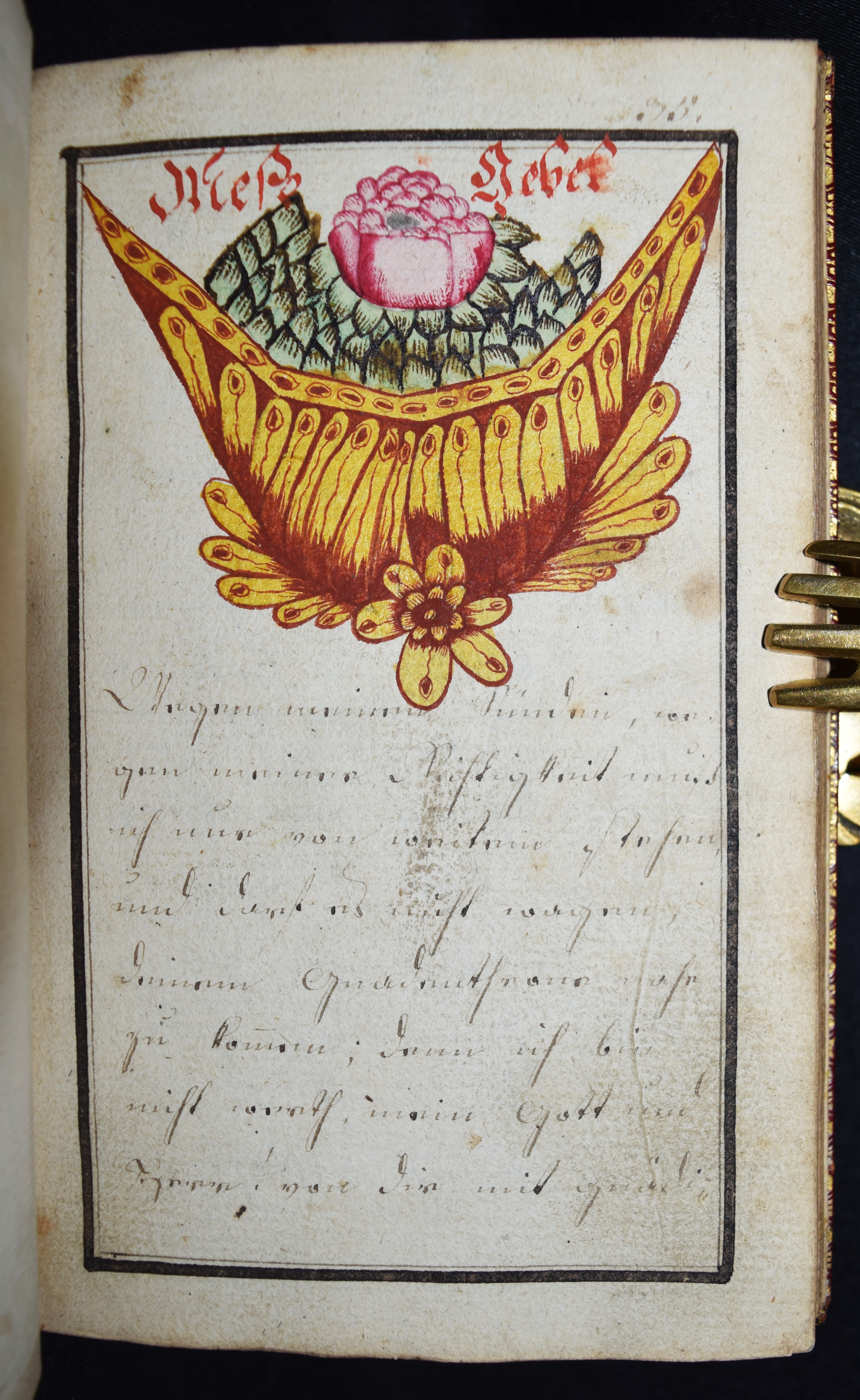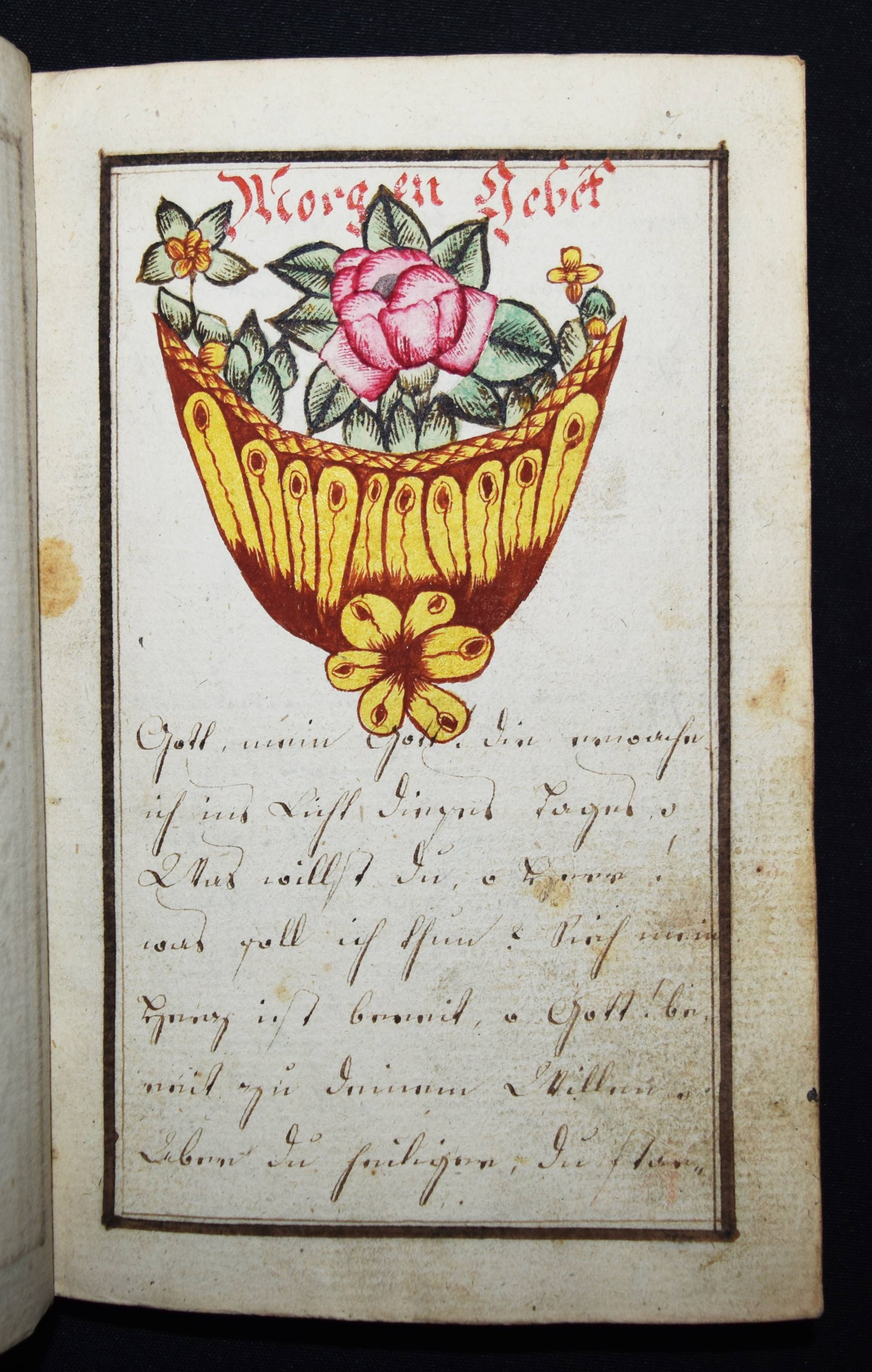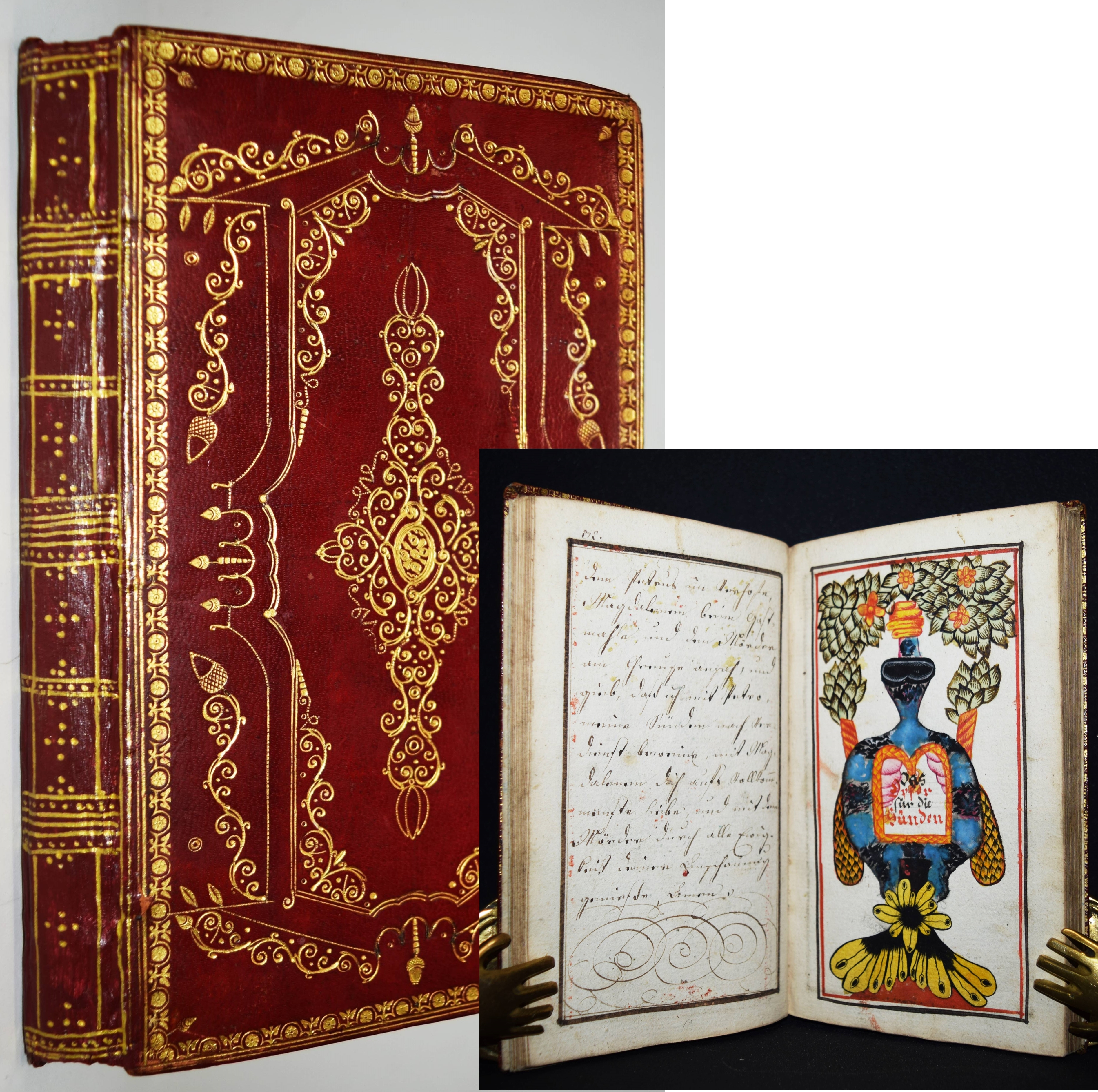 Himlischer (!) Seelenschatz. Hier enthalten sind Morgen-, Abend-, Meß, Beicht und Cominion Gebether, wie auch die Litaney z. allen Heiligen, … – Deutsche Handschrift auf Papier. O. O. (Süddeutschland) um 1790. Kl.-8° (17 x 10,5 cm.). 130 S. mit Überschriften in Schwarz und Rot, farbig illustr. Titel und 10 (3 ganzs.) Aquarellen mit floralen Motiven. Weinroter Maroquin-Lederband mit reicher Deckel- und Innenkantenvergoldung und Goldschnitt. Prachtvoll gebundenes Gebetbuch des Spät-Barock mit 40 Gebeten in sauberer Kurrentschrift. – Rücken unauffällig erneuert, stellenweise etwas fingerfleckig, sonst sehr gut erhalten.