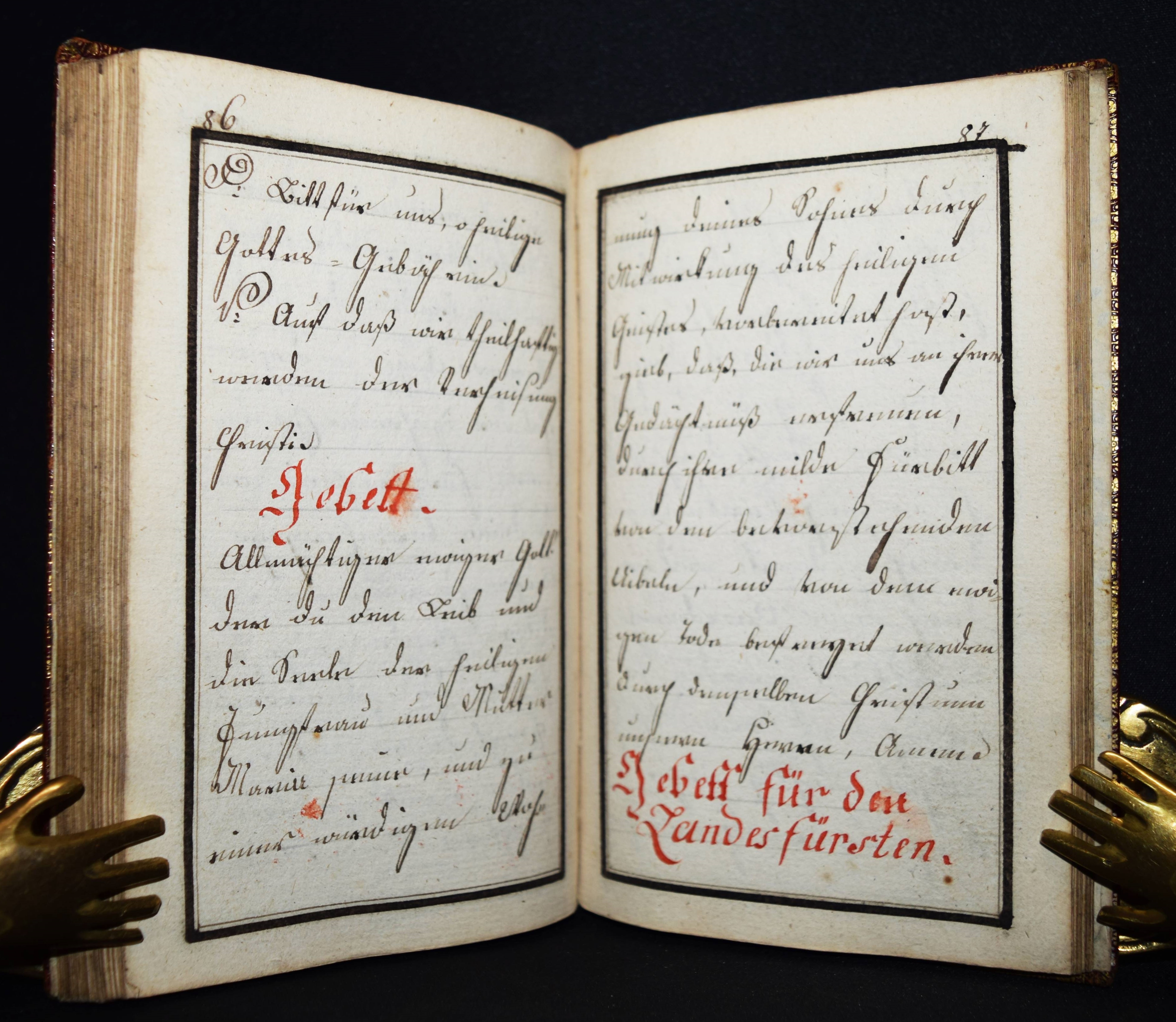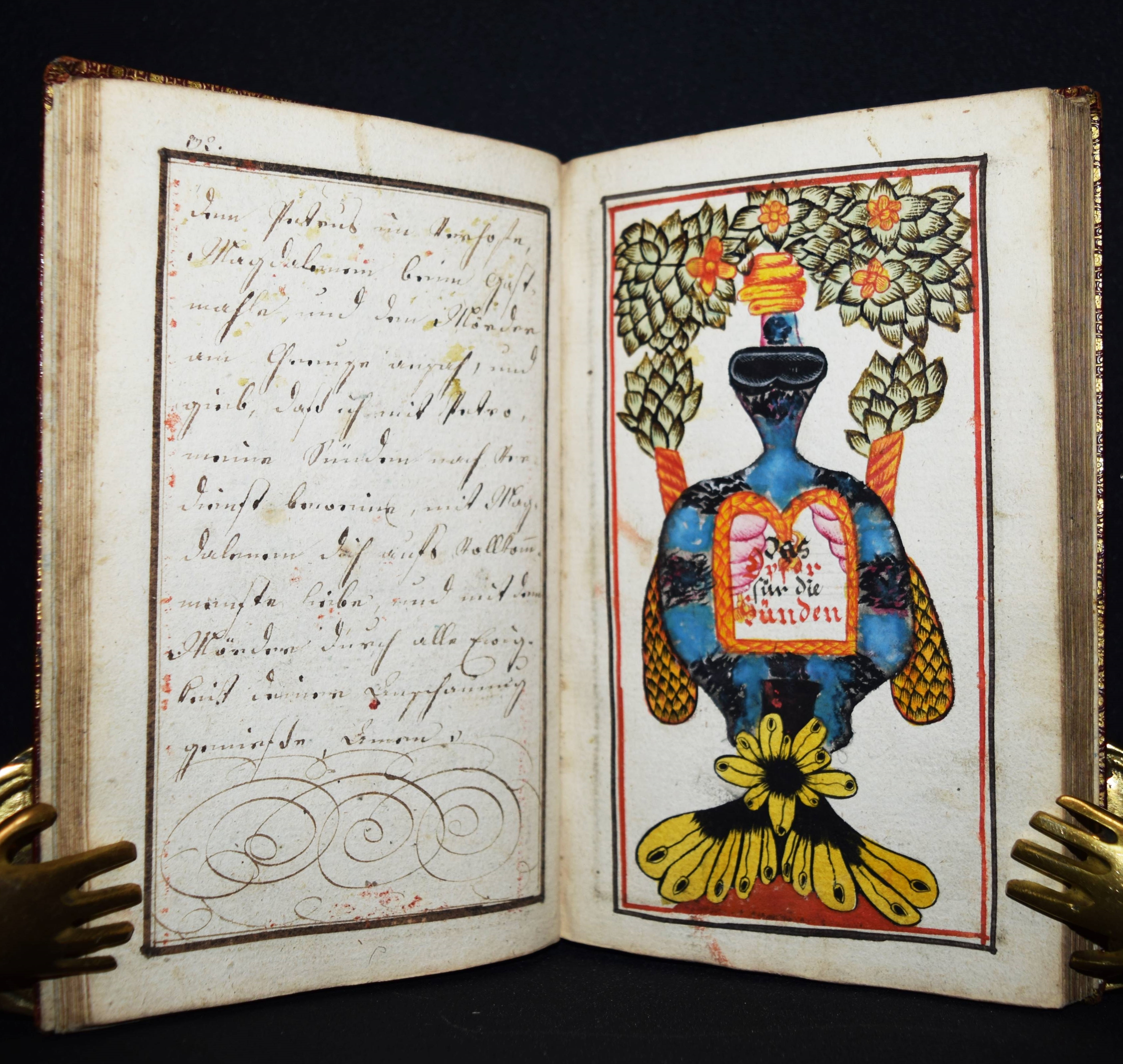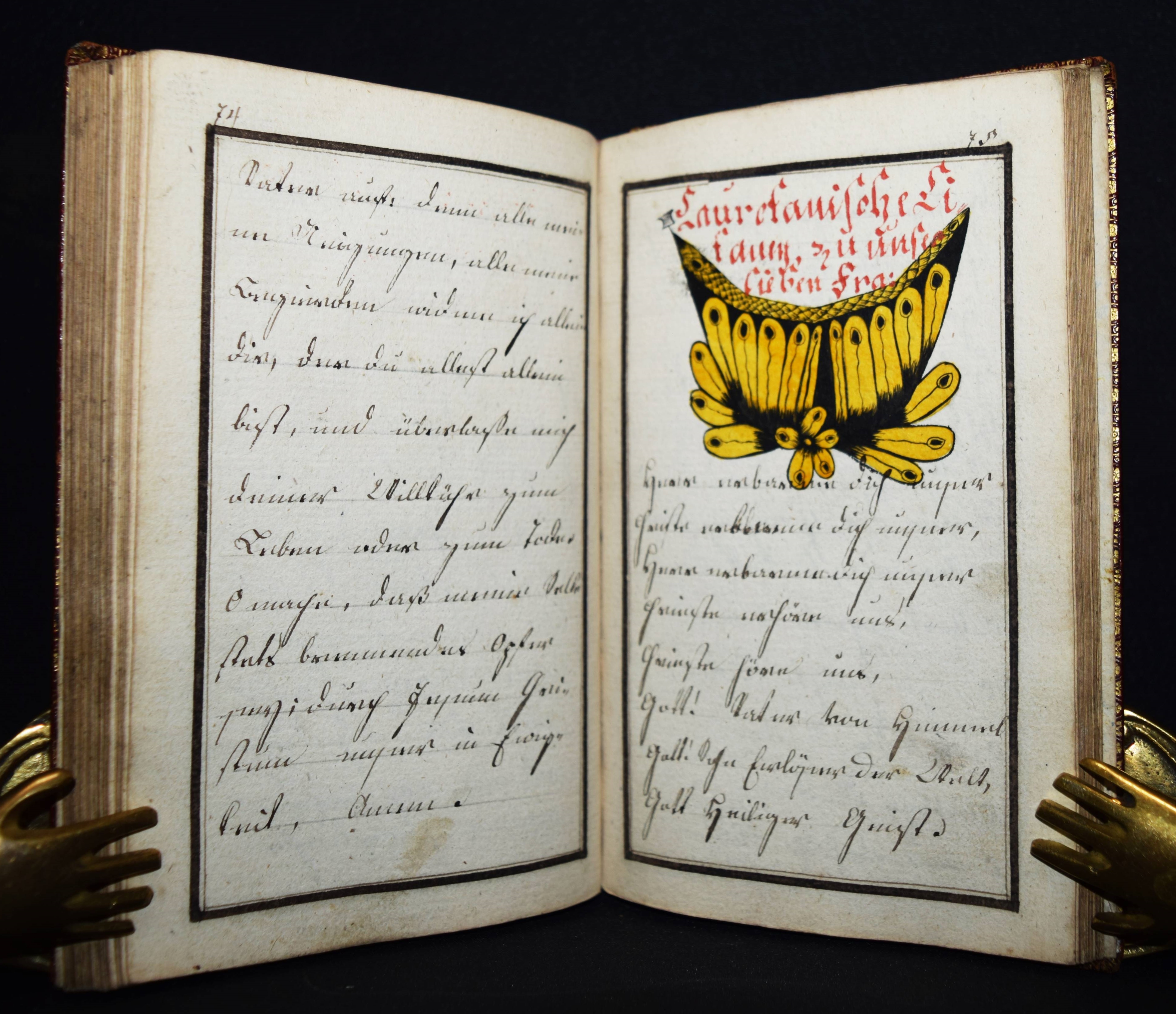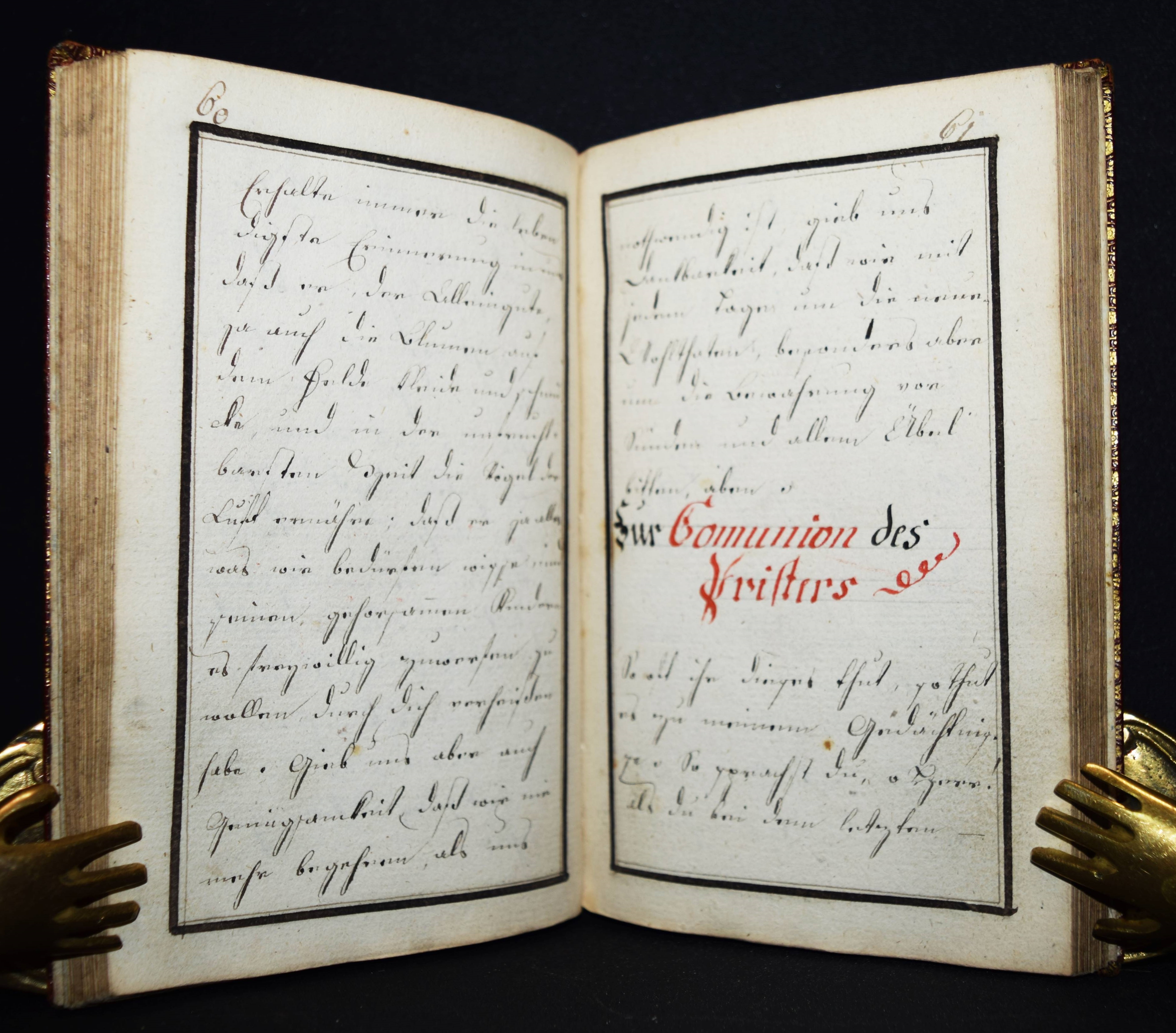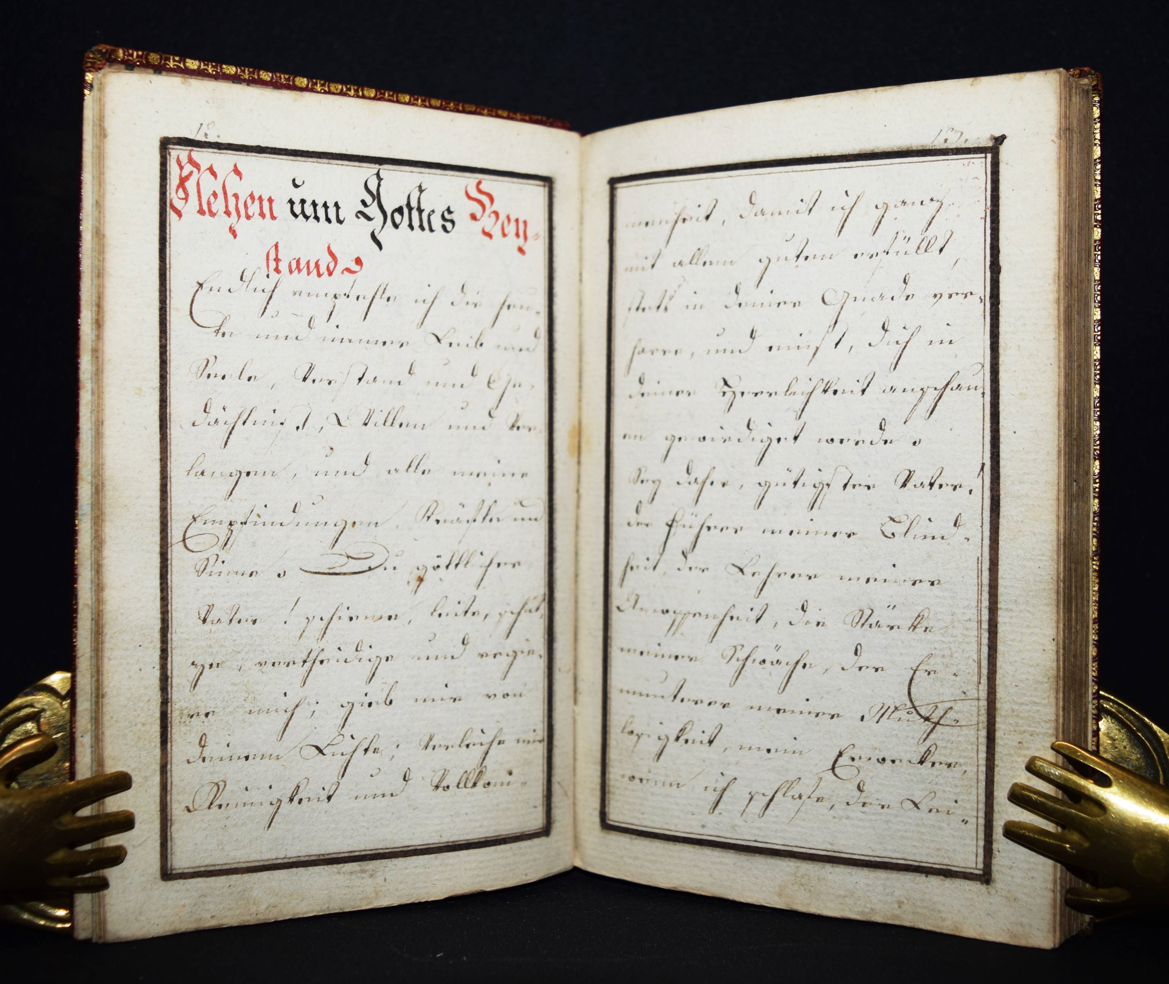 Himlischer (!) Seelenschatz. Hier enthalten sind Morgen-, Abend-, Meß, Beicht und Cominion Gebether, wie auch die Litaney z. allen Heiligen, … – Deutsche Handschrift auf Papier. O. O. (Süddeutschland) um 1790. Kl.-8° (17 x 10,5 cm.). 130 S. mit Überschriften in Schwarz und Rot, farbig illustr. Titel und 10 (3 ganzs.) Aquarellen mit floralen Motiven. Weinroter Maroquin-Lederband mit reicher Deckel- und Innenkantenvergoldung und Goldschnitt. Prachtvoll gebundenes Gebetbuch des Spät-Barock mit 40 Gebeten in sauberer Kurrentschrift. – Rücken unauffällig erneuert, stellenweise etwas fingerfleckig, sonst sehr gut erhalten.