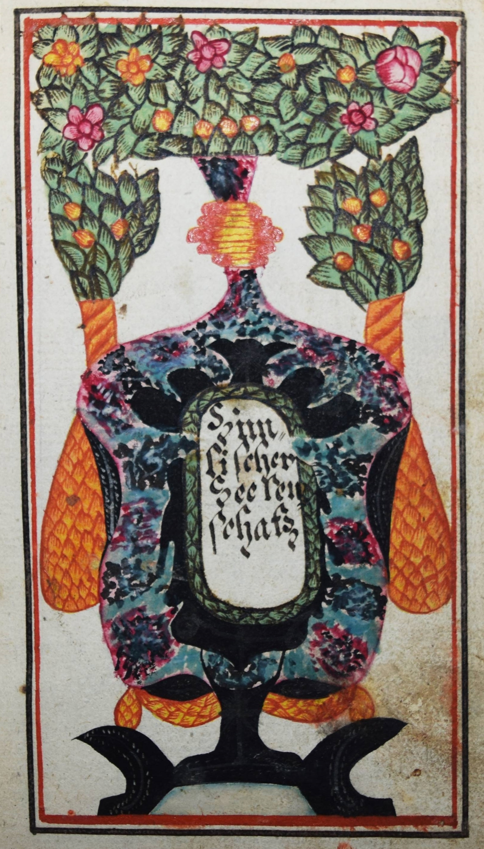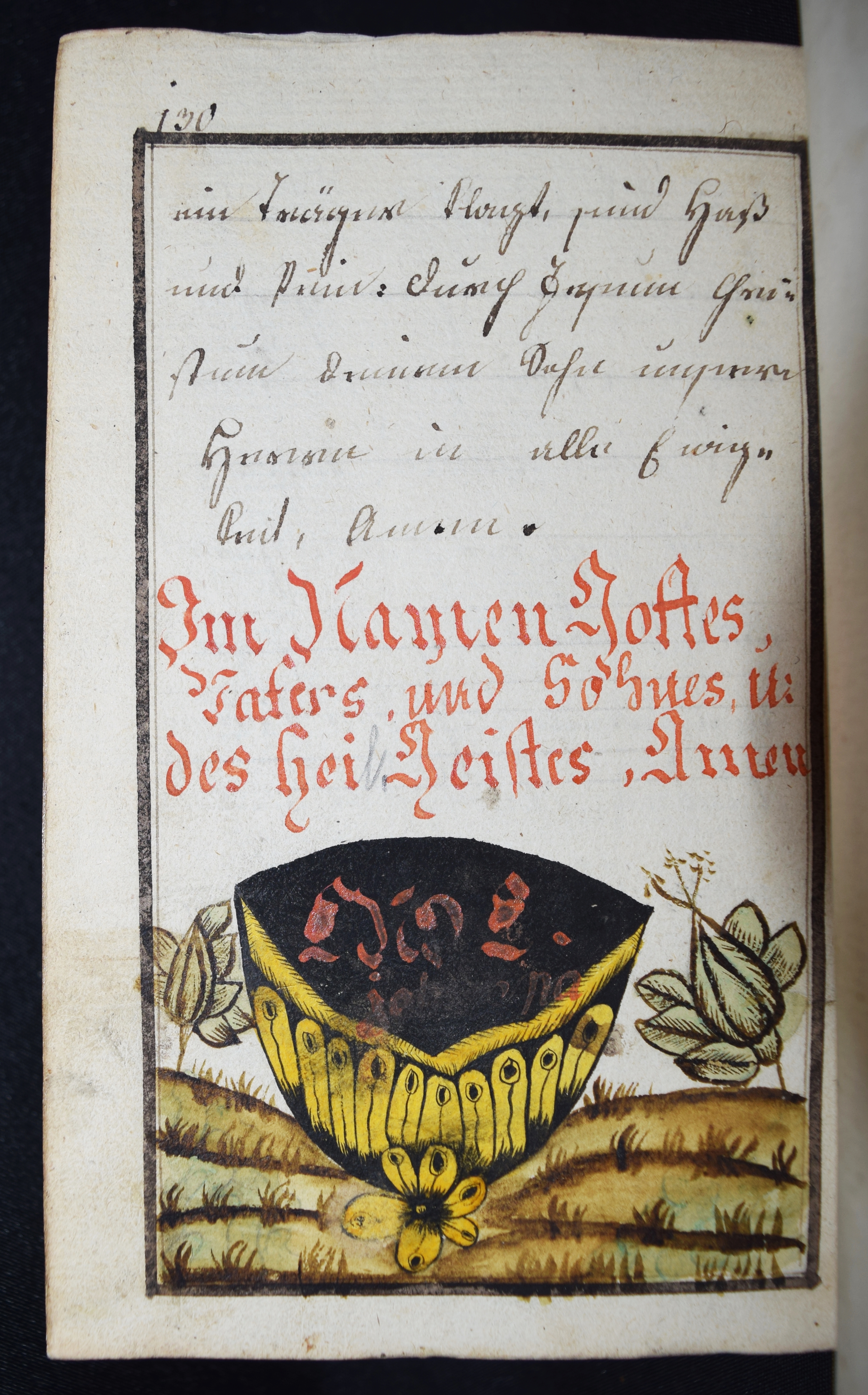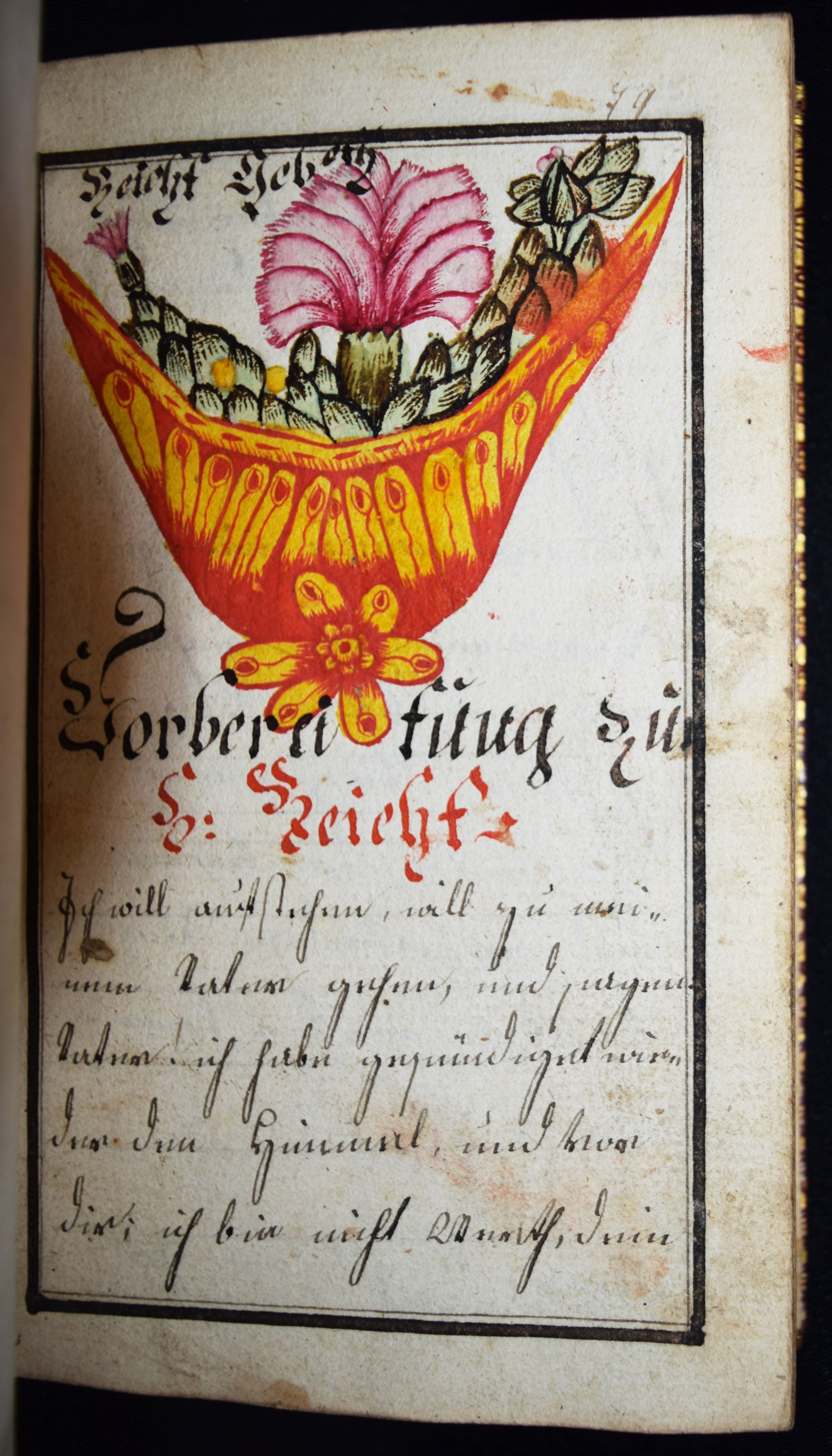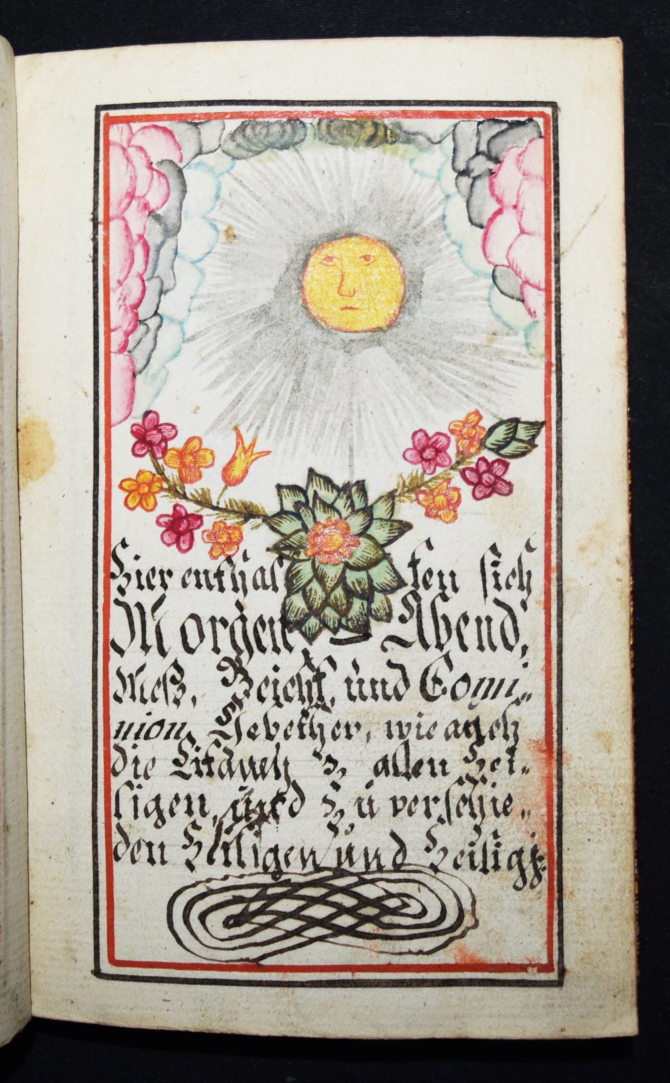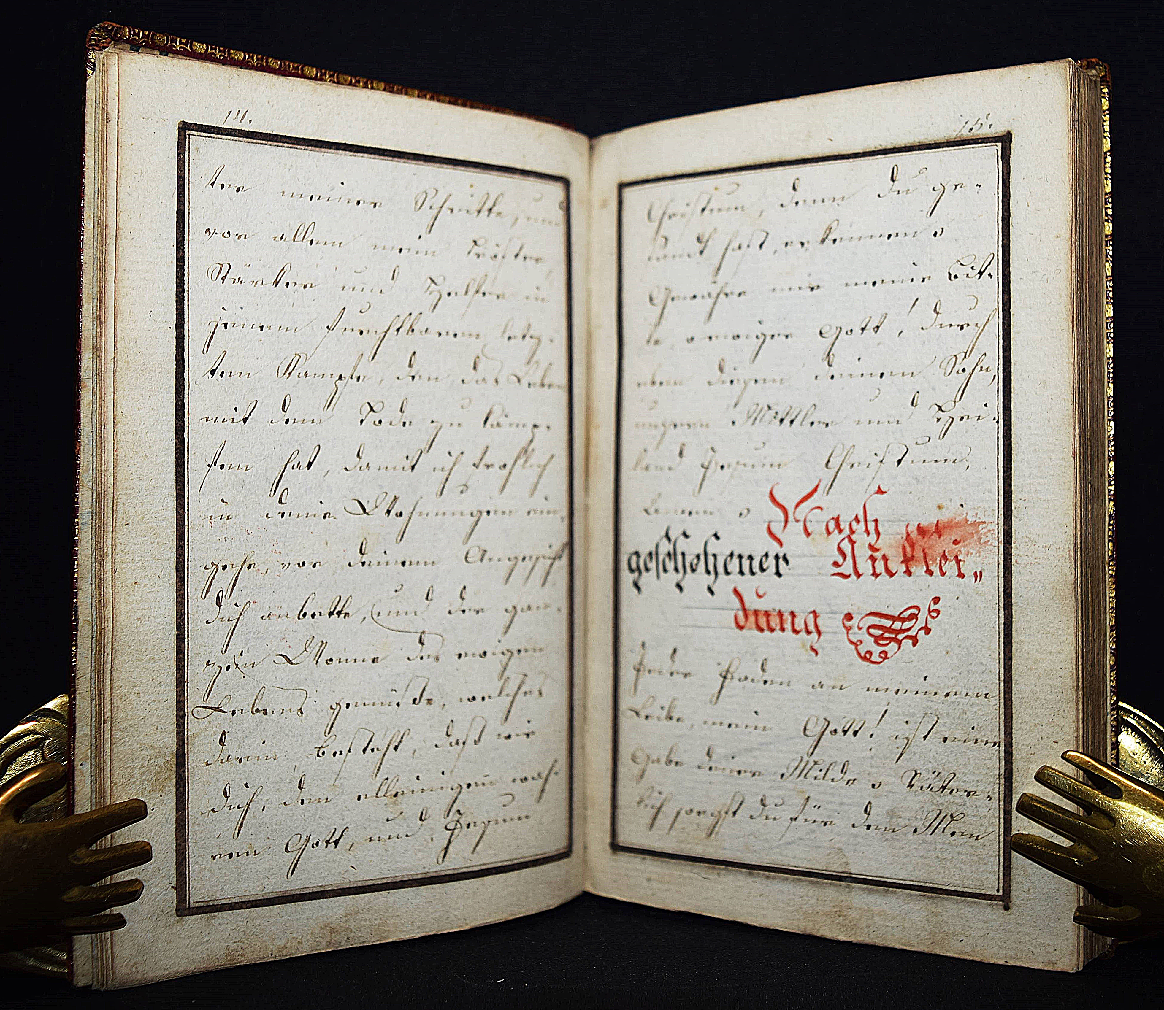 Himlischer (!) Seelenschatz. Hier enthalten sind Morgen-, Abend-, Meß, Beicht und Cominion Gebether, wie auch die Litaney z. allen Heiligen, … – Deutsche Handschrift auf Papier. O. O. (Süddeutschland) um 1790. Kl.-8° (17 x 10,5 cm.). 130 S. mit Überschriften in Schwarz und Rot, farbig illustr. Titel und 10 (3 ganzs.) Aquarellen mit floralen Motiven. Weinroter Maroquin-Lederband mit reicher Deckel- und Innenkantenvergoldung und Goldschnitt. Prachtvoll gebundenes Gebetbuch des Spät-Barock mit 40 Gebeten in sauberer Kurrentschrift. – Rücken unauffällig erneuert, stellenweise etwas fingerfleckig, sonst sehr gut erhalten.