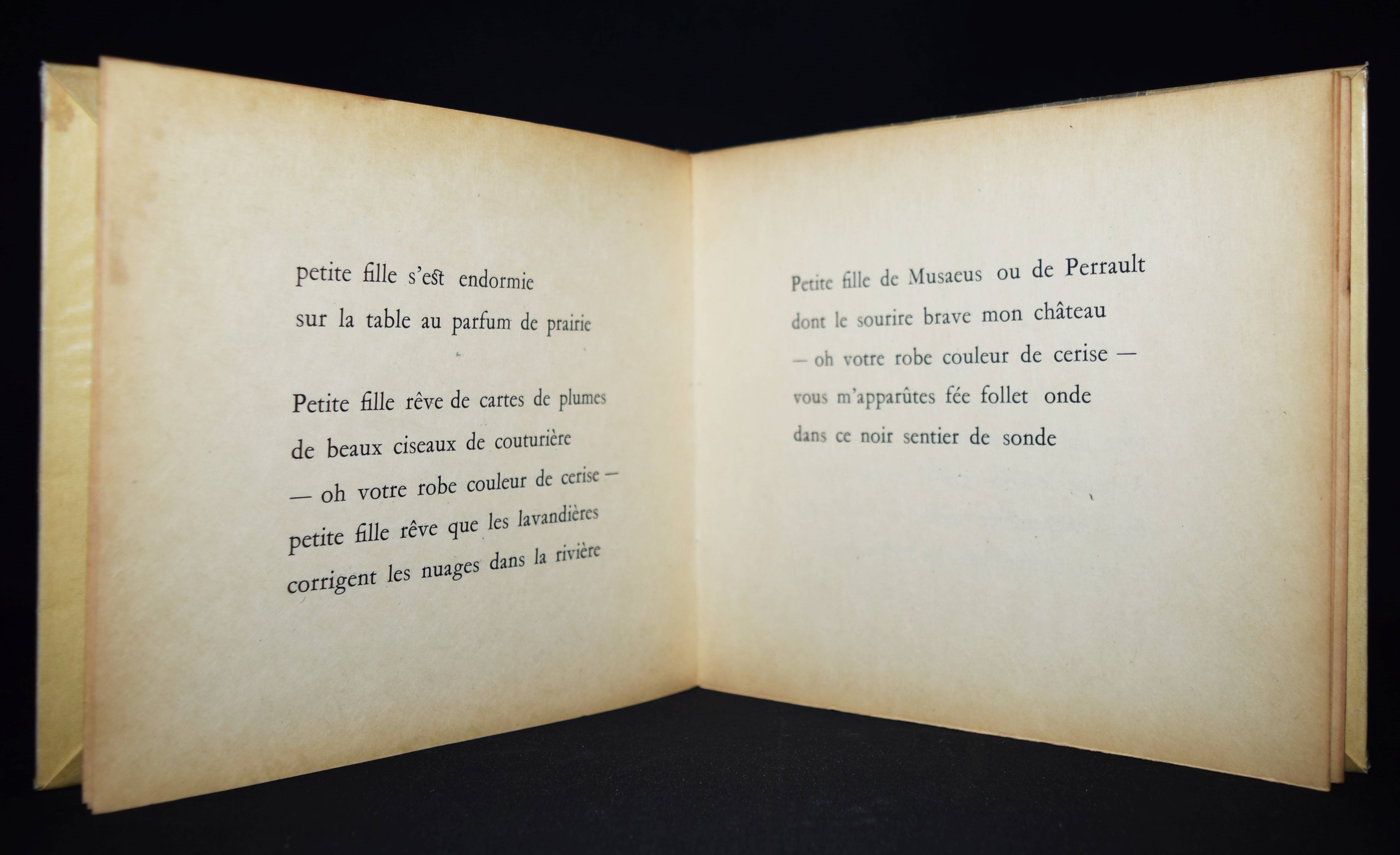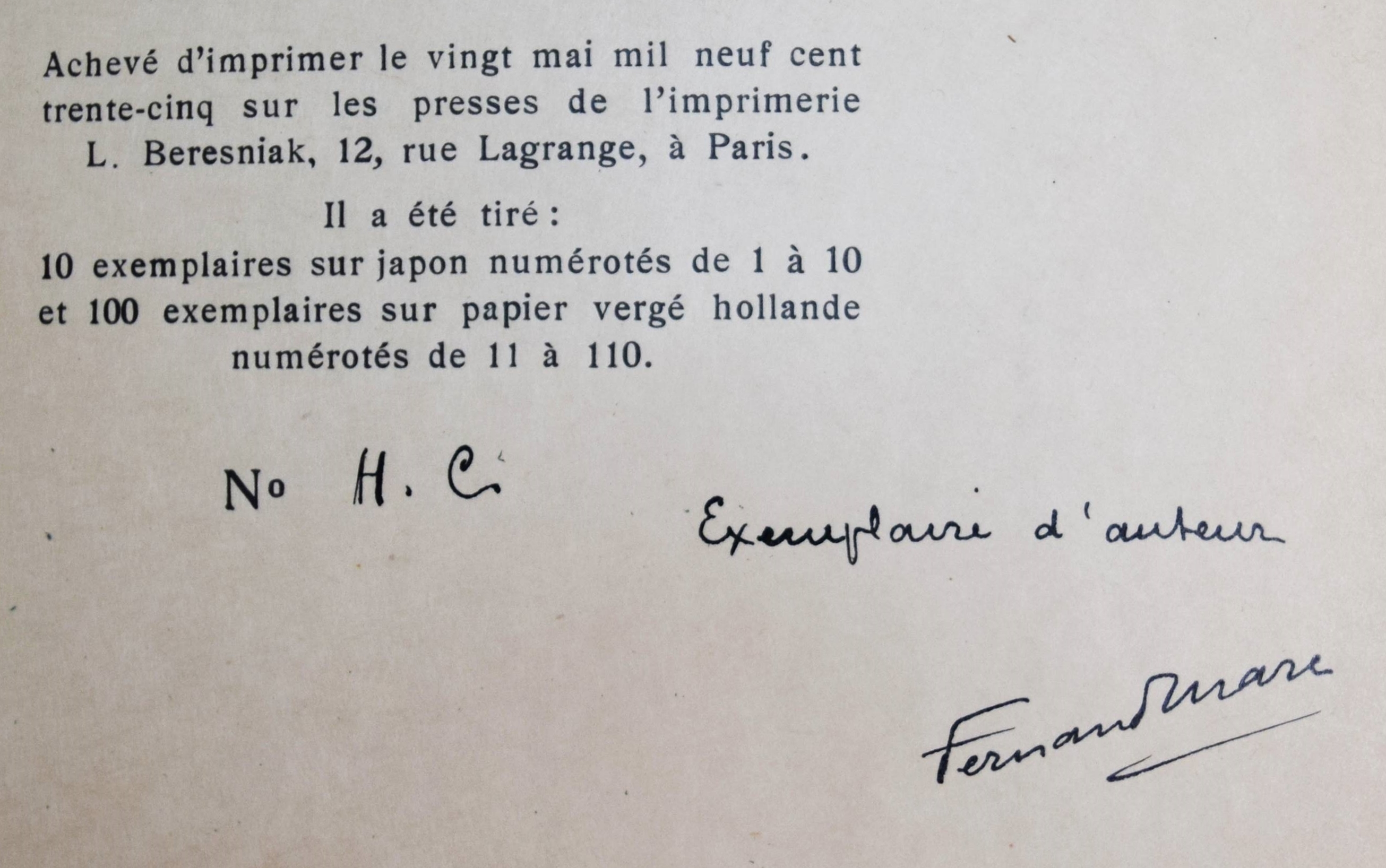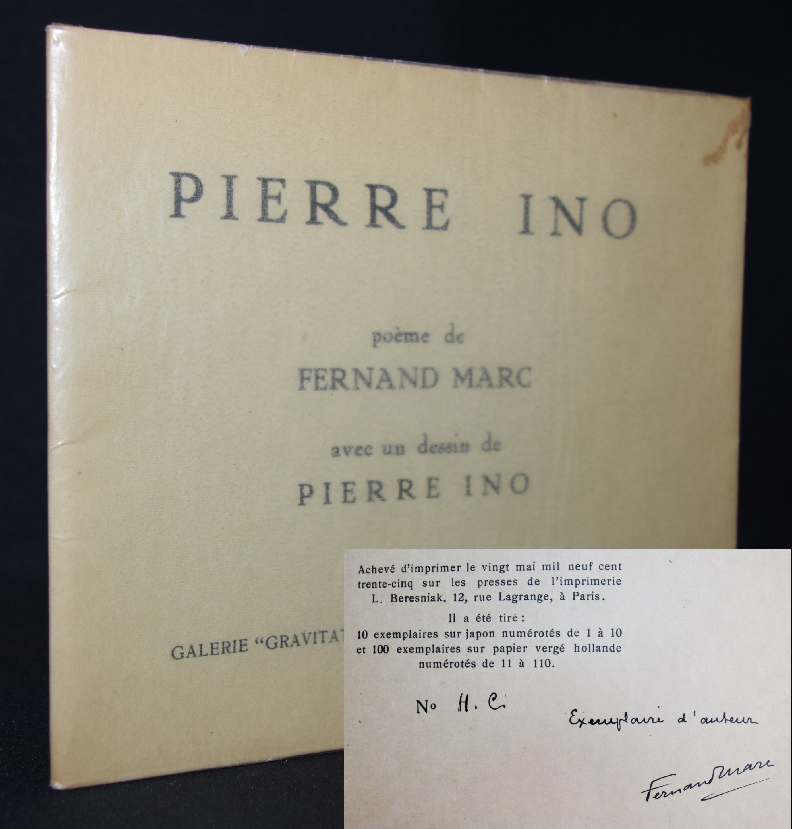 Marc, Fernand. Pierre Ino. Avec un design de Pierre Ino. Paris, Galerie „Gravitations“ (1935). Quer-8°. [8] Bl. mit 1 mont. Tafel. Orig.-Kartonumschlag mit Japanpapier-Schutzumschlag. ″Exemplaire d’auteur – H. C.“ von F. Marc im Druckvermerk signiert (Gesamtauflage 110 Exemplare). – Sehr seltene frühe Publication des russisch-französischen Surrealisten Pierre Ino (1909-1989). Mit Versen von F. Marc (1900-1979) der ein Jahr zuvor ein Gedicht zu einer Arbeit von Marc Chagall in der Galerie „Gravitations“ veröffentlicht hatte. – „A Fernand Marc, / son oiseau, c’est le roitelet / Qui chante avec ses oreilles / Et dont chaque feuille résonne / Son oiseau / Ses oiseaux ce sont ses poèmes.“ (Paul Éluard). – Vorderdeckel und die ersten drei Blätter in der oberen rechten Ecke leicht fleckig, sonst gut erhalten. – ″Exemplaire d’auteur – H. C.“ signé par F. Marc dans la note d’impression (tirage total 110 exemplaires). – Très rare publication précoce du surréaliste franco-russe Pierre Ino (1909-1989). Avec des vers de F. Marc (1900-1979) qui avait publié un an auparavant un poème sur une œuvre de Marc Chagall dans la galerie „Gravitations“. – Couverture avant et les trois premiers feuillets légèrement tachés dans le coin supérieur droit, sinon bien conservé.