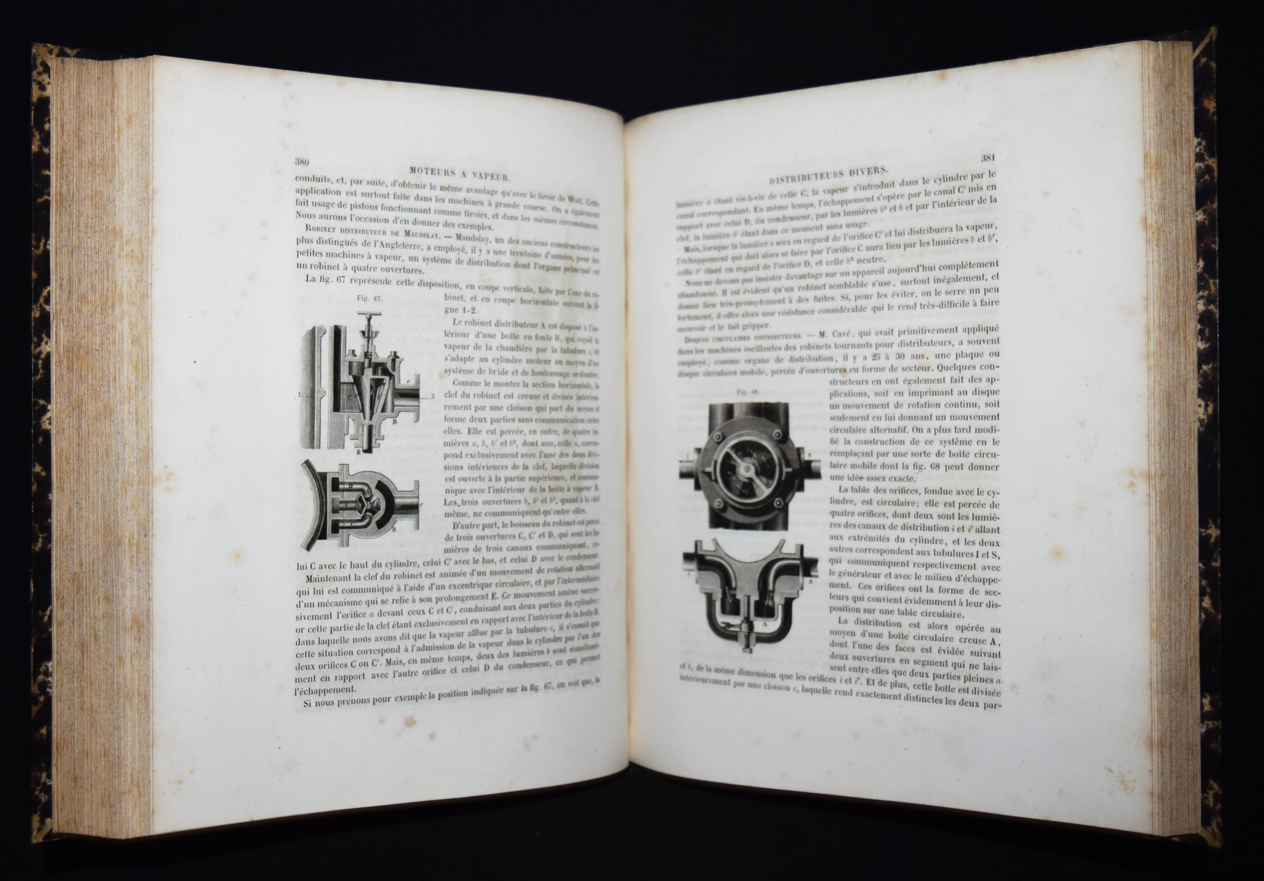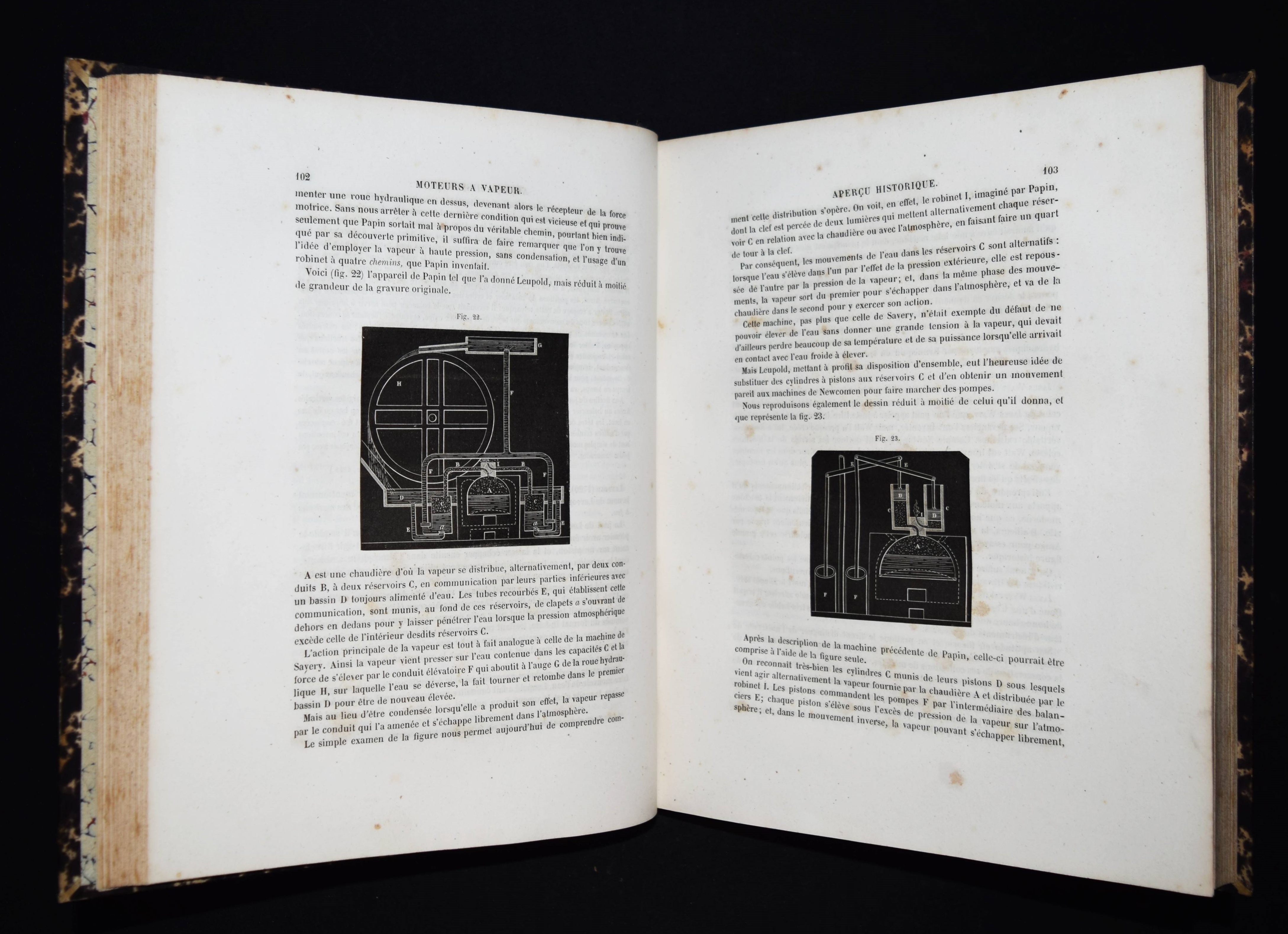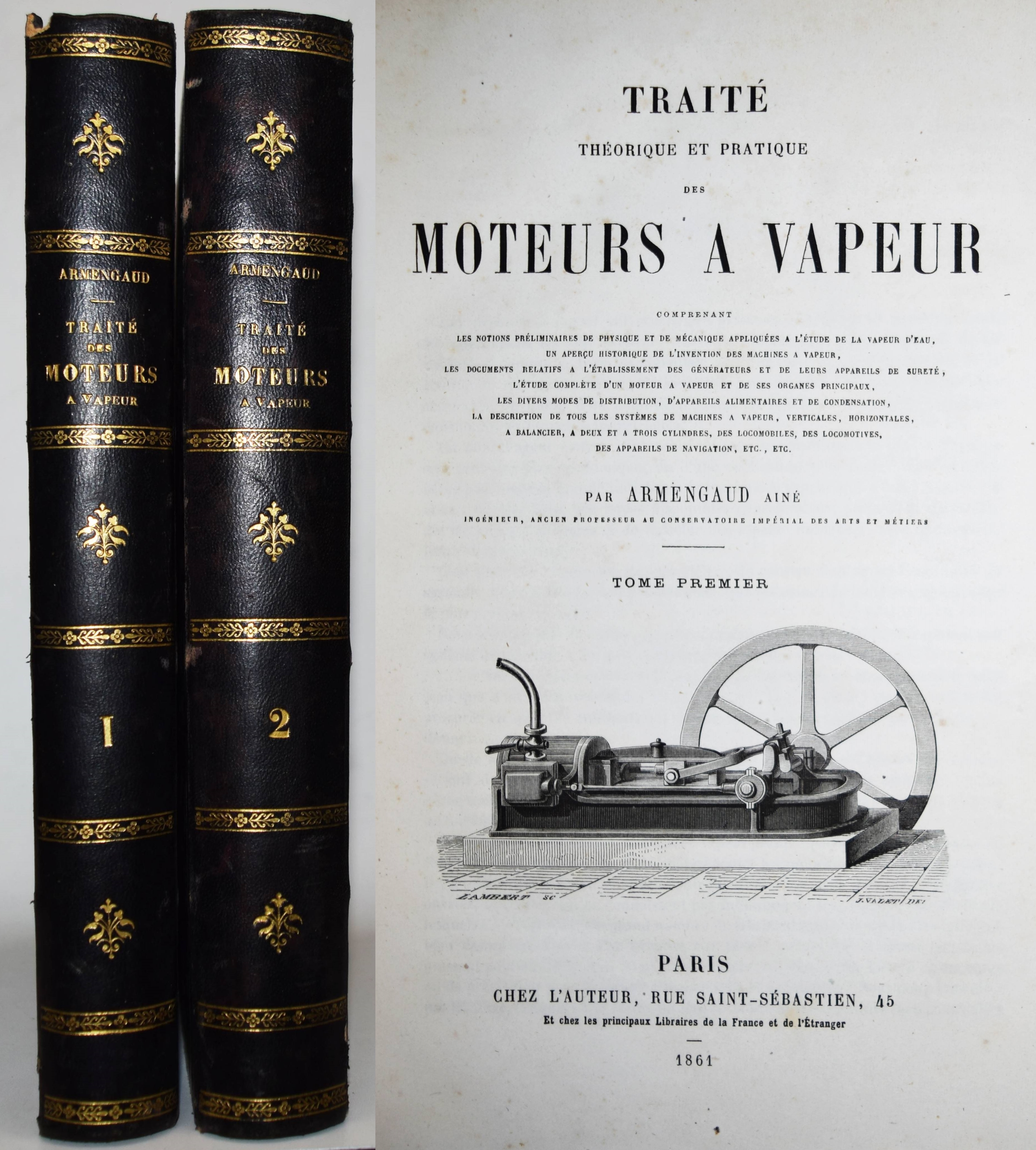 Armengaud, (Jacques Eugène). Traité théorique et pratique des moteurs a vapeur. Tome premier (et) deuxième. 2 Bände. Paris, chez l’auteur 1861 et 1862. 4°. VIII, 560 S.; 639, (1) S. mit zahlr. Holzstich-Illustrationen. Orig.-Halblederbände mit goldgepr. Rückentiteln und Rückenvergoldung. Poggendorff III, 41. – Der französische Ingenieur Jacques Eugène Armengaud (1810-1891), der sich „hervorragend als technischer Schriftsteller betätigte“, vermittelte „in jener an technischer Literatur armen Zeit dem gesamten Maschinenbau die Kenntnis der vorhandenen Konstruktionen und Anregung zu neuen Entwürfen“ (Matschoss, Männer der Technik S. 7). – Ohne den Atlasband. – Durchgehend etwas braunfleckig, gutes Exemplar.