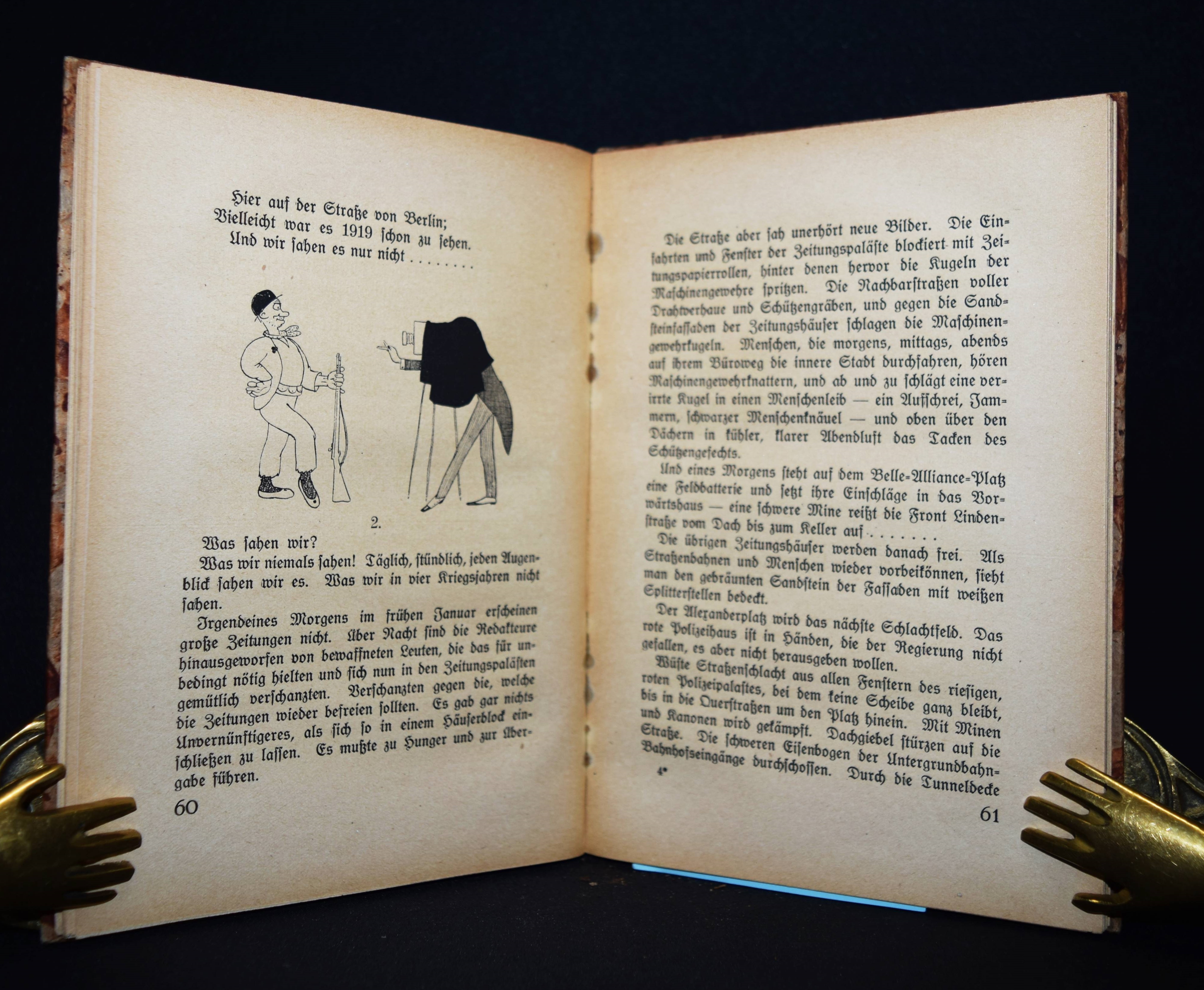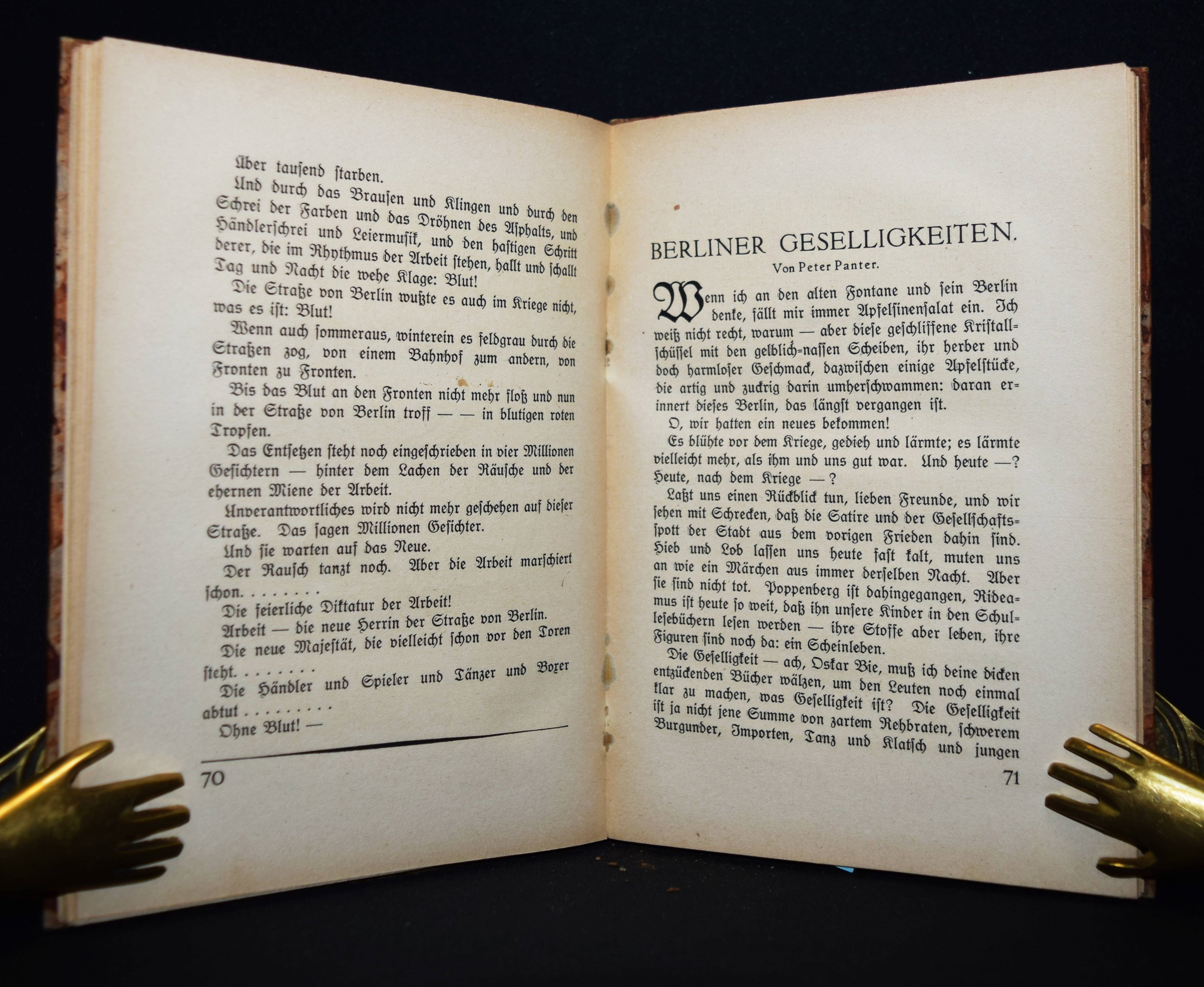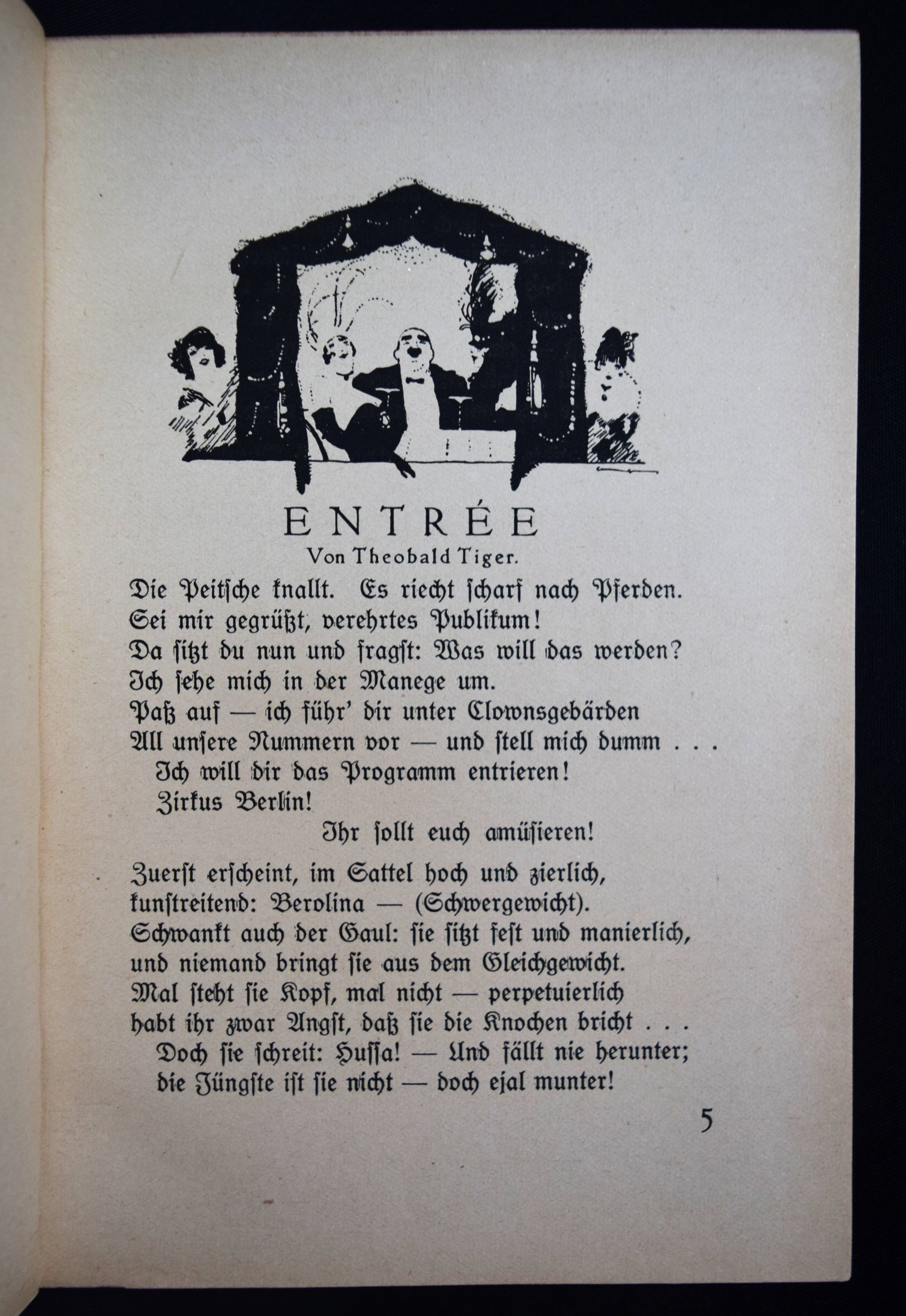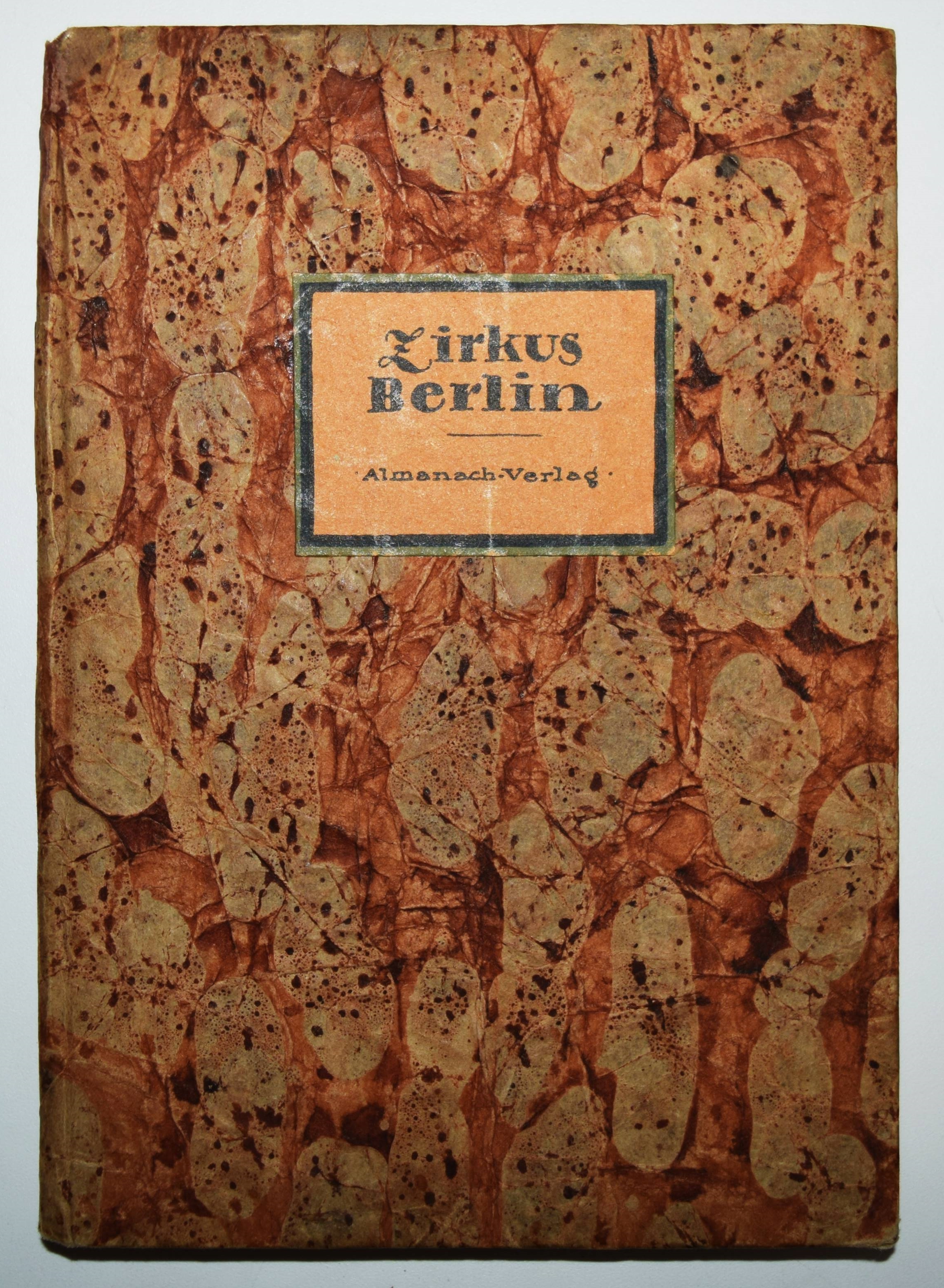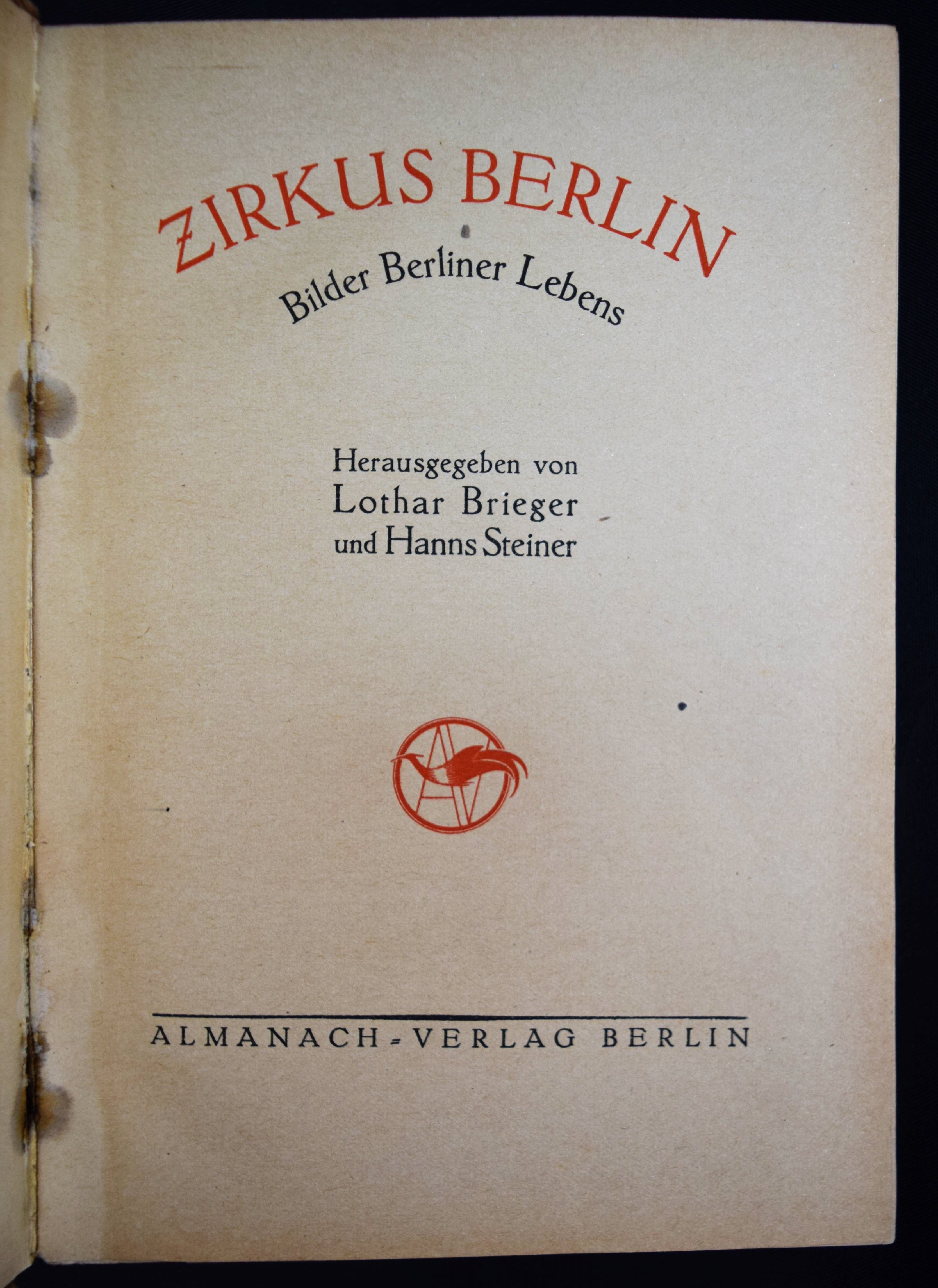 Tucholsky – Brieger, Lothar und Hanns Steiner (Hrsg.). Zirkus Berlin. Bilder Berliner Lebens. Berlin, Almanach-Verlag (1919). 8°. 180 S. mit 8 Tafeln von Lyonel Feininger, Hugo Krayn, Lesser Ury u. a. und teils ganzs. Illustrationen von Walter Trier, Friedrich Wolff, Lutz Ehrenberger u. a. Orig.-Pappband mit Rücken- und Deckelschild. Mit den Texten „Entrée“ und „Berliner Geselligkeiten“ von Kurt Tucholsky (unter den Pseudonymen Theobald Tiger und Peter Panter) im Erstdruck. Außerdem mit Beitragen u. a. von L. Brieger „Der Sieg der Neuen Kunst“; Nobert Falk „Theater“; Hans Brennert „Die Strasse von Berlin“ und Artur Landsberger „Berliner Erlebnis“. – Heftklammern wie meist angerostet, gutes Exemplar.