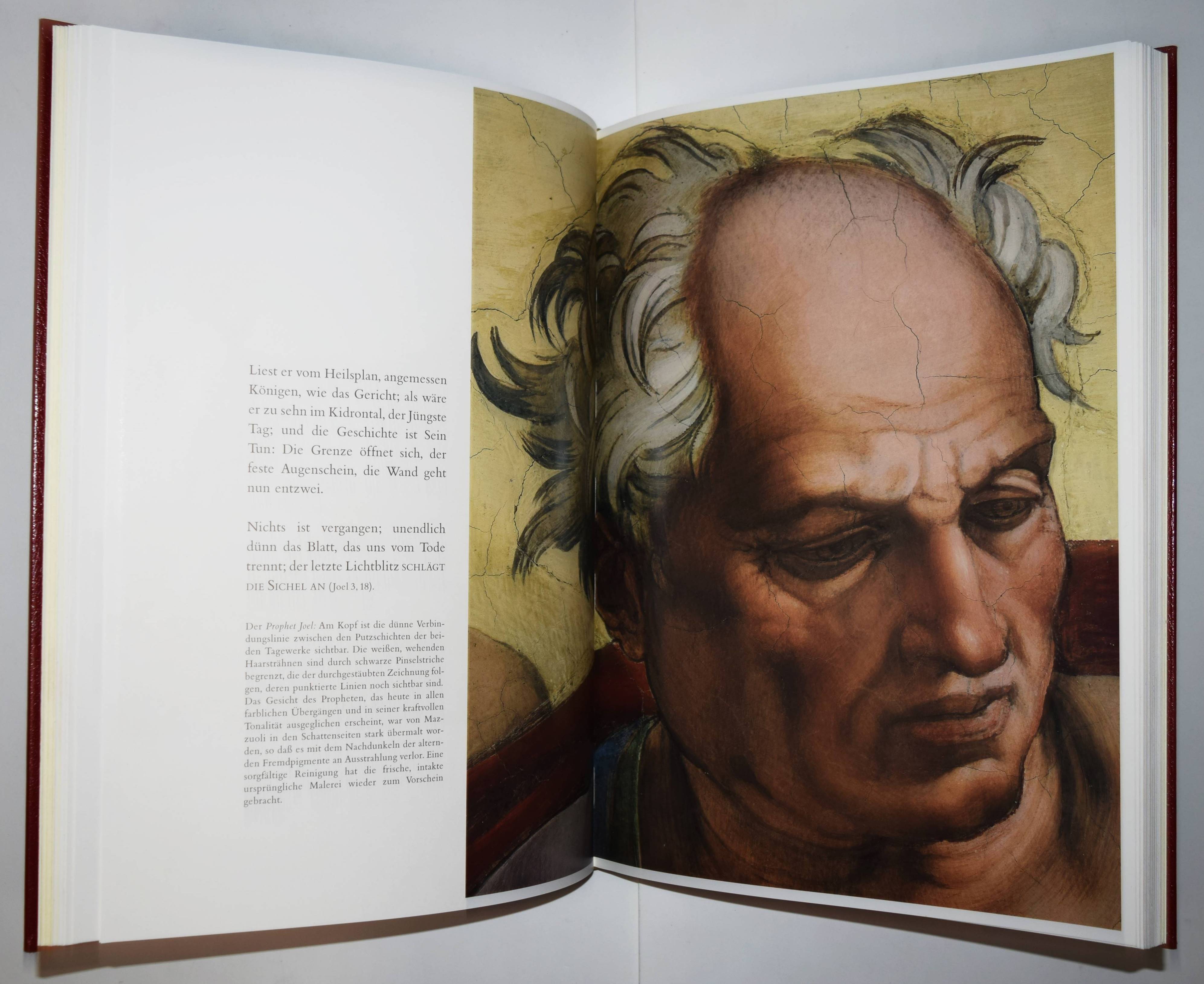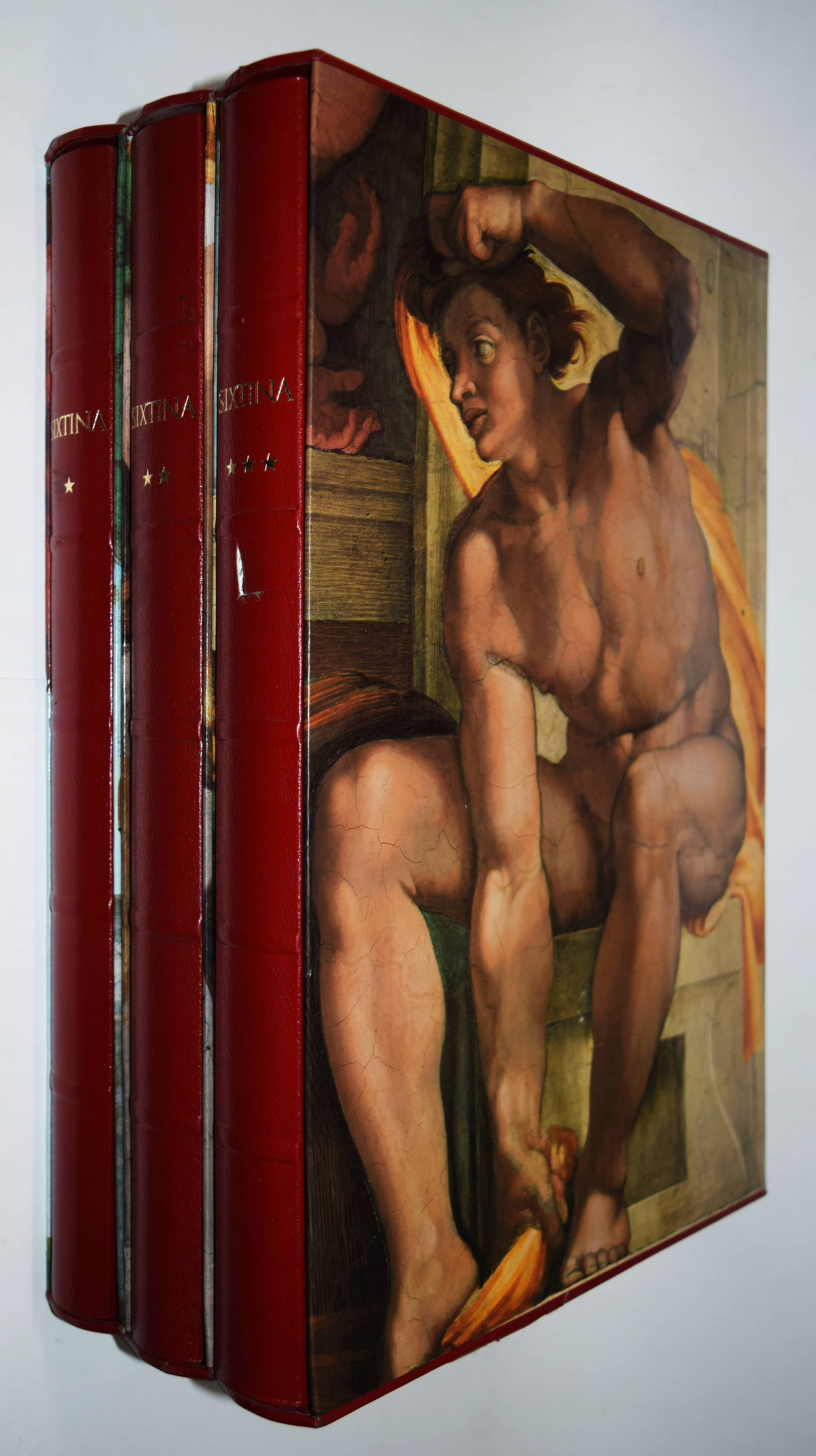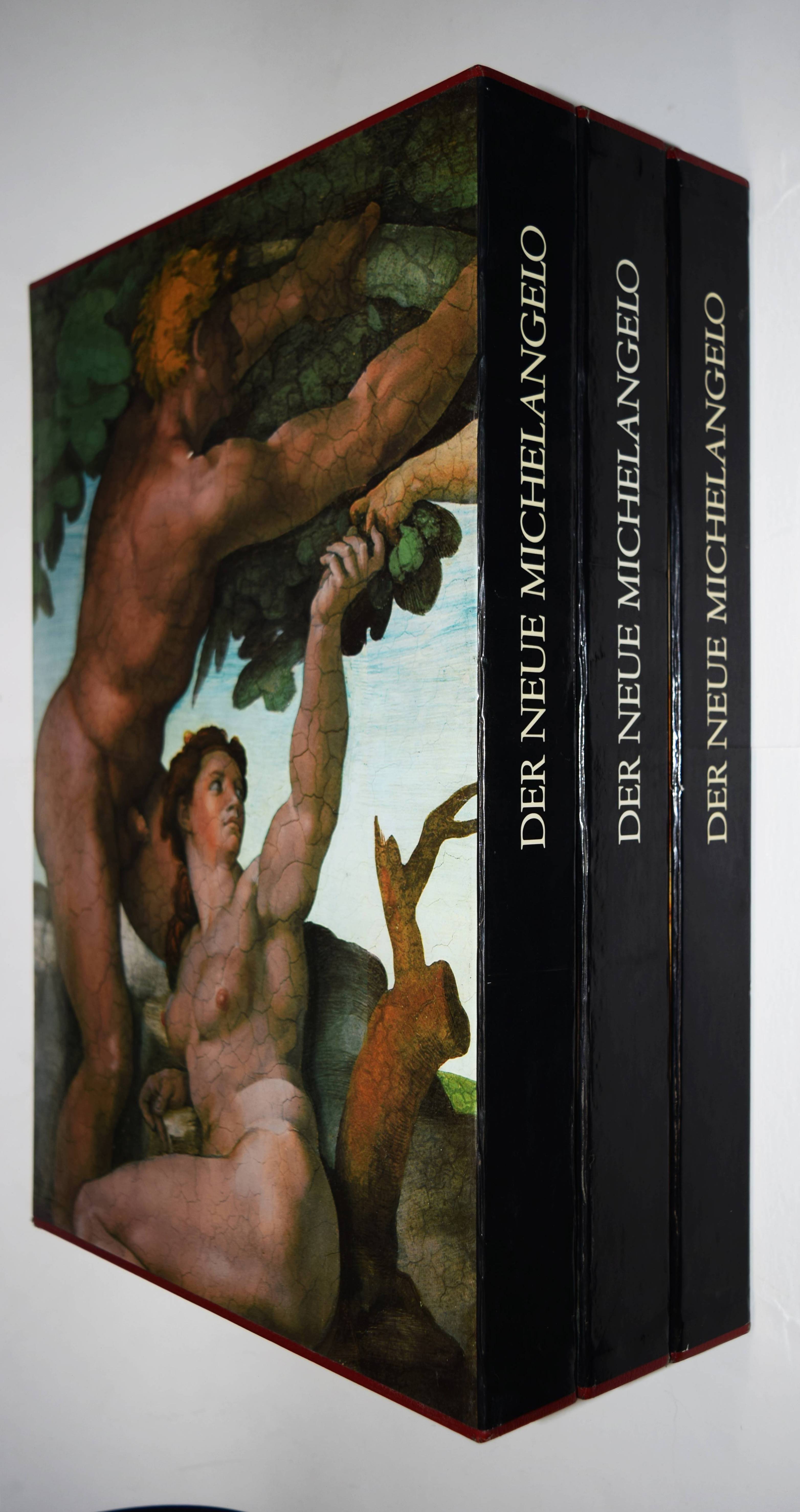 Michelangelo – Hartt, Frederick (Hrsg.). Der neue Michelangelo. Wiedergeburt der wahren Farben in der Sixtinischen Kapelle. Mit Bildmeditationen von Dieter Schlesak und Kommentaren von Gianluigi Colalucci. – I. Die Deckenfresken vom Propheten Zacharias über dem Eingangsportal bis zum Sündenfall. – II. Die Lünetten. – III. Die Deckenfresken von der Erschaffung Evas bis zum Propheten Johannes über der Altarwand. 3 Bände (von 4). Luzern, Faksimile Verlag 1989-1991. Imperial-Folio (43,5 x 31,5 cm.). 247 S.; 246 S., 256 S. mit über 500 teils ganzs. farb. Abb. Weinrote Kunstlederbände in farbig illustr. Pappschubern. Ohne den erst 1995 erschienenen vierten Band „Das Jüngste Gericht“. – Rücken von Band III mit geringfügig beschädigt, gutes Exemplar.