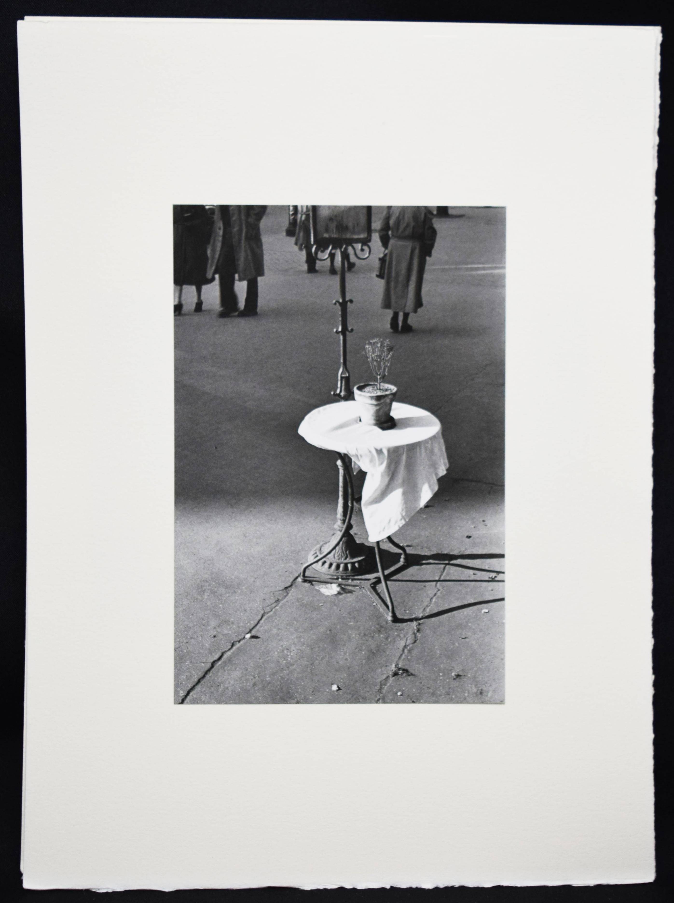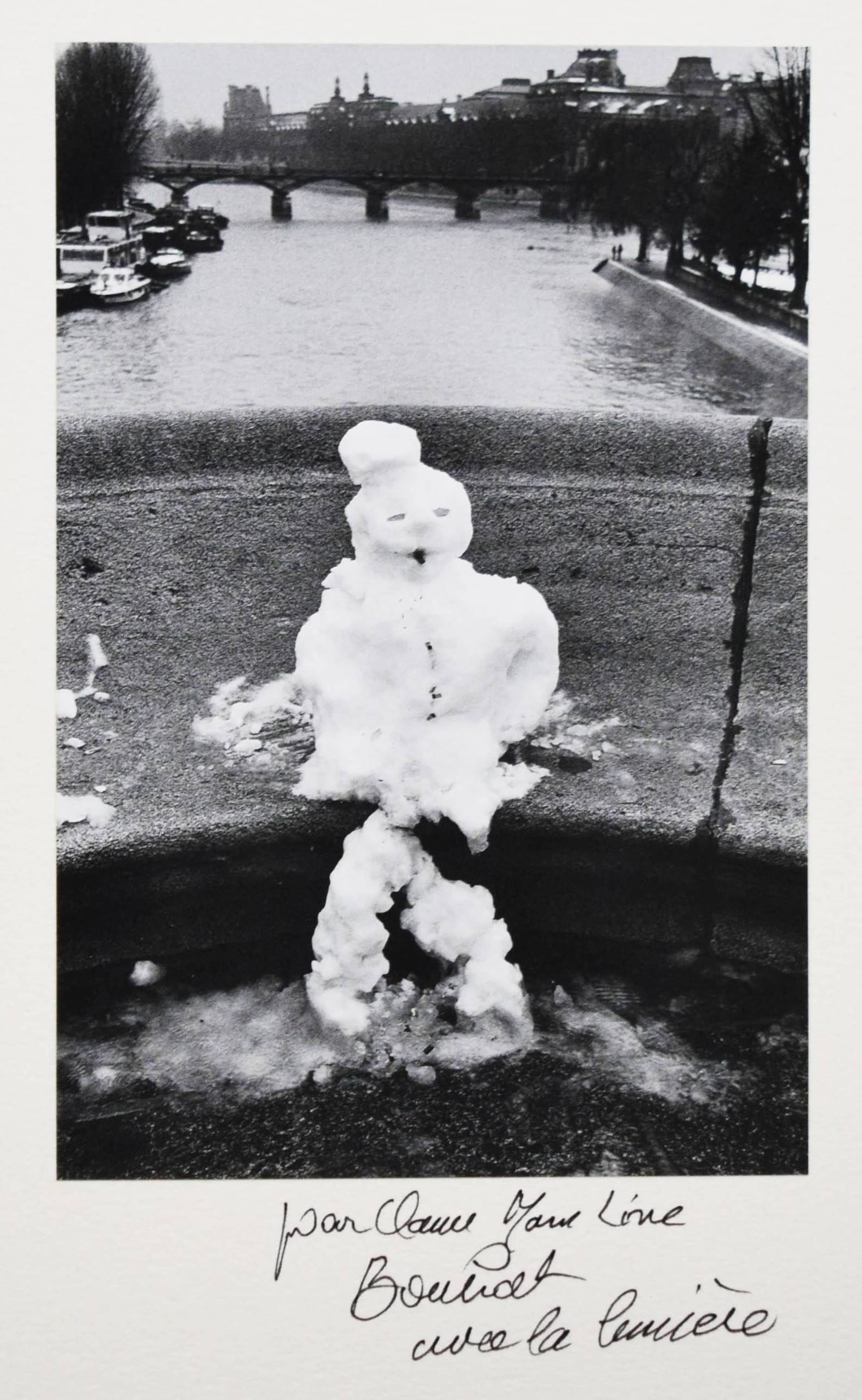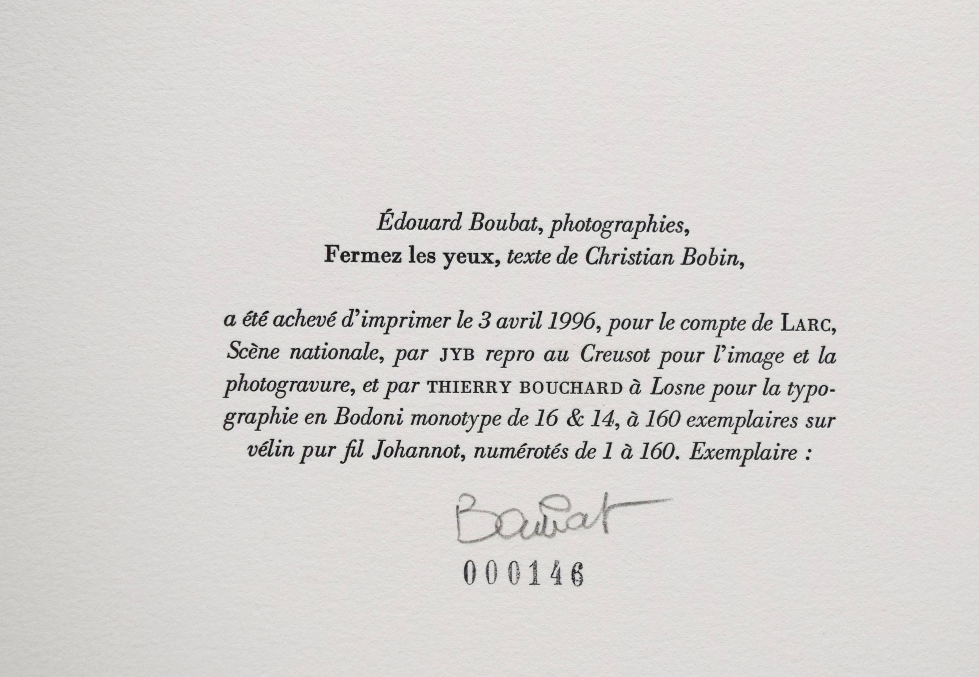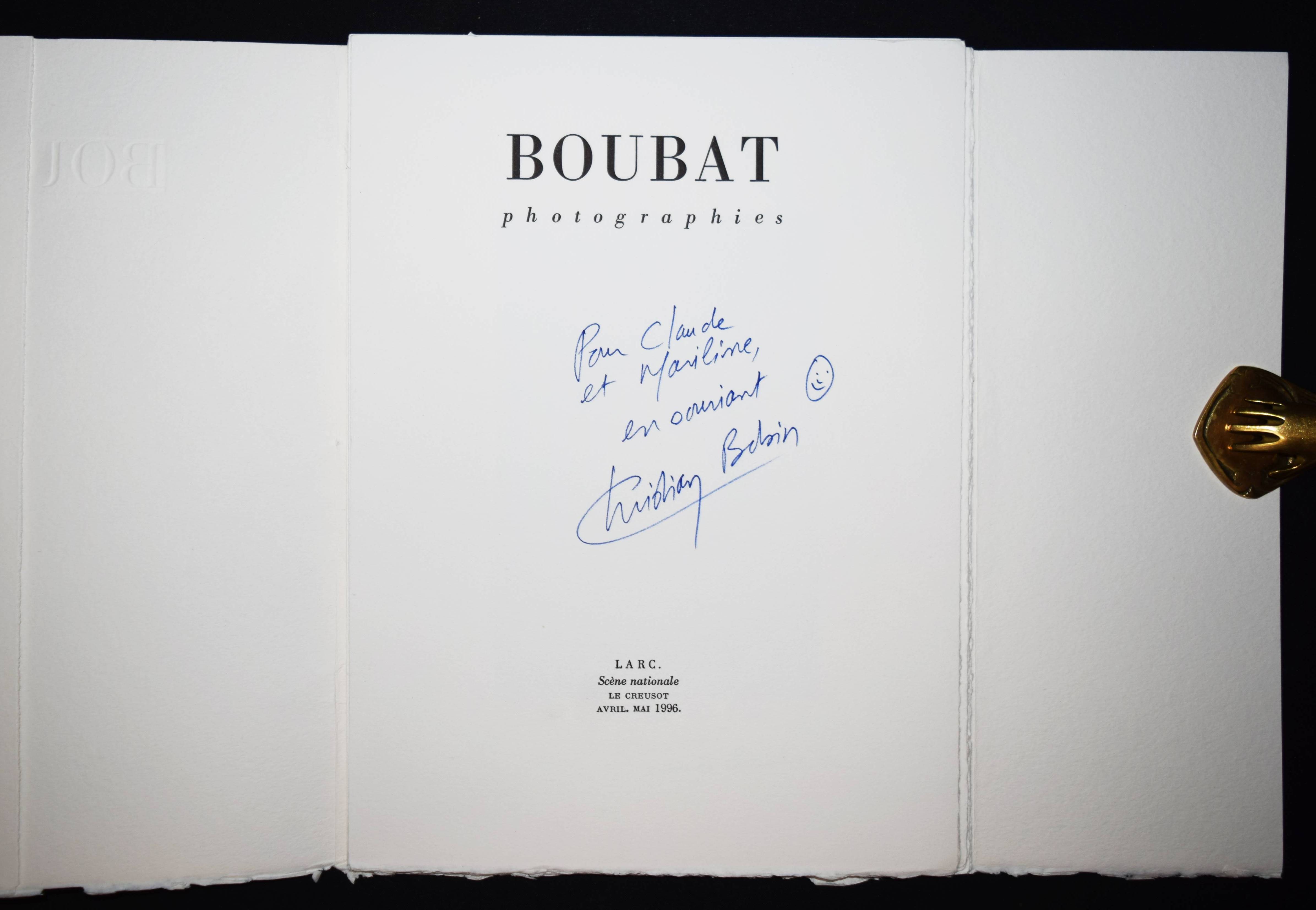Boubat, (Édouard). Photographies. (Avec une texte de Christian Bobin „Fermez les yeux“). Paris, LARC Scène nationale 1996. Gr.-4° (33 x 25 cm.). Titel, 8 mont. Duotone-Tafeln, [2] Bl. Orig.-Kartonumschlag. Koetzle, Fotografen A-Z 43. – Eines von 160 num. Exemplaren; von E. Boubat im Druckvermerk signiert, außerdem mit eigenhändigen Widmungen von E. Boubat und C. Bobin. Bibliophiler Druck auf kräftiges Bütten-Papier. – Édouard Boubat (1923-1999) schuf „Bildessays, Reportagen, poetisch gestimmte Einzelbilder. Meist diskutiert im Kontext der „Photographie humaniste“. In Frankreich einer der populärsten Fotografen der Nachkriegszeit“ (H.-M. Koetzle). – „Édouard Boubat durchquert die ganze Welt, ohne wie ein klassischer Reporter auf die neuesten Ereignisse zu lauern. Seine aus dem Stegreif aufgenommenen Bilder bringt er aus Frankreich und Europa, den Vereinigten Staaten, Kanada, Algerien, Guadeloupe, Mexiko, Iran, Irak, der Elfenbeinküste, Guinea, Brasilien, Peru, Indien, China, Japan etc. mit. Eher jedoch, als uns Krieg, Hungersnöte, Unglück im Allgemeinen zu zeigen, hält er mit seiner Kamera ohne jede Geziertheit oder Ergriffenheit Monumente des Friedens und des Gleichgewichts fest. Jacques Prévert schreibt 1971 über ihn: „Boubat sucht und findet in den nächstgelegenen Städten ebenso wie in den weitest entfernten Ländern oder den großen Wüsten des Verdrusses eine Oase. Er ist ein Korrespondent des Friedens“ (Emmanuelle de l’Écotais). – Sehr gutes Exemplar.