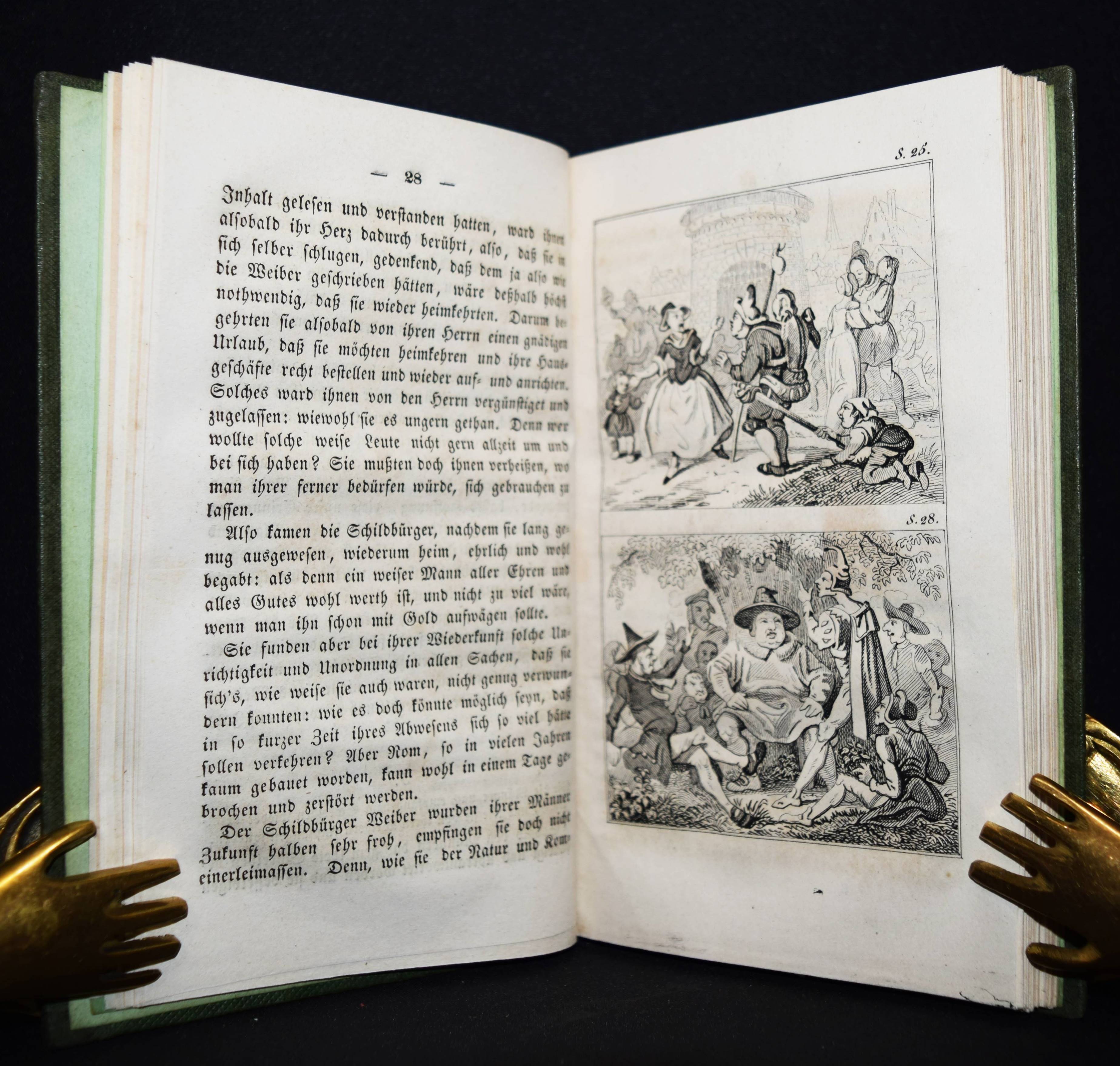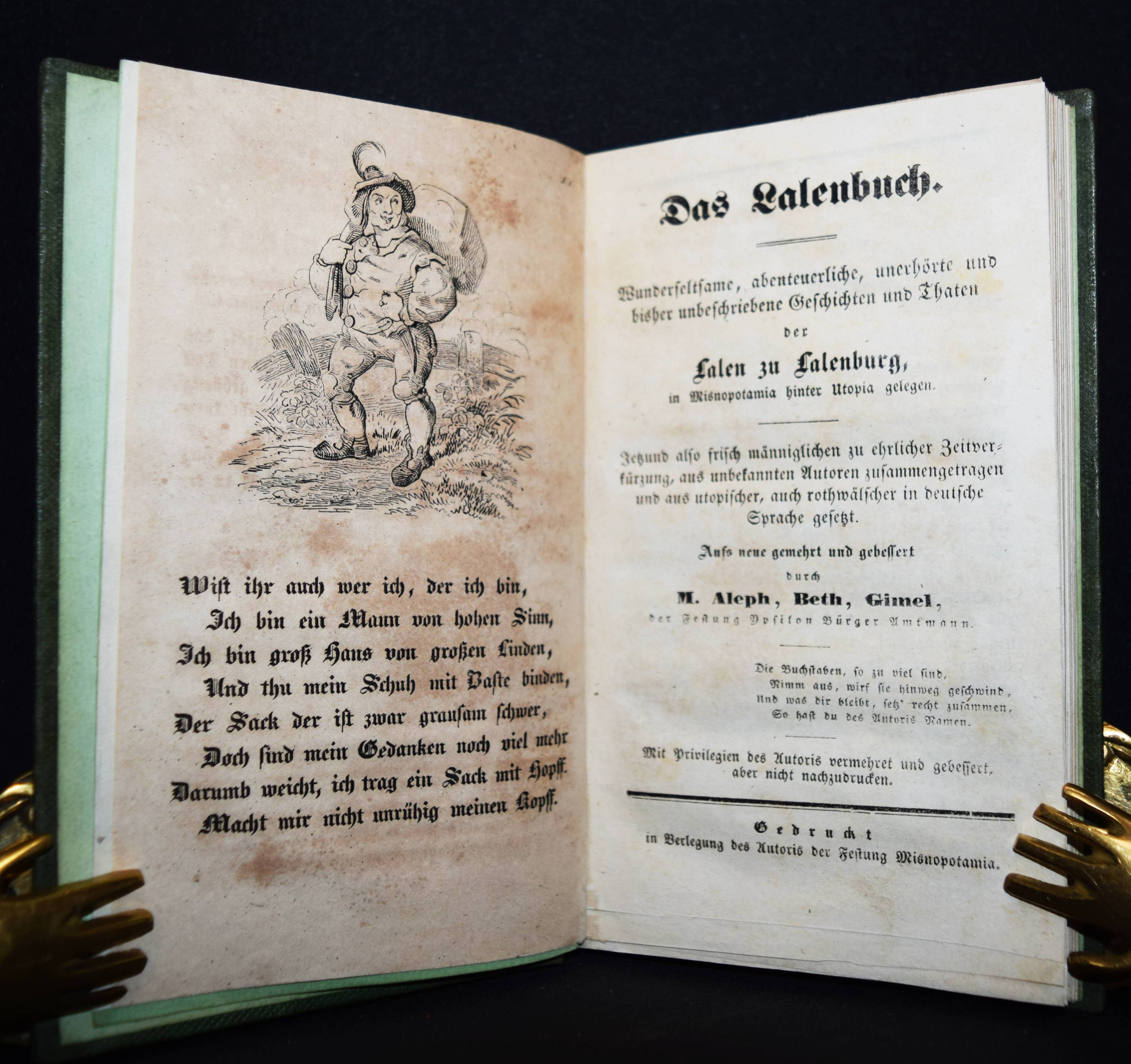 Schildbürger – Aleph Beth Gimel. Das Lalenbuch. Wunderseltsame, abenteuerliche, unerhörte und bisher unbeschriebene Geschichten und Thaten der Lalen zu Lalenburg, in Misnopotamia hinter Utopia gelegen. Jetzund also frisch … in deutsche Sprache gesetzt. Aufs neue gemehrt und gebessert. Gedruckt in Verlegung des Autoris der Festung Misnopotamia (Stuttgart, J. Scheible’s Buchhandlung 1839). 8°. 158 S. mit lithogr. Frontispiz und 50 Abb. auf 25 lithogr. Tafeln (von Willibald Cornelius). Leinenband der Zeit mit goldgepr. Rückentitel und Romantikervergoldung. (Lieblingsbücher in alten und neueren Geschichten, Sagen und Schwänken, Zweiter Theil). Hayn-Got. IX, 528. Rümann, Illustr. Bücher 275, 2. – Erste Ausgabe mit diesen Illustrationen. – Zweiter Teil der seltenen, von Willibald Cornelius (1809-?) herausgegebenen Reihe von Volksbüchern, als Band I erschien 1838 bereits „Der wiedererstandene Eulenspiegel“. Insgesamt erschienen bis 1840 sieben Teile. Das Fronispiz zeigt einen Wanderer mit einem Sack über der Schulter und dem Vers „Wist ihr auch wer ich, der ich bin, / Ich bin ein Mann von hohen Sinn, / Ich bin groß Hans von großen Linden, / Und thu mein Schuh mit Baste binden, / Der Sack ist zwar grausam schwer, / Doch sind mein Gedanken noch viel mehr / Darumb weicht, ich trag ein Sack mit Hopff. / Macht mir nicht unrühig meinen Kopff.“ – Reich illustrierte Ausgabe der Historie von den „Schildbürgern aus Misnopotamia“. Der Erstdruck des aus verschiedenenen Volkserzählungen kompilierten und durch moralische Andeutungen erweiterten utopischen Schwankromans erschien 1597 in Straßburg (vgl. Goed. II, 560 und Hayn-Got. IX, 527). – Einband etwas angestaubt, stellenweise etwas braunfleckig und gebräunt, gutes Exemplar.