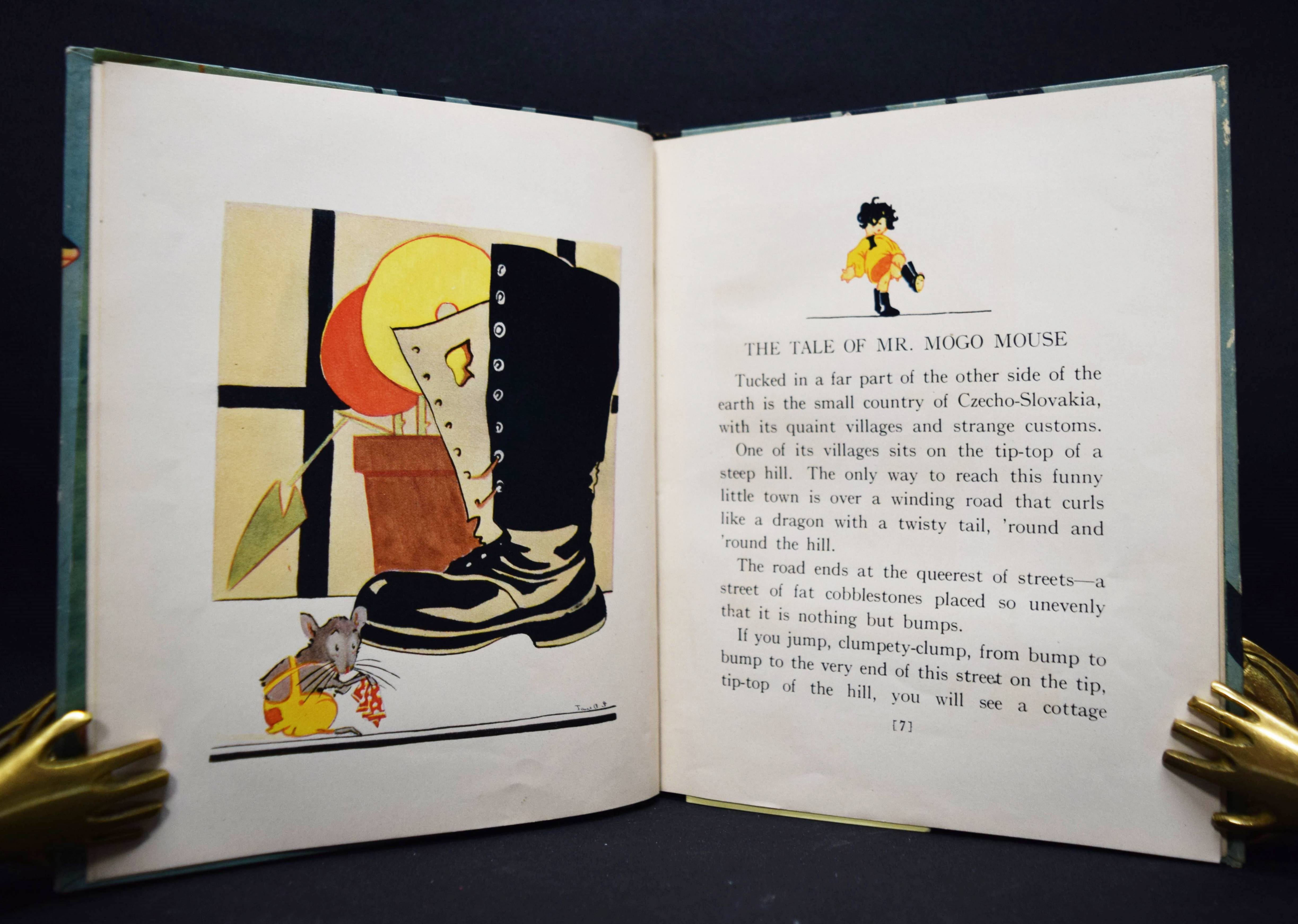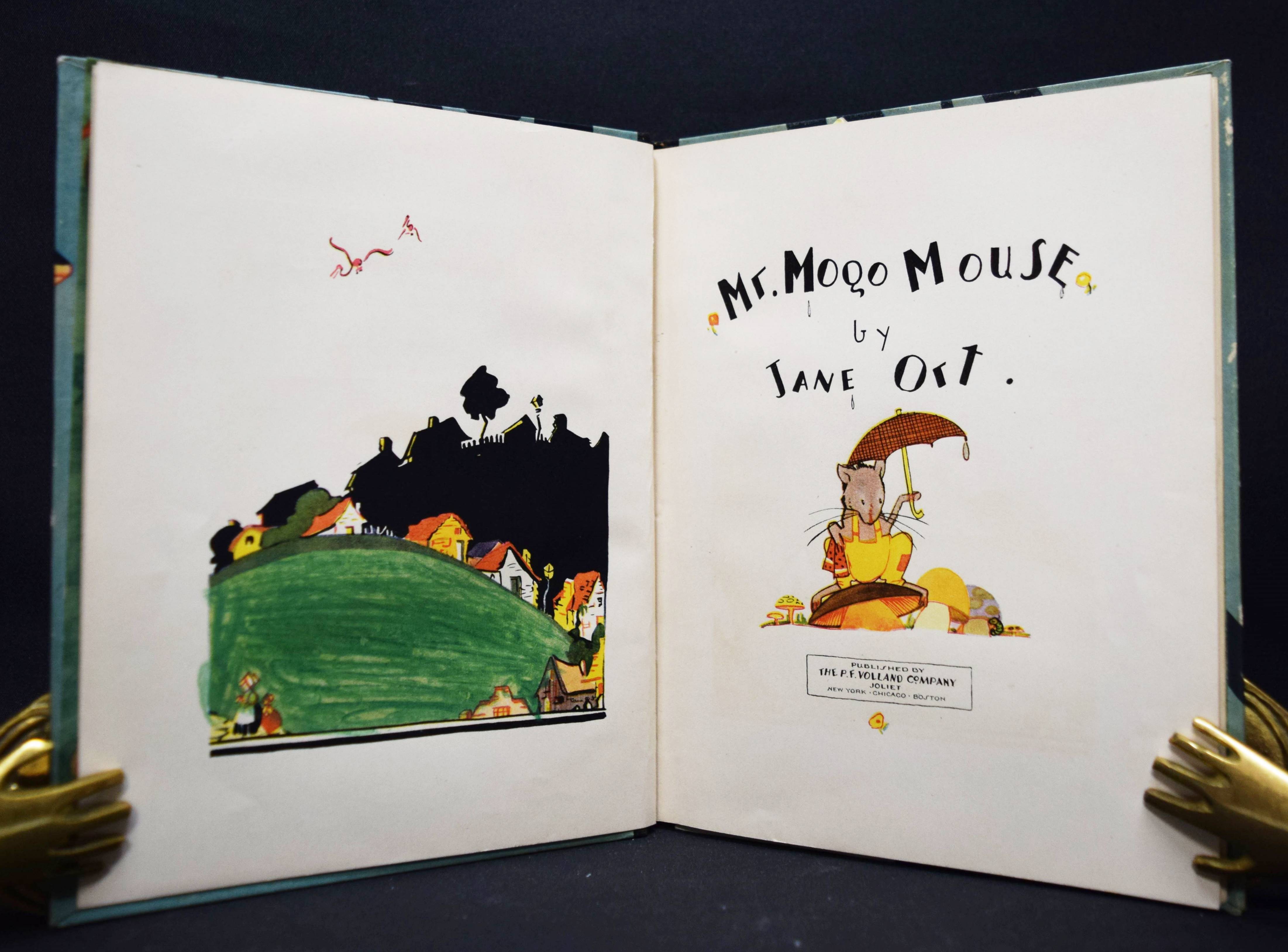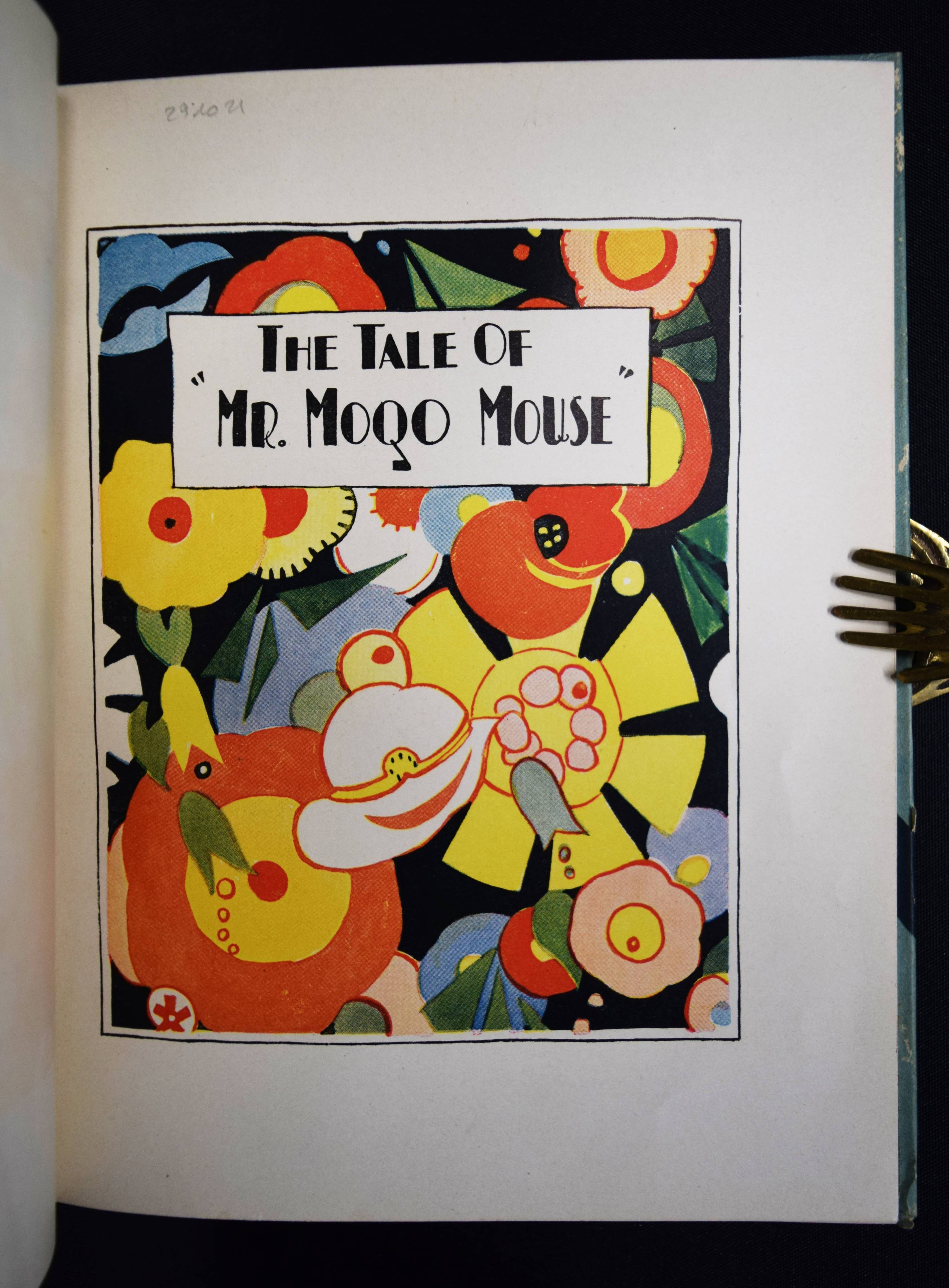 Ort, Jane Mr. Mogo Mouse (and The Tale of Trinkelette). New York, Chicago, Boston, The Volland Company, Joliet (1930). 8° (19 x 15 cm.). 39, (1) S. mit farbigen Illustrationen von Johnny (Barton) Gruelle. Farbig illustr. Orig.-Halbleinenband in farbig illustr. Pappkassette. (Volland Sunny Book Series). Erste Ausgabe. – Seltenes amerikanisches Kinderbuch. Mit hervorragenden Art Déco Illustrationen von John Barton Gruelle (1880-1938). Gruelle wurde durch seine 1915 kreierte Bilderbuch-Serie „Raggedy Ann“ bekannt, der erste Band der Raggedy Ann Stories erschien 1918 bei The Volland Company. – Der Kinderbuch-Verlag „The Volland Company“ wurde 1908 von Paul Volland, Sohn deutscher Einwanderer, gegründet. Seit 1912 veröffentlichte Volland schön ausgestattete Kinderbücher in dekorativen Kassetten und publizierte seit 1928 auch Grußkarten. Der Verlag existierte bis 1958. – Vorderdeckel mit kl. Abriebstelle, sehr gutes Exemplar mit der oft fehlenden Schmuck-Kassette.
